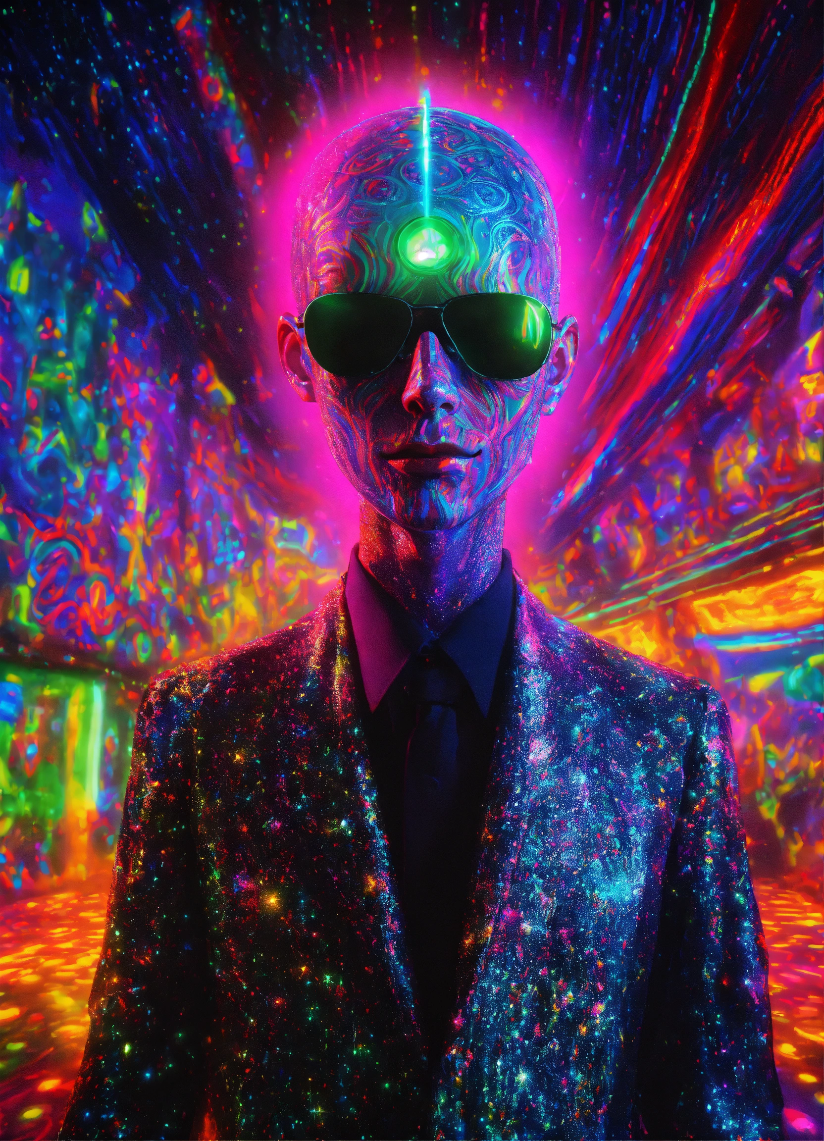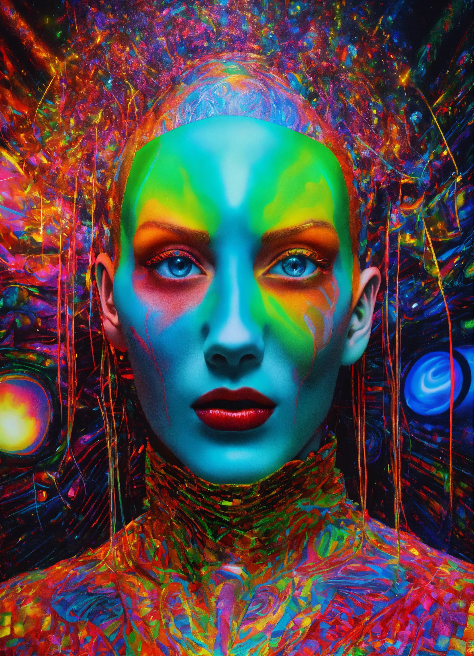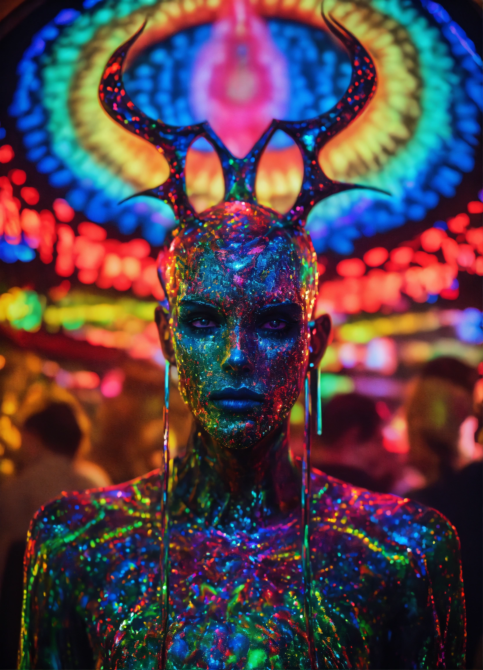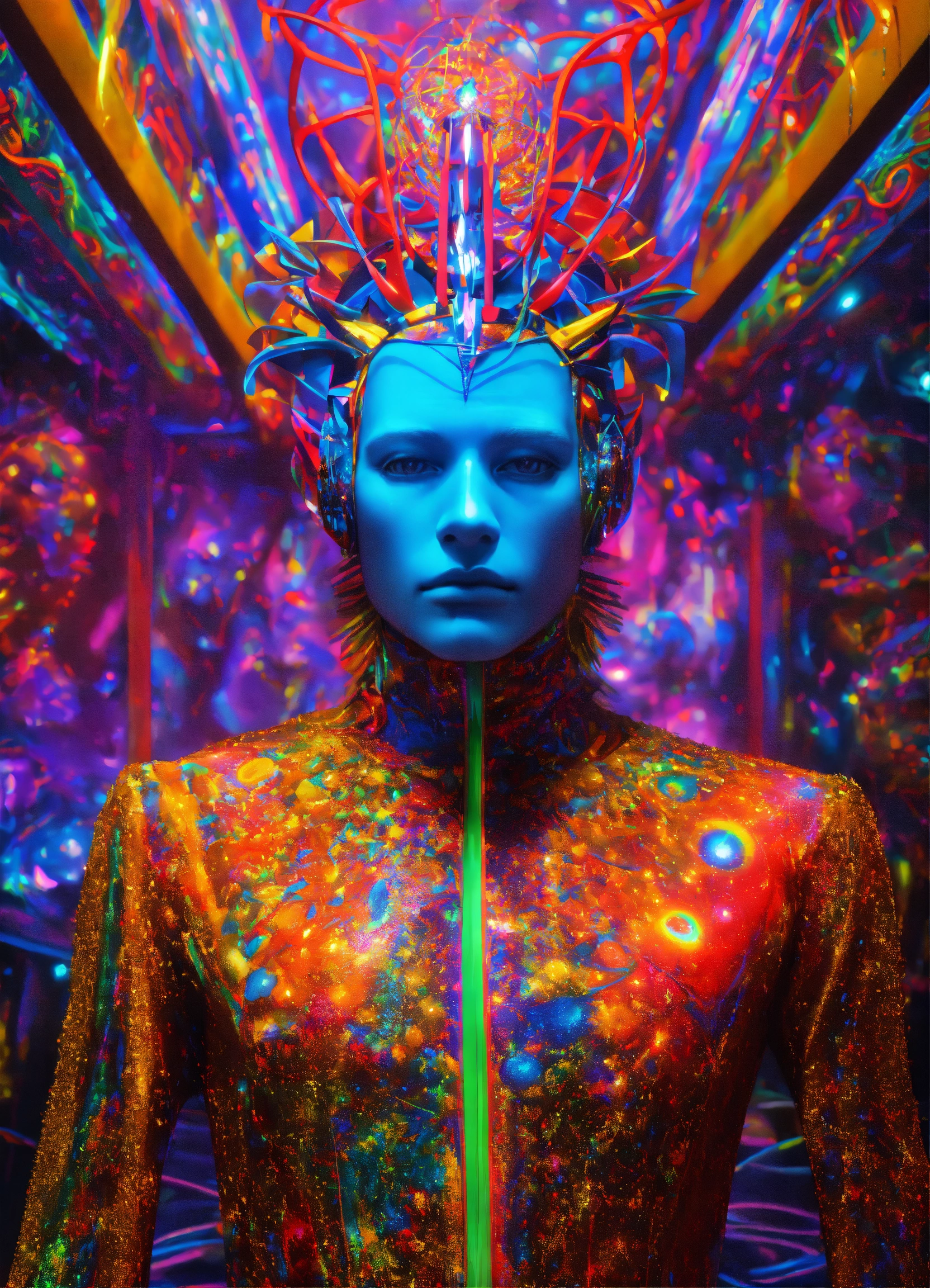 Photorealistic 3d 35 mm portrait of ai god dmt psytrance slender man pinhead aphex twin die antwoord punk rock anime haute couture costume, baptized in a cosmic alex grey painting in a dmt black laser light glitter neon black rainbow glitter holographic night club at dark night 70mm film, art by salvador dali and holy mountain the movie.