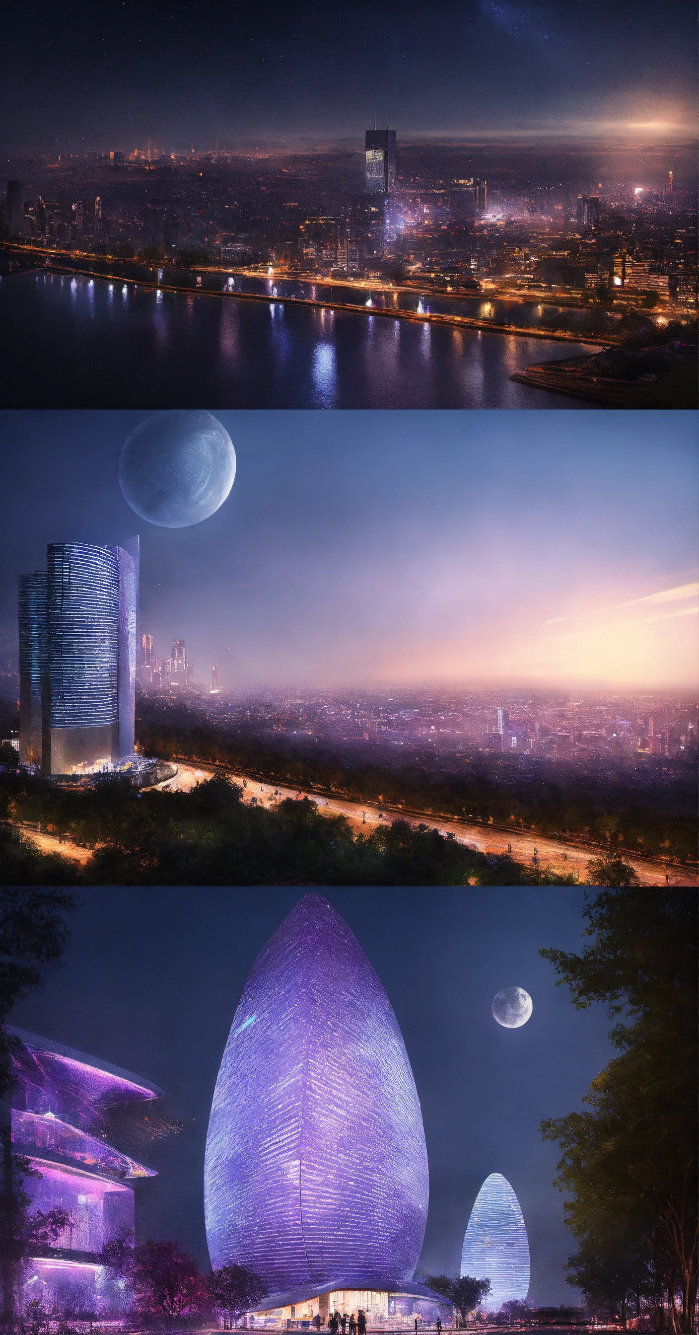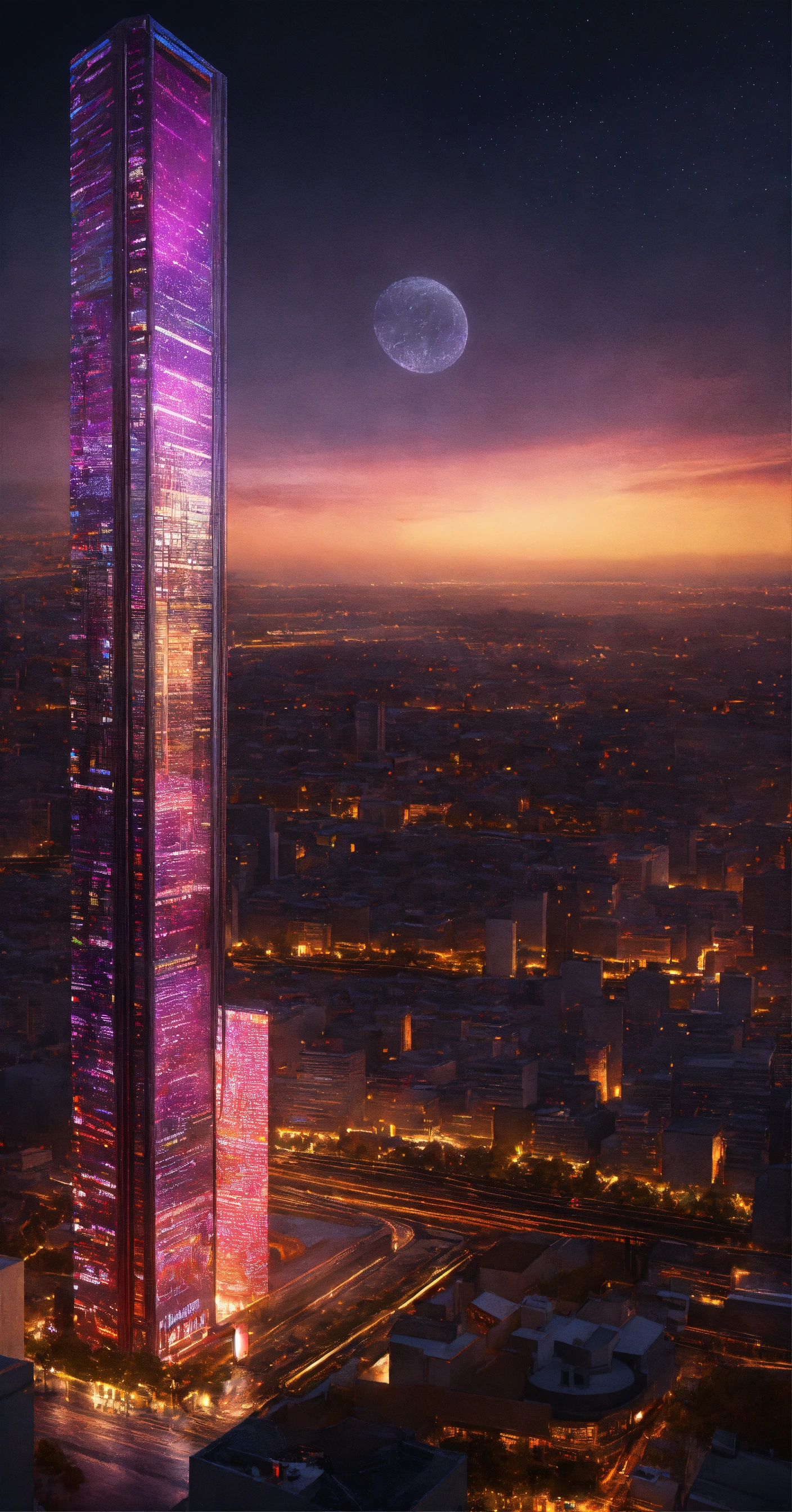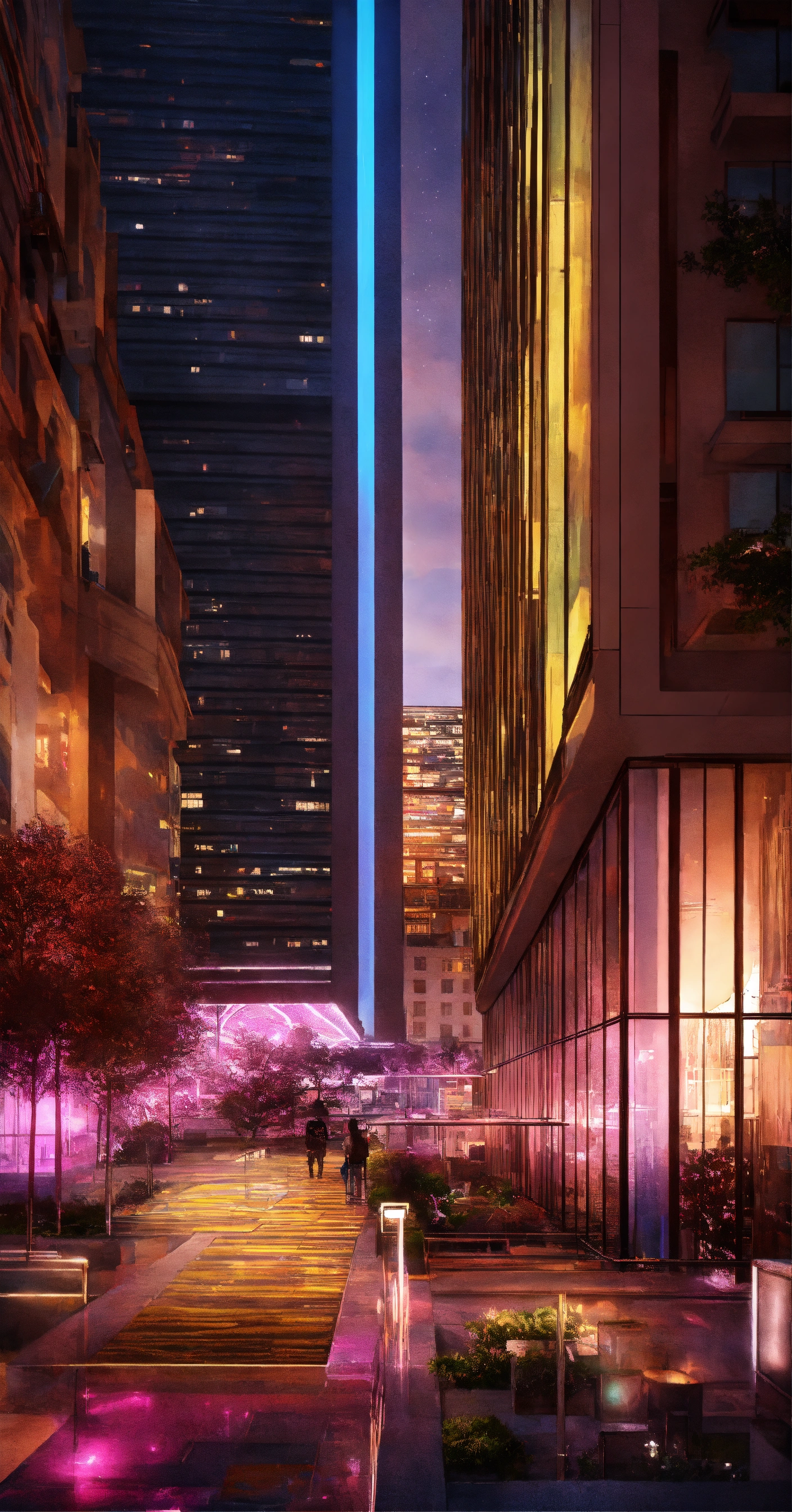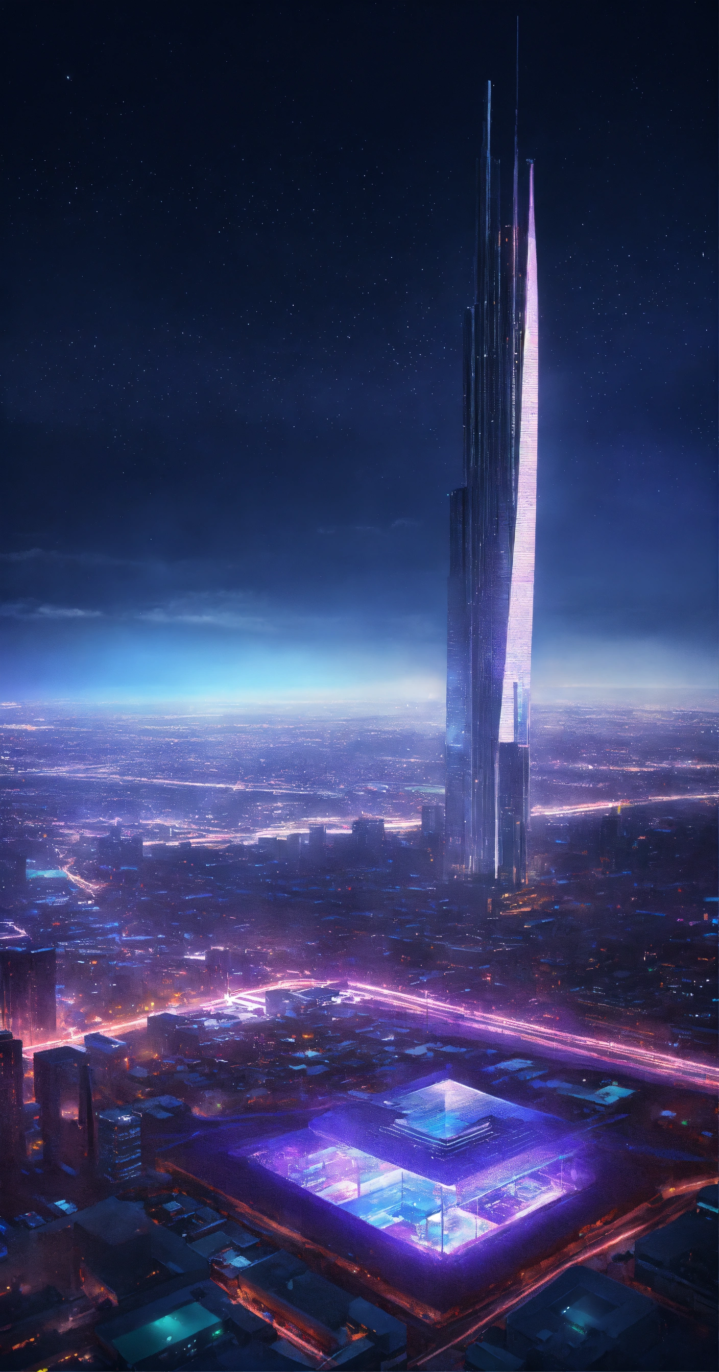 Prompt cinematográfico visualiza una ciudad futurista en la que los edificios están compuestos de luces led brillantes que parpadean al ritmo de la música, la cámara se desplaza hacia abajo desde el cielo nocturno estrellado hasta la entrada de un club techno