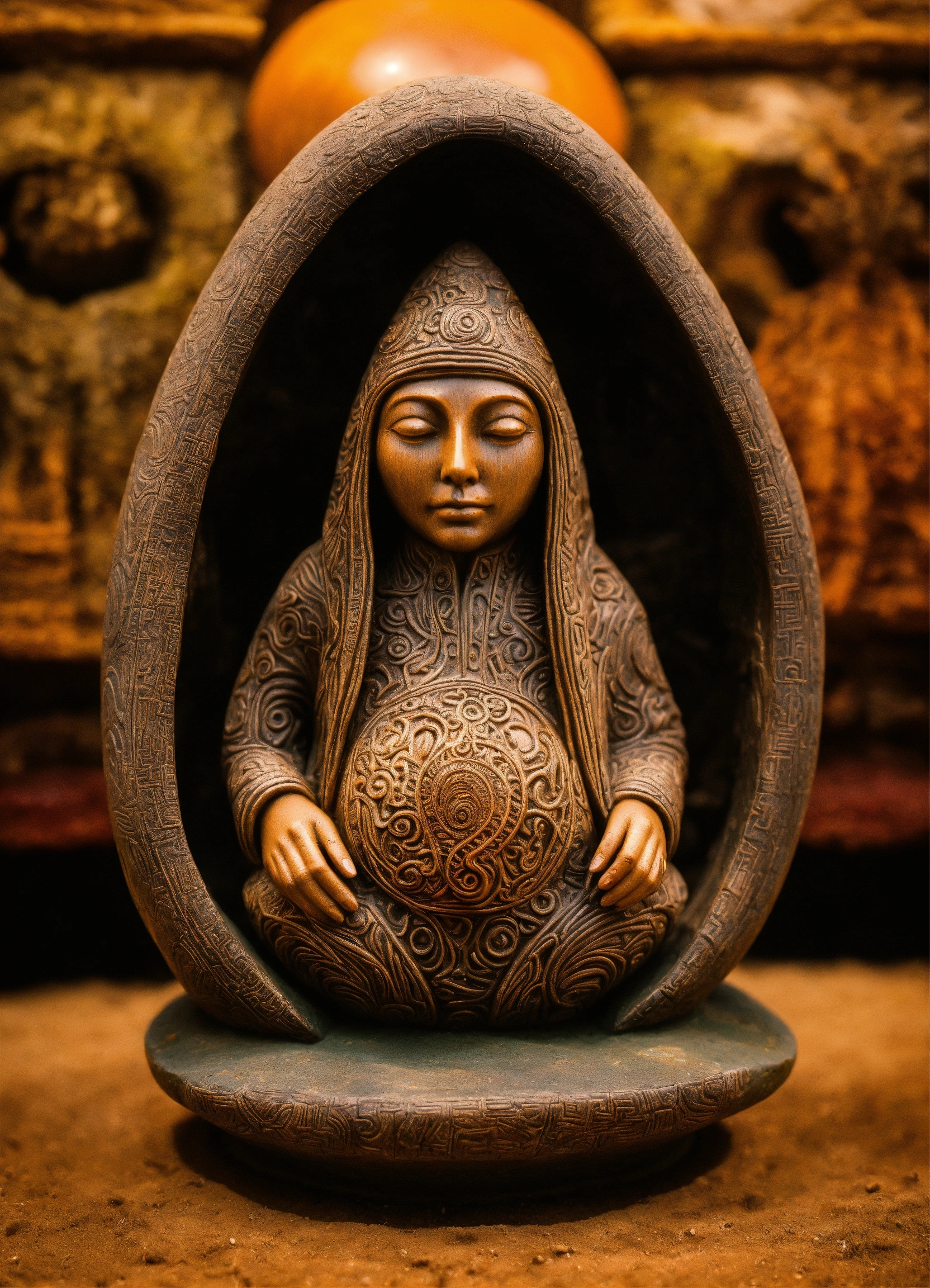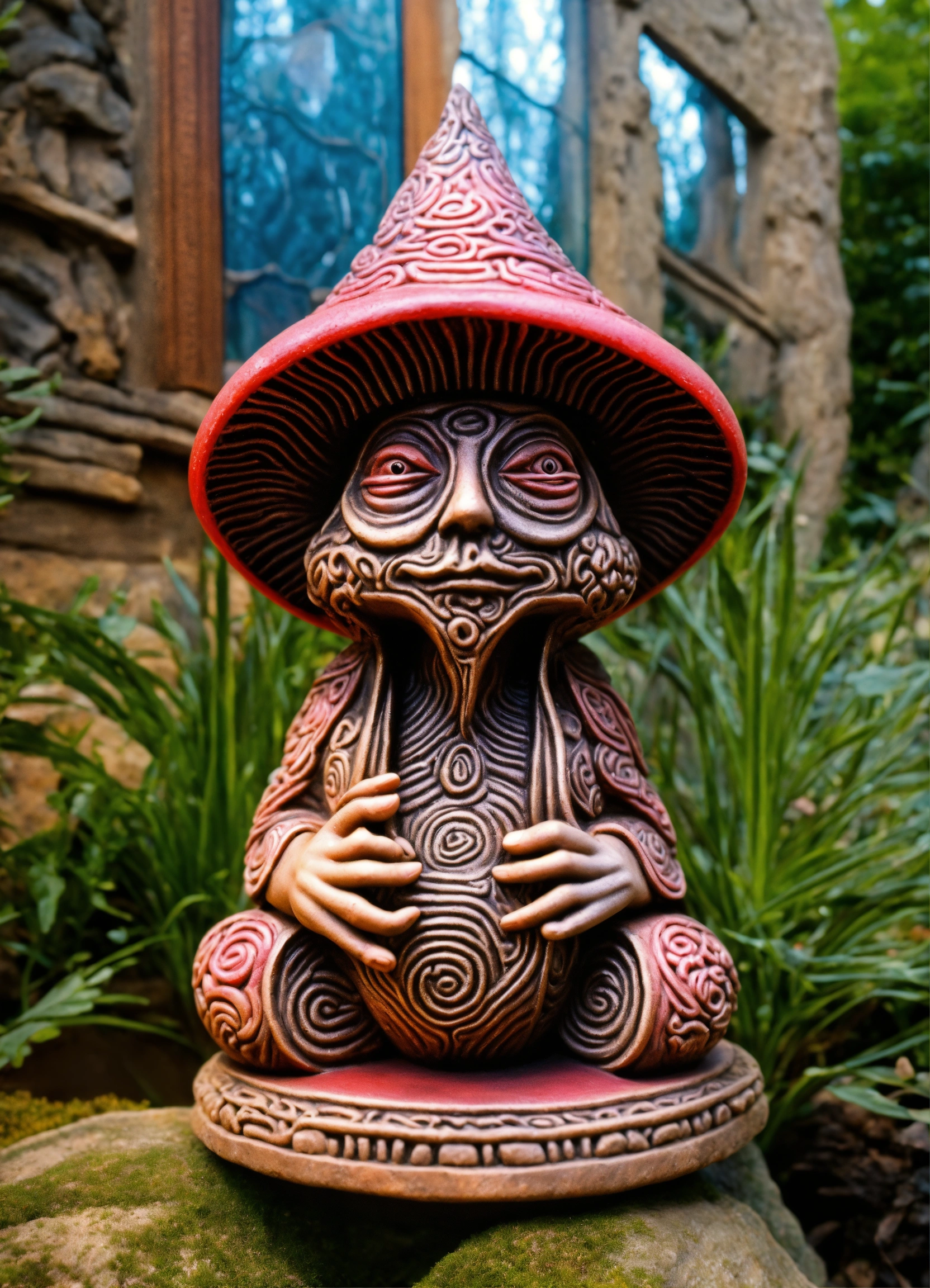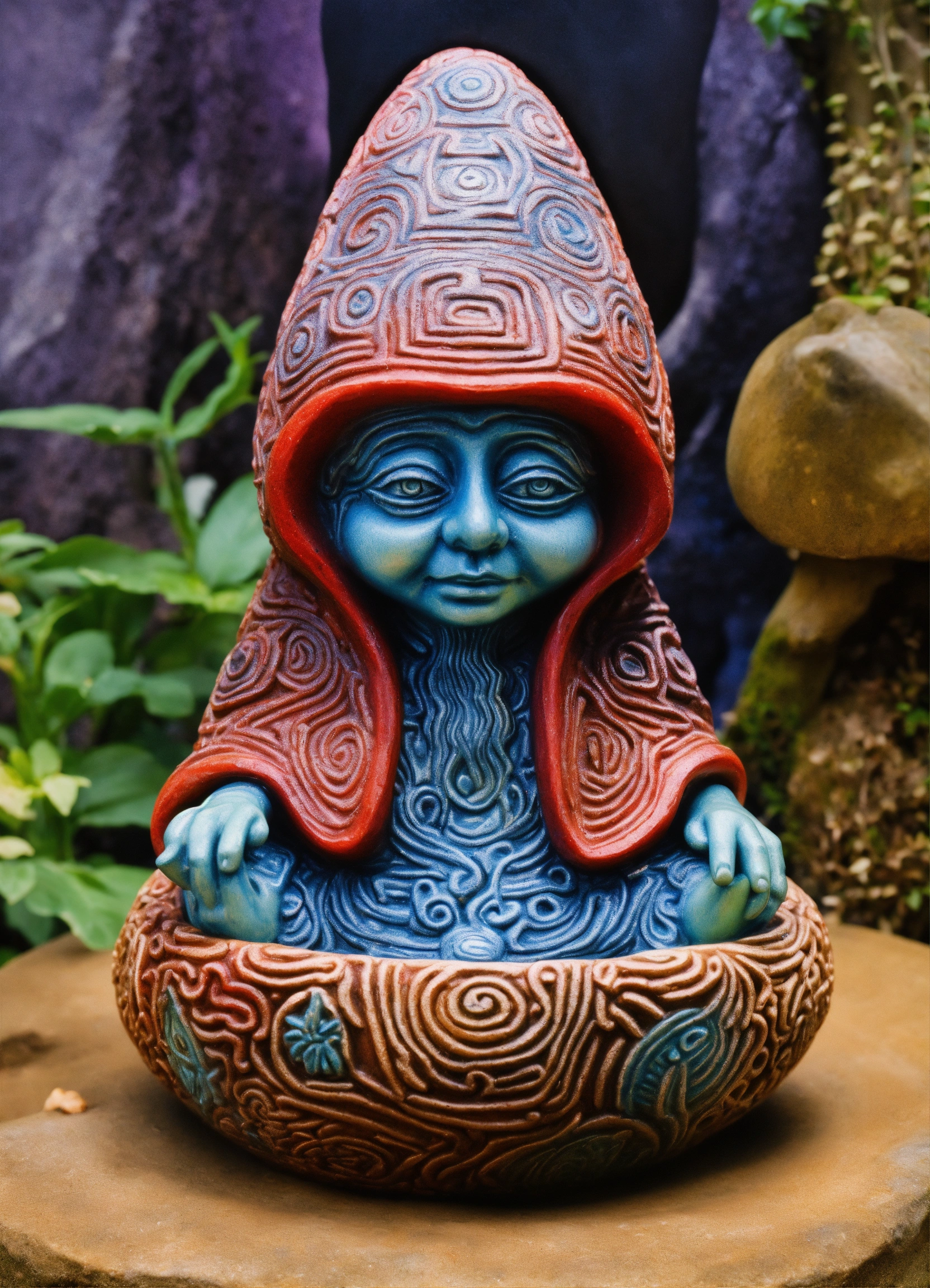 An oval shaped ancient stone hand made meditative hooded gnome garden sculpture in the style of alex grey, magic mushroom, lsd, dmt, giger