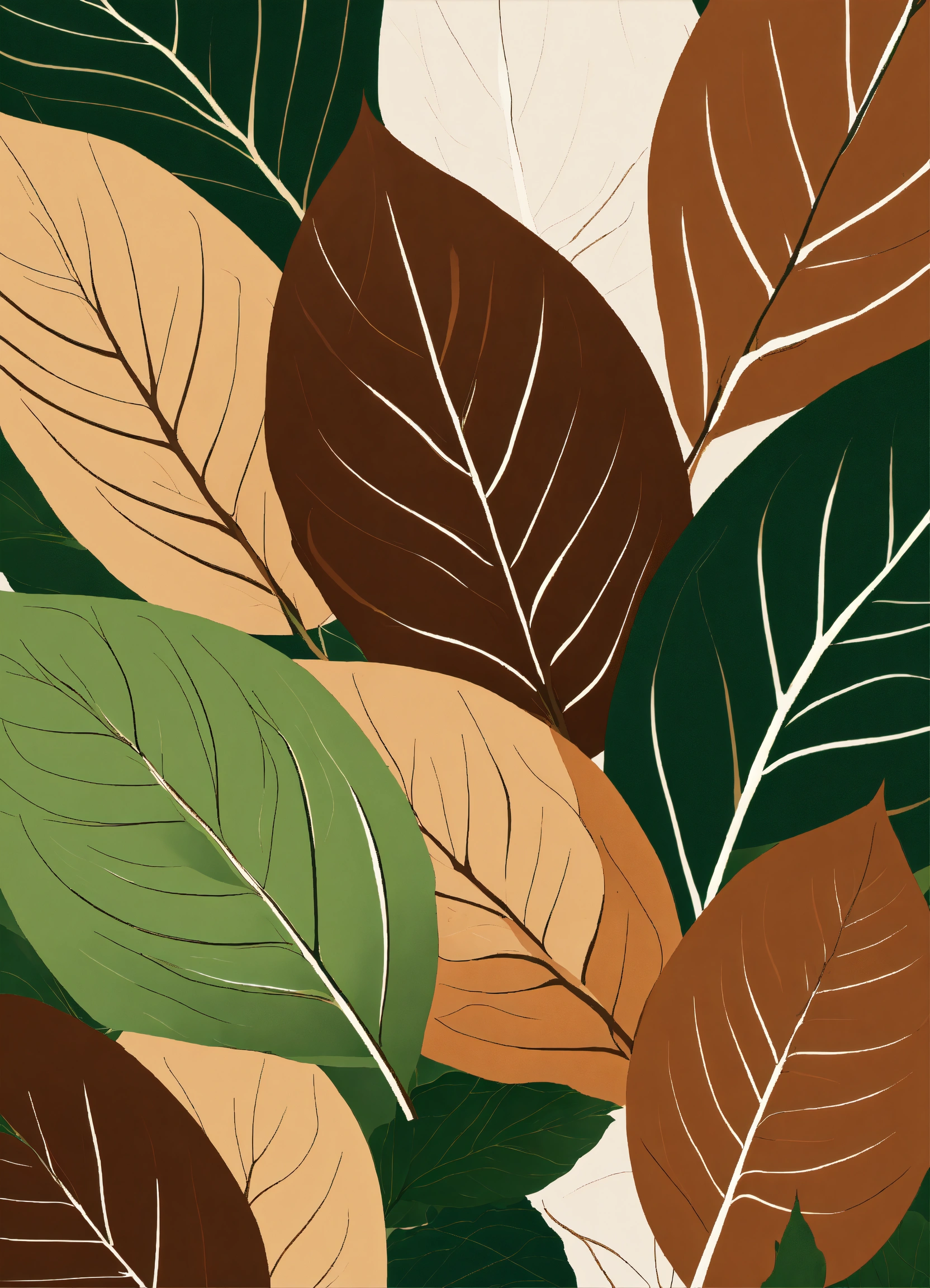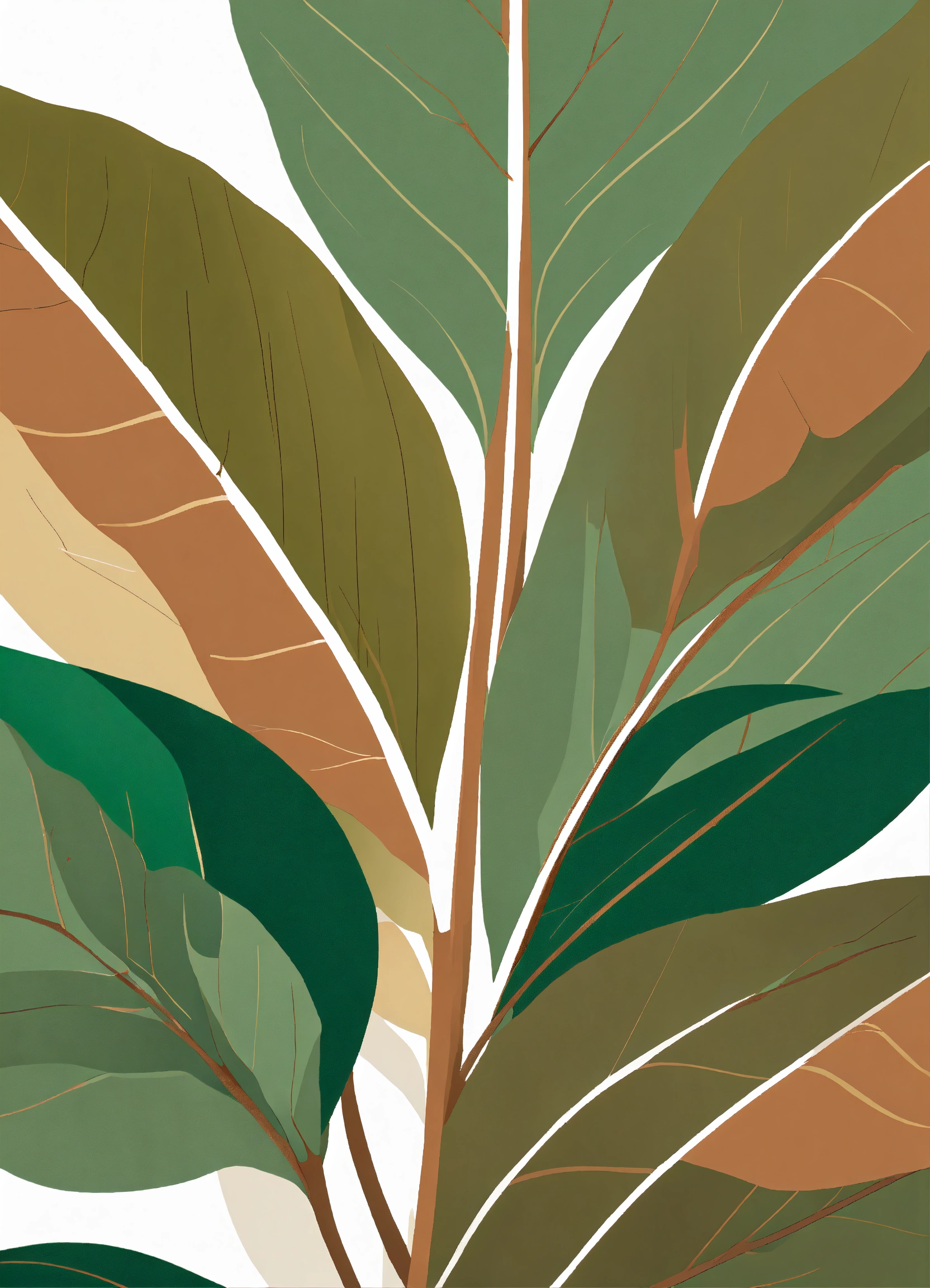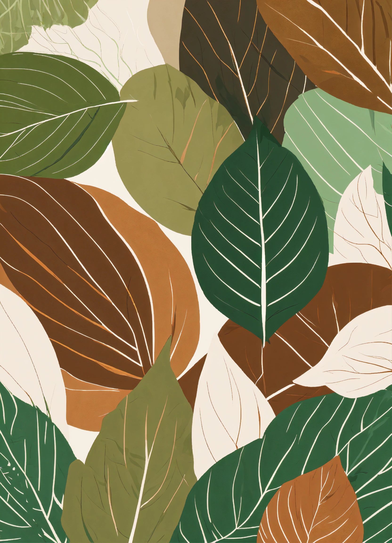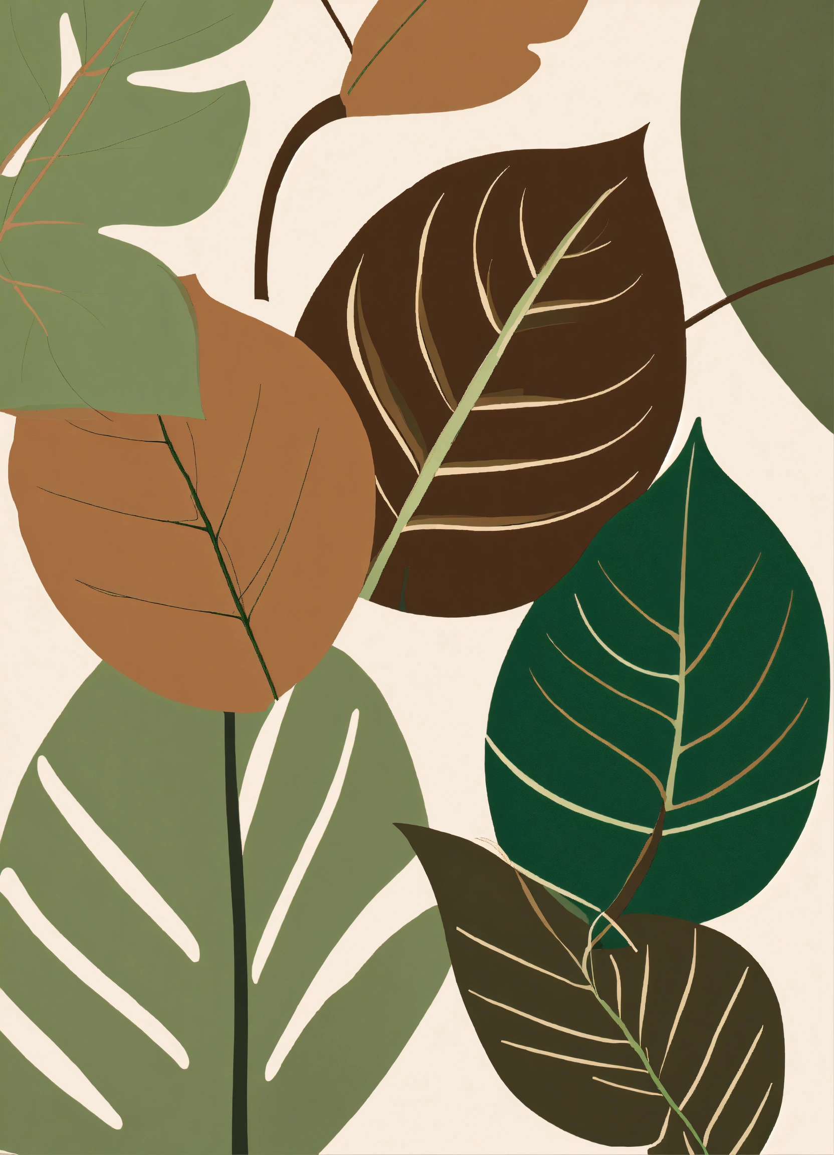 Abstract design of a botanical leaves, green & brown color, minimalist concept, matt natural white background 75% visible