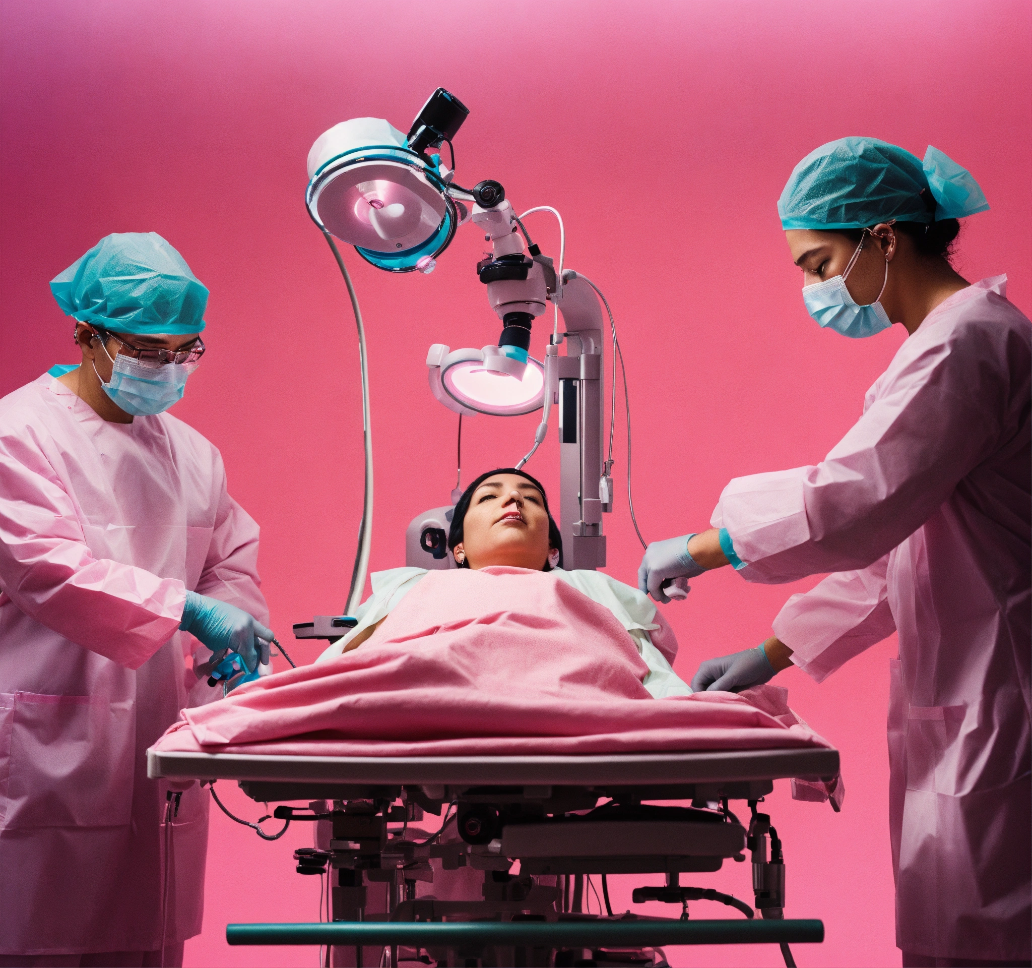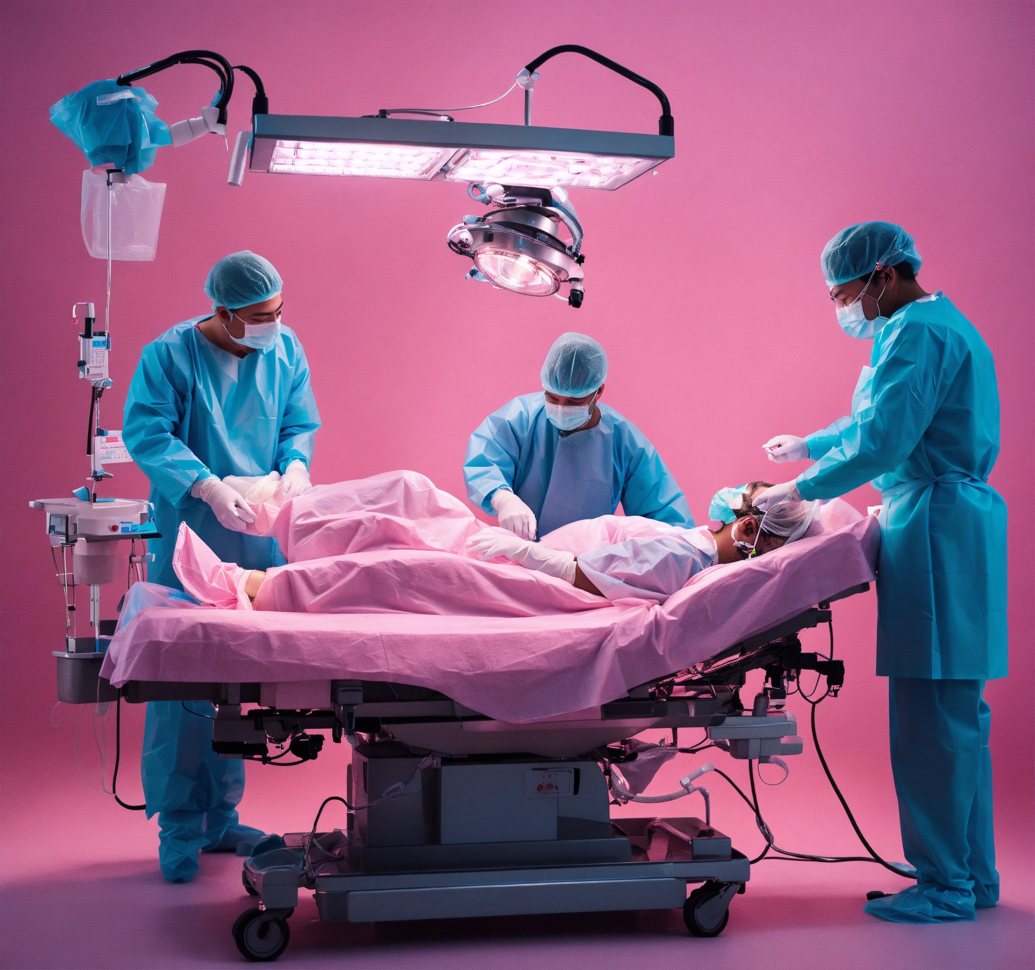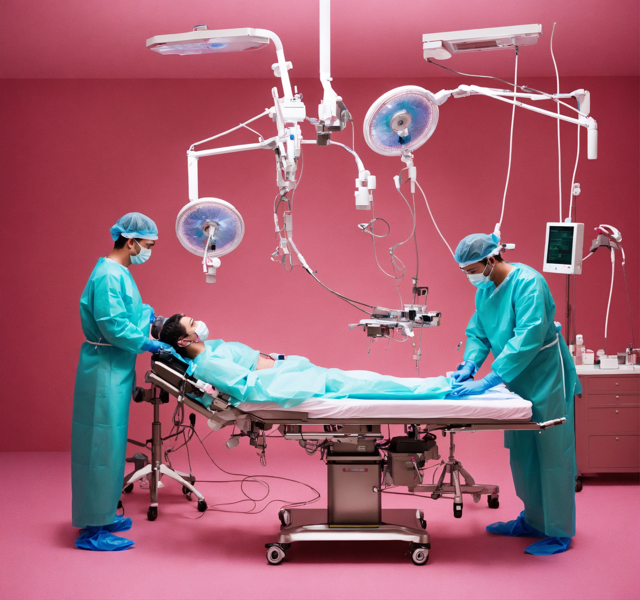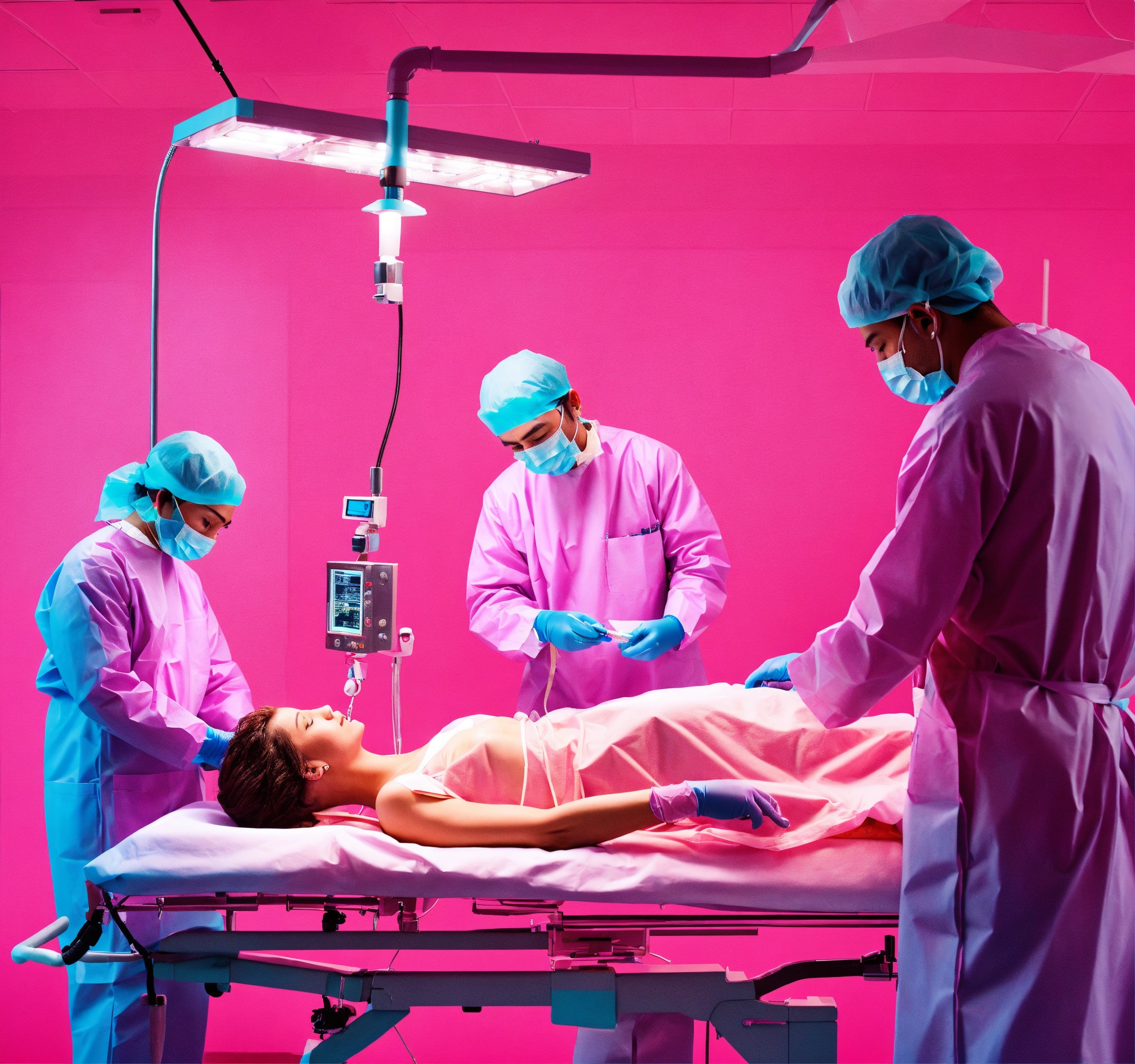 A surgeon and his team operate on a patient still shot, side angle, highly detailed, intricate details, pink background