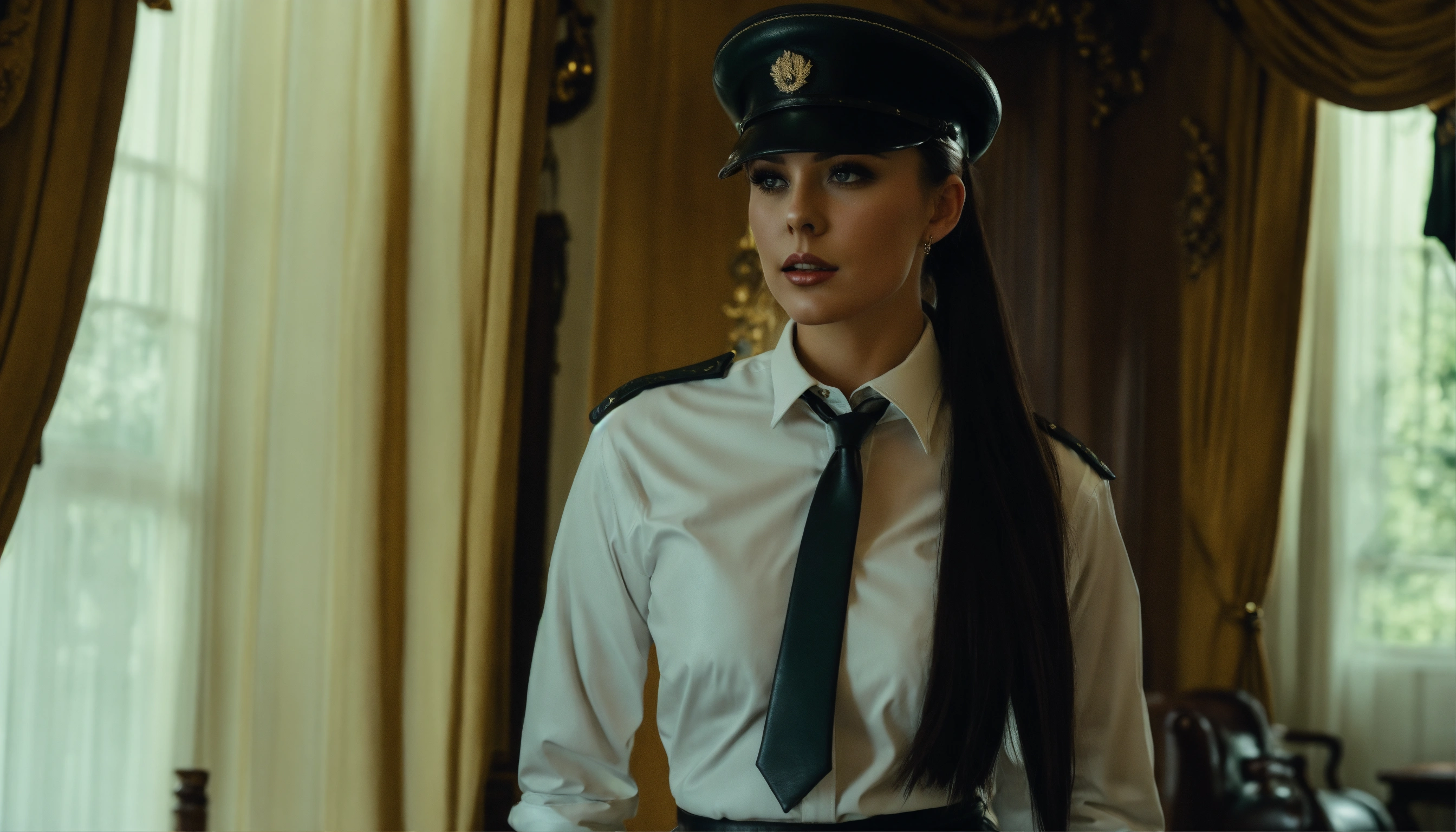 Stunning european mistress woman, fashion models, brunette straight high ponytail, strict black business leather skirt, white shirt and leather long necktie, leather black big german military cap, mansion room, shirt and tie
