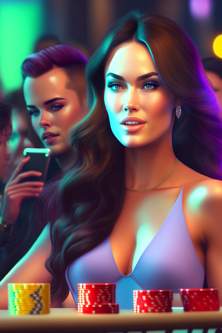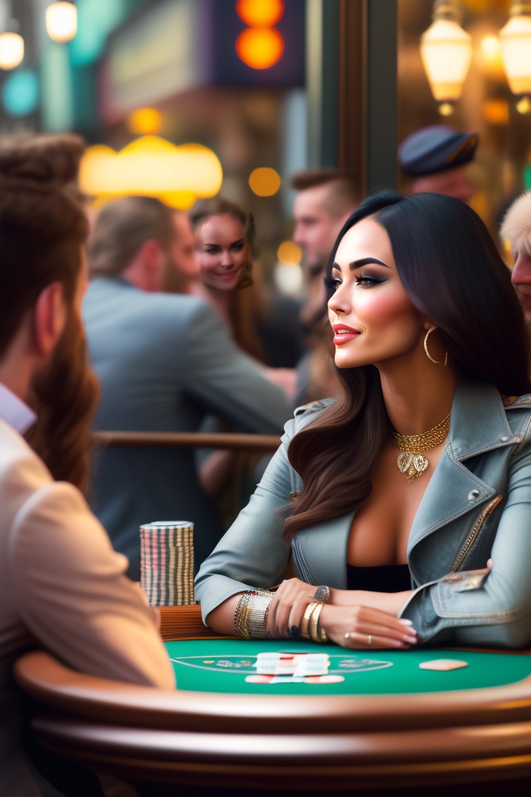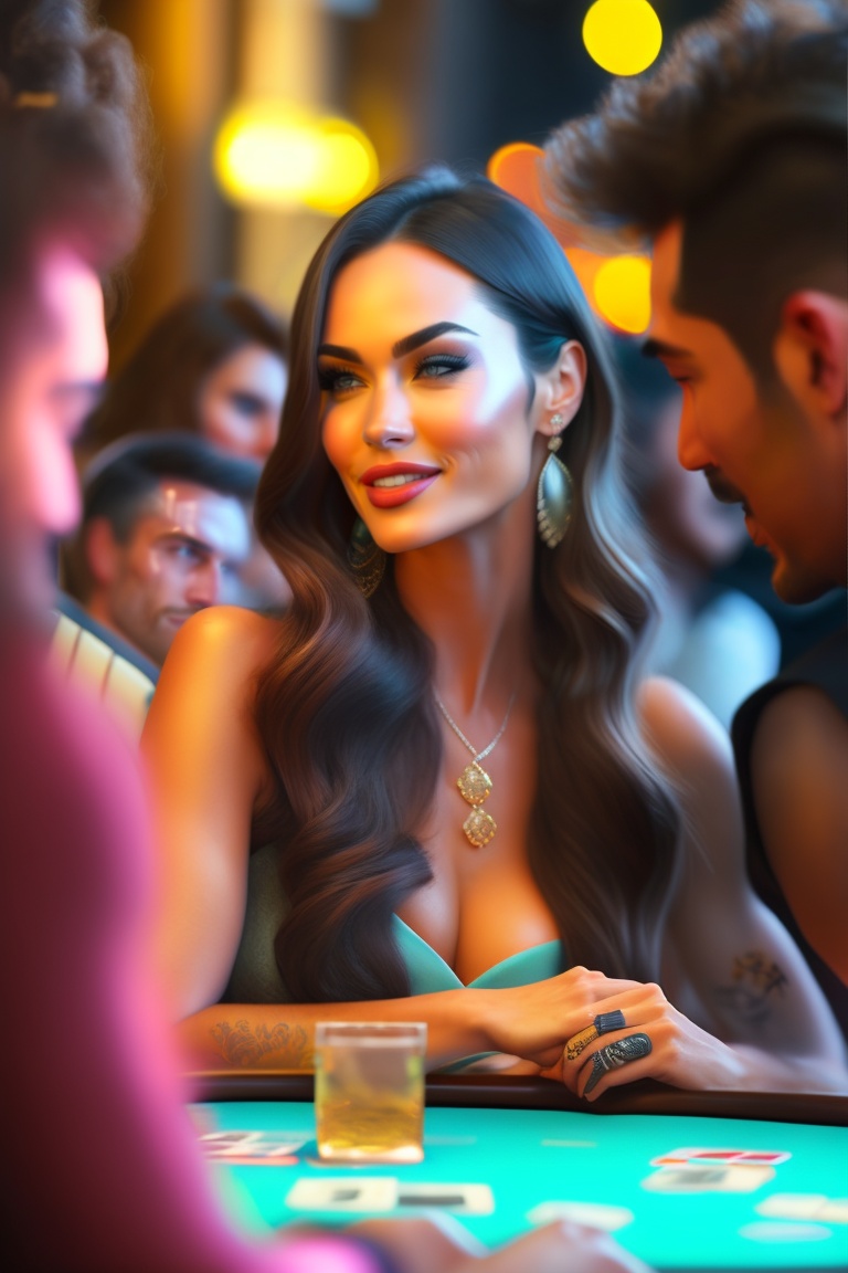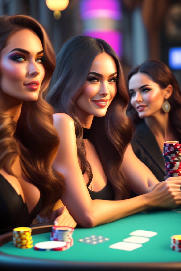 Megan fox, sitting playing poker with others beautiful models, in the middle of a las vegas street with people watching them, professional photographic image, high definition, 4k.
