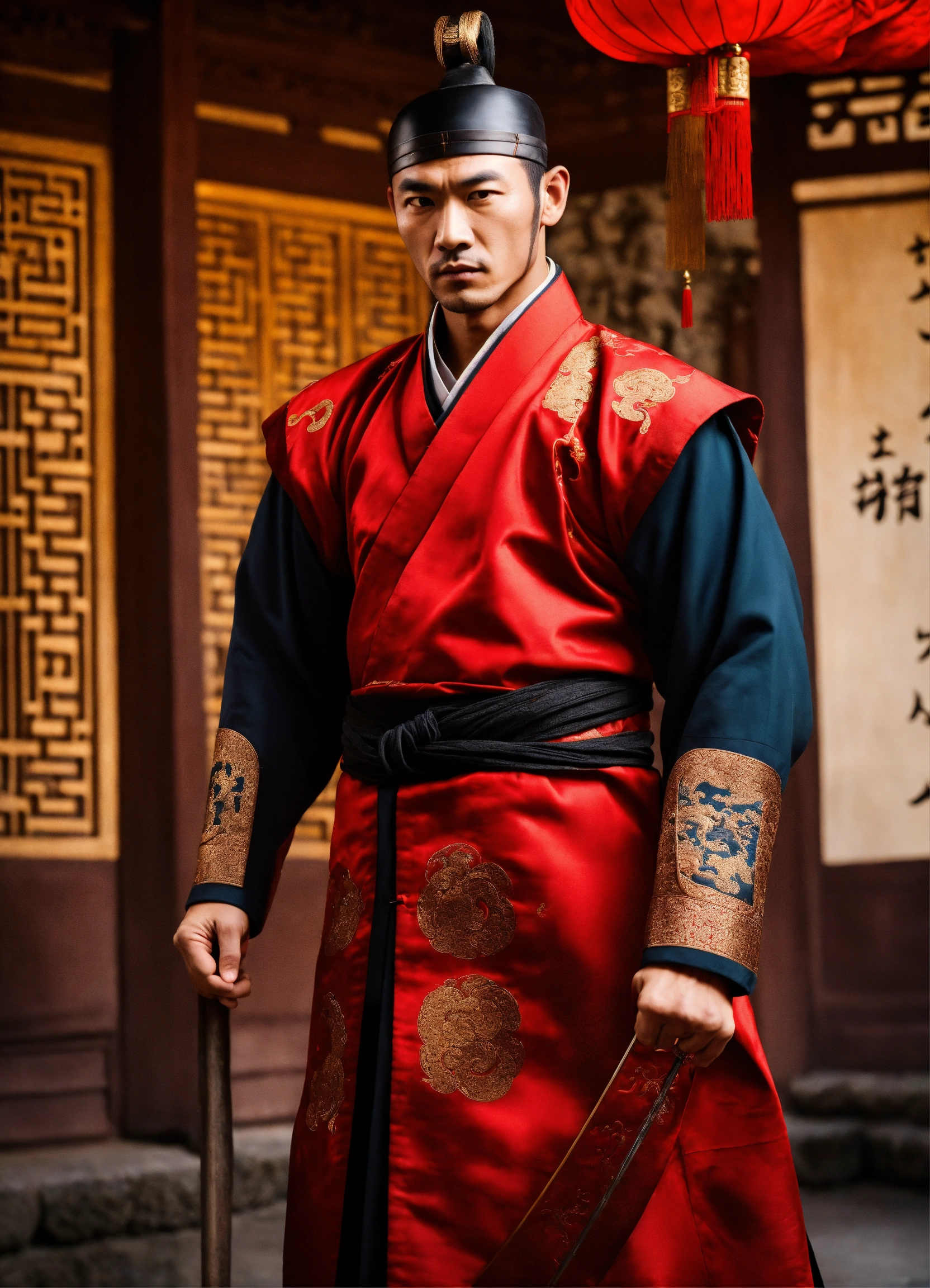 Imagine a smart man with the rule of loving others and using softness to control hardness. his long face, sharp, intelligent eyes and tailored warrior outfit symbolize his strength and determination. in ancient chinese style. with intelligence, determination, sharp eyes, high forehead. the scene is in a solid stone house
