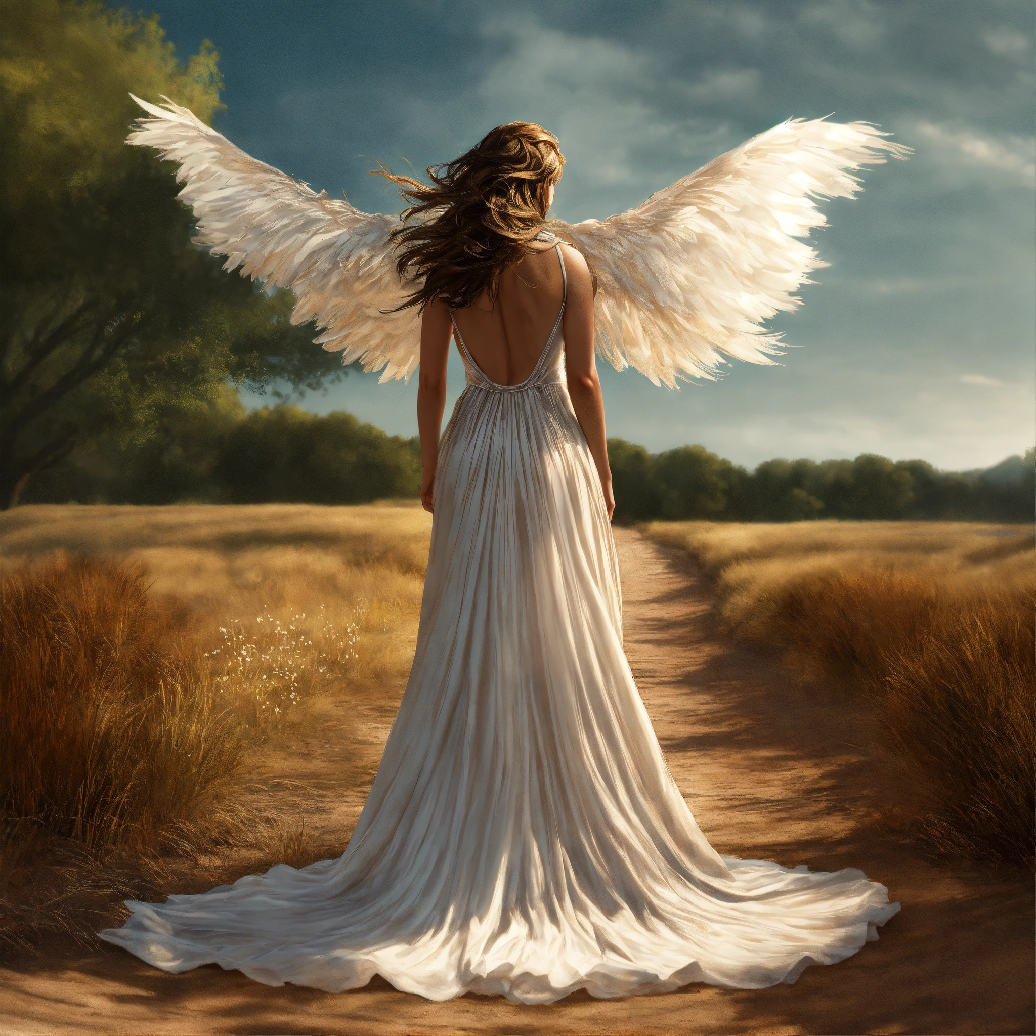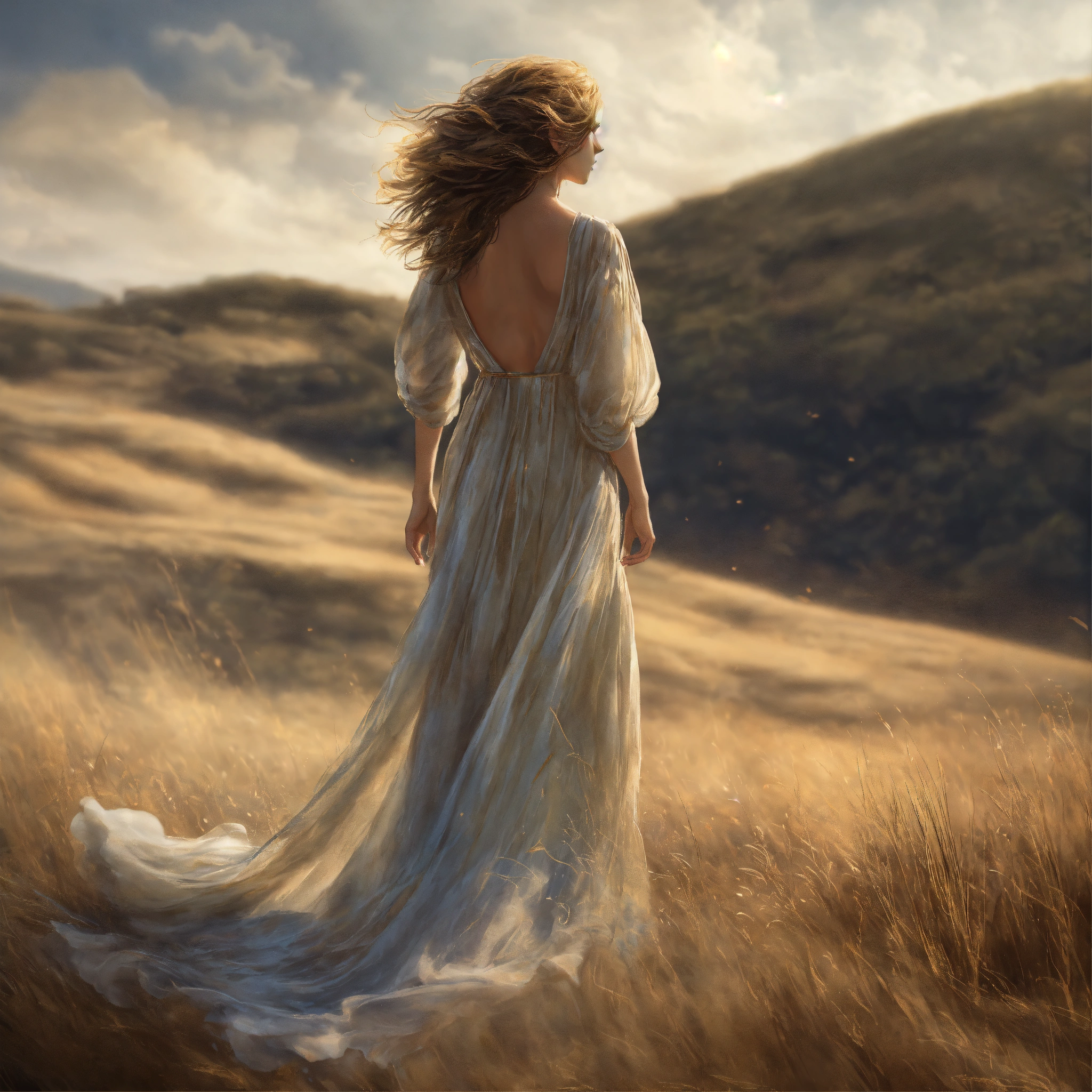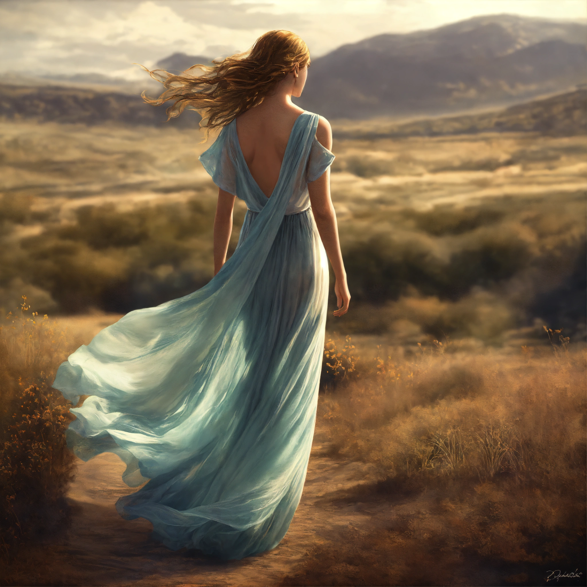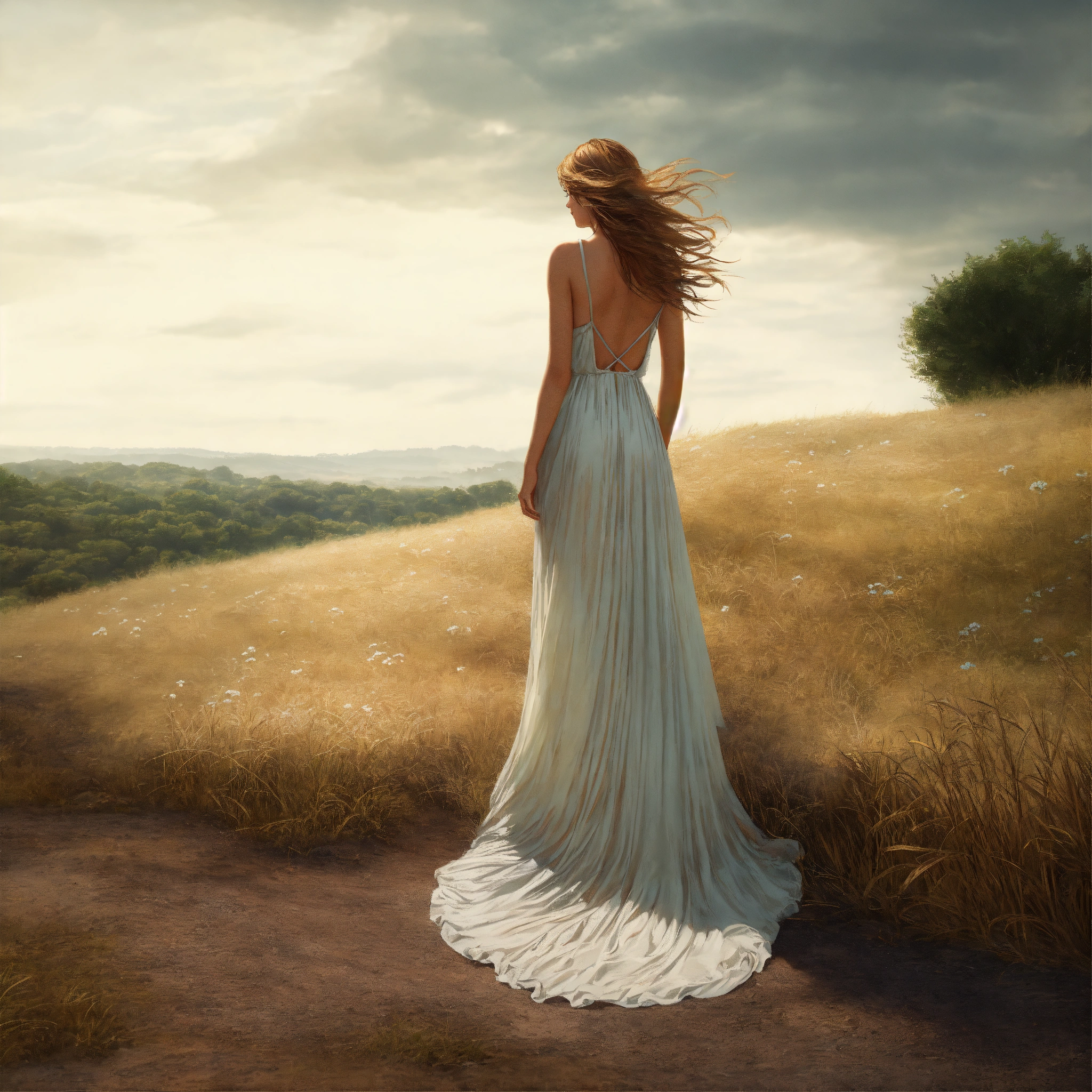 Headless, hair in the wind, full body, backside, hyper realism, poetic, romantic, angelic long dress, realistic shading, realistic render, detailed textures, photorealistic, wide shot, landscape
