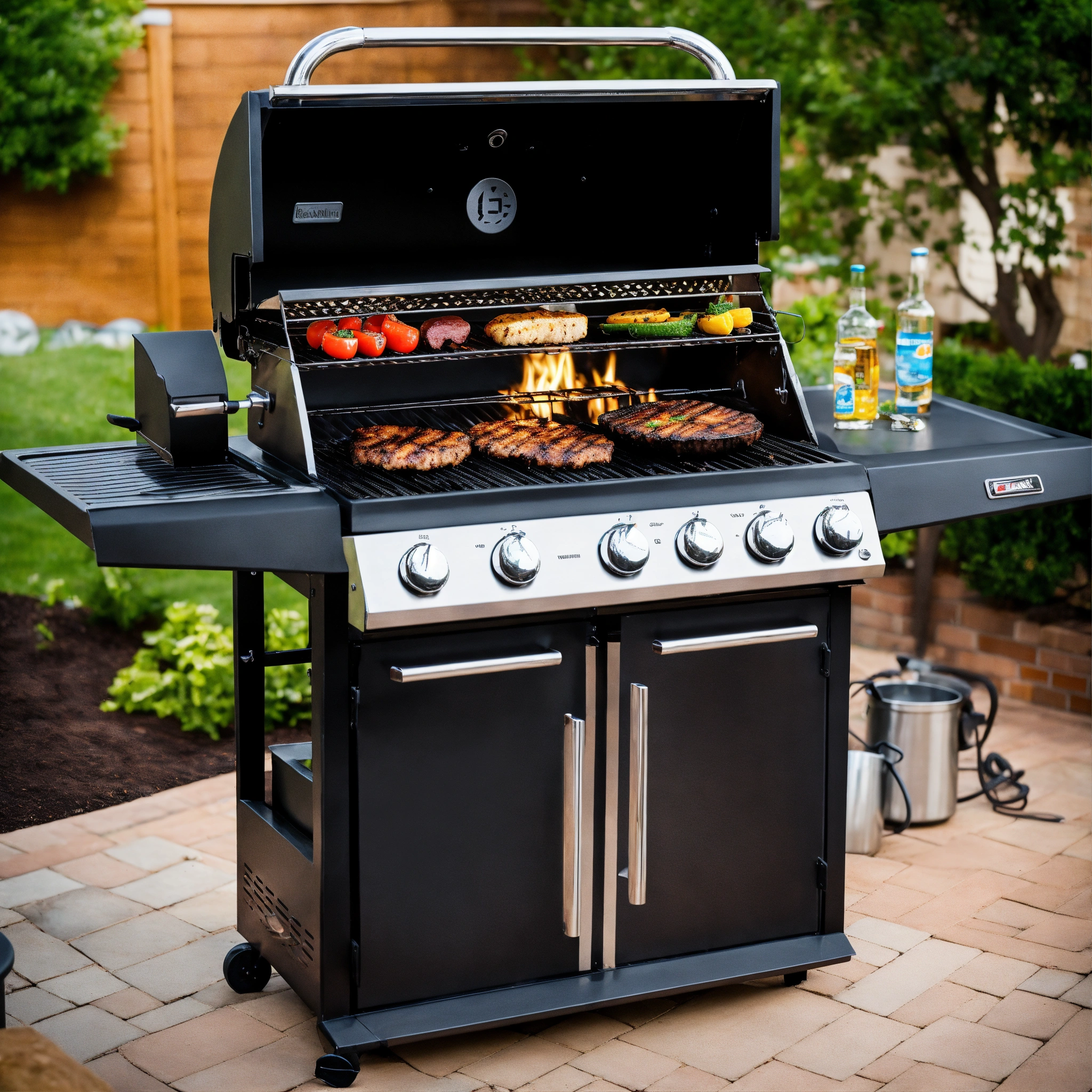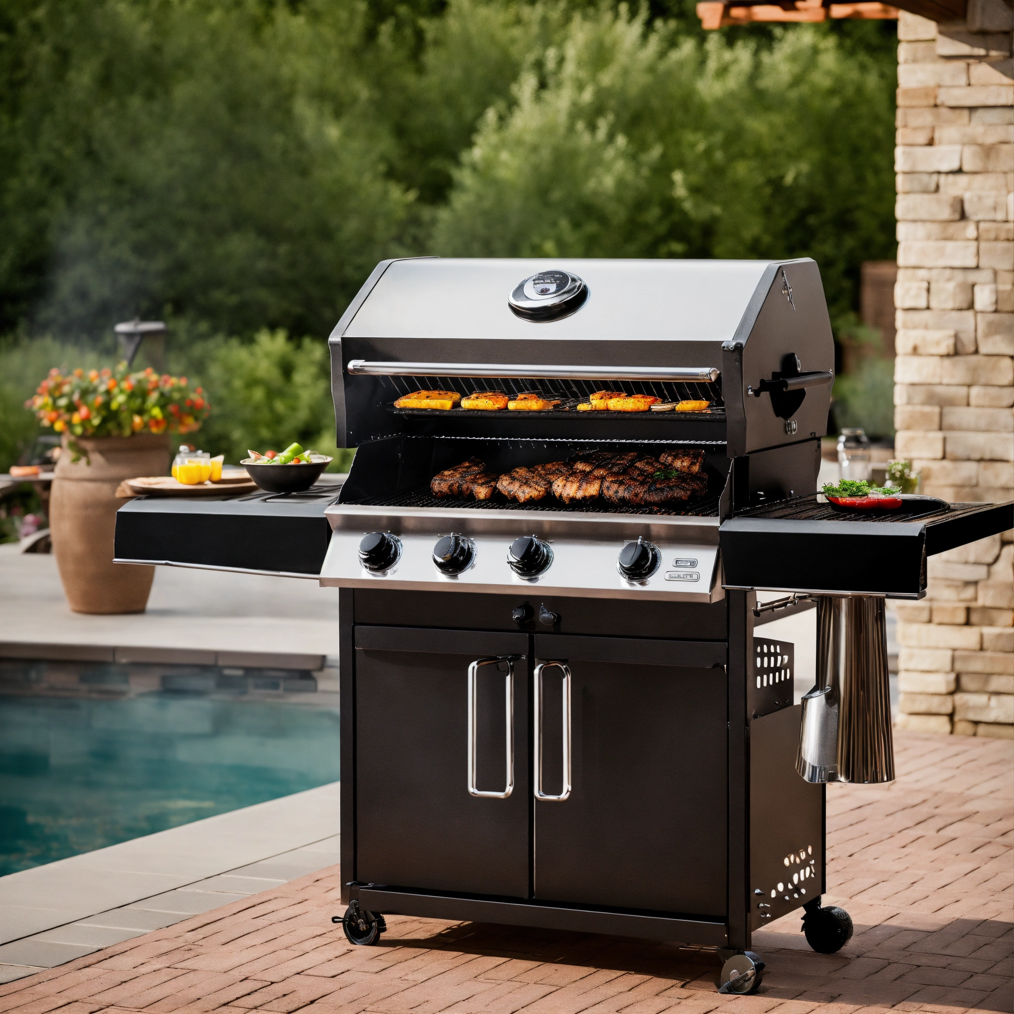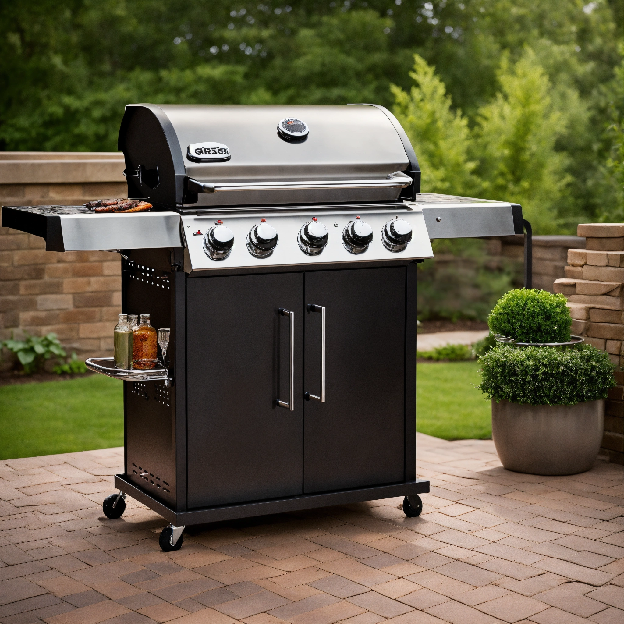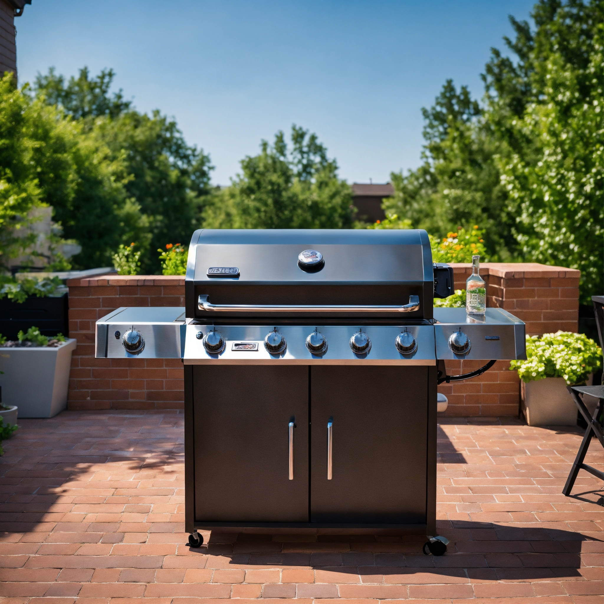 A photo of a gas grill, the grill is made of black metal and has a stainless steel cooking surface, the grill is located in a backyard with a brick patio