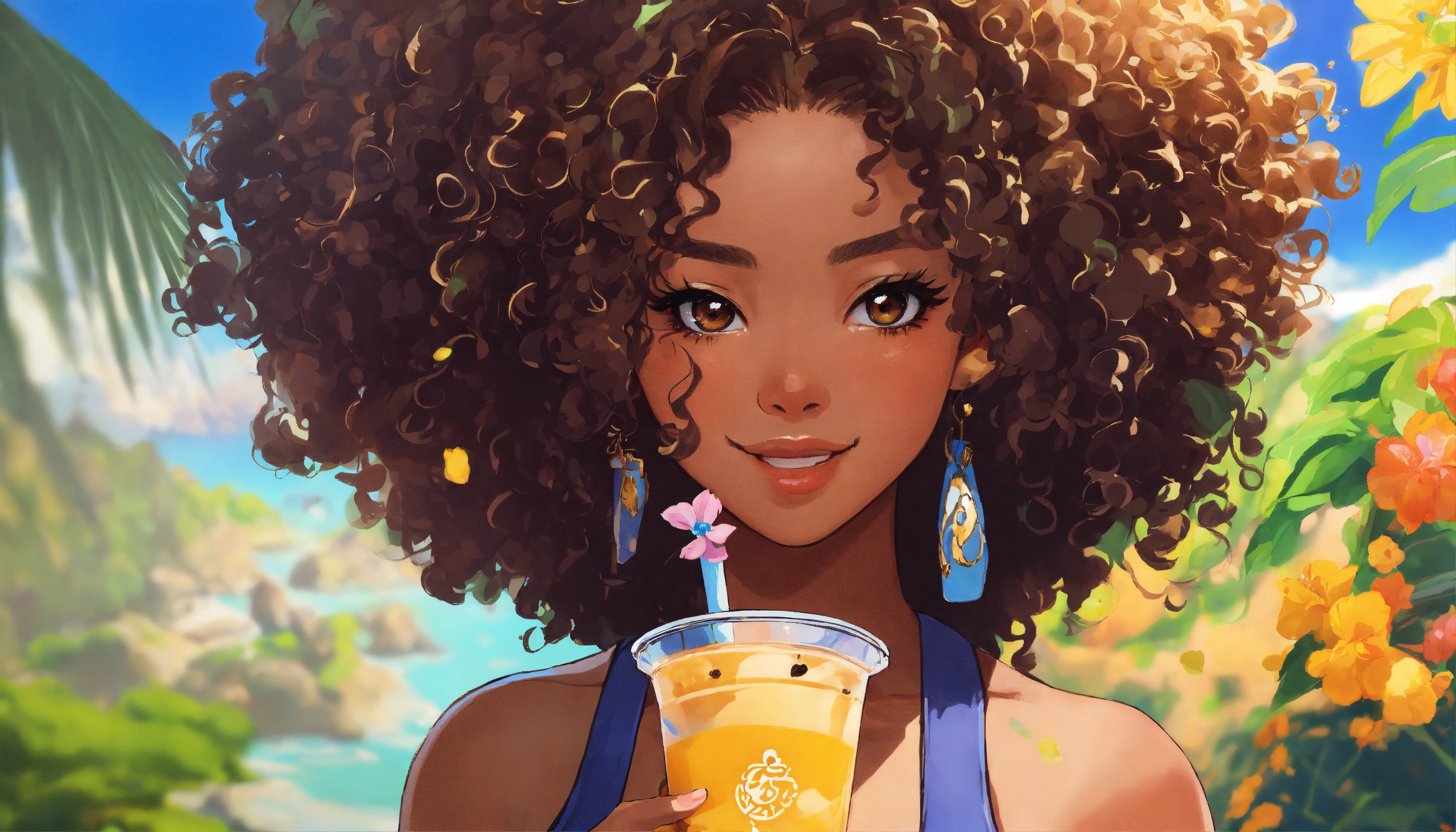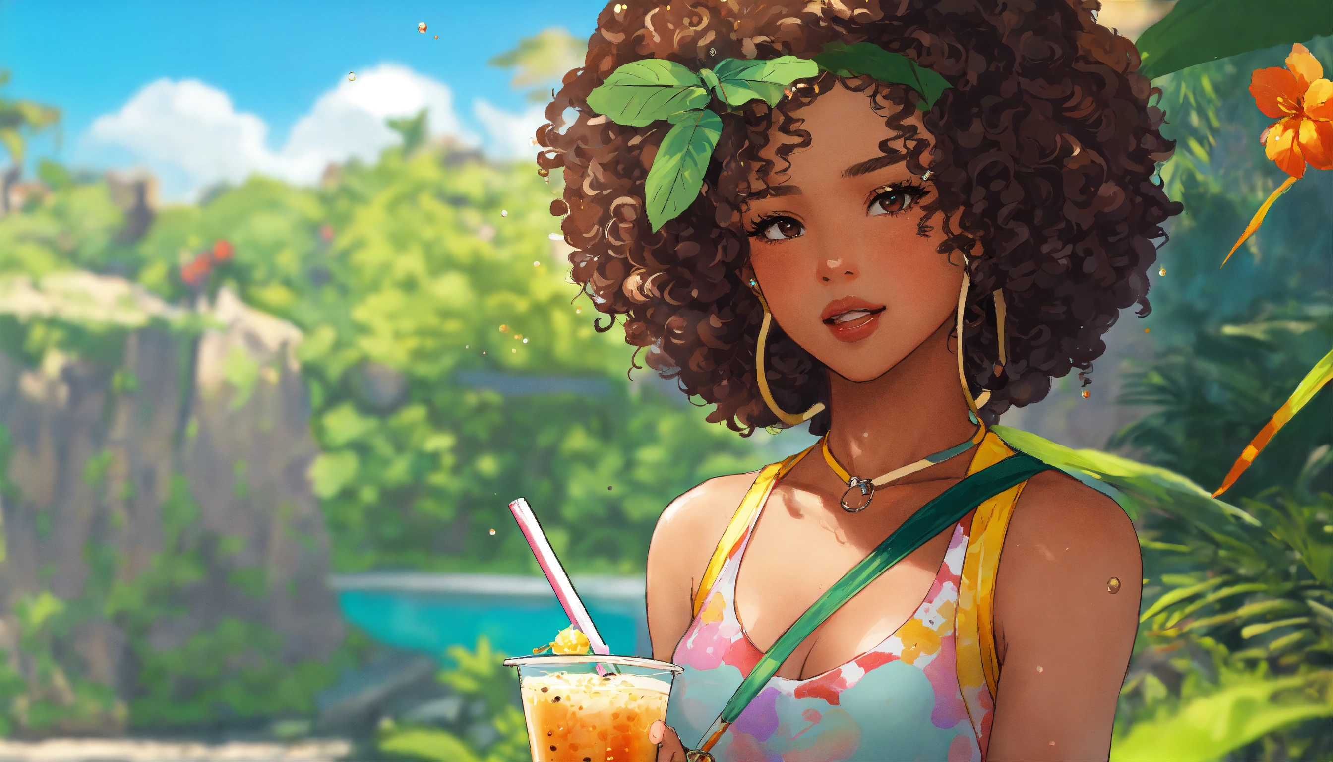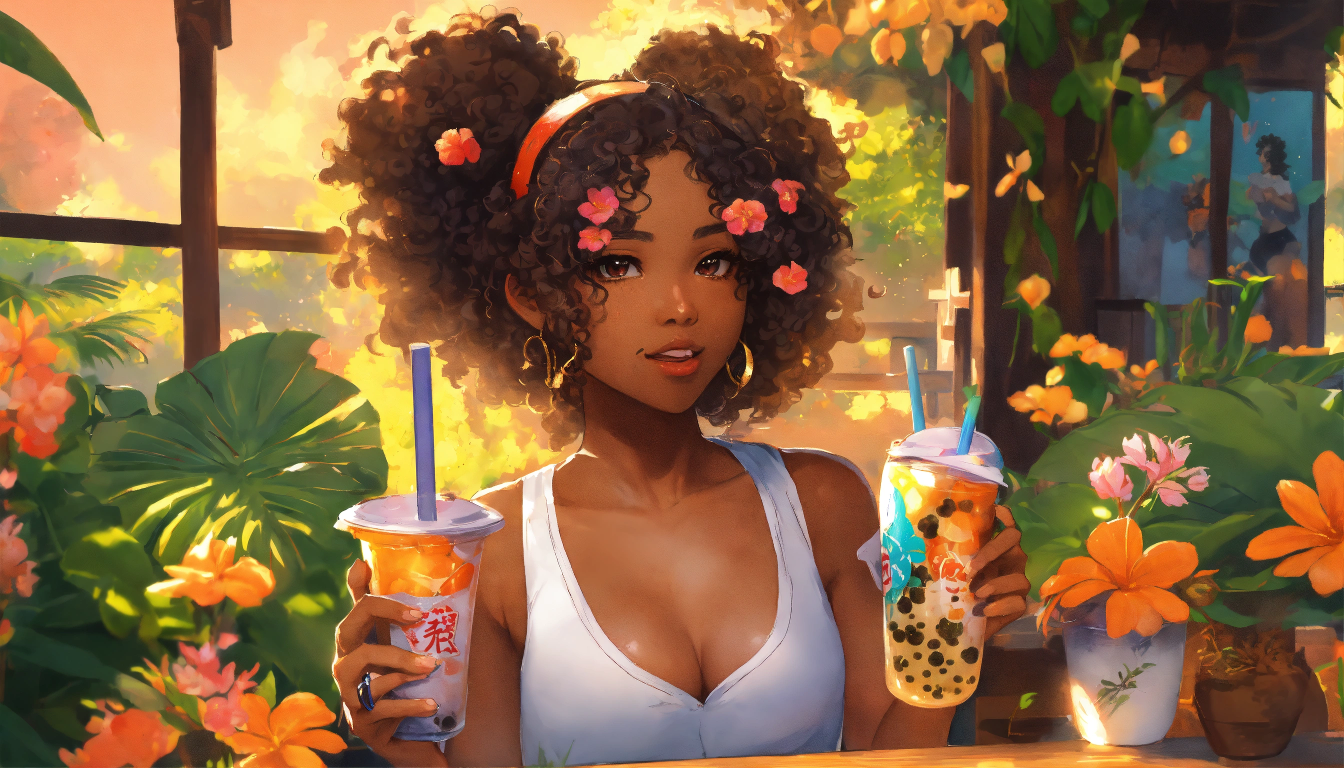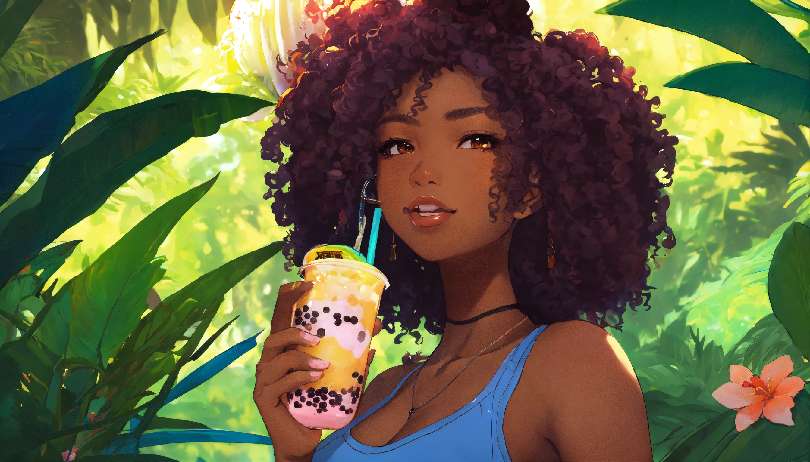 Boba tea, bubble tea, cute, sweet, beautiful, feminine, sporty, gym exercise, buttocks exercise, fitness, afro, boba tea vector, curly locks, joy, boba tea, milk tea, tropical background, island girl, tropical, exotic flowers, boba tea, boba tea, cute girl, curly hair, cute waifu, afro, girlie, yoshitaka amano, genshin impact, trending pixiv fanbox, acrylic palette knife, 4k, vibrant colors, devinart, trending on artstation, low details.