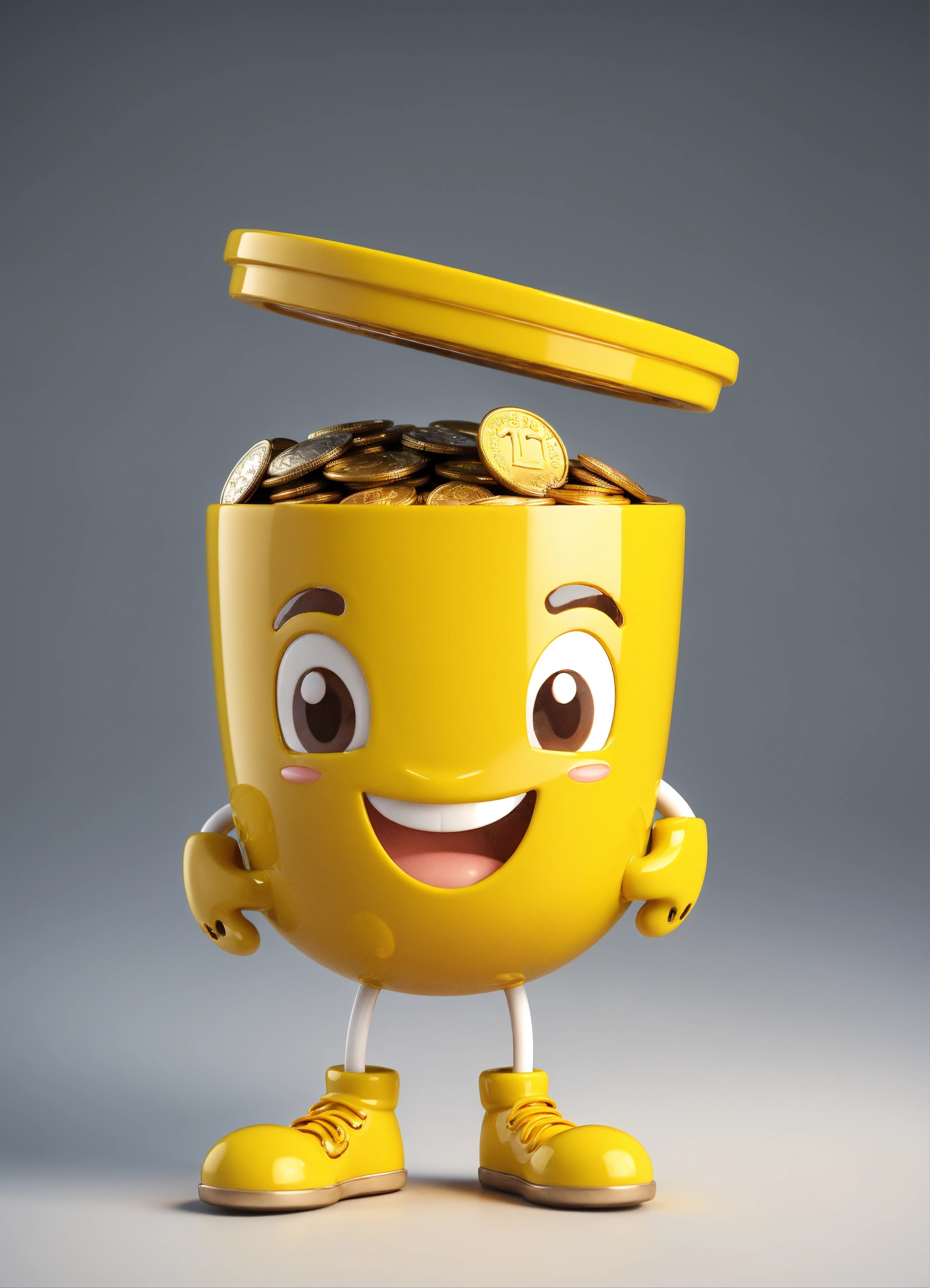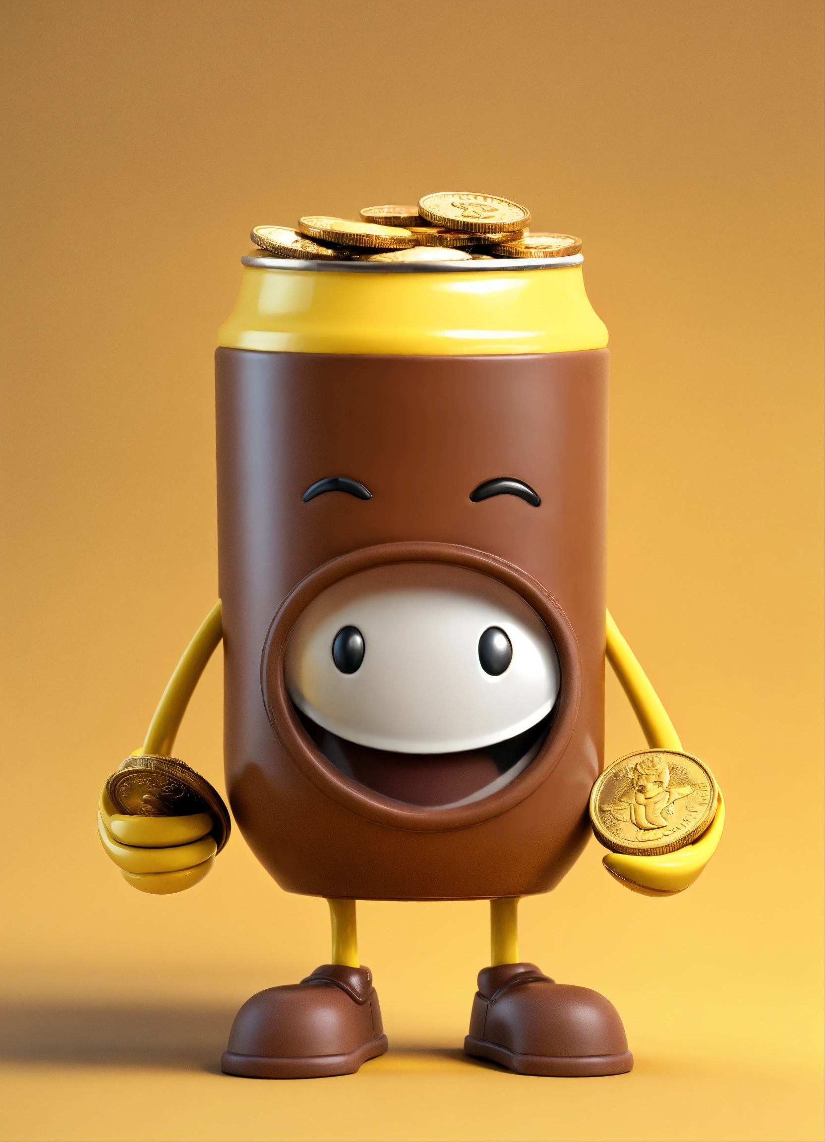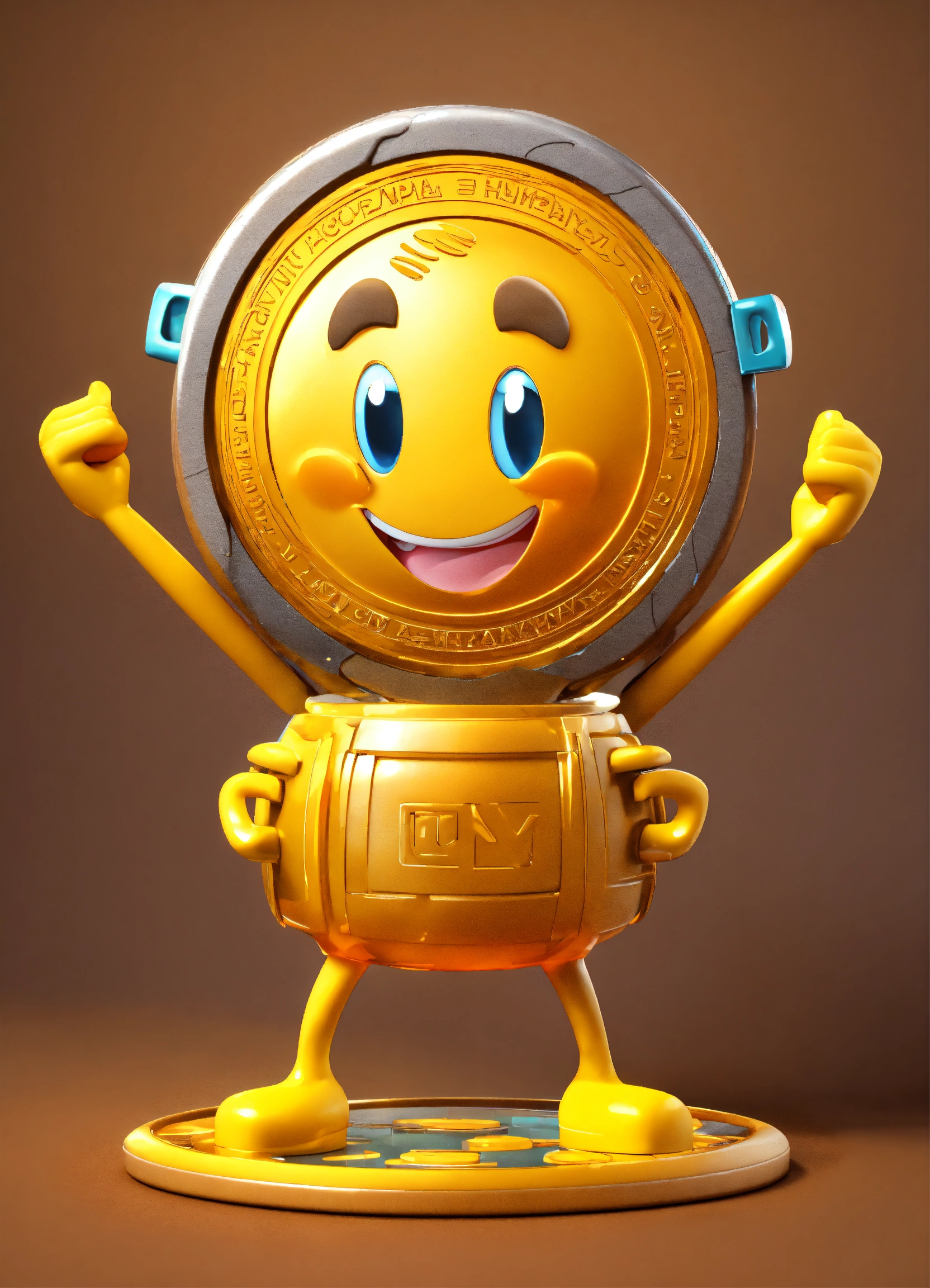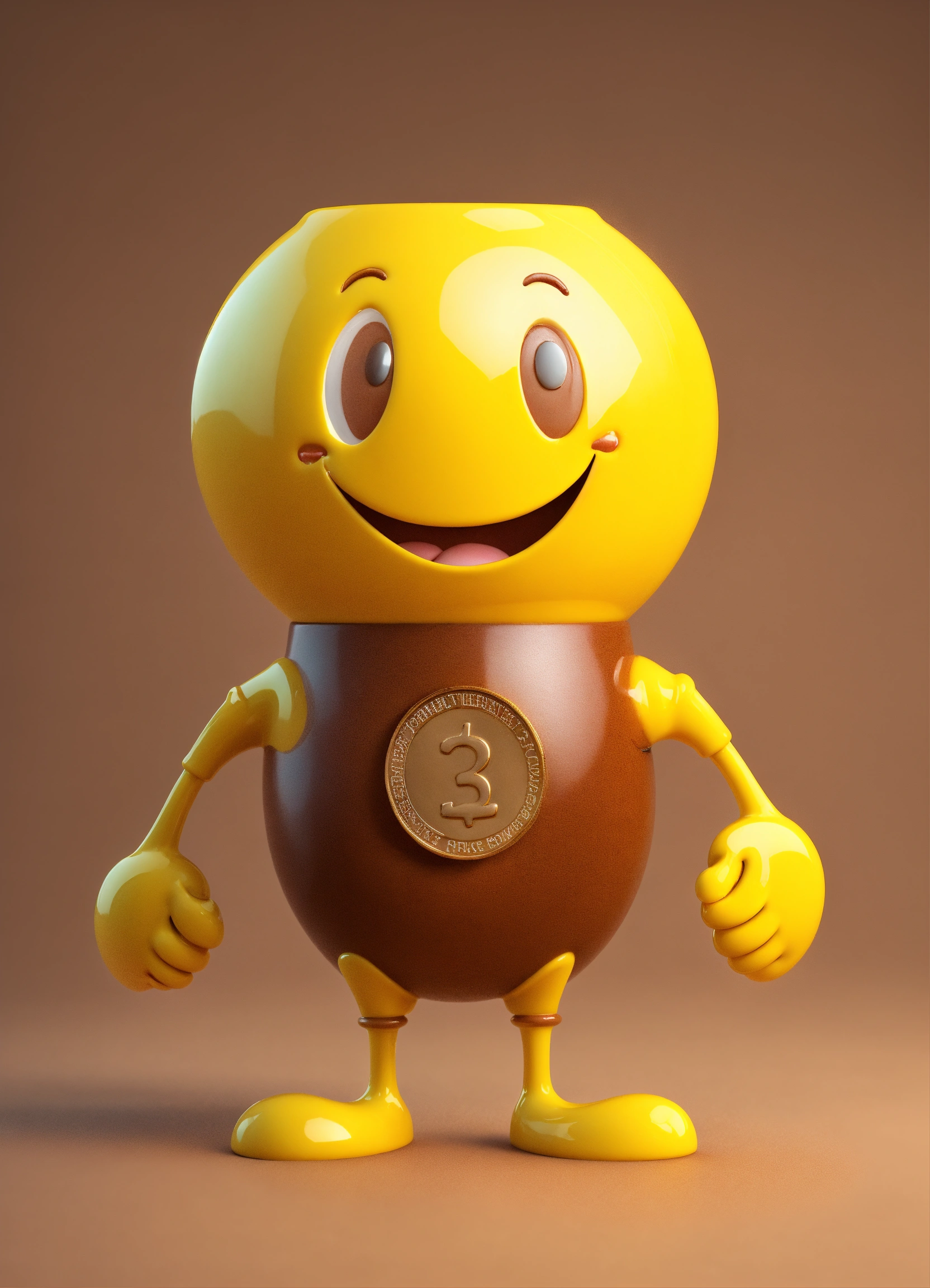 A coin character is a portrait with arms and legs and a smiling face, happy and cute erect yellow and brown name color name is crazycup 3d