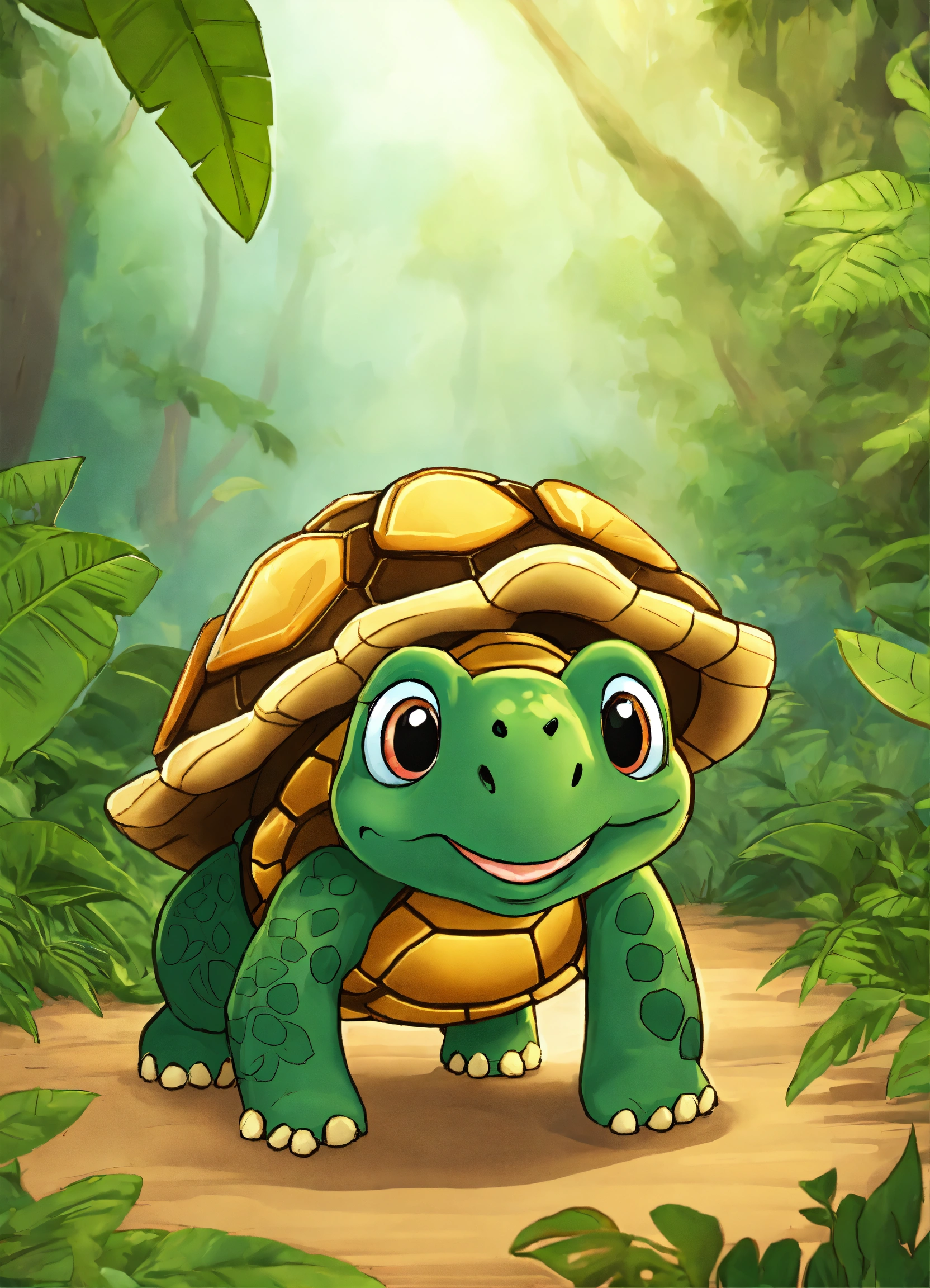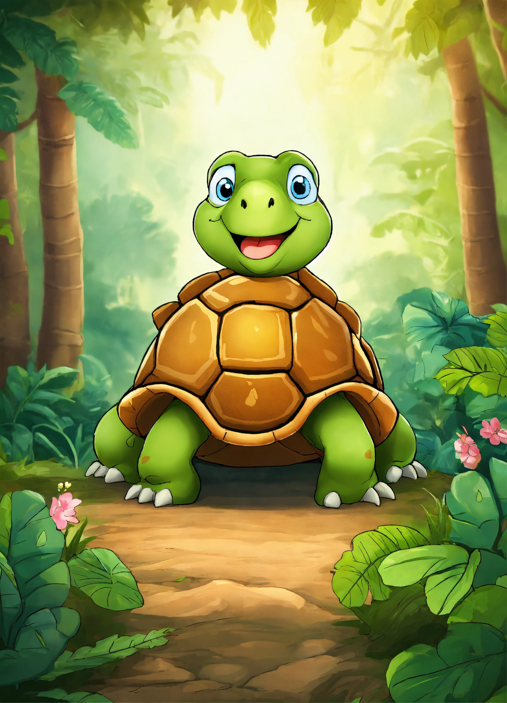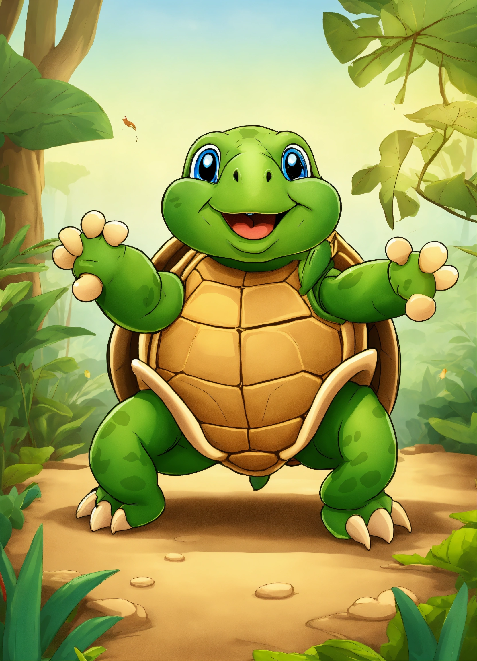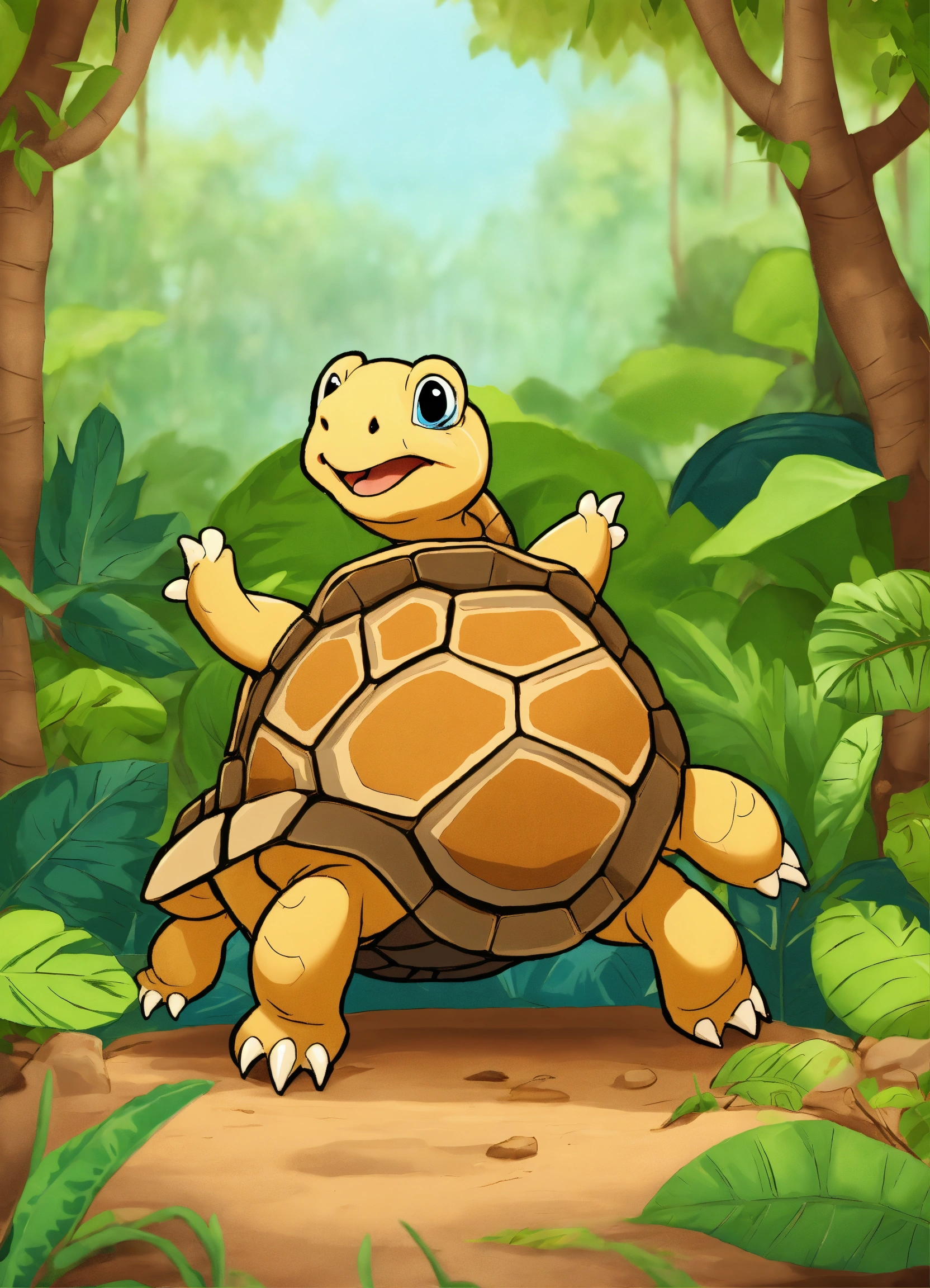 Cartoon single tortoise stand on his back two legs and talking happily in jungle