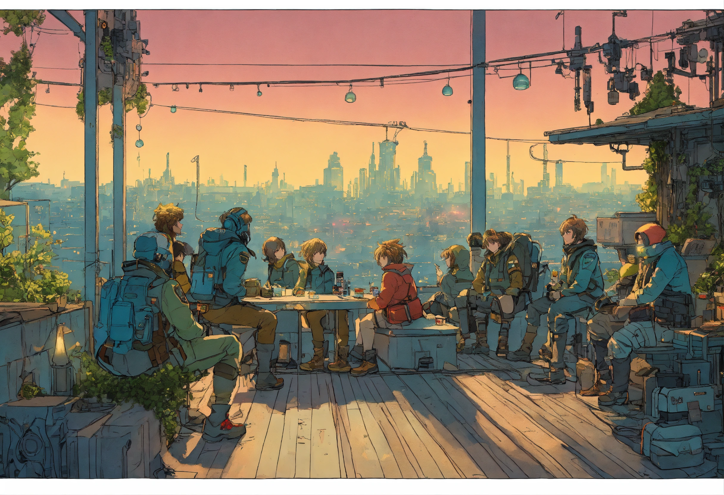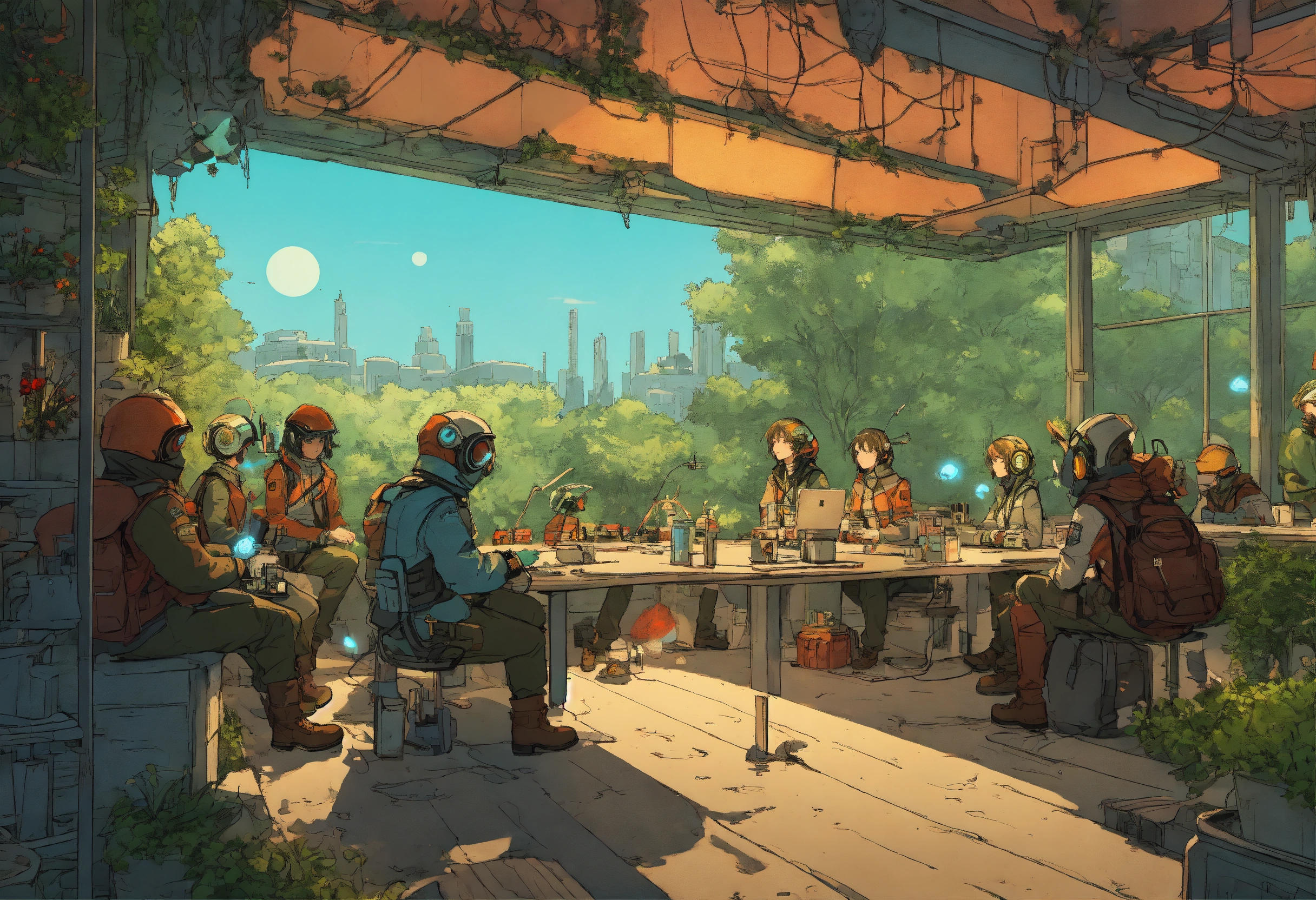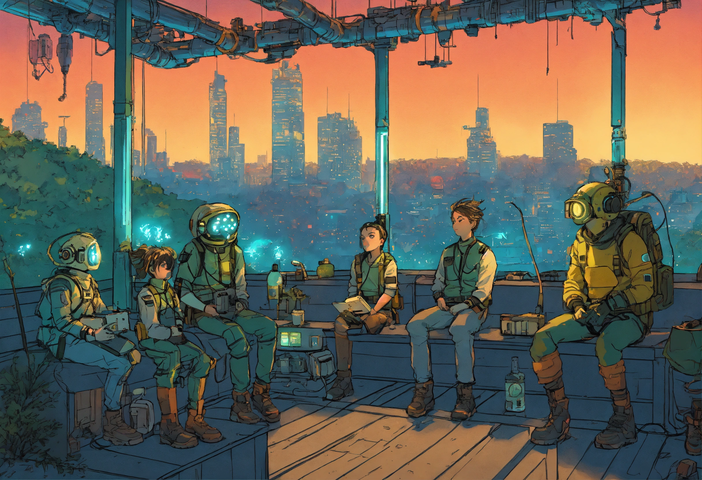 Futurepunk a team sitting on a rooftop and having a meeting, sunny day, colorful lighting, bioluminescent forest, sci-fi atmosphere, ultra-high definition (uhd), very detailed, by mattias adolfsson