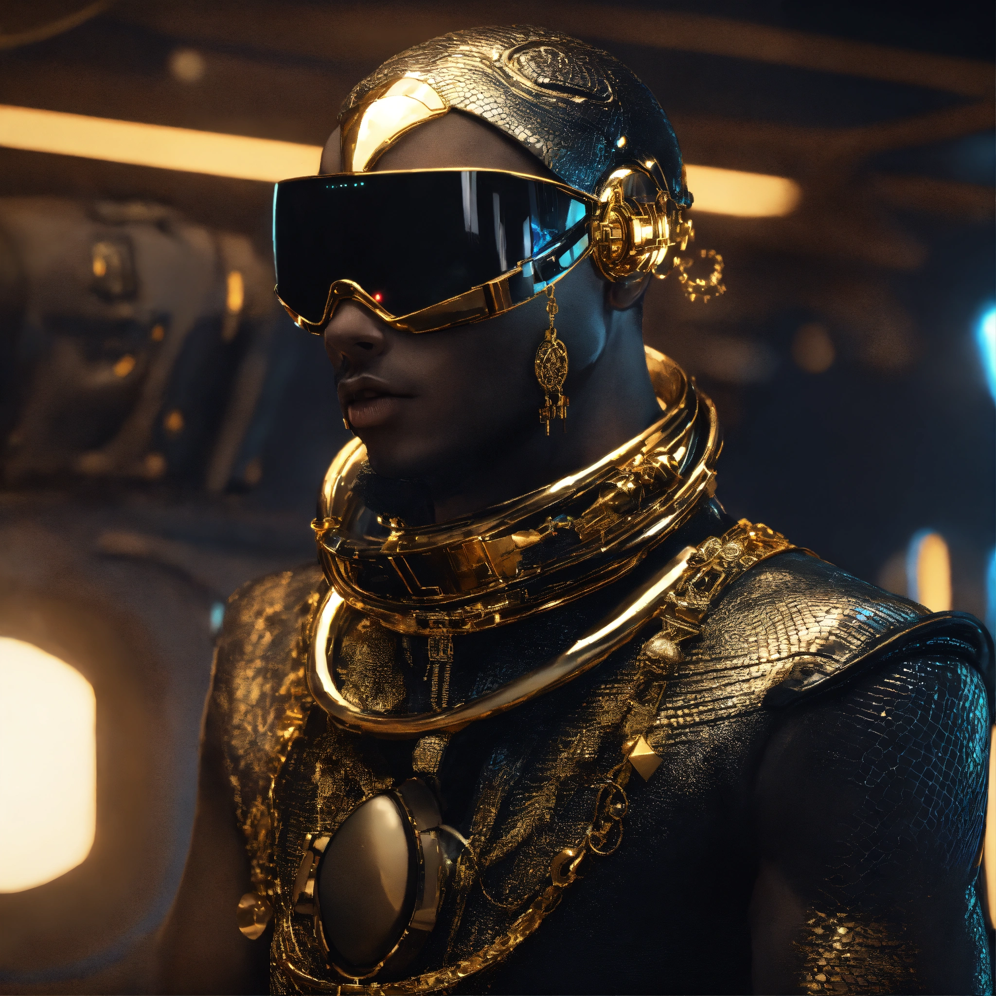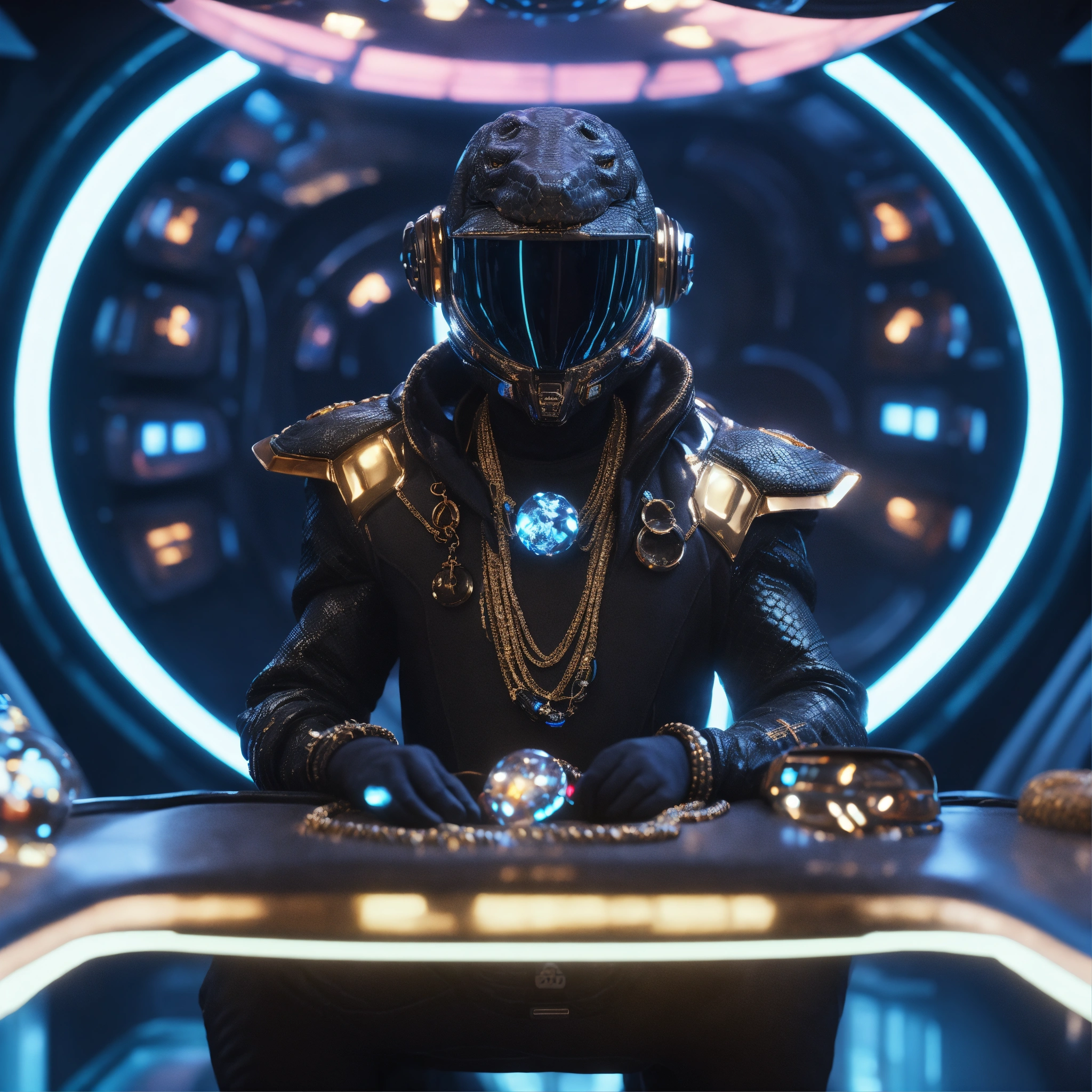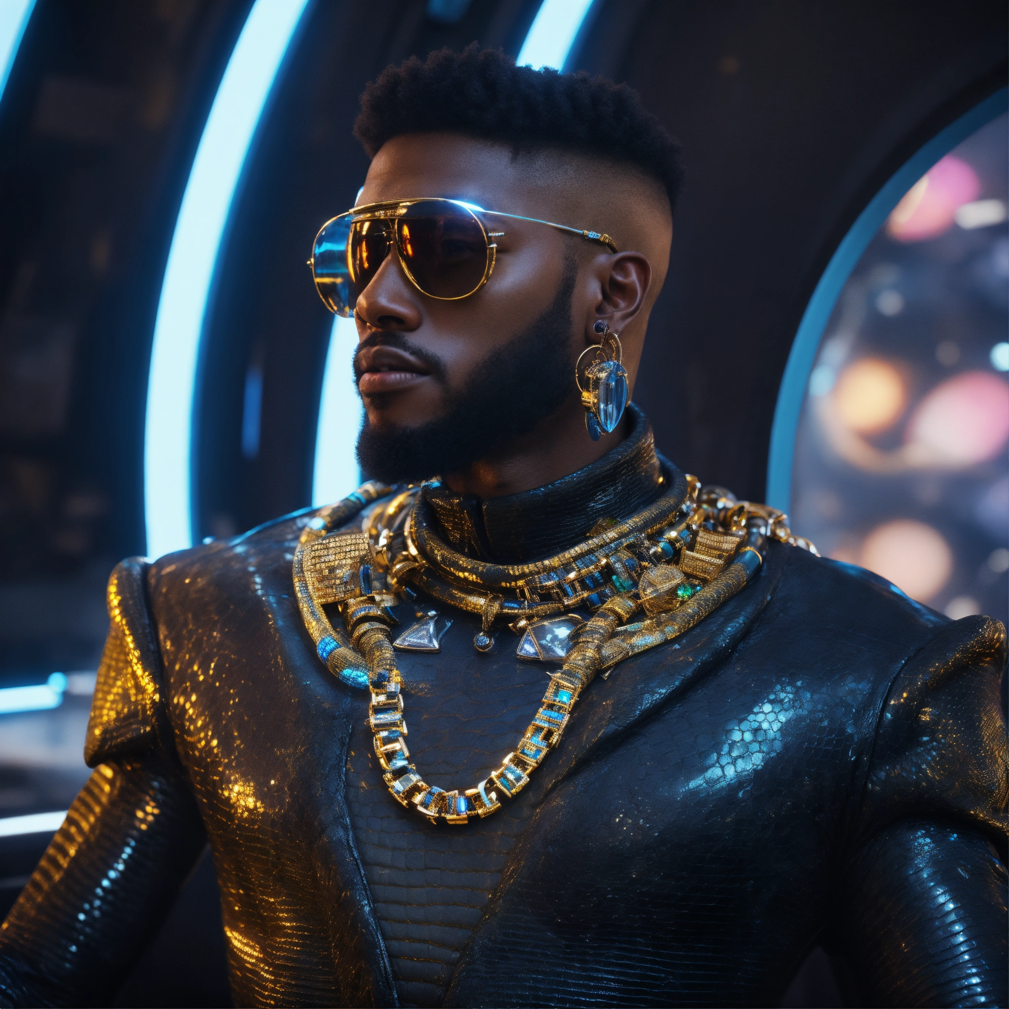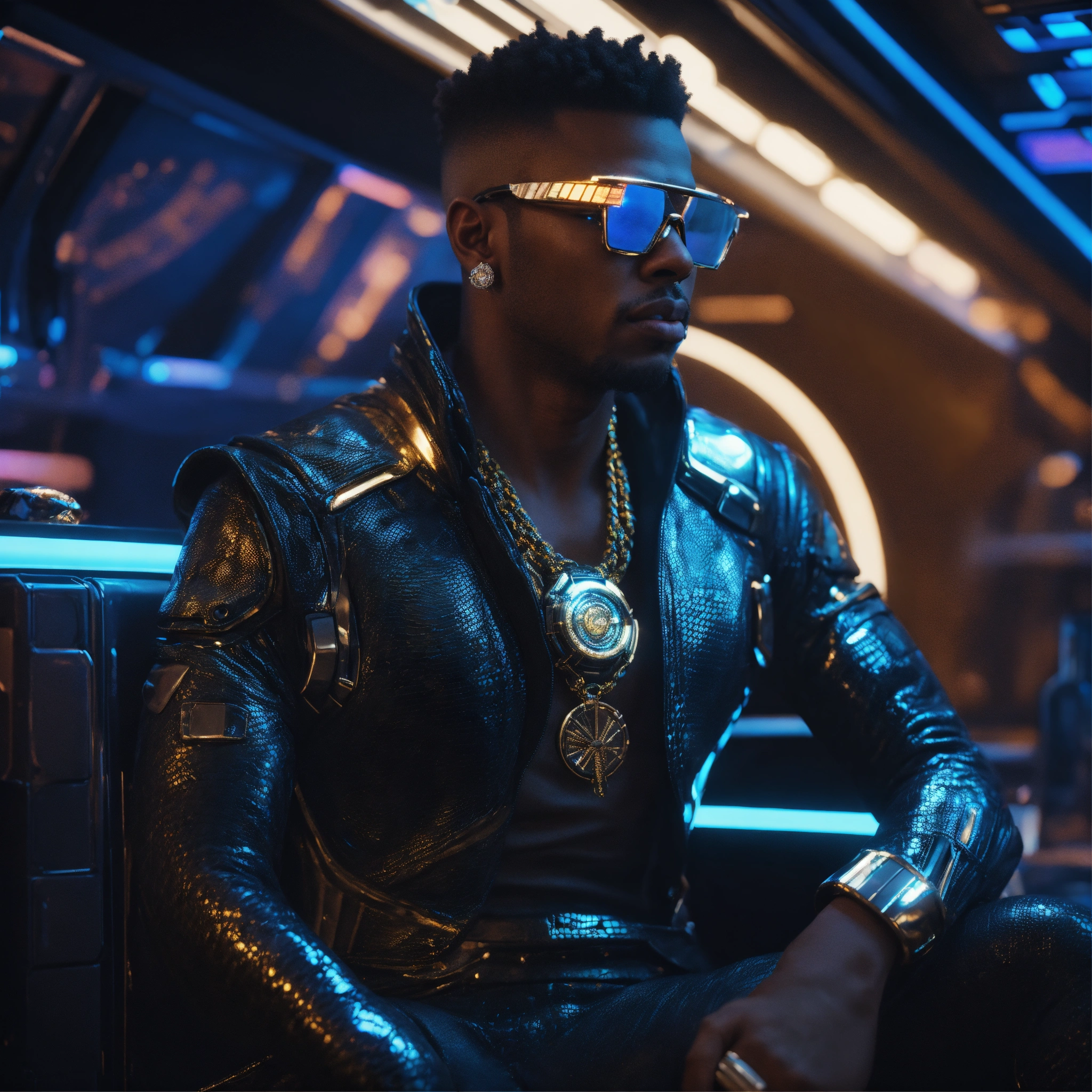 Zoom out from a cool black male reptile wearing space fashion with alot of jewelry lounging in a futuristic space yacht, realistic, futuristic, sci-fi, 8k, unreal engine