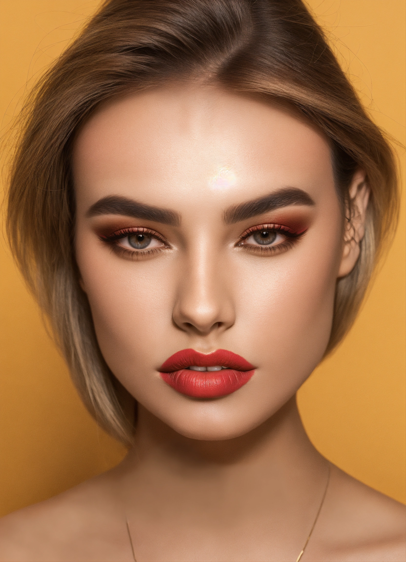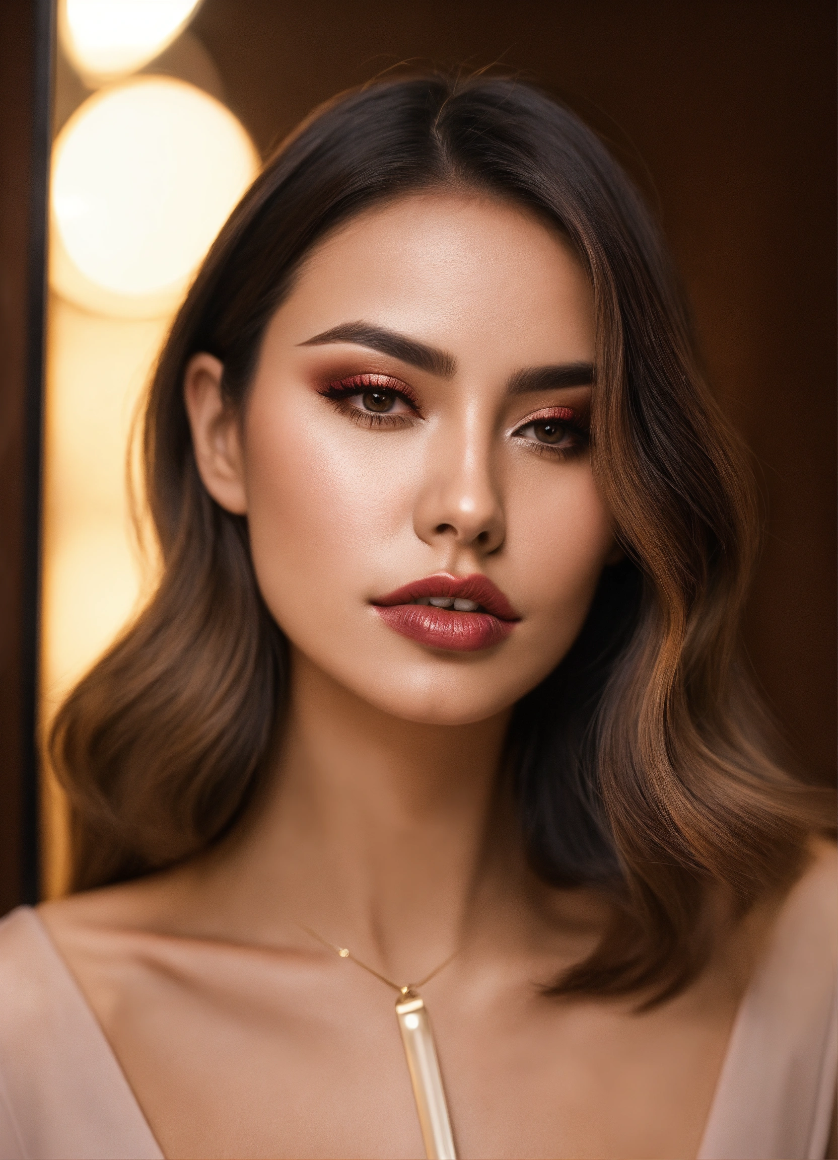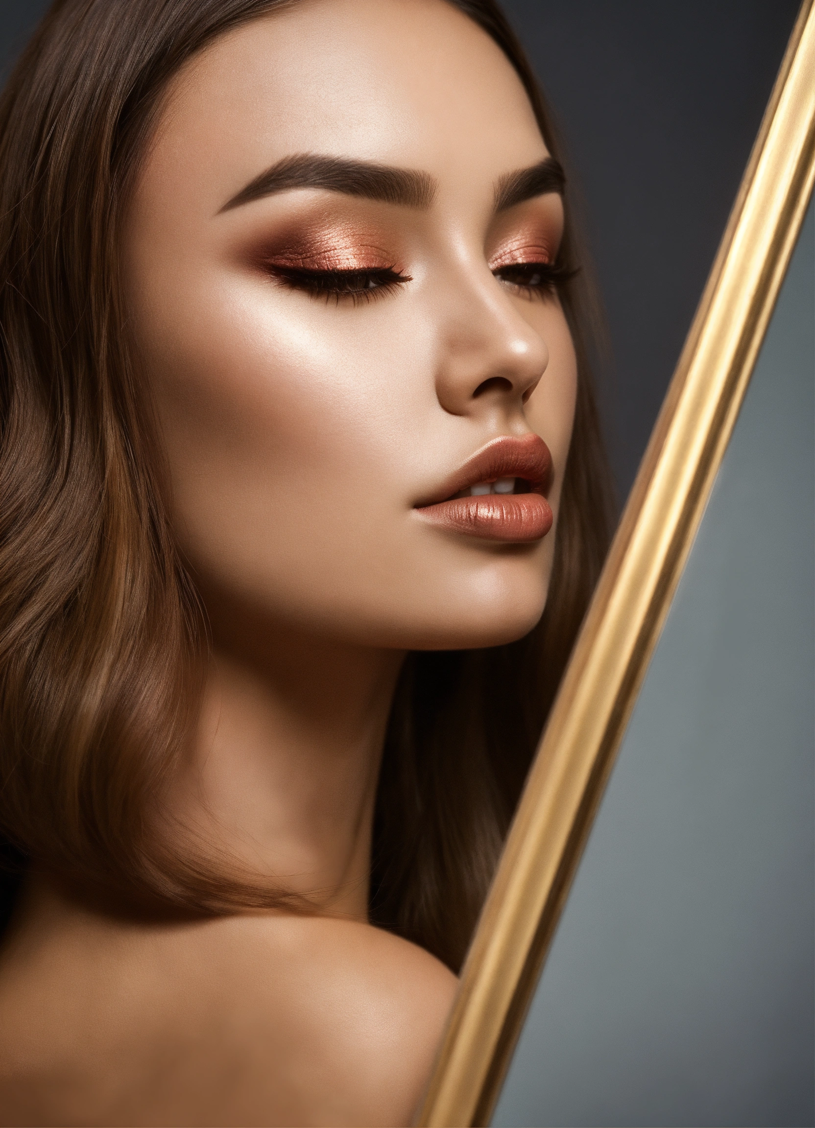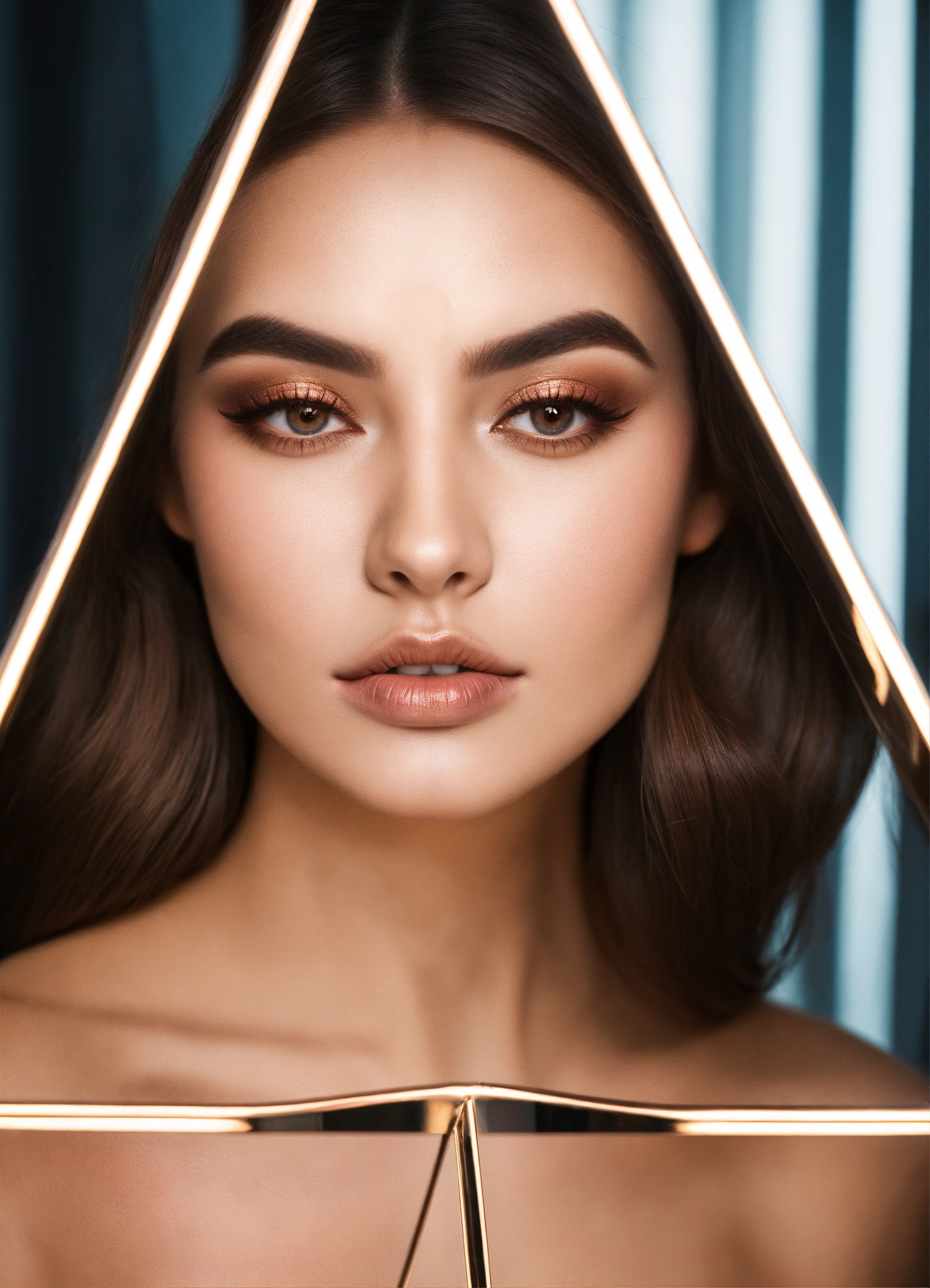 Lips makeup in triangle bottom pointed shaped mirror, beautiful woman with triangle bottom shaped face with large forefront and thin chin