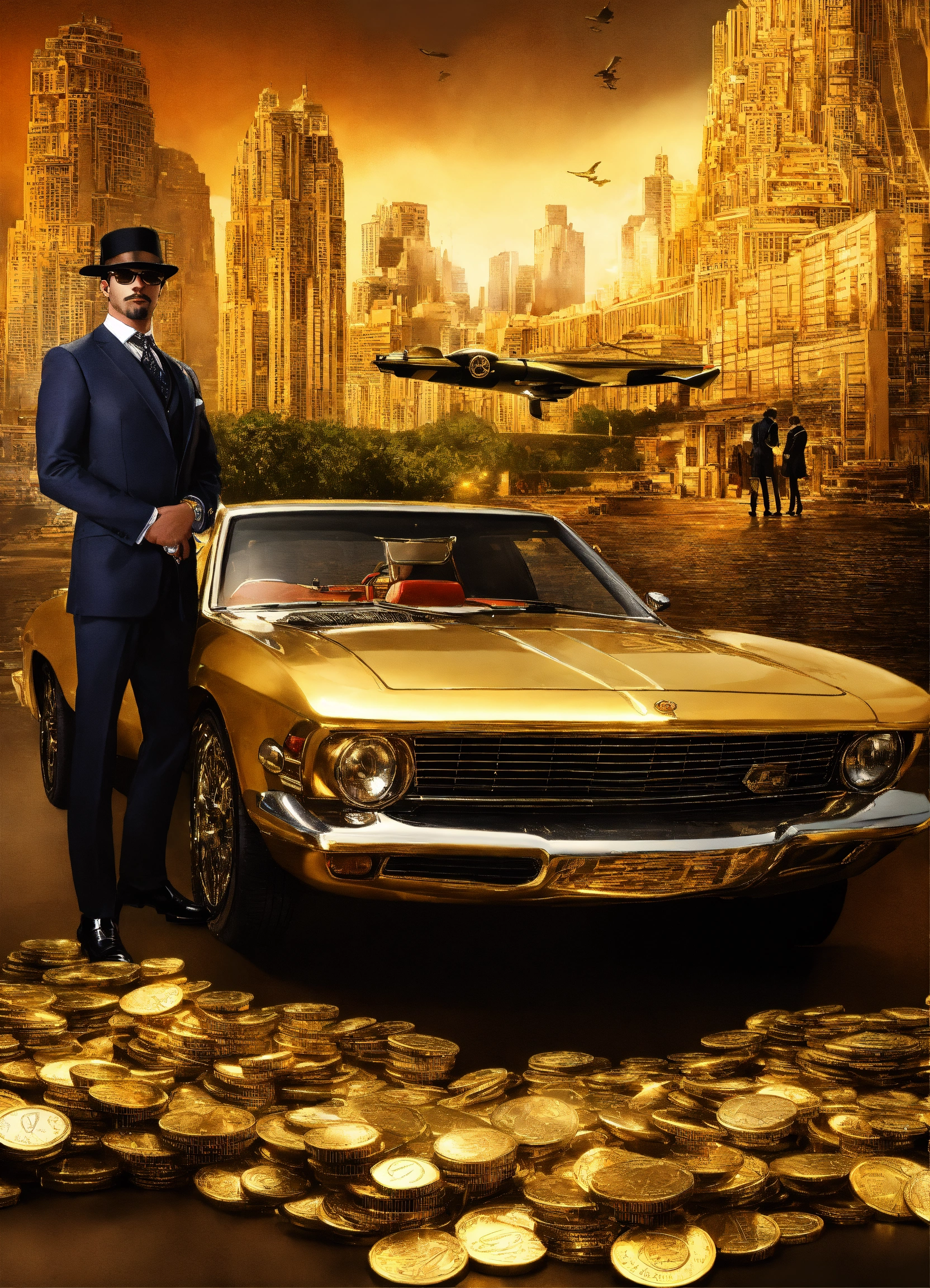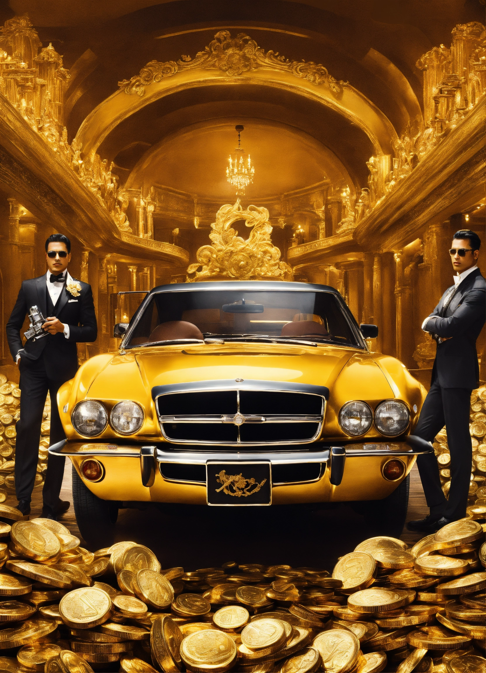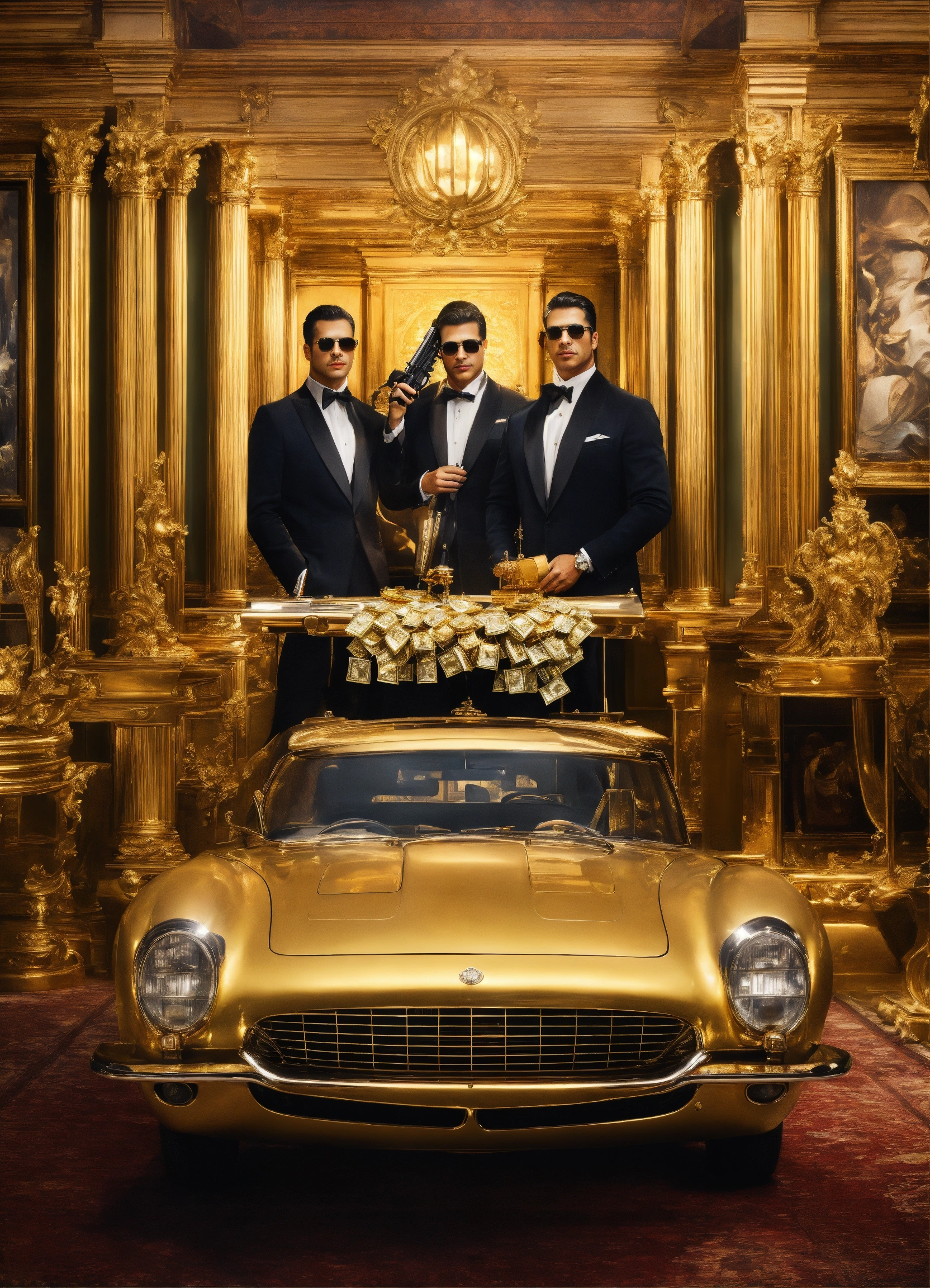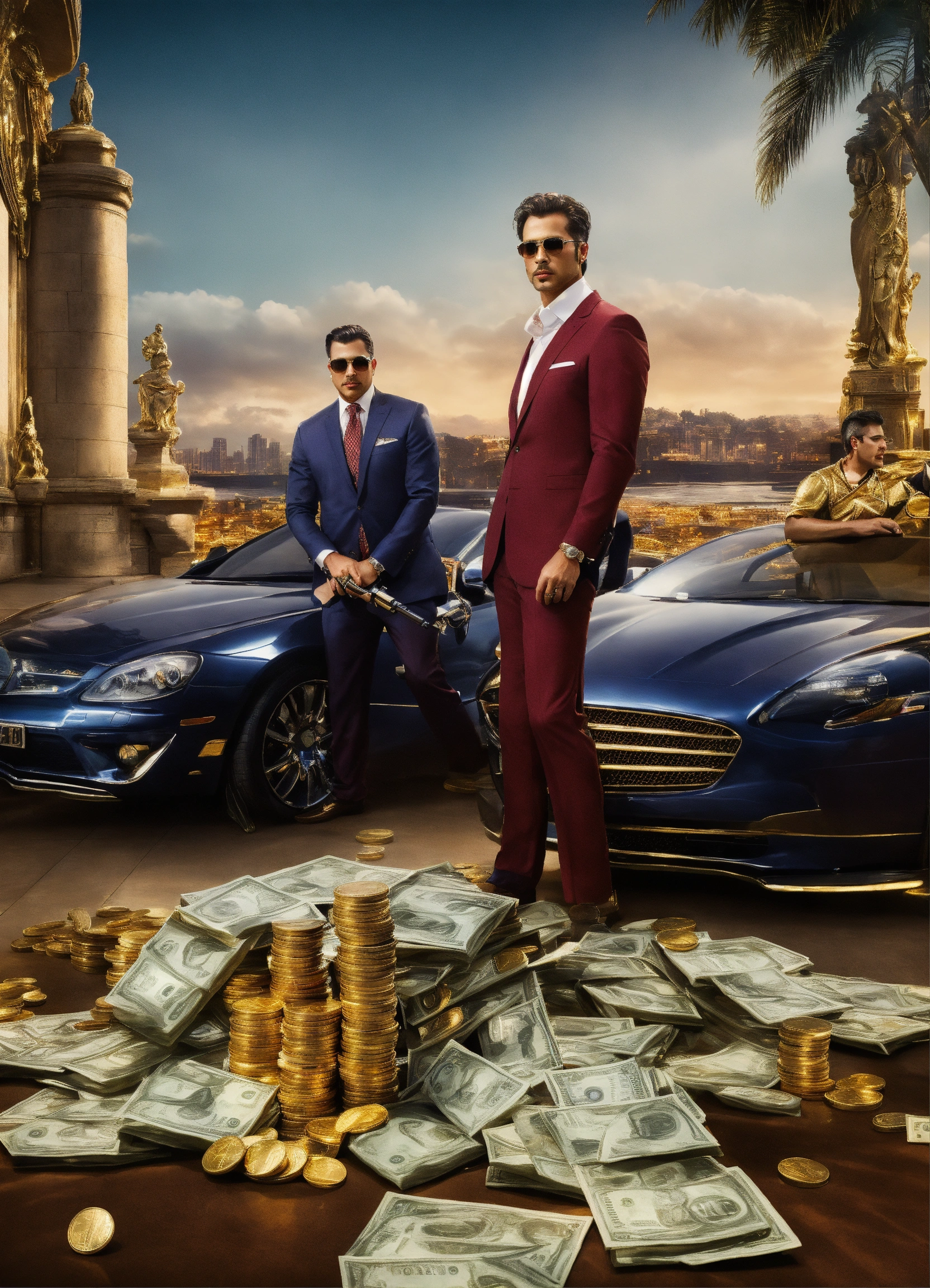 Create a captivating design that conveys the theme of wealthy two men with a backgound associated money gold, jewelries, cars, fine arts, exhibits and guns. make it in a poster look. and make it a realistic photo