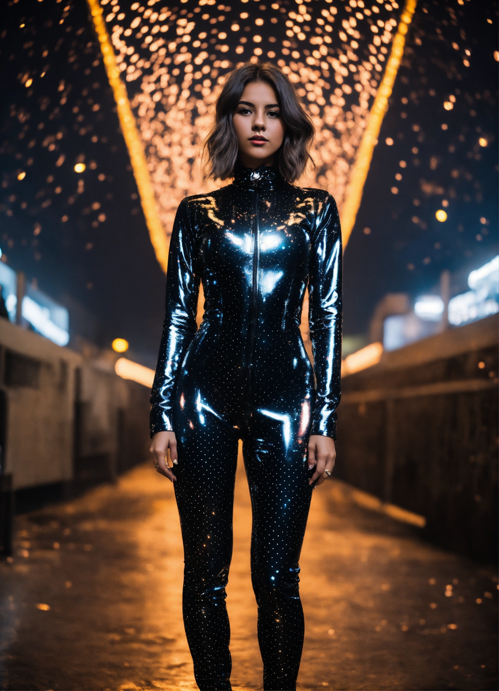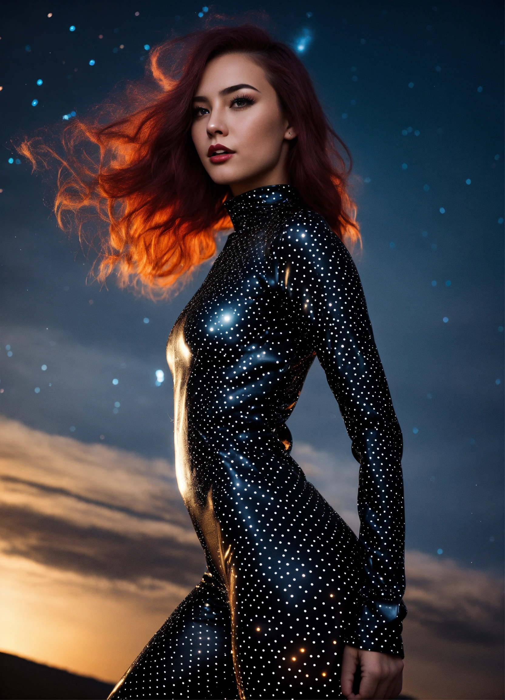 A real photo of a 23 year old girl, she is wearing a dark-metal polkadot catsuit, in the sky we see the galaxy