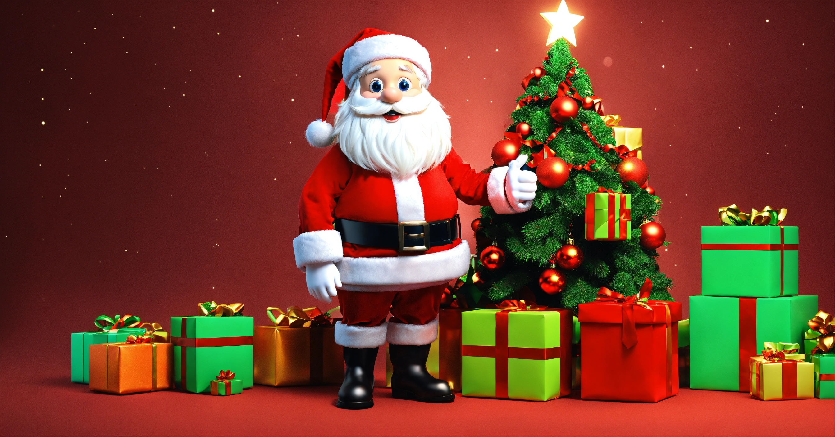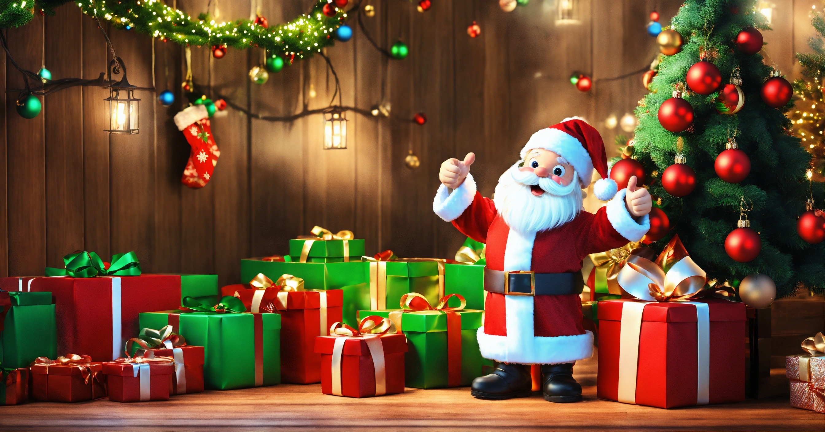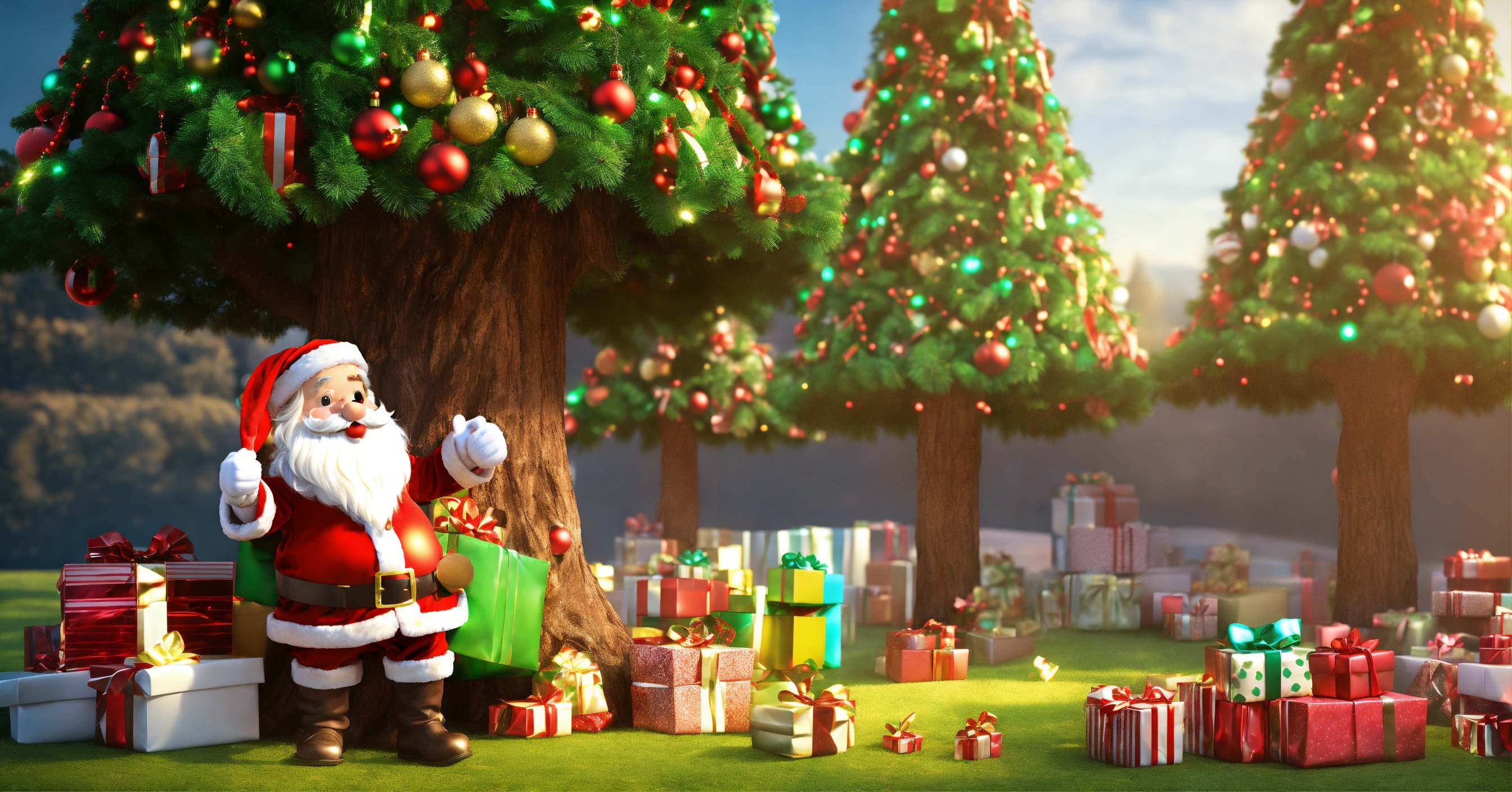 Cute santa claus under a tree sells christmas with many gift giving thumbs up