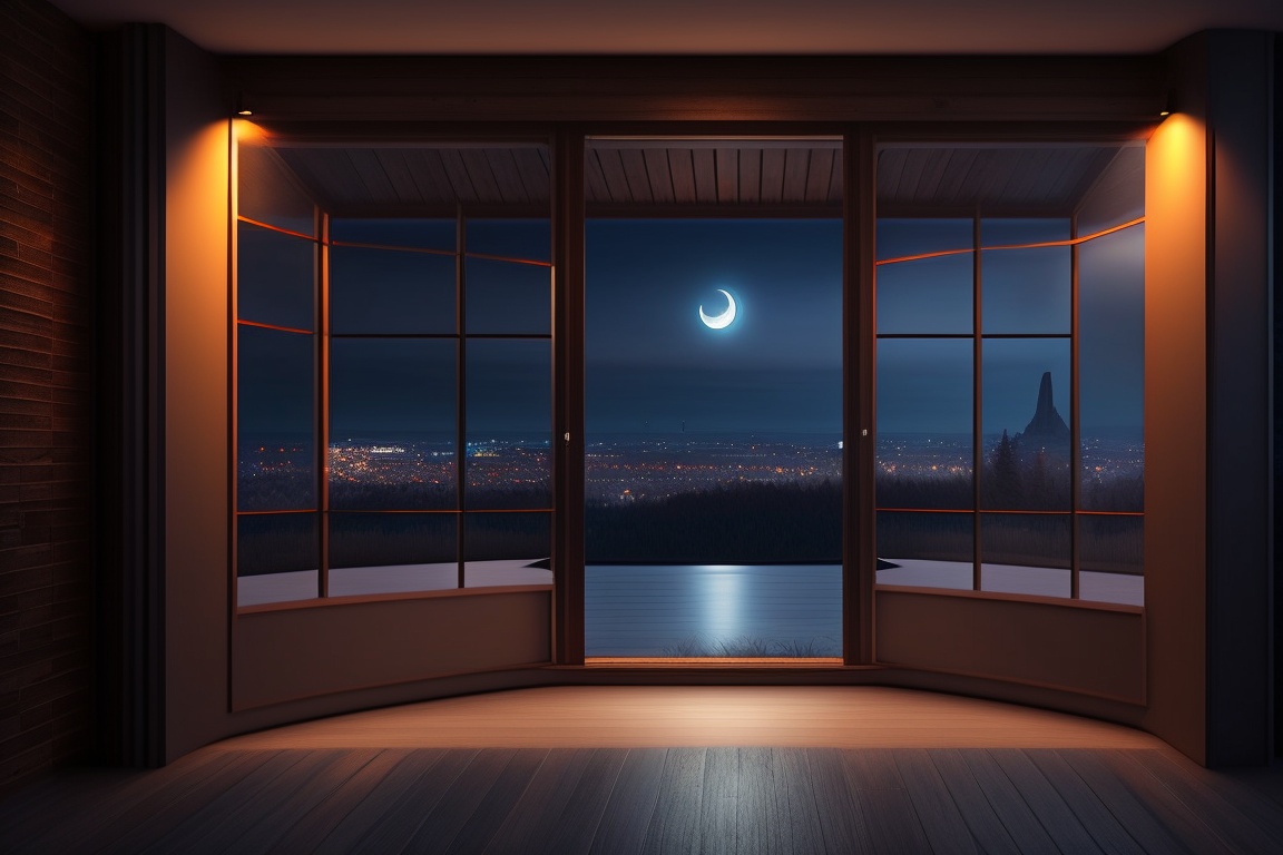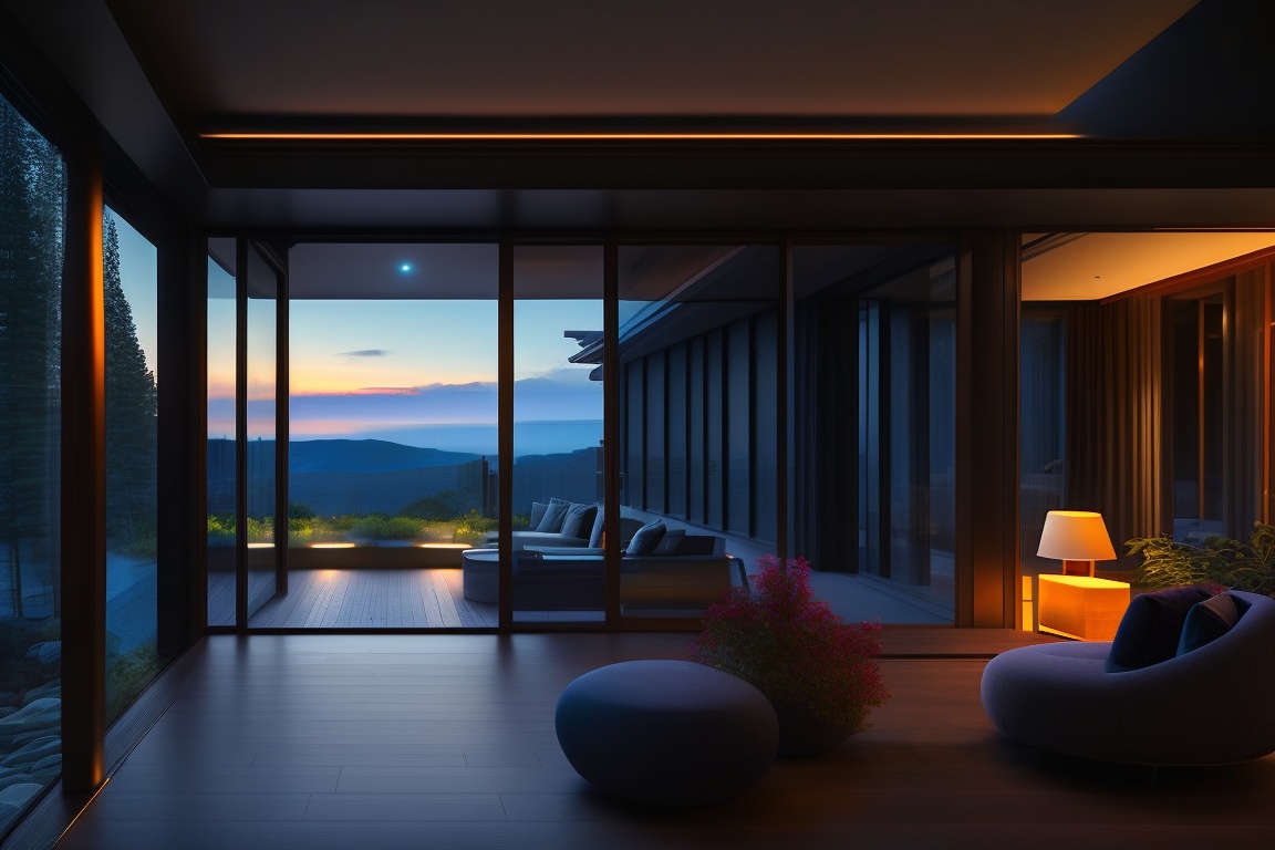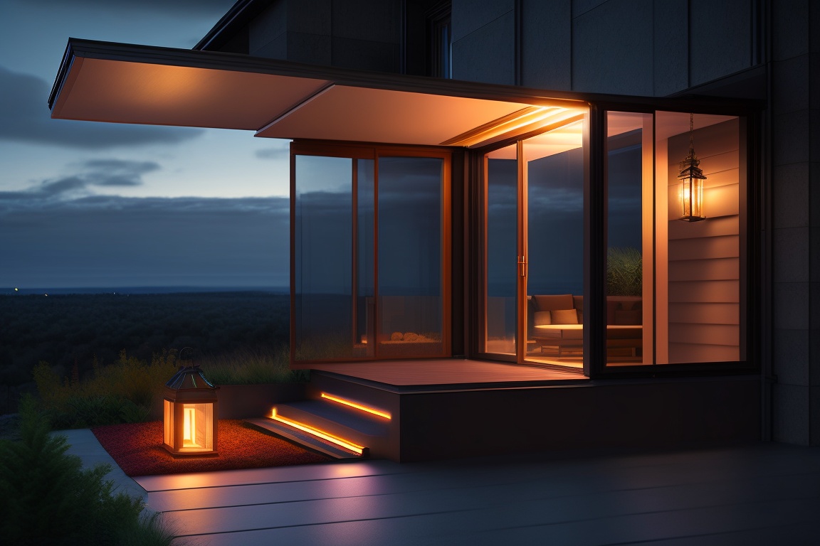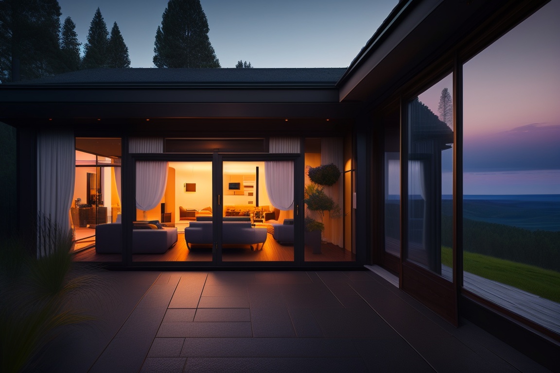 Terrace of a dark house with large windows