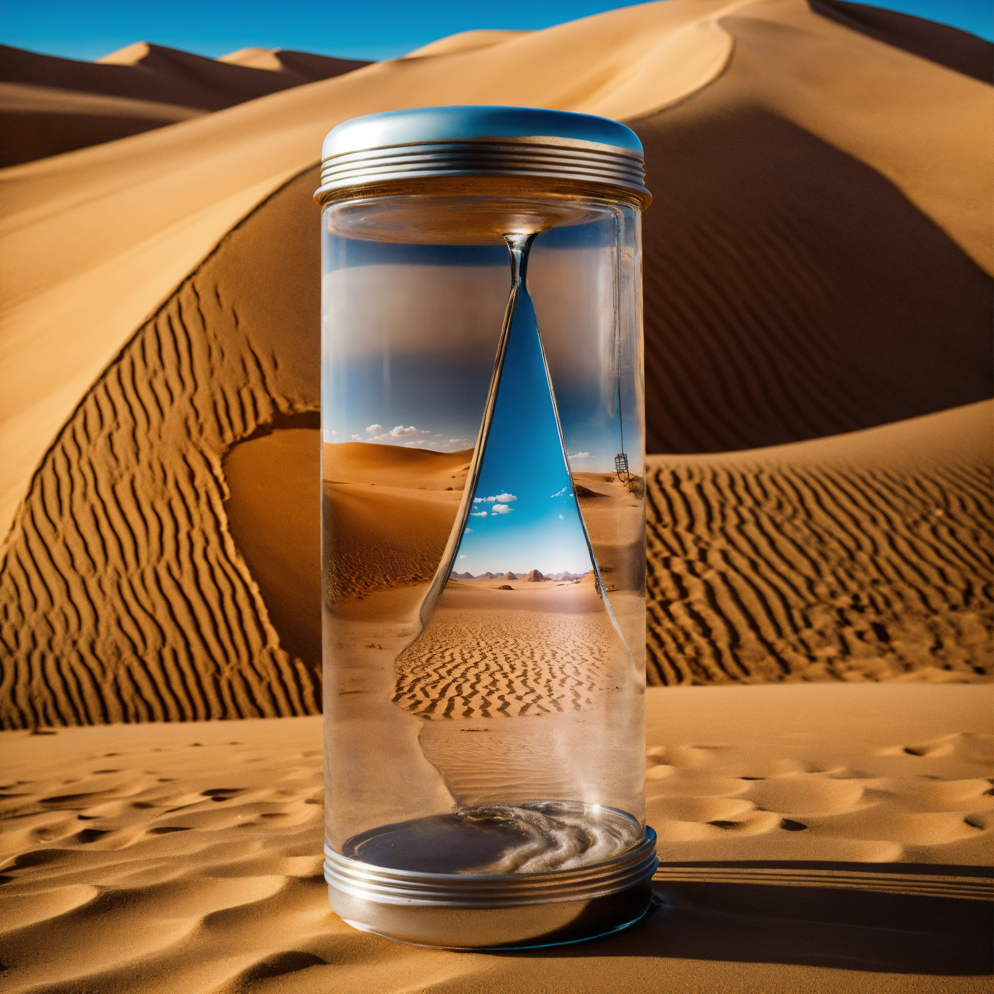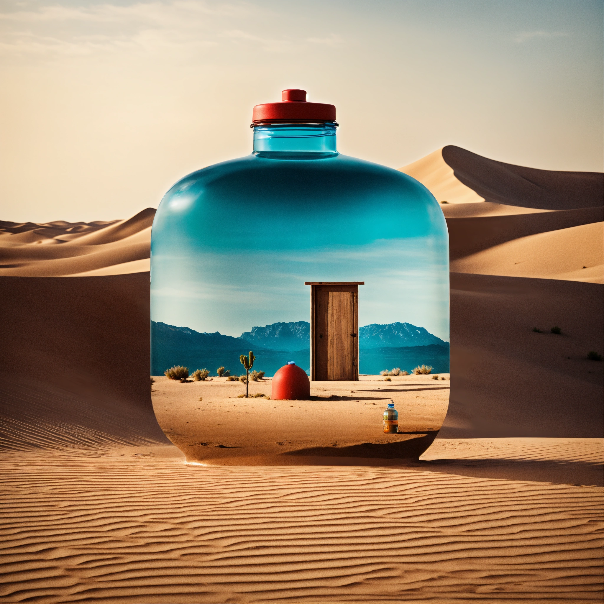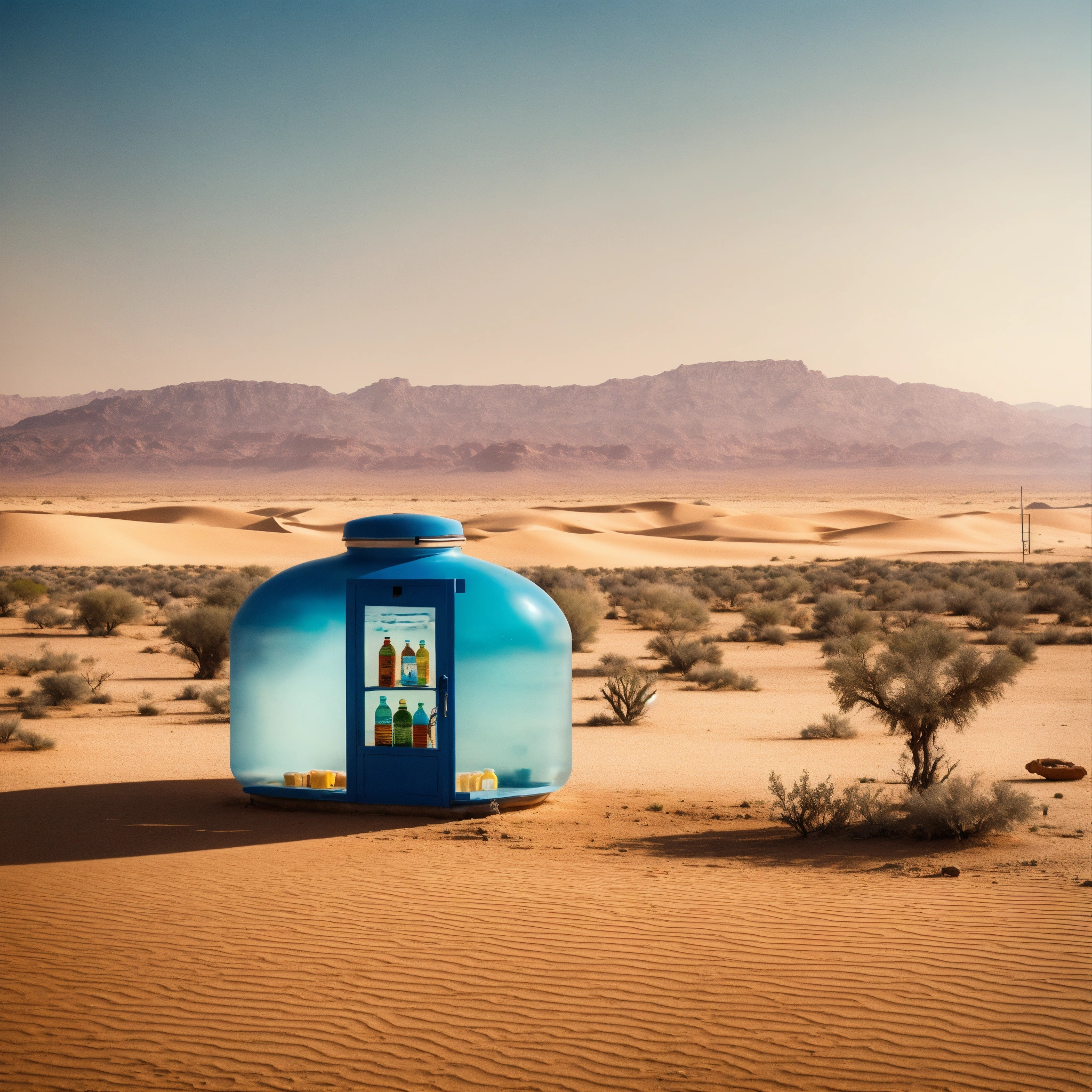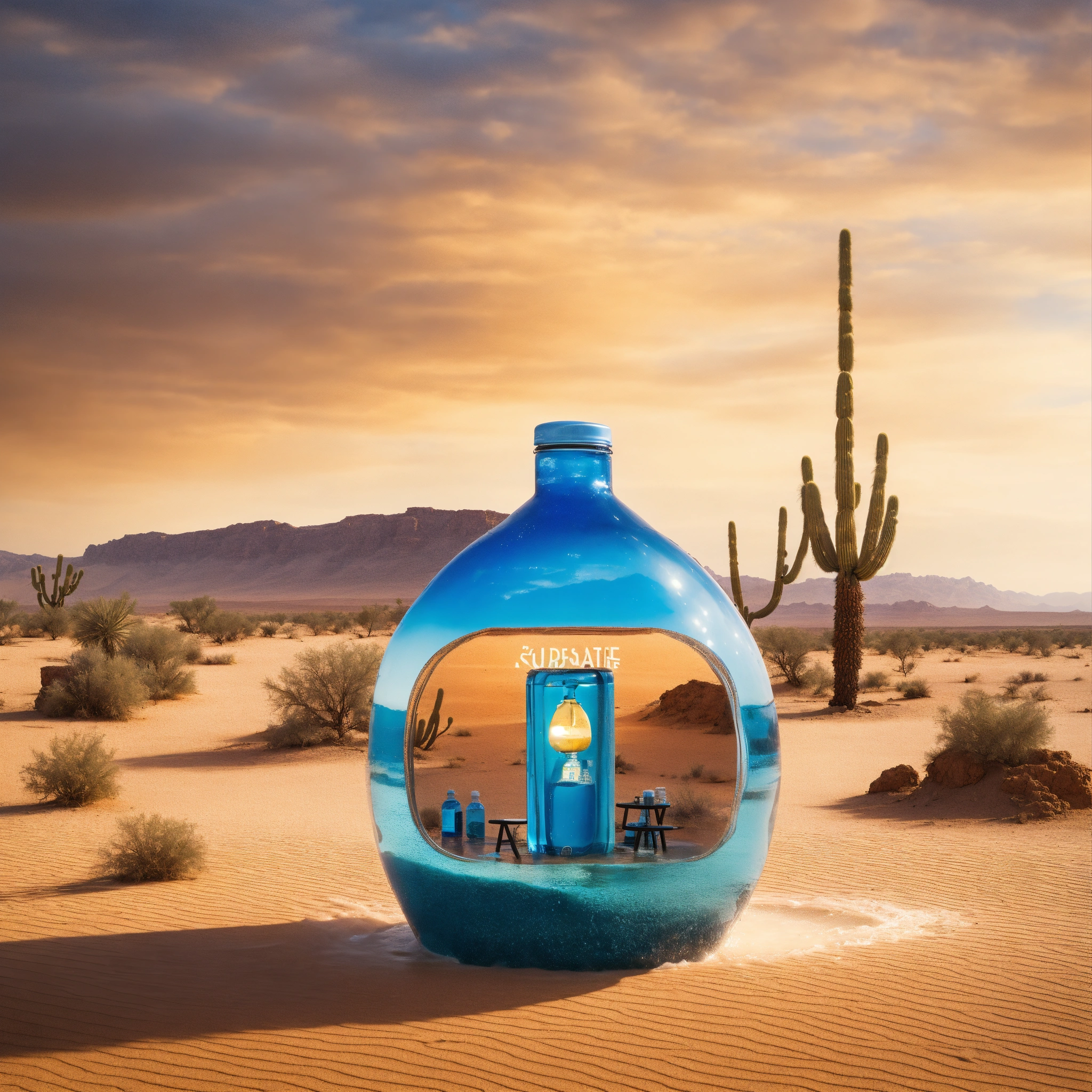 A shop with water in the middle of the desert in the form of a water bottle