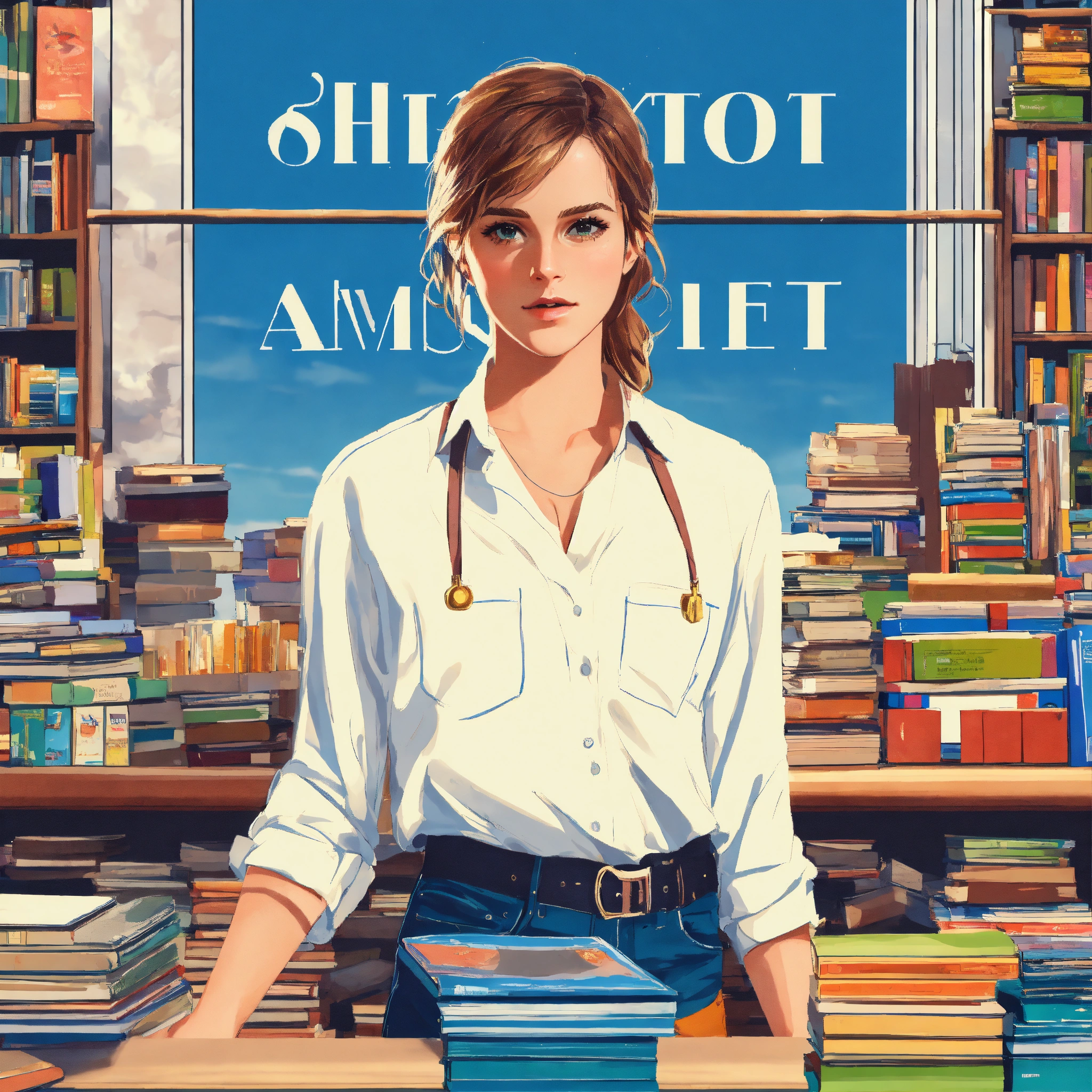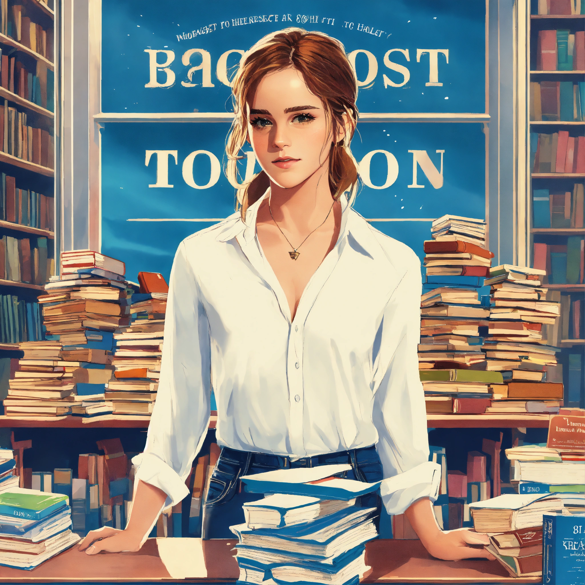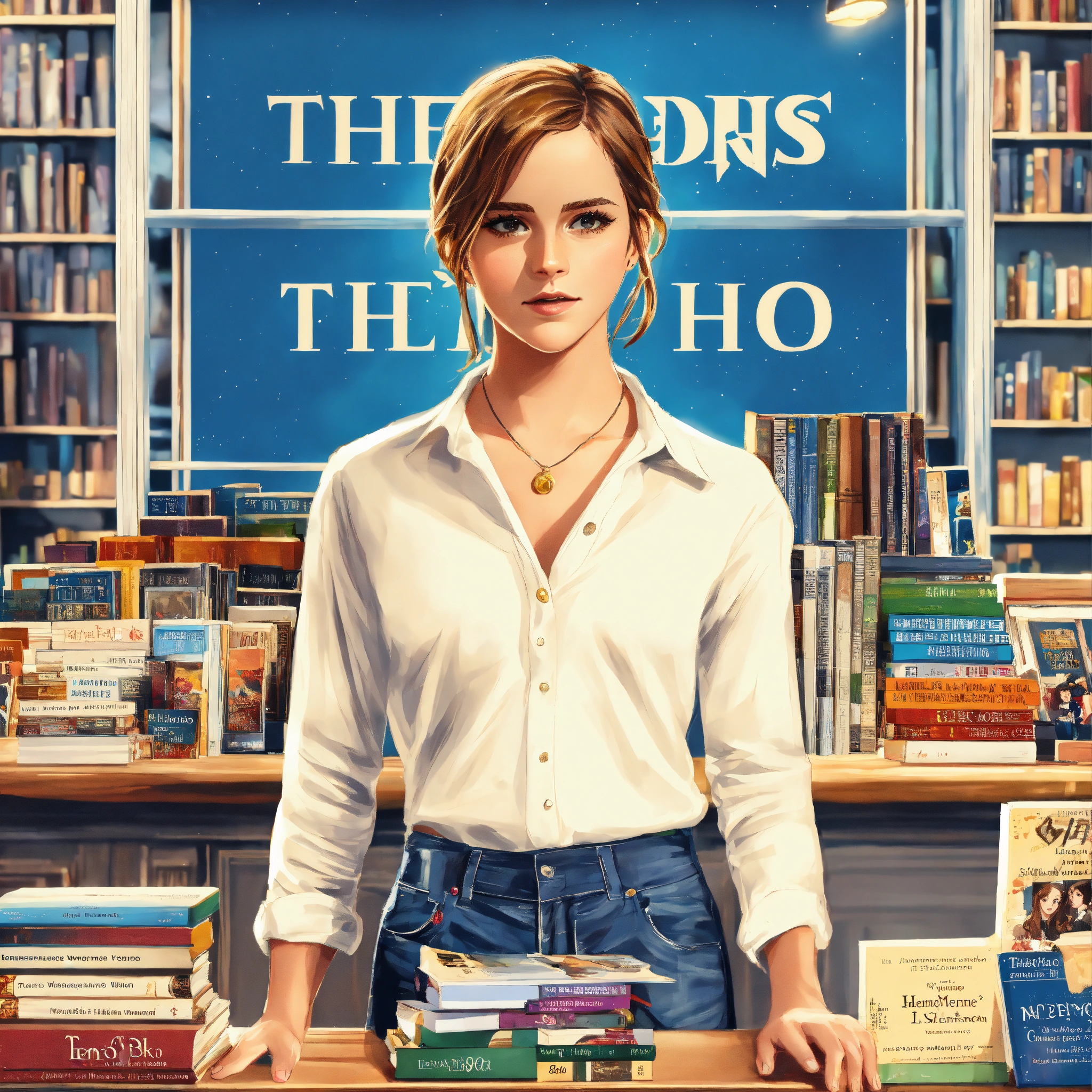 Masterpiece, highest quality, emma watson as hermione granger in white shirt and blue jeans in a bookshop behind a checkout counter with stack of books. 8k resolution. digital art, high quality, realistic.