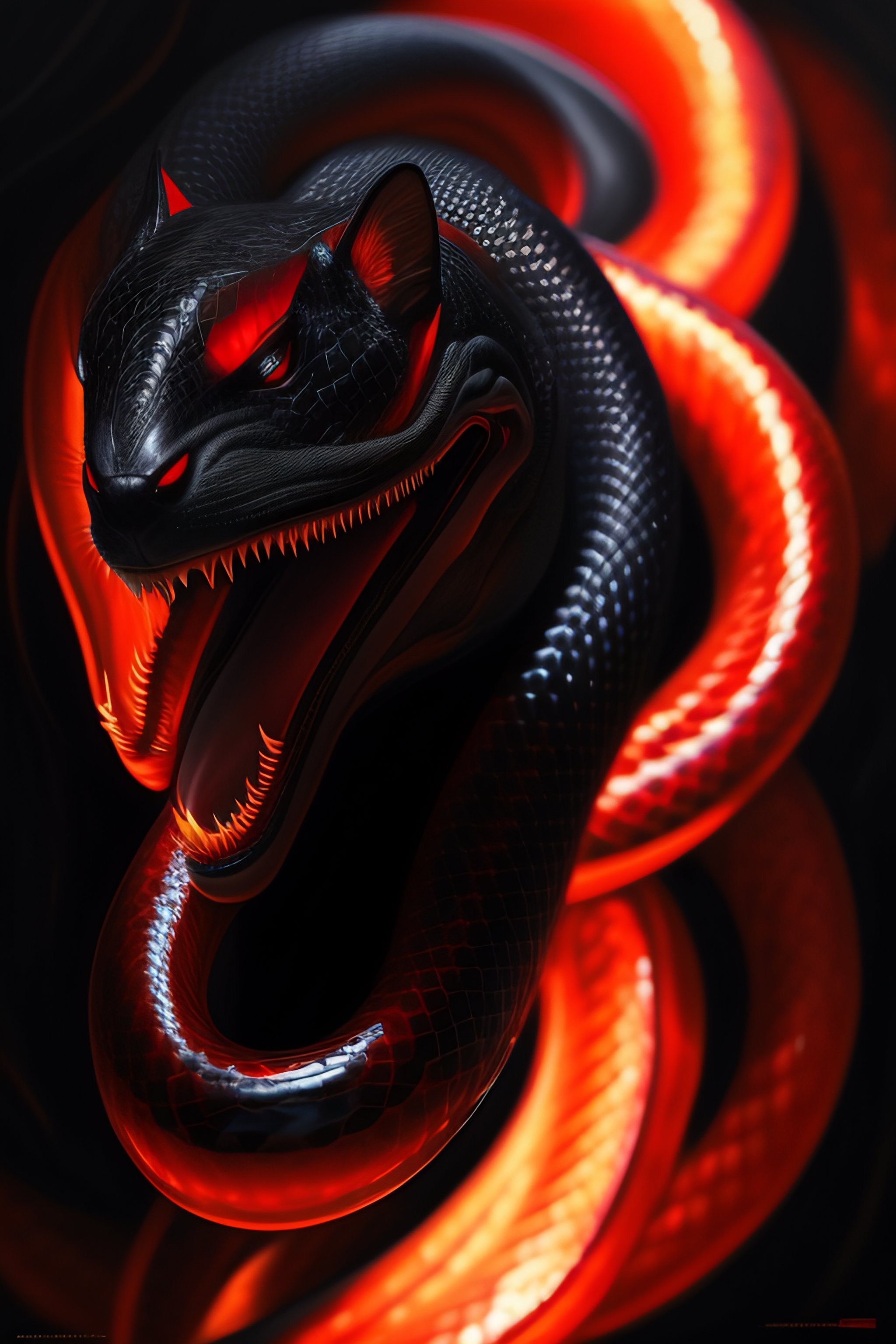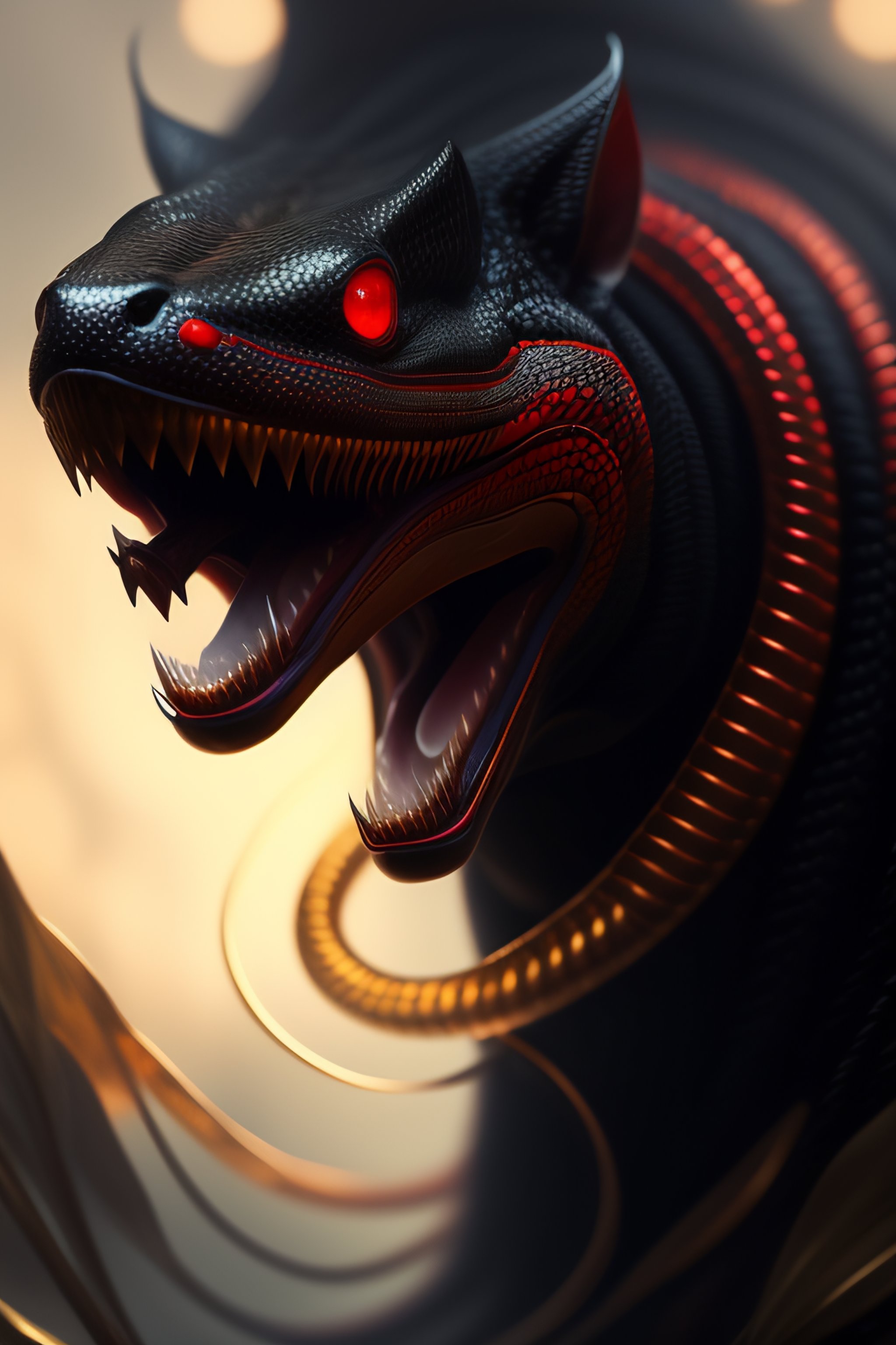 Black colored snake!, red snake eyes, toothy mouth with fangs, coiled body, threatening posture before attack, elegant pose, atmospheric lighting, cinematic composition, detail, art by greg rutkowski and alphonse mucha