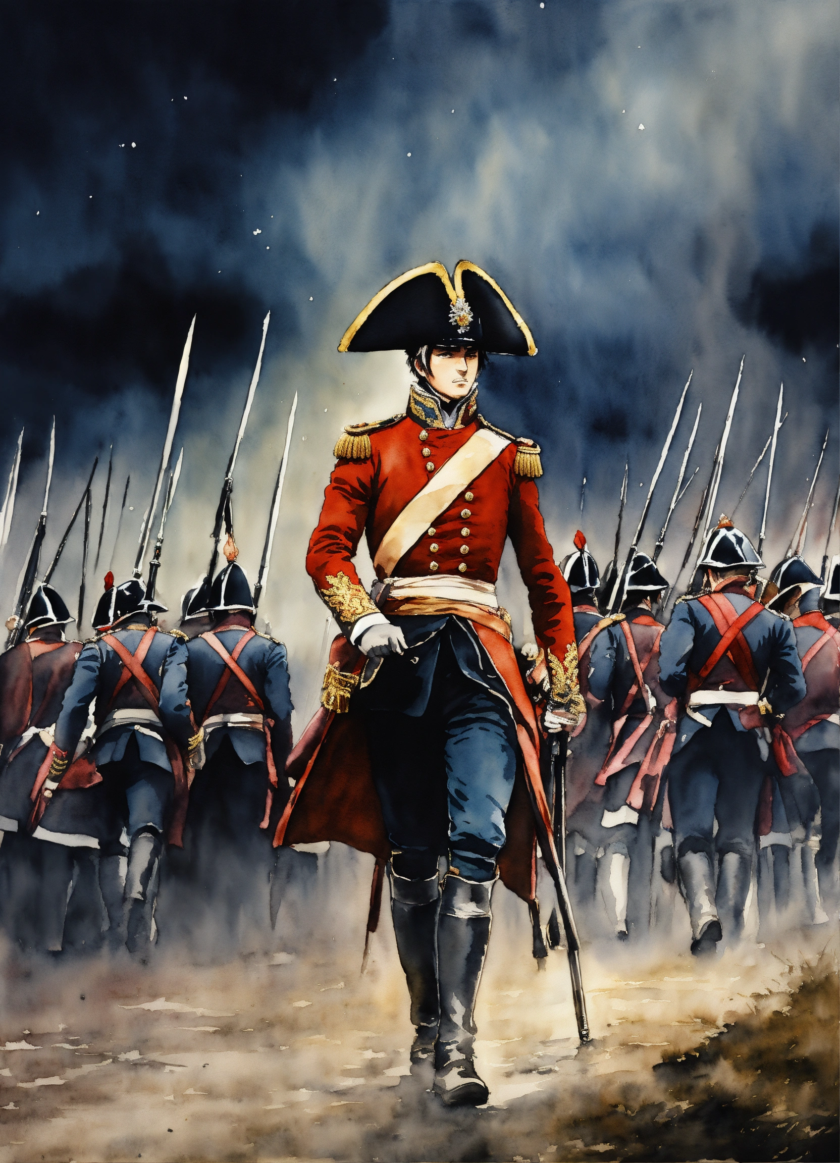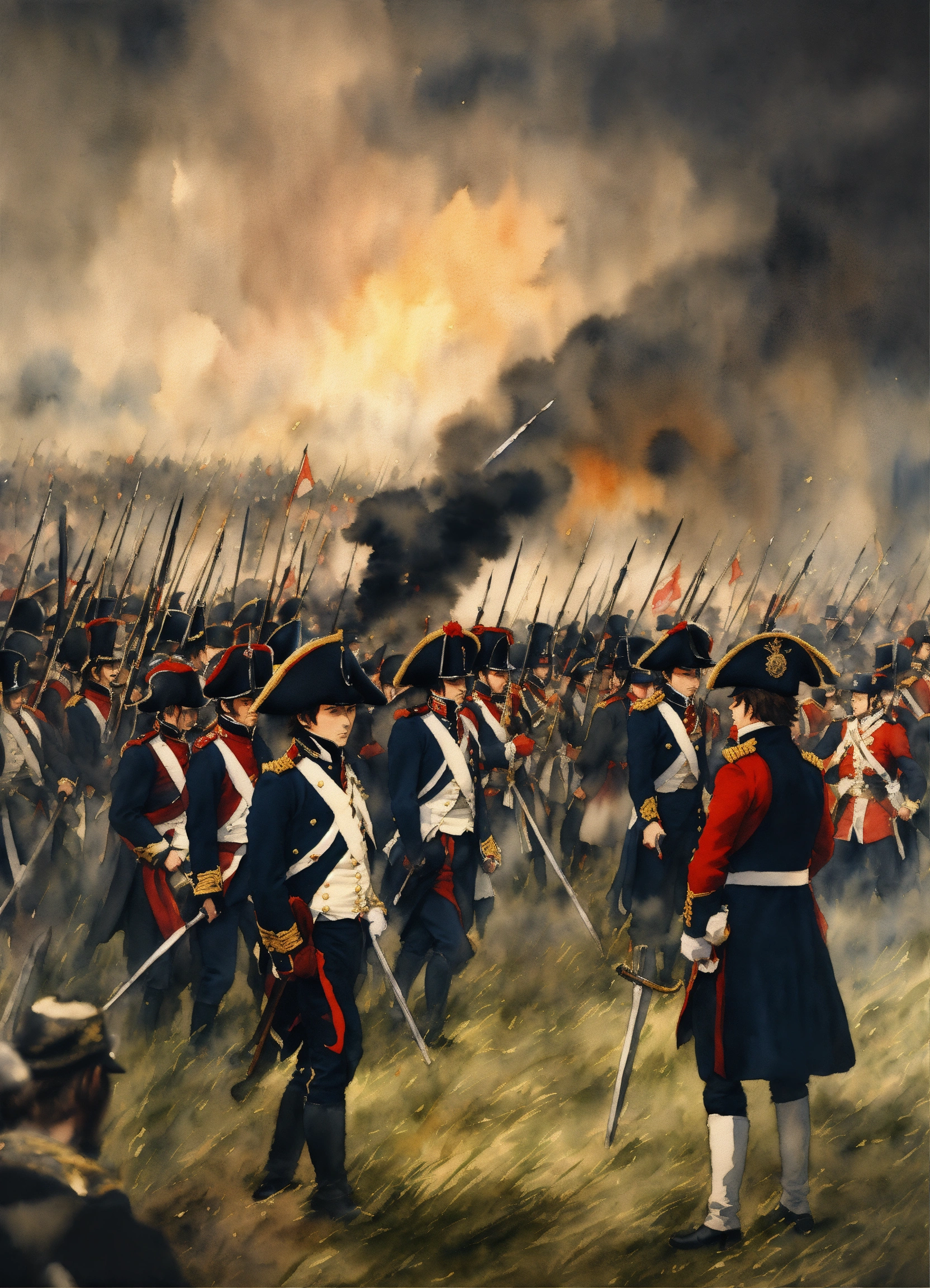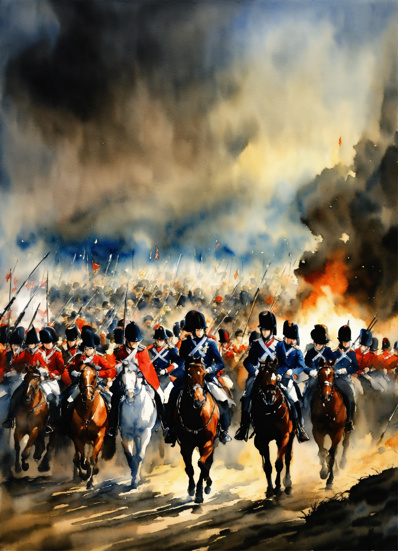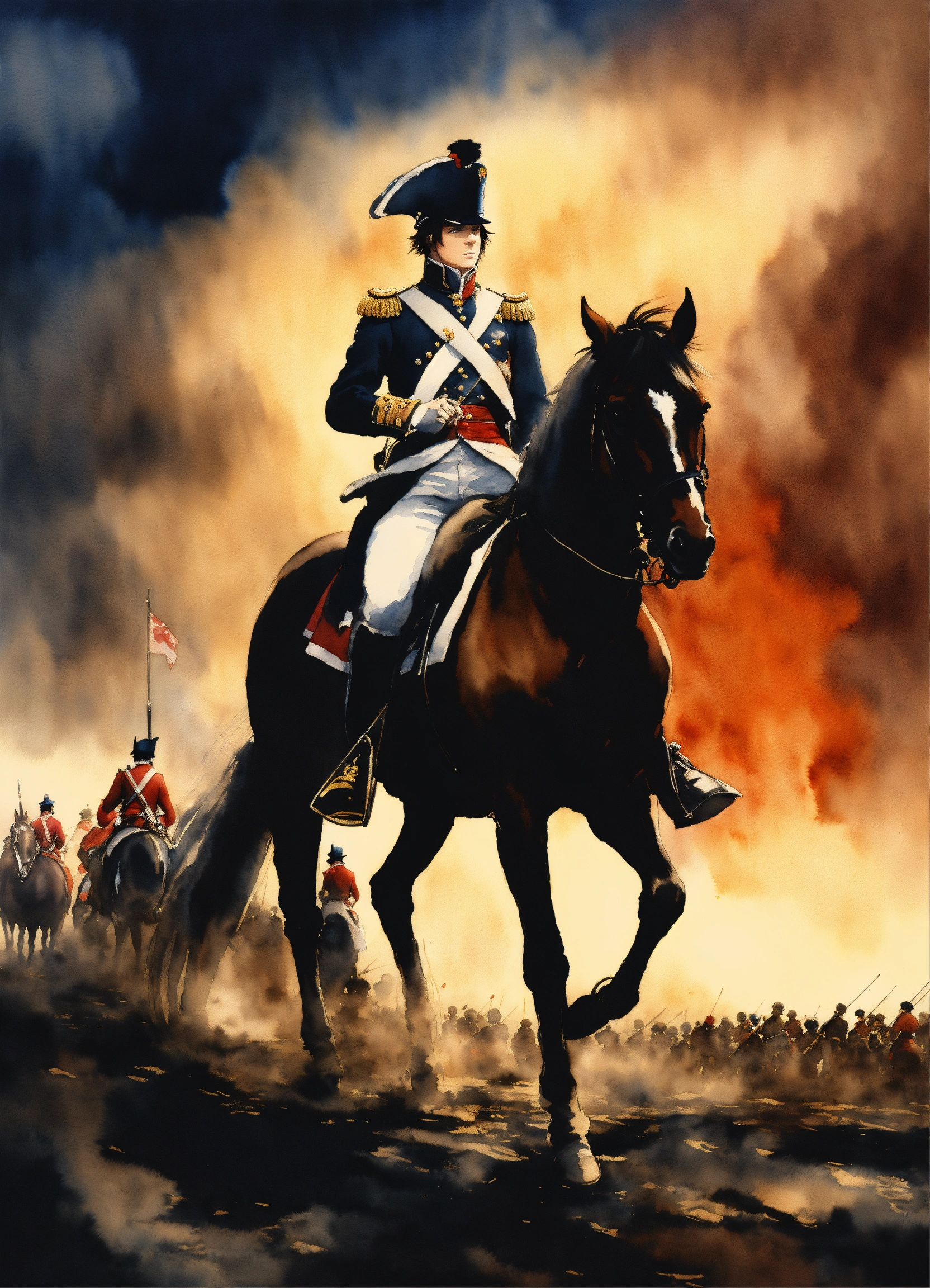 Battle of waterloo 1815 anime drawing art style, watercolor, with a dark background, photorealistic, 35mm film