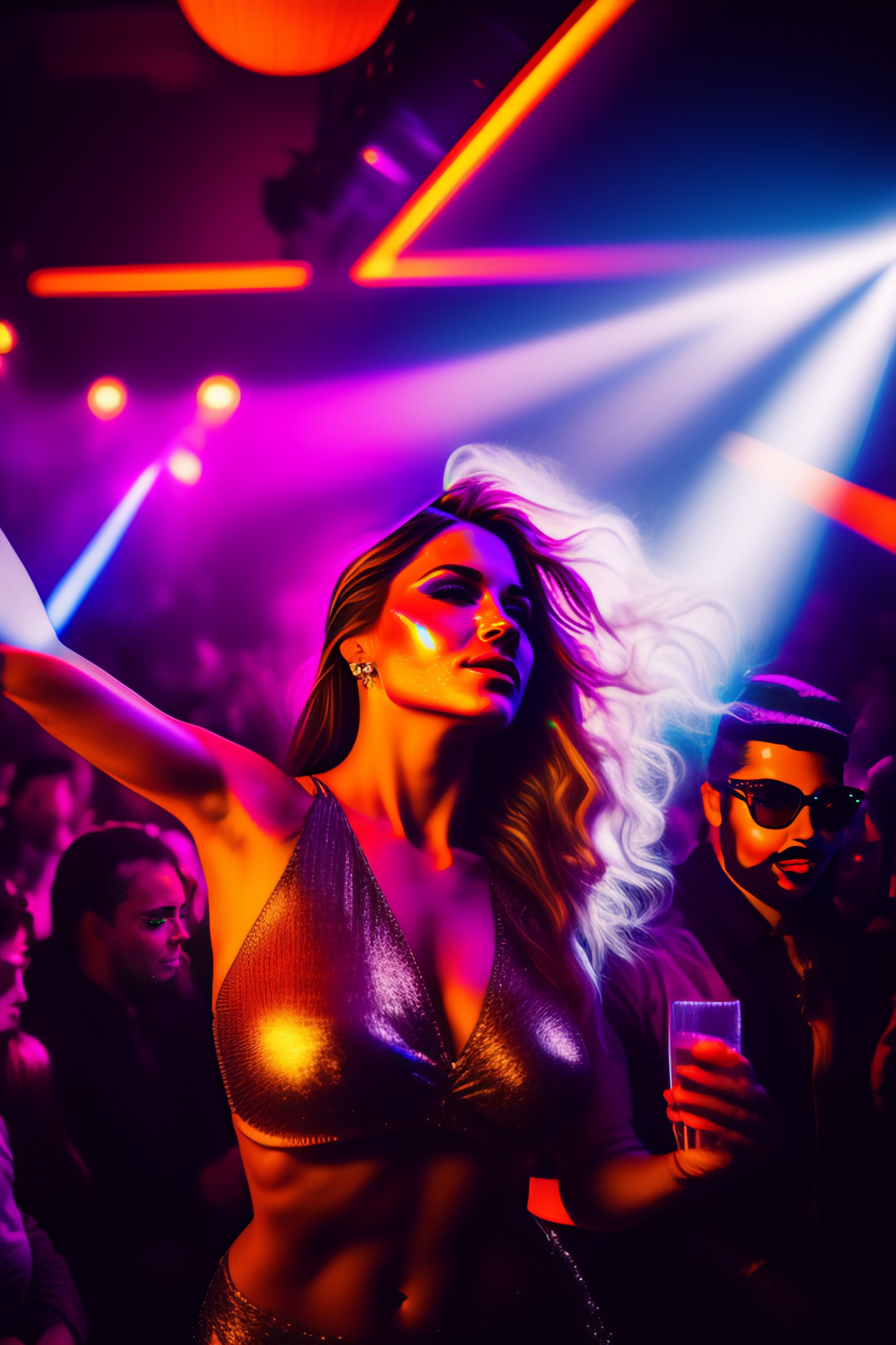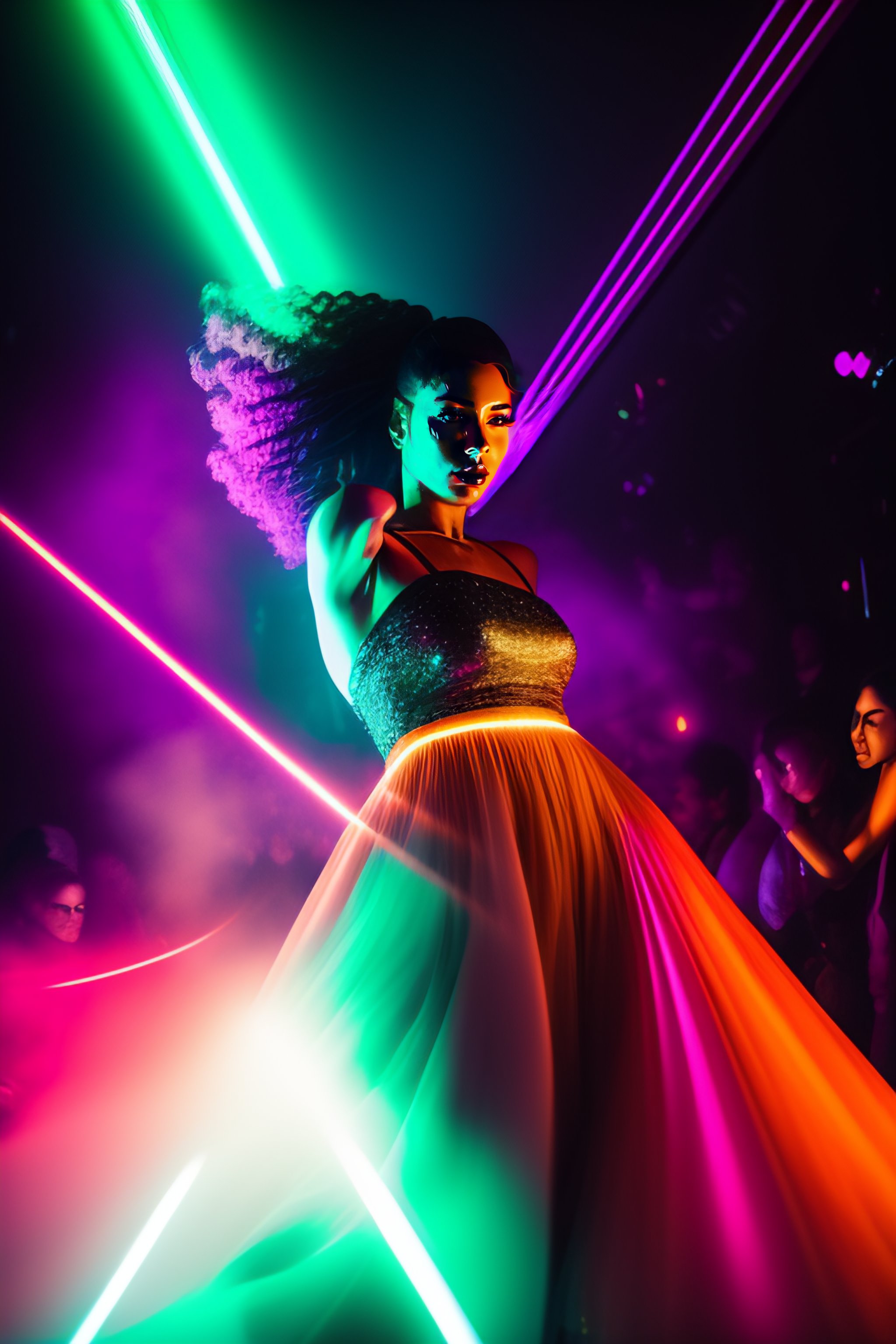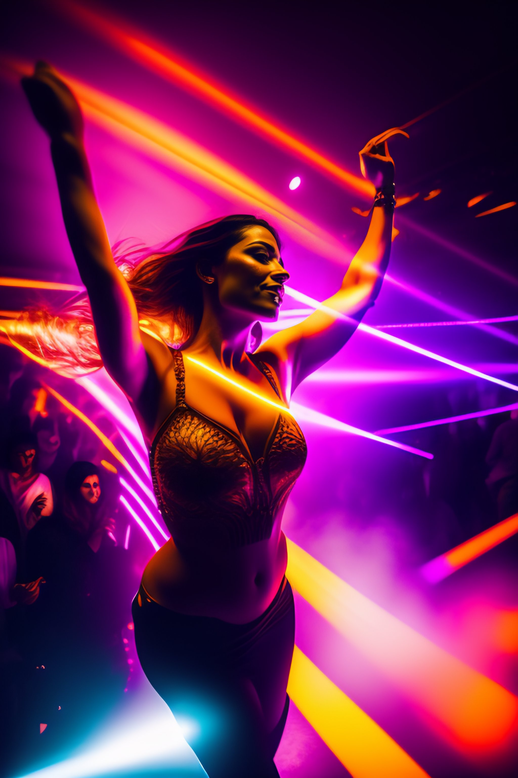 Picasso portrain of a woman dancing to techno music in a club with lasers