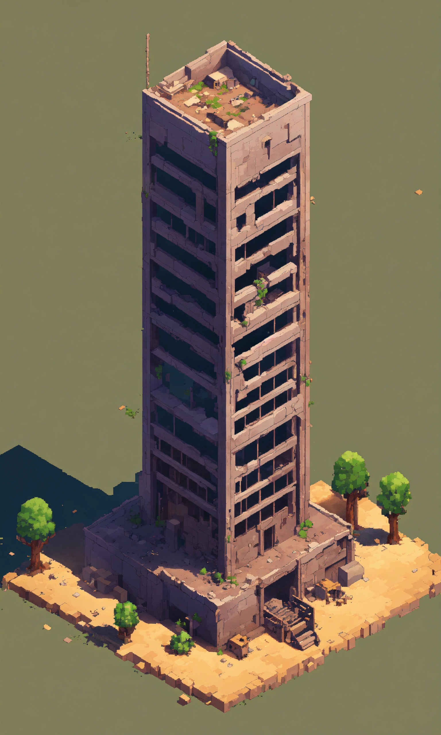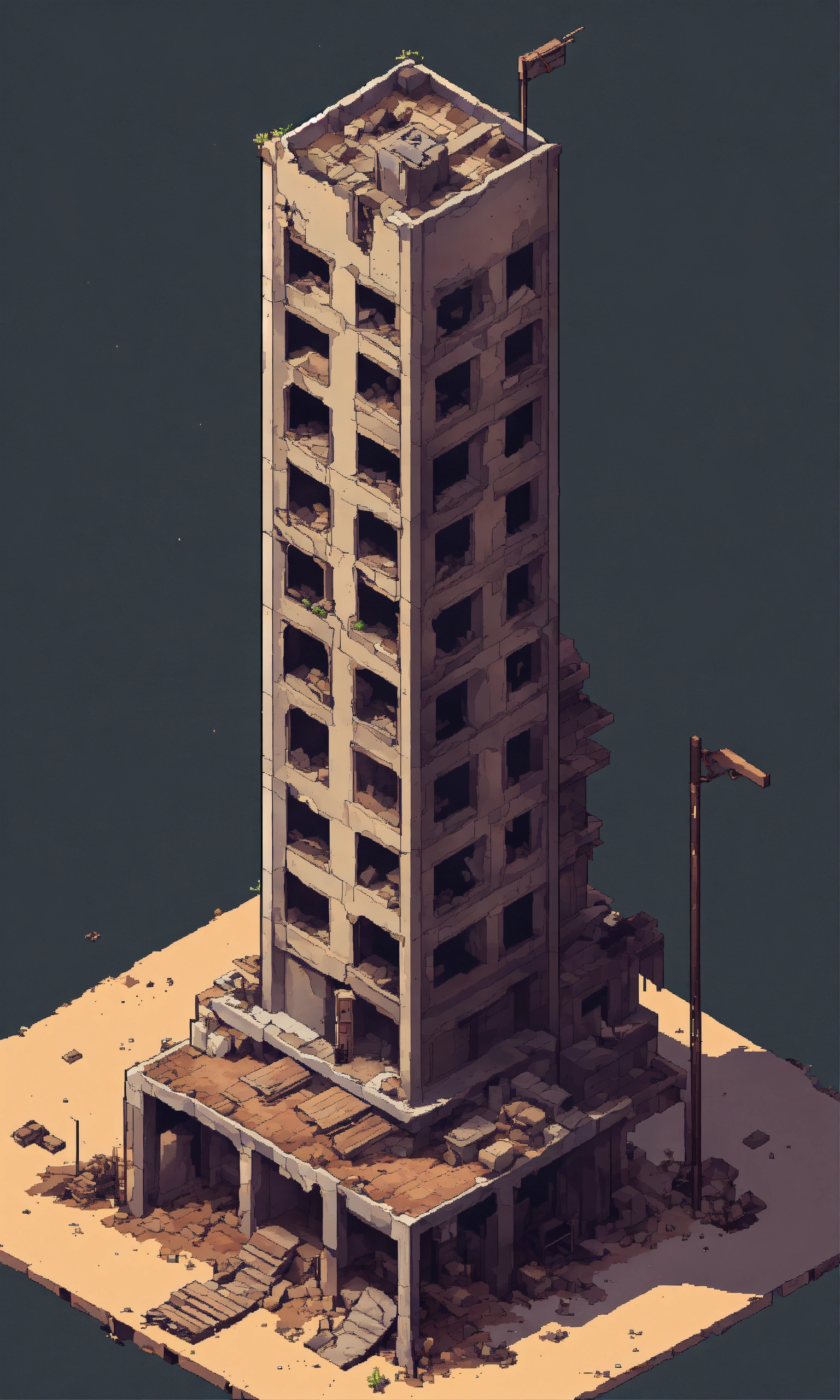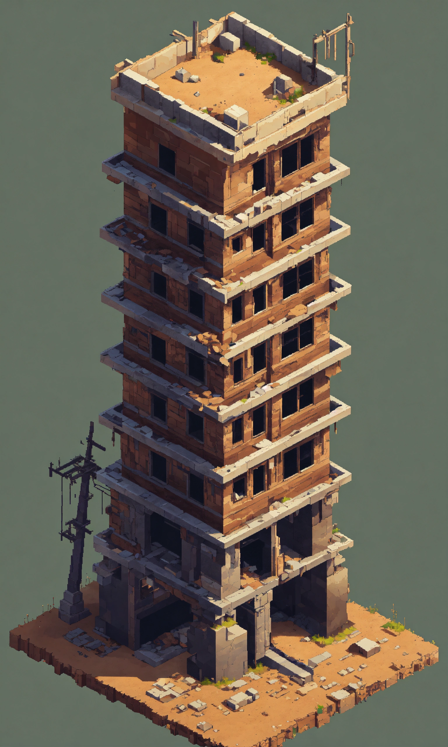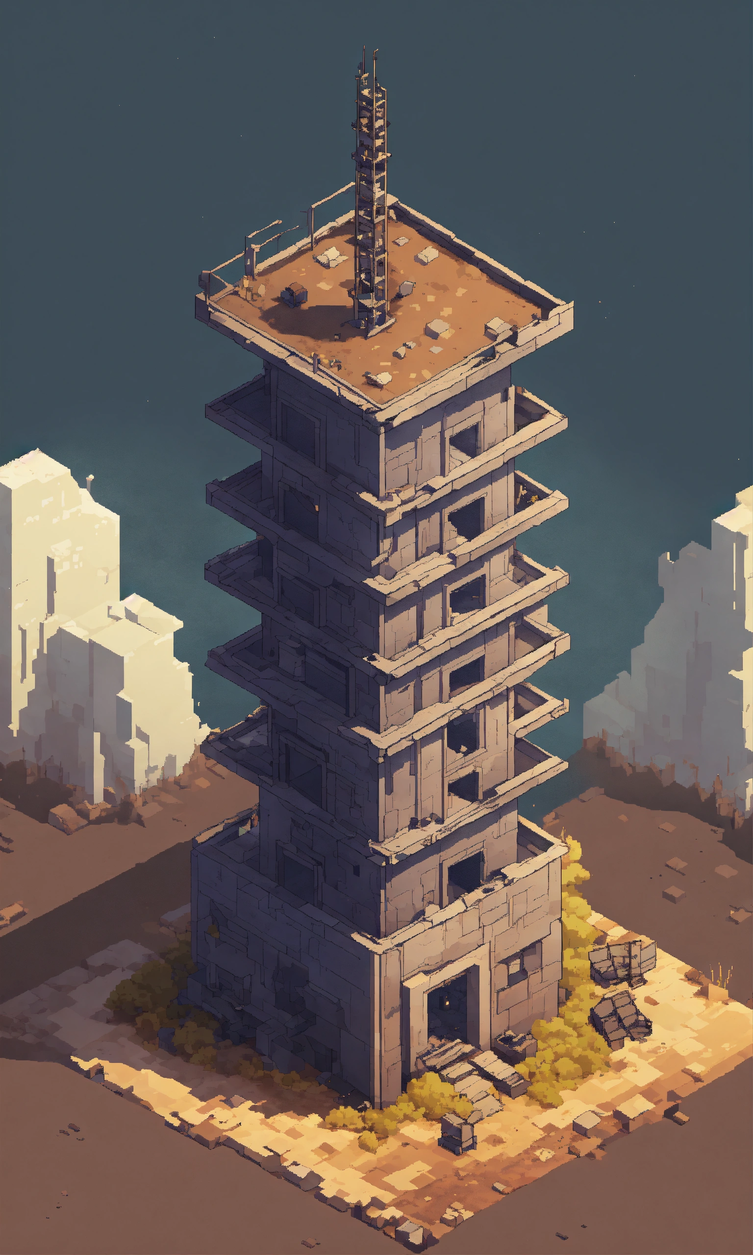 Short, plain, level one lone tower of a badly constructed crumbling post-apocalyptic human settlement single story building after apocalypse. isolated, plain background. top down isometric mobile game extremely simplistic pixel art.