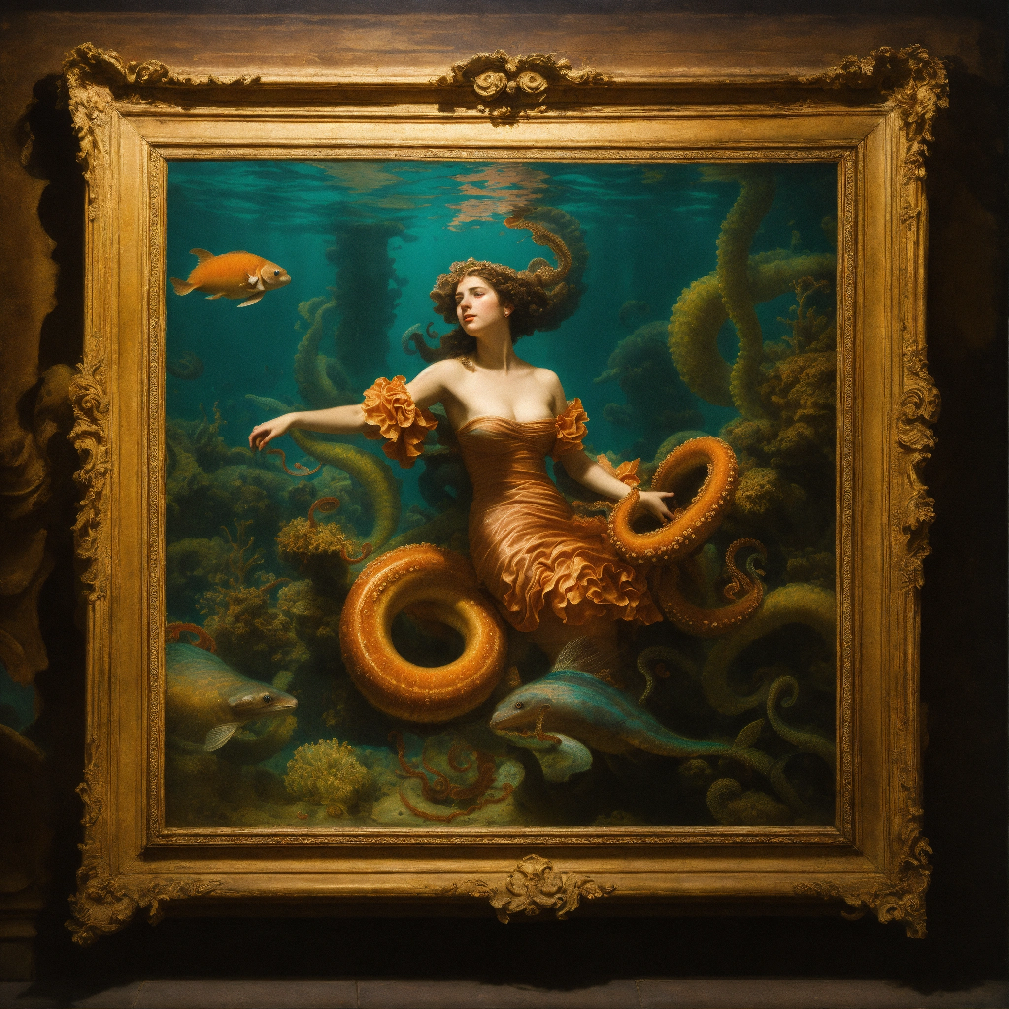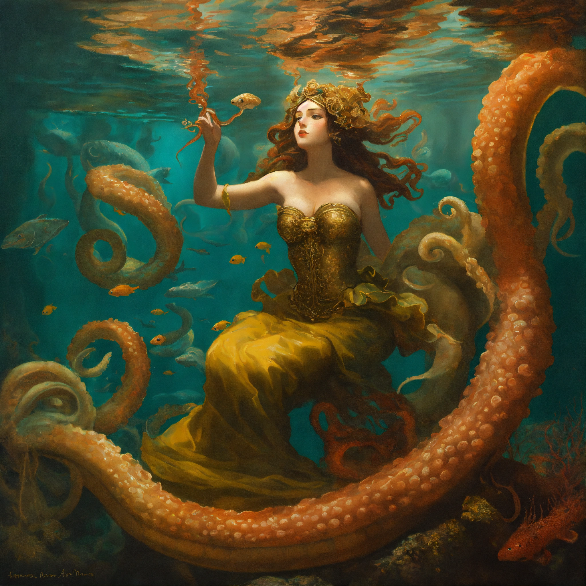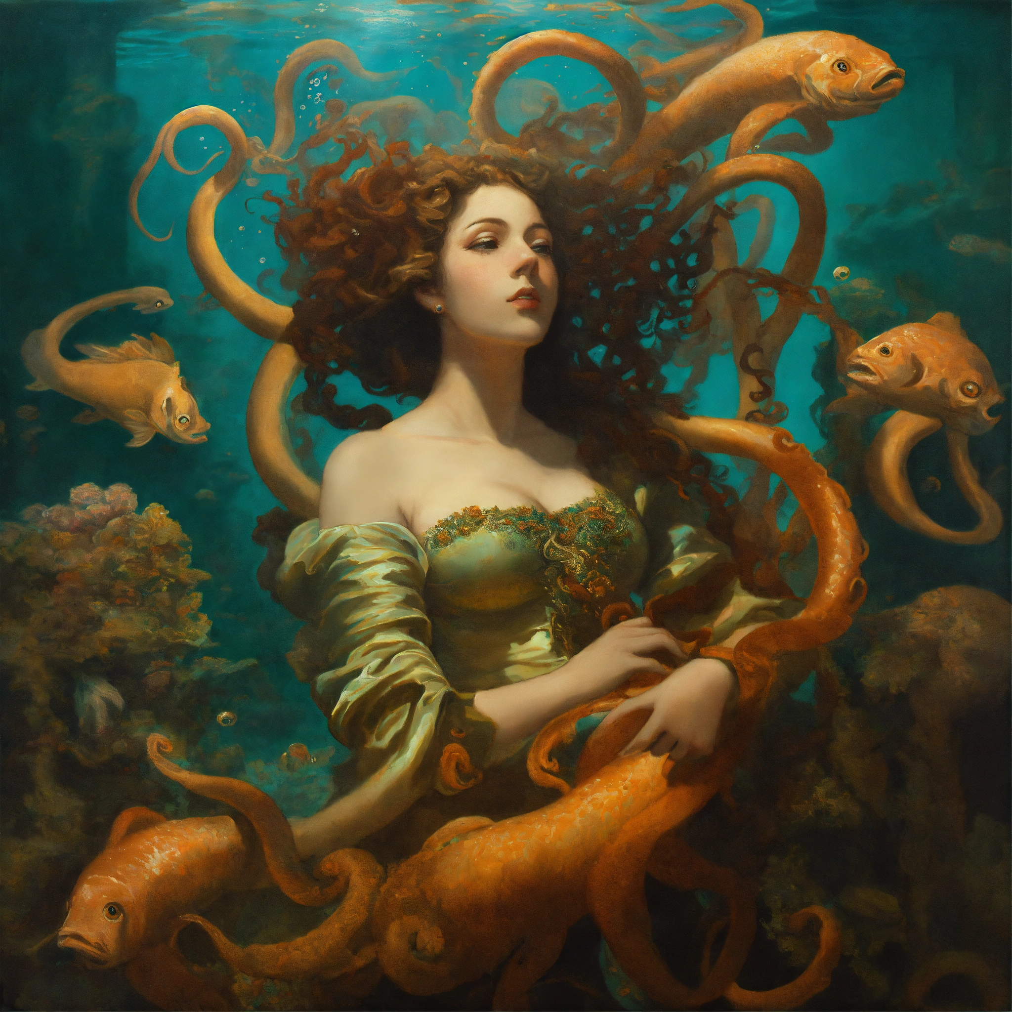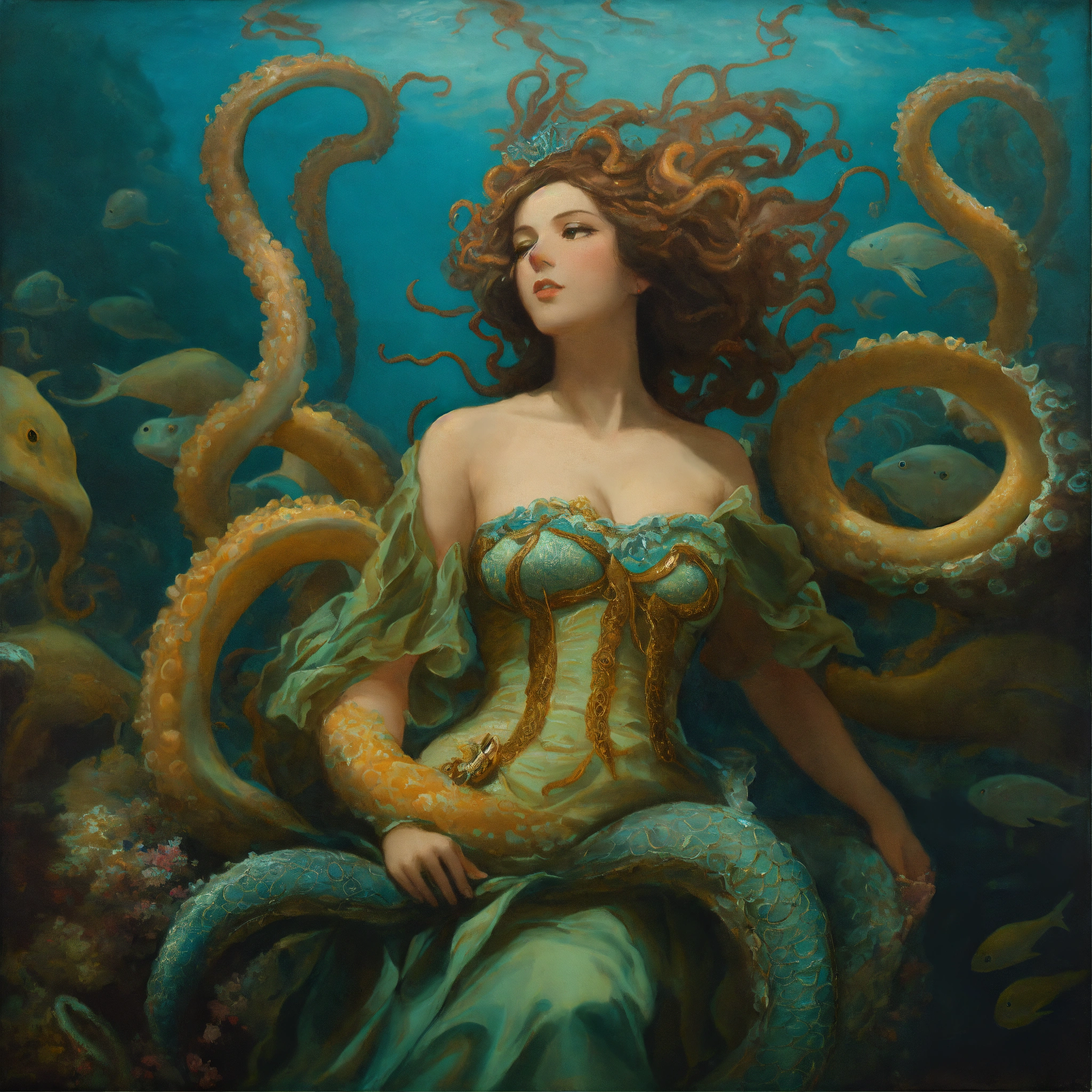 An baroque oil painting of underwater roman woman emperess arounded by giant tentacles