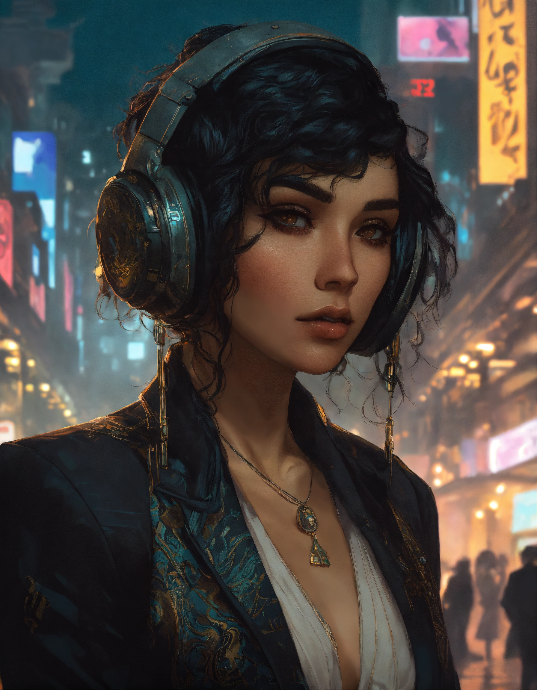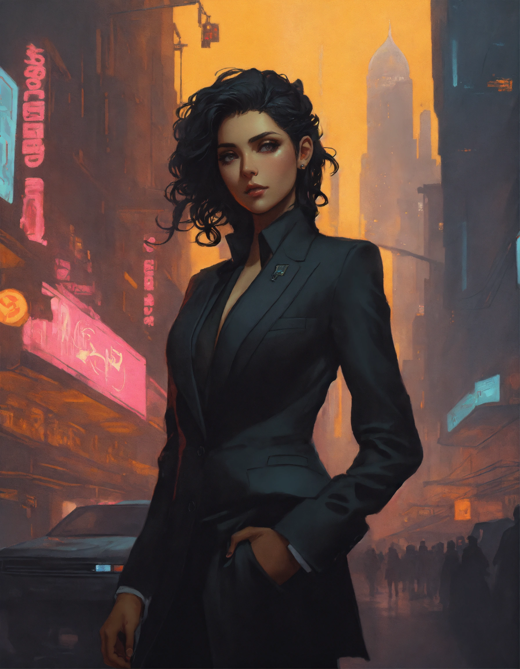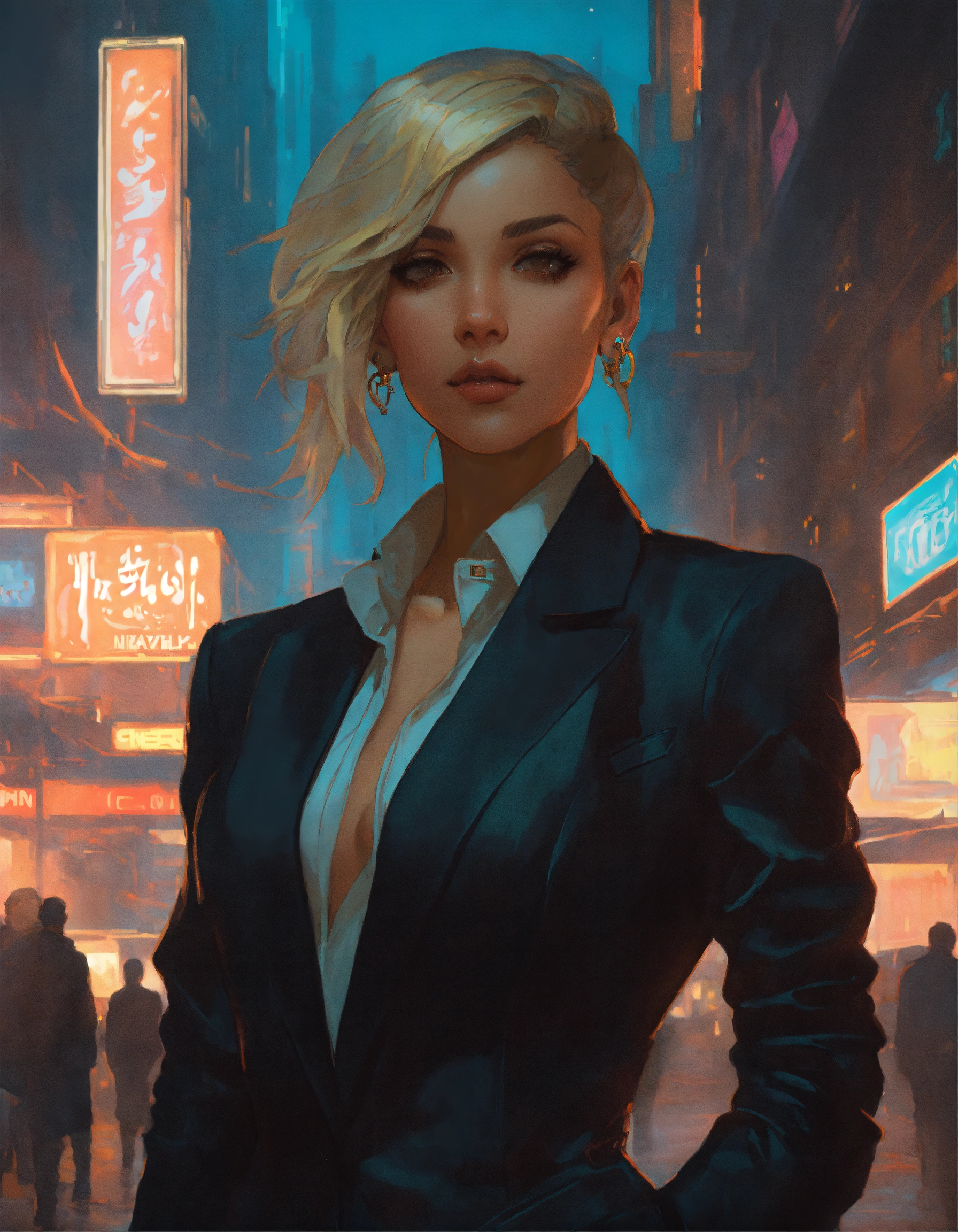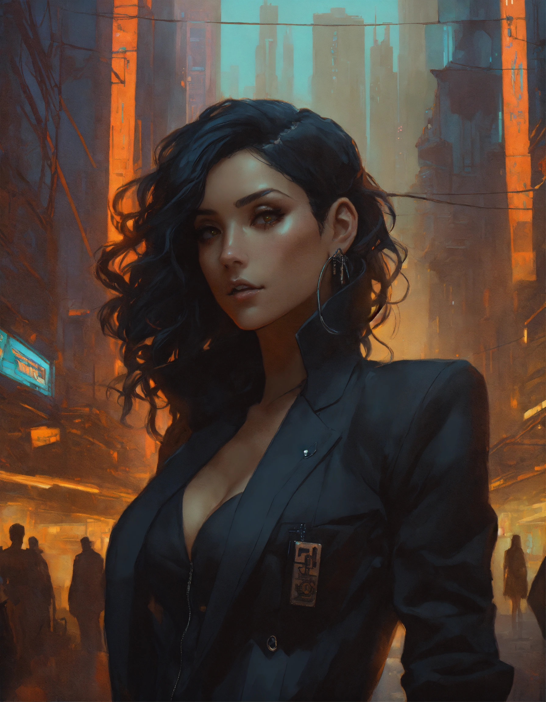 Arrogant middle eastern bimbo wearing a black business suit, in a dark dystopian city, hyper detailed, cyberpunk style, greg rutkowski, alphonse mucha, wlop face view