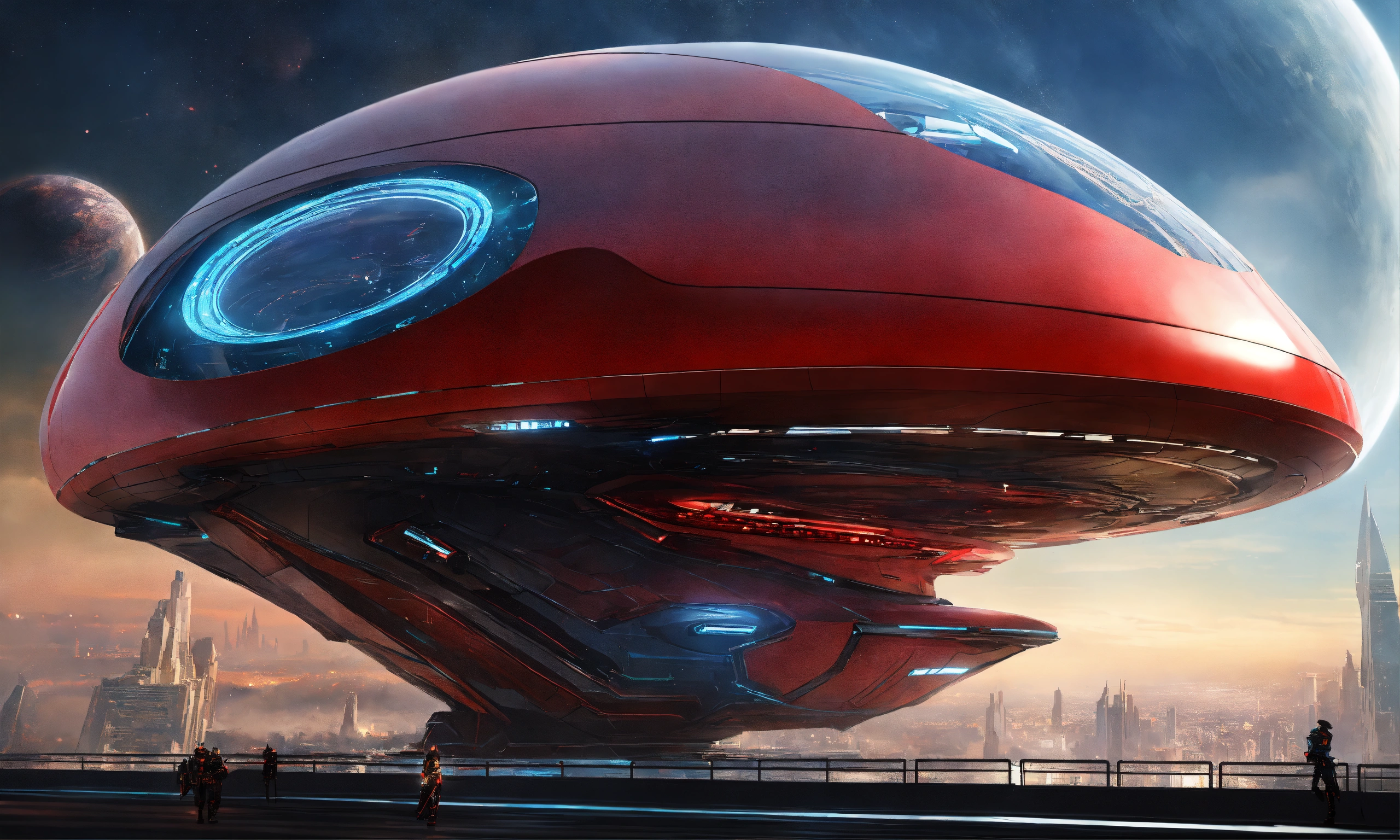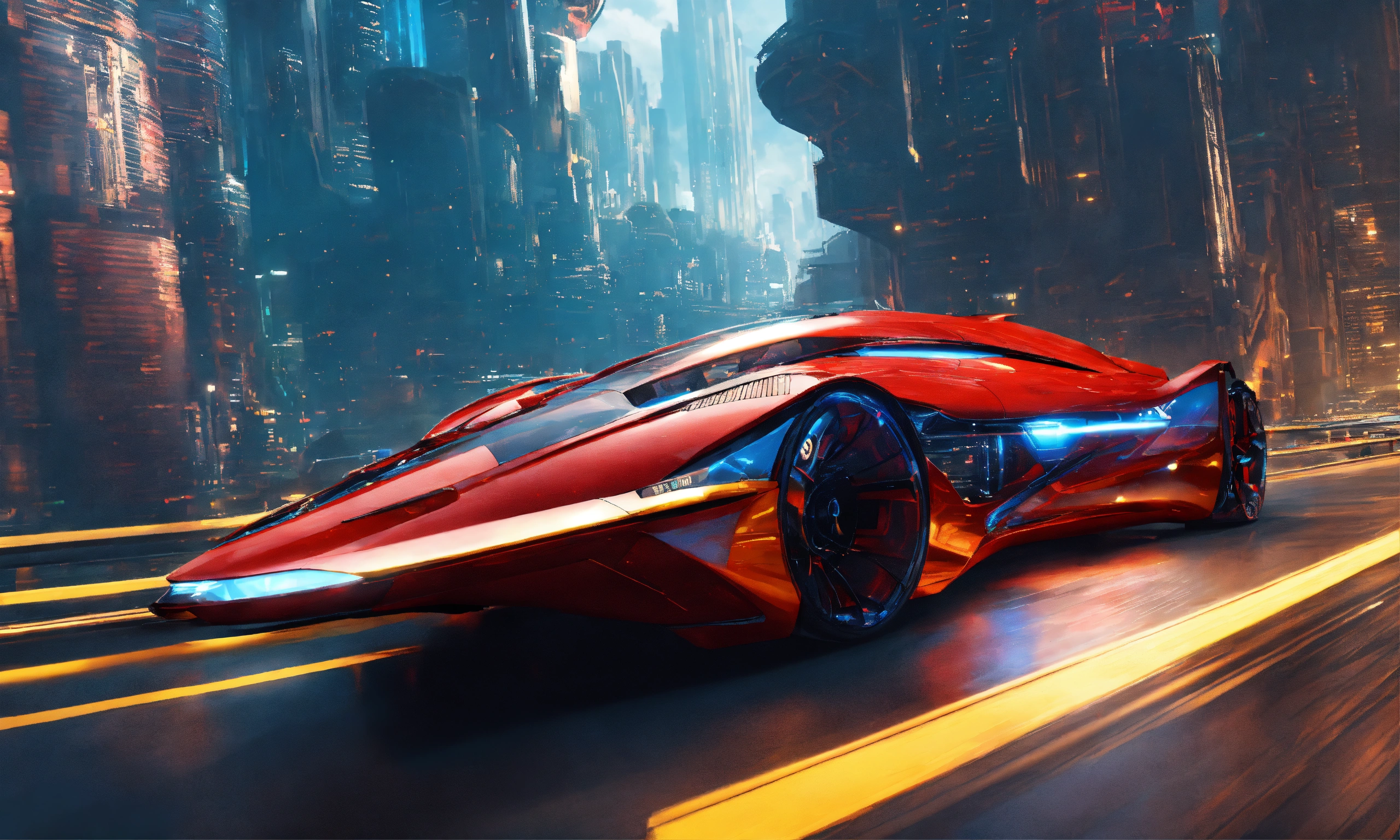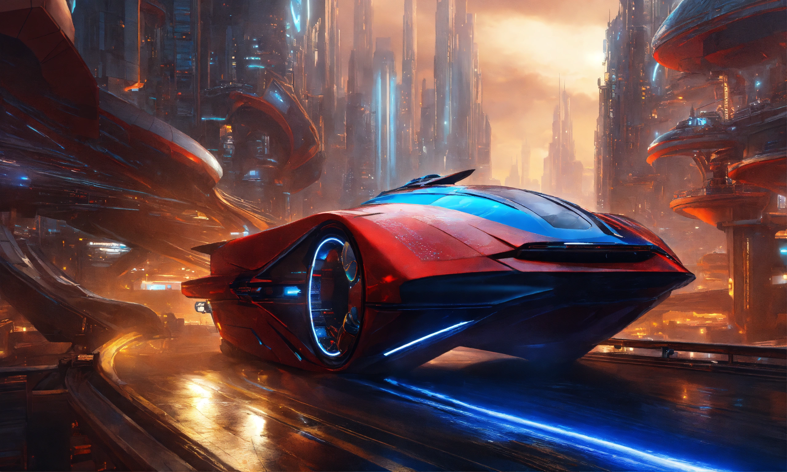A futuristic spaceship in a fantasy world with a racing futuristic city road "generate an awe-inspiring image featuring a futuristic spaceship, brilliantly colored in red and blue, set within a fantastical realm. this spaceship should boast a futuristic design akin to armored plating, reminiscent of a vehicle from a fantasy world. present the spaceship from a high angle to emphasize its extraordinary appearance. the exterior of the spaceship should glisten with a shiny, metallic finish, exuding both power and sophistication. position this remarkable vehicle within a backdrop that harmonizes with its futuristic essence, weaving together elements of advanced technology and the fantasy world. ultimately, craft a visual masterpiece that seamlessly merges the cutting edge of technology with the allure of a fantasy realm, where this futuristic spaceship races along a stunning city road, leaving a trail of wonder and amazement<loraxl_more_art-full_v10.5> <loracyborg_style_xl-alpha