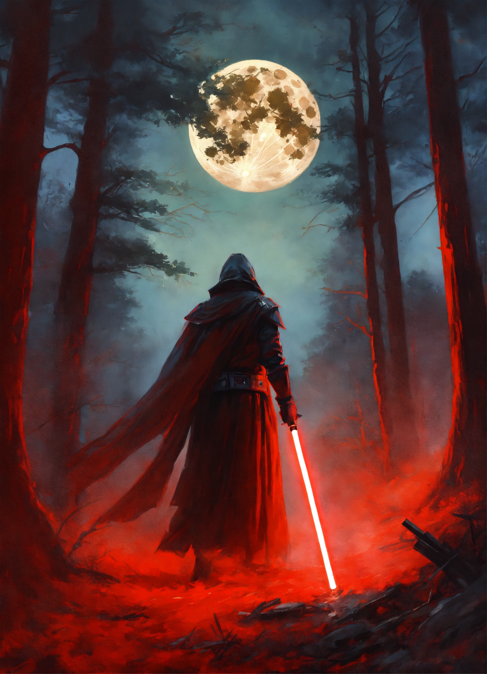Painting, dominator facing away with wulf, foggy forrest, scary feeiling, focal blur, mist over ground, red light saber, full moon