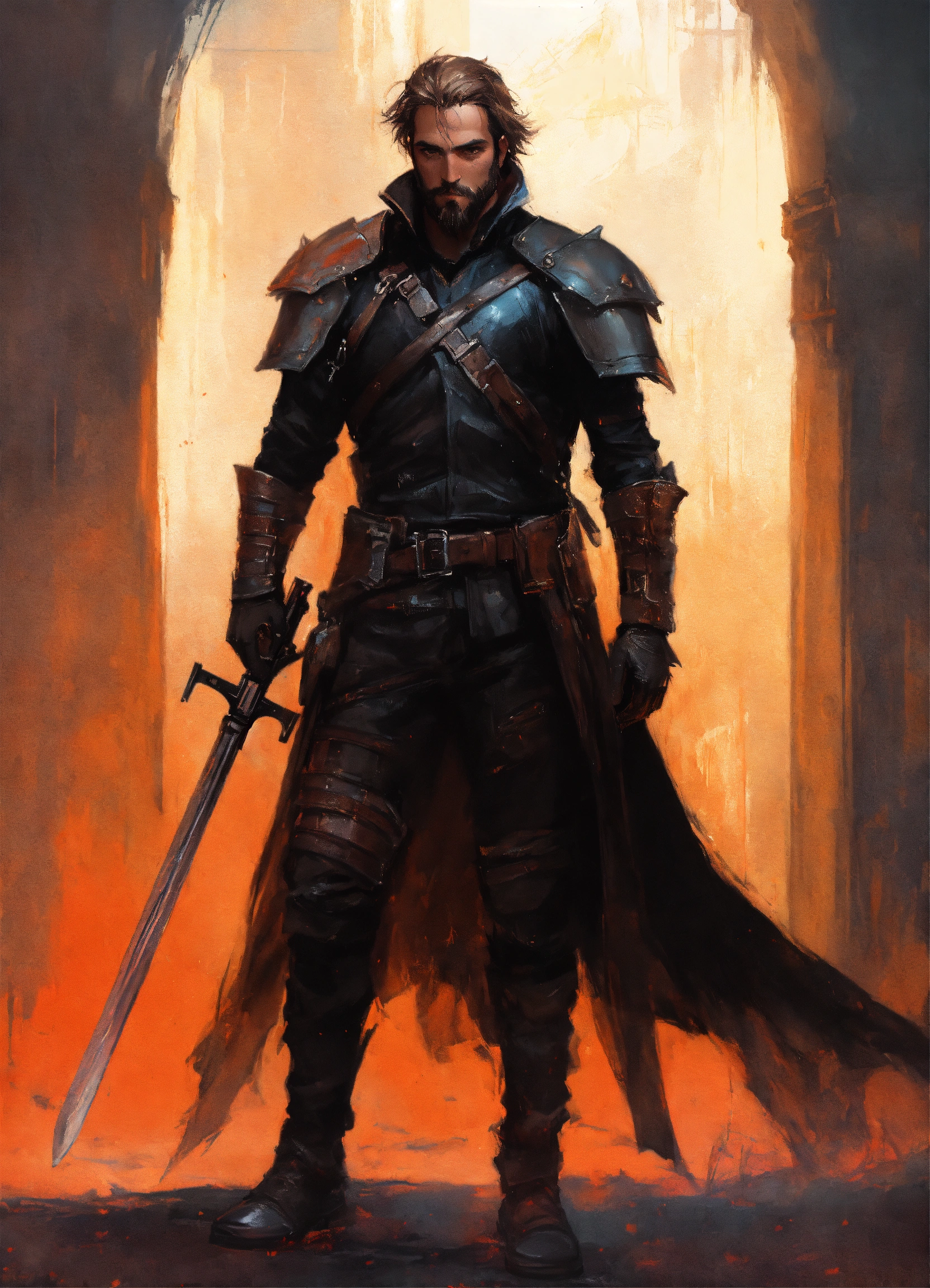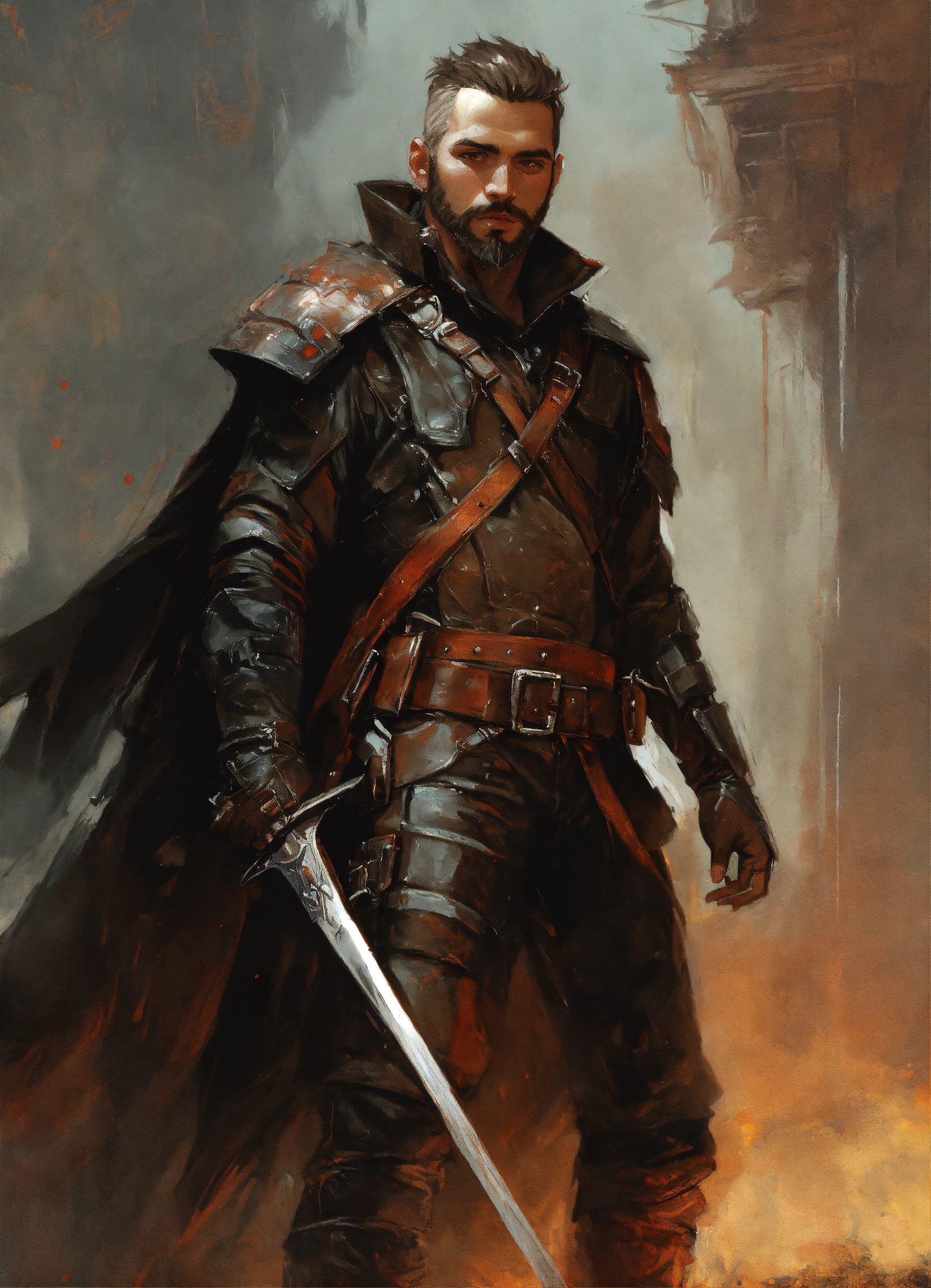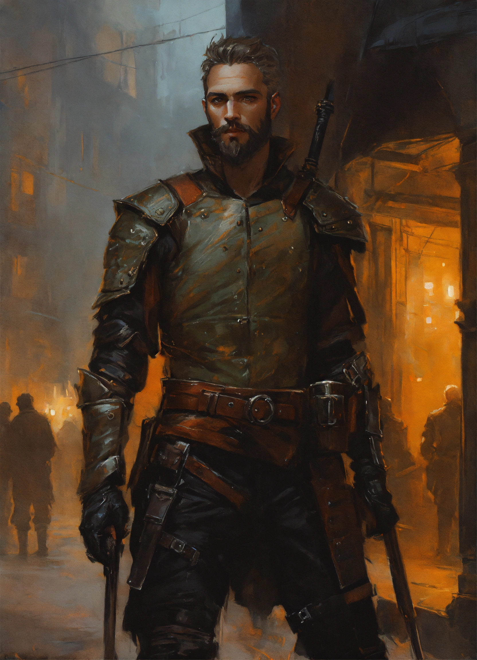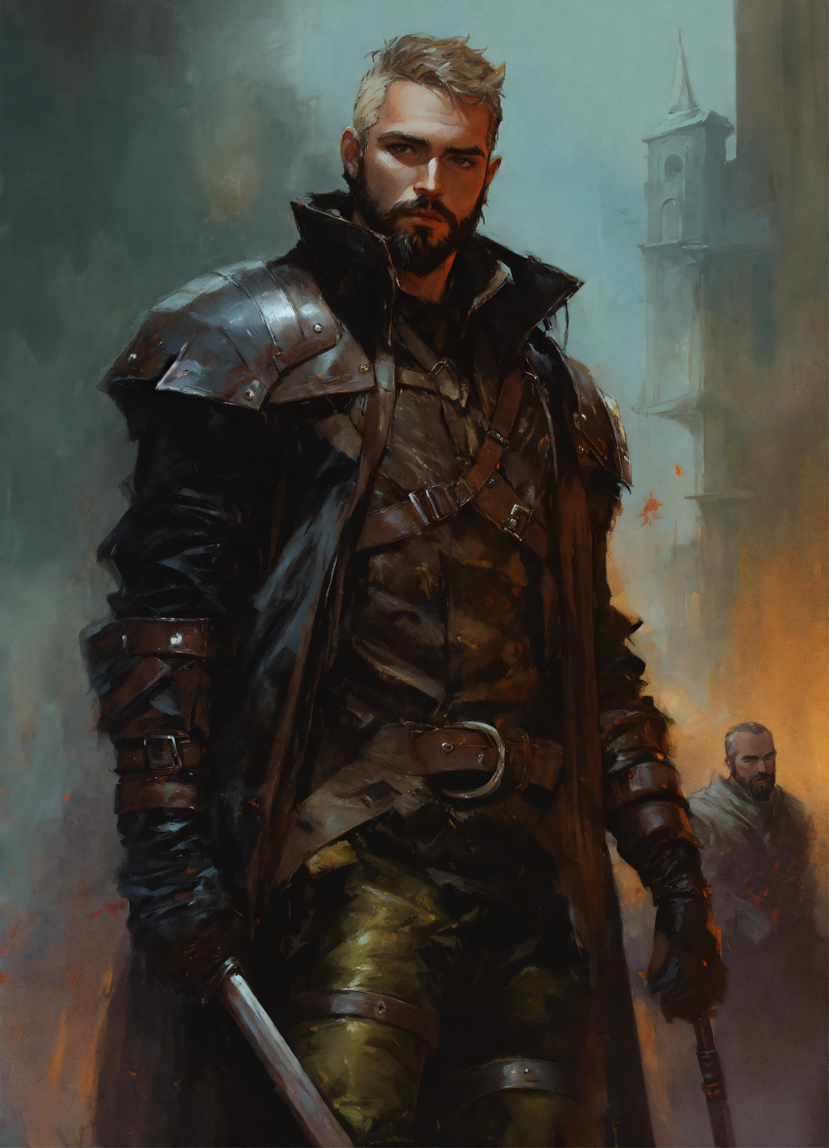 Fantasy vampire bounty hunter wearing leather armor with short hair and beard, guy denning, jakub rozalski, magali villeneuve and charlie bowater