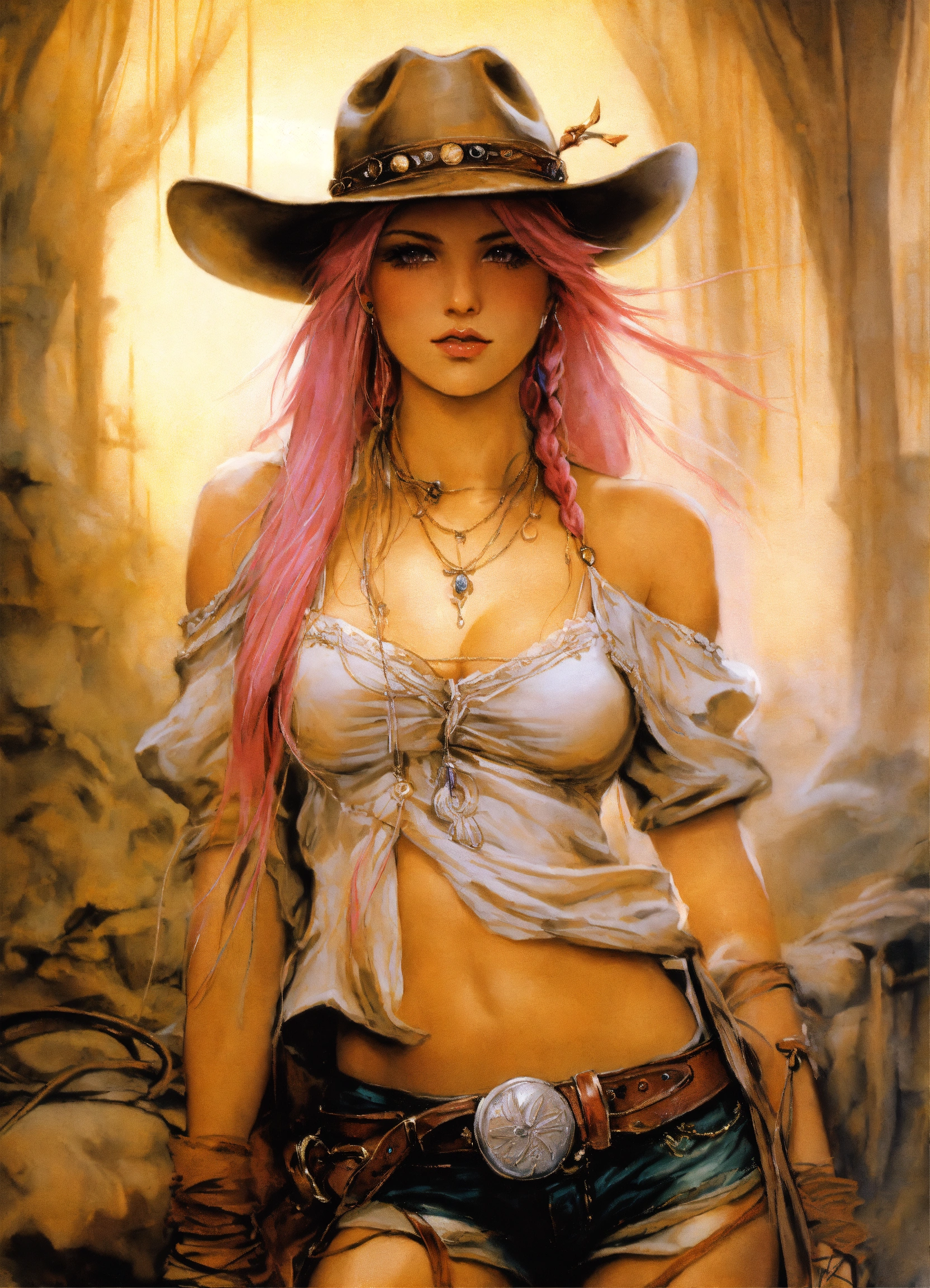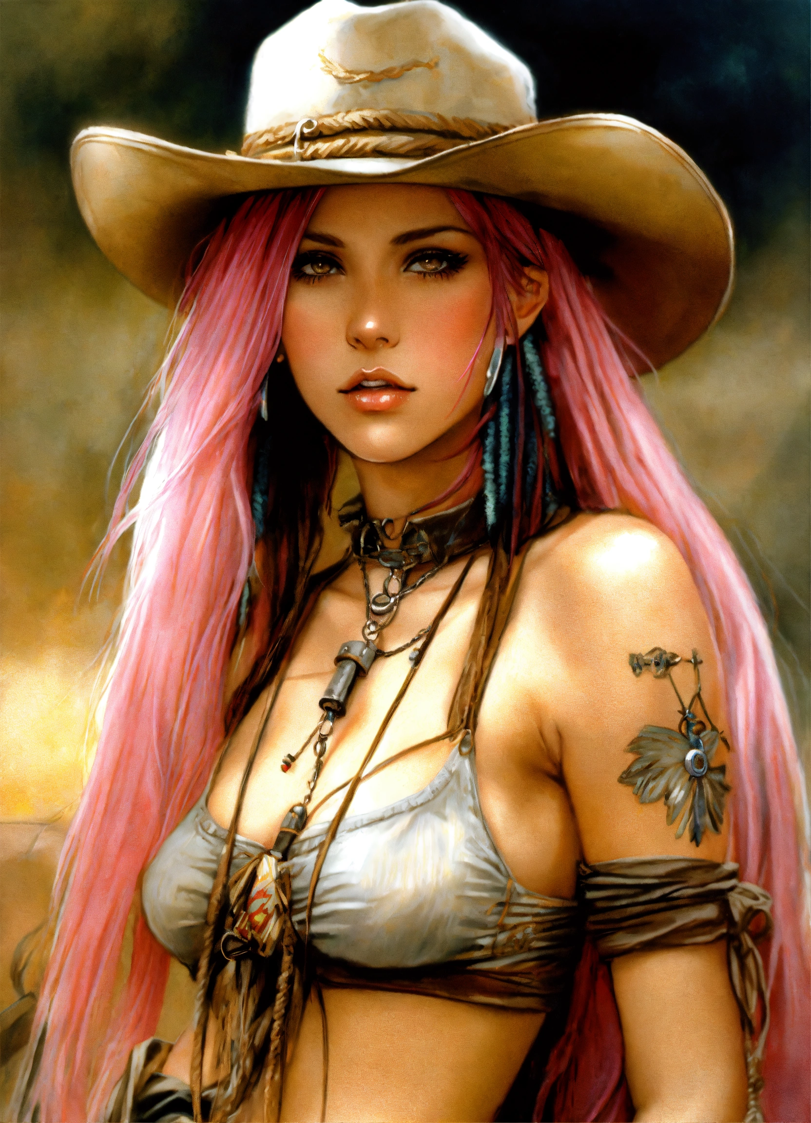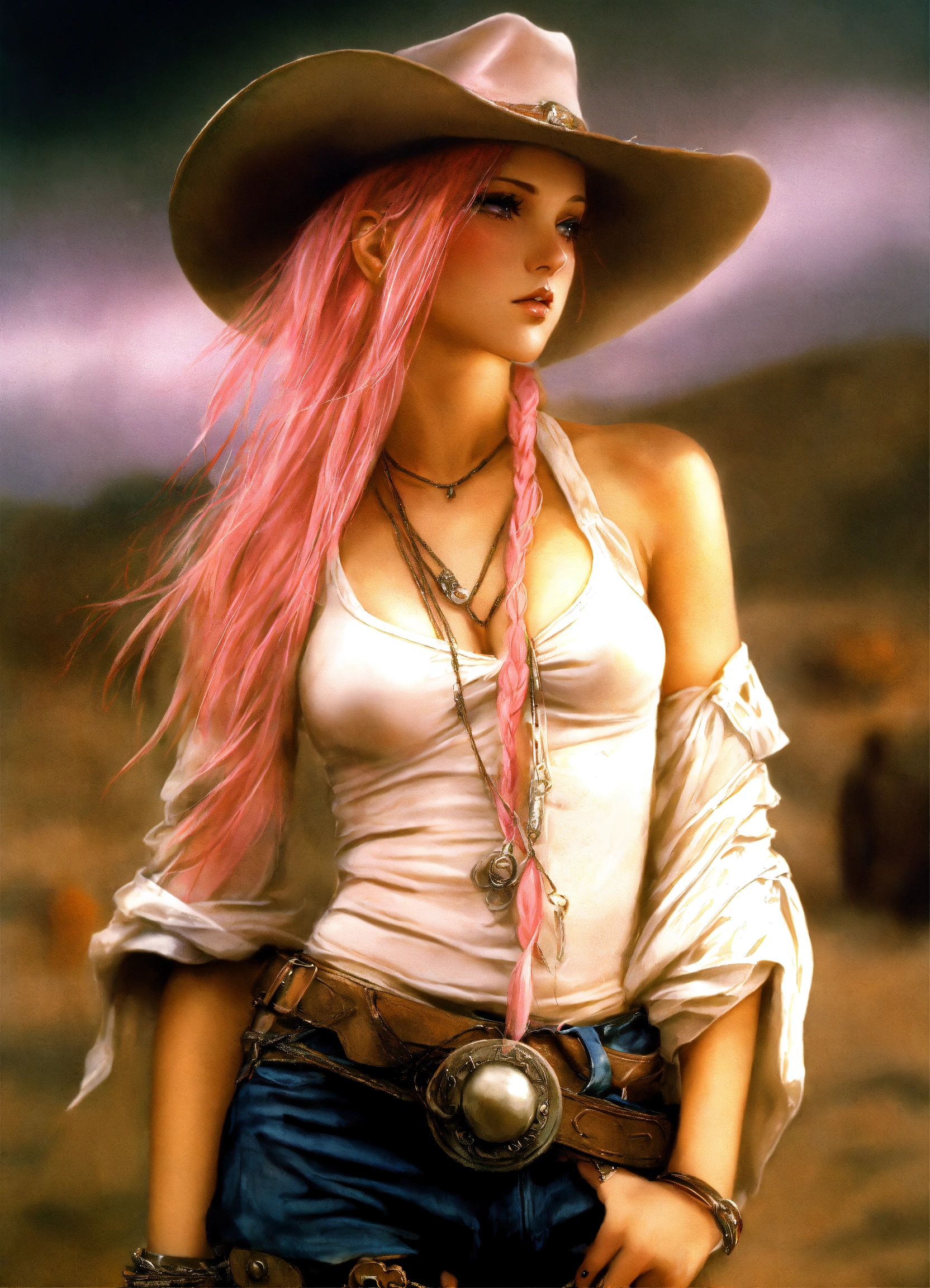 Female with loose shirt cowboy pink hair braids hat luis royo