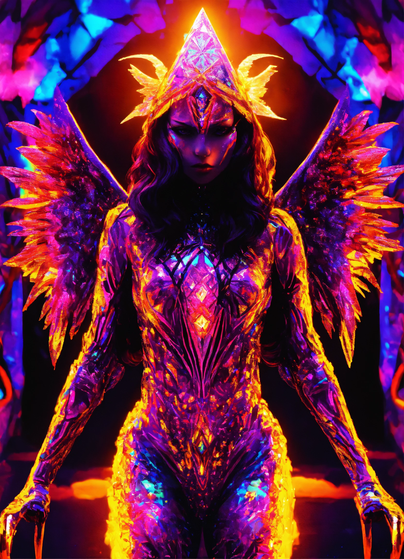 Full body the grudge in a diamond angel suit in a blacklight dmt demon psytrance rave