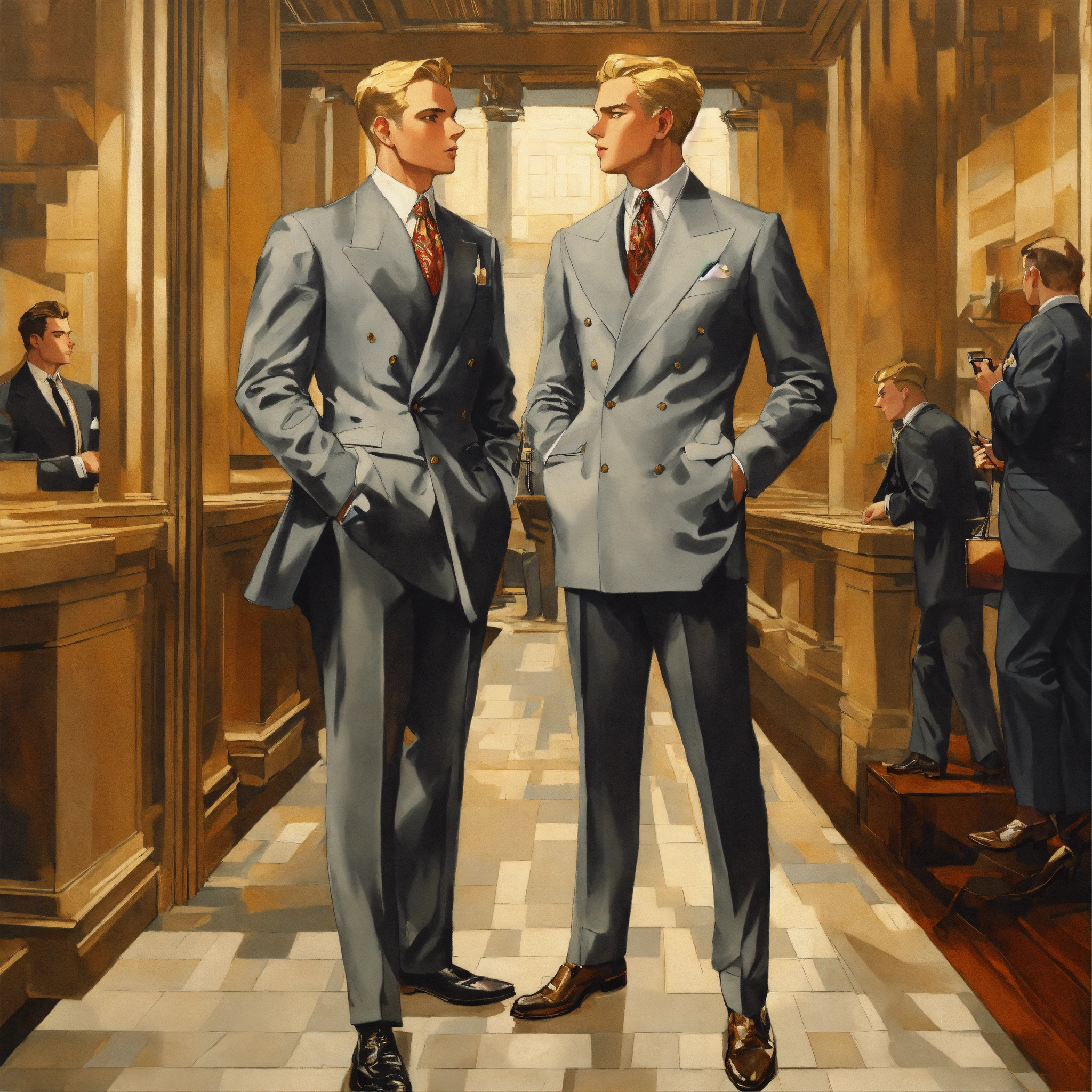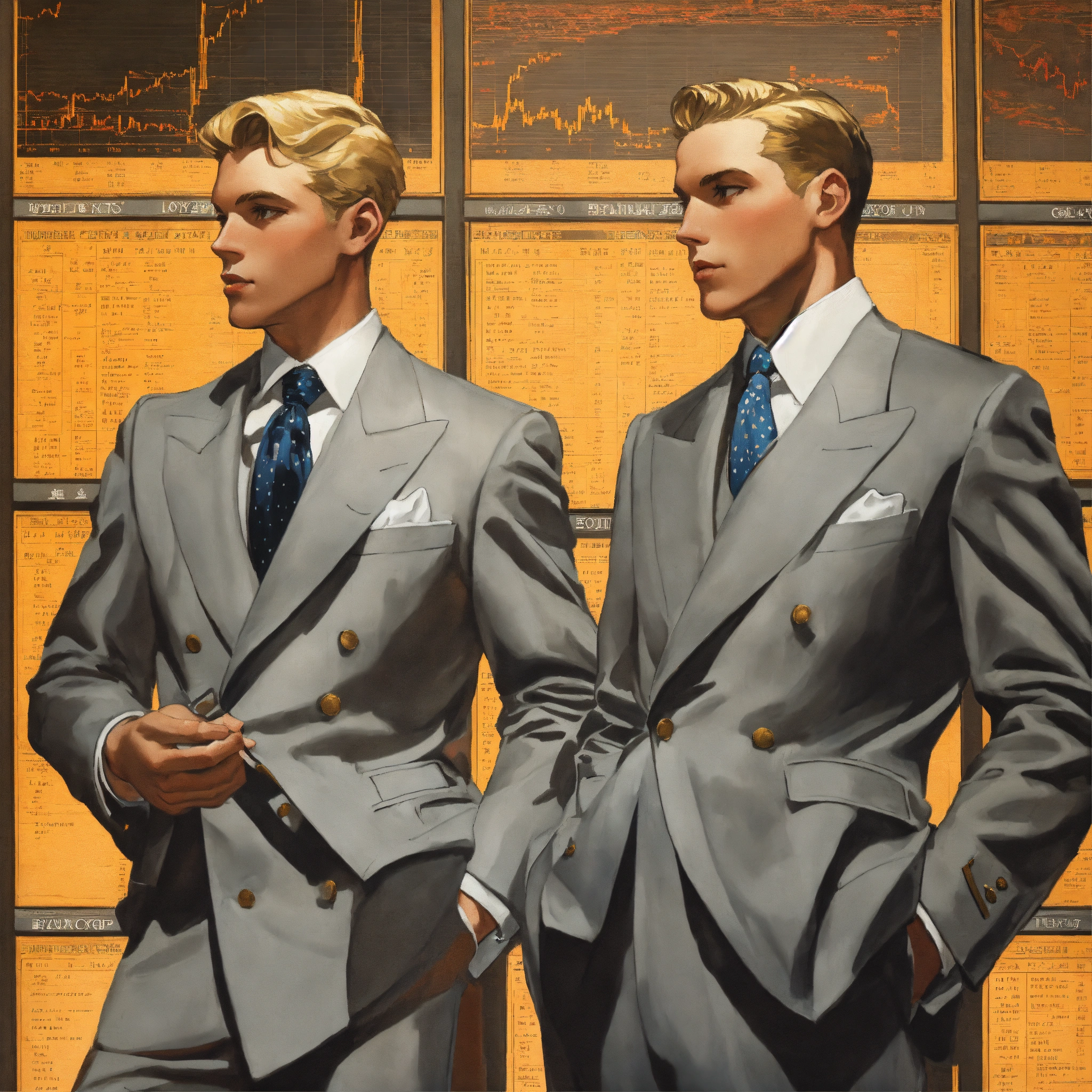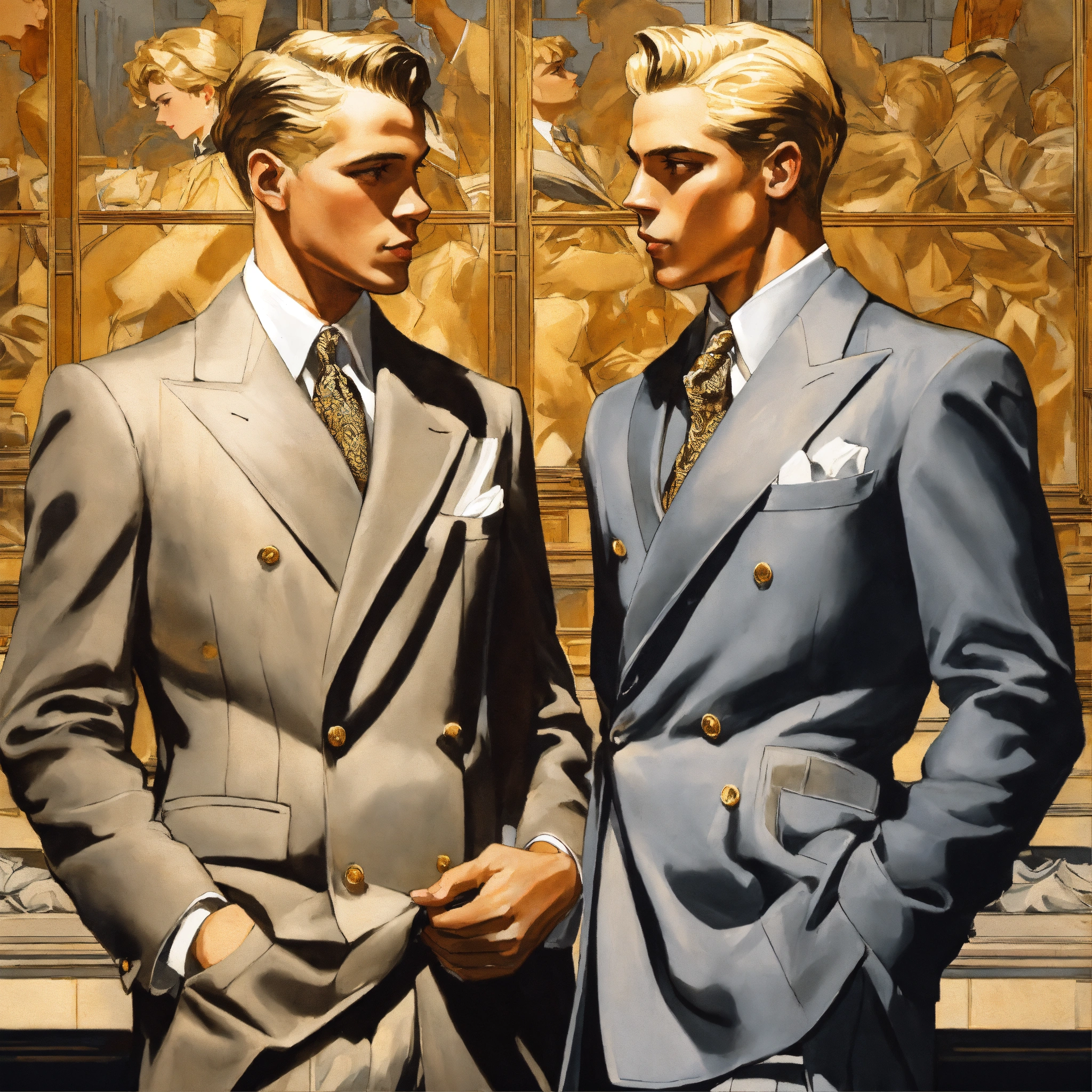 Two blonde businessmen in grey double breasted suit lining on a wall in a stock exchange, leyendecker style
