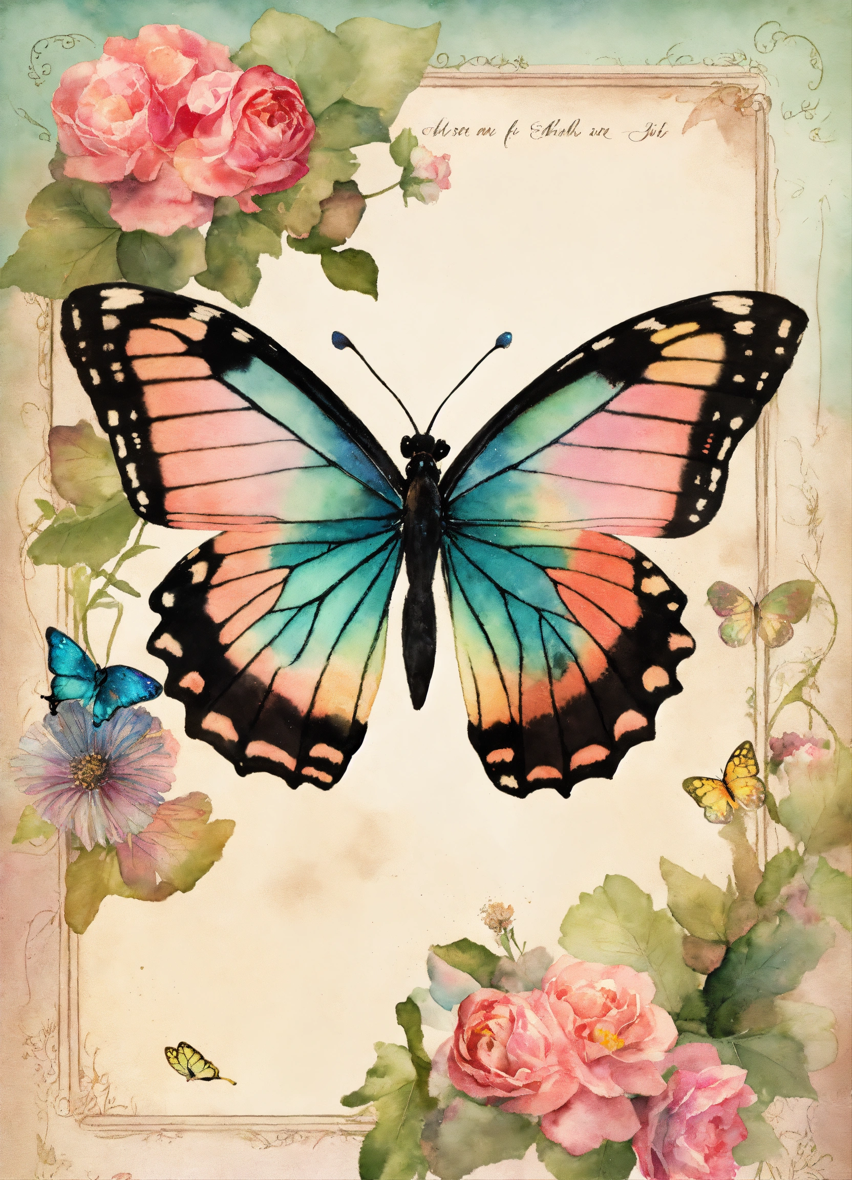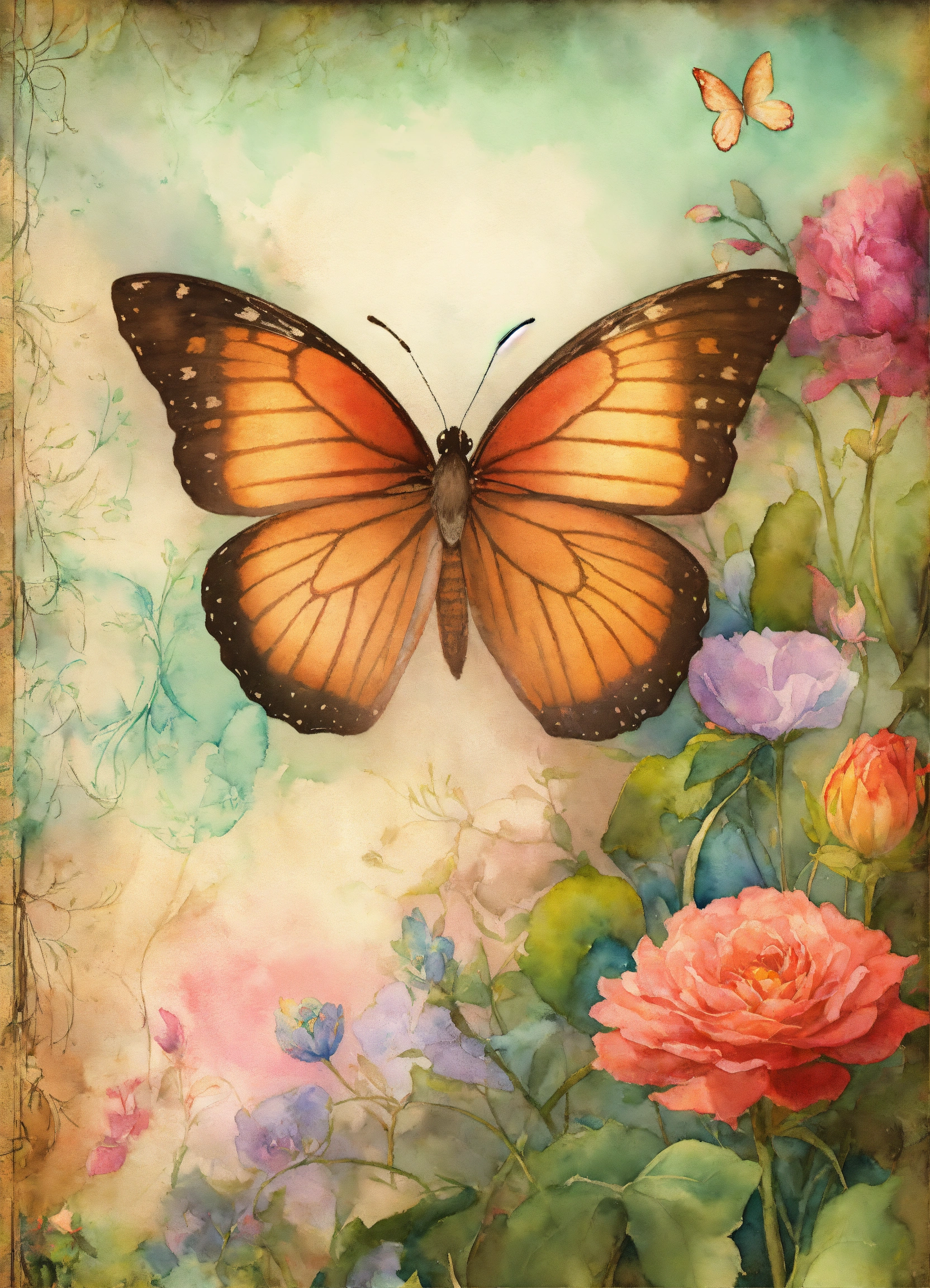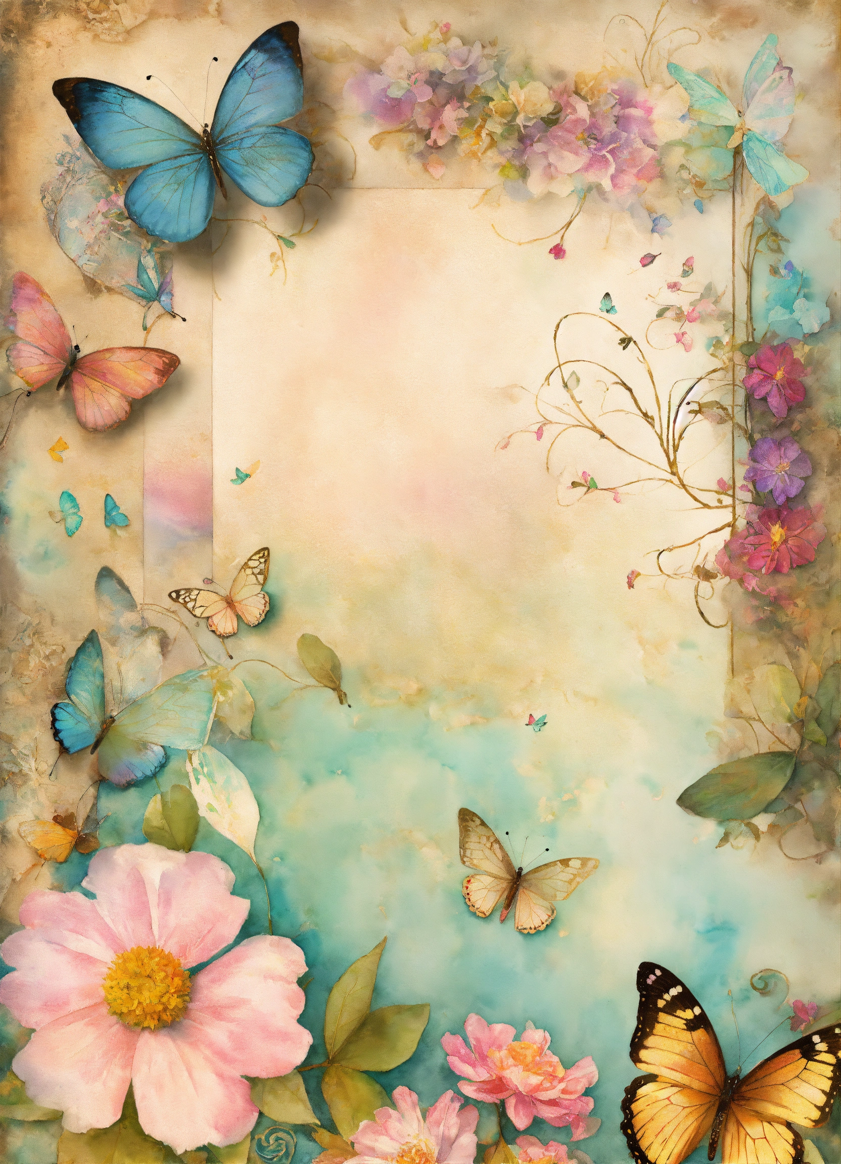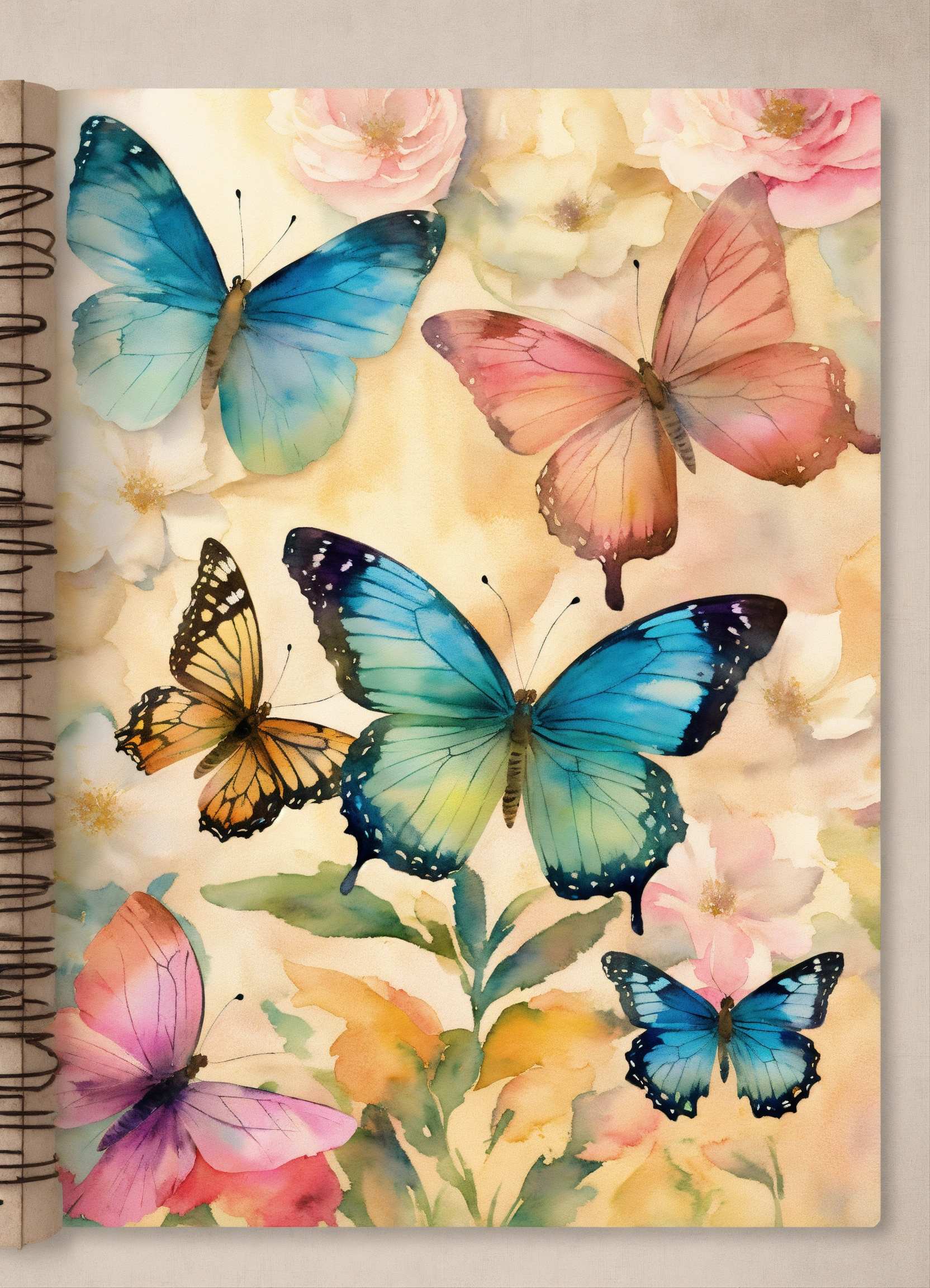 Shabby chic dreamy mist pastel junk journals "create a collection of whimsical watercolor butterfly illustrations, presented as full figures and provided individually as separate high-resolution png images. these digital butterfly images should be designed with a fantasy-inspired aesthetic, capturing the enchantment and beauty of butterflies in a whimsical and artistic style. they should be versatile for easy cutting and use in a variety of crafting projects, including card making, scrapbooking, junk journaling, and paper crafts. these illustrations should serve as a delightful resource for adding a touch of magic to creative endeavors." swirling magical fairytale abstract art style