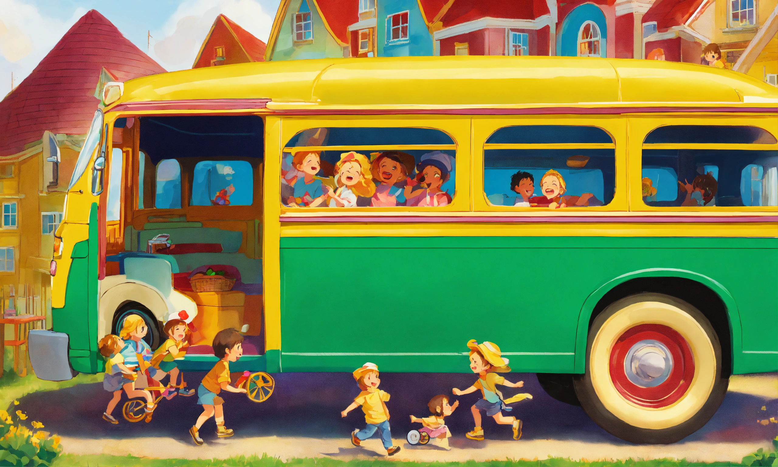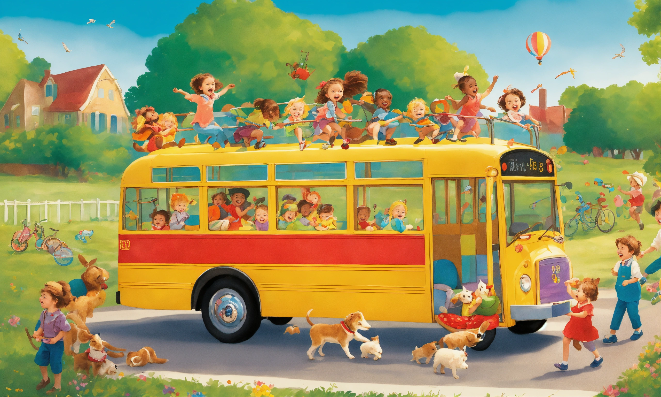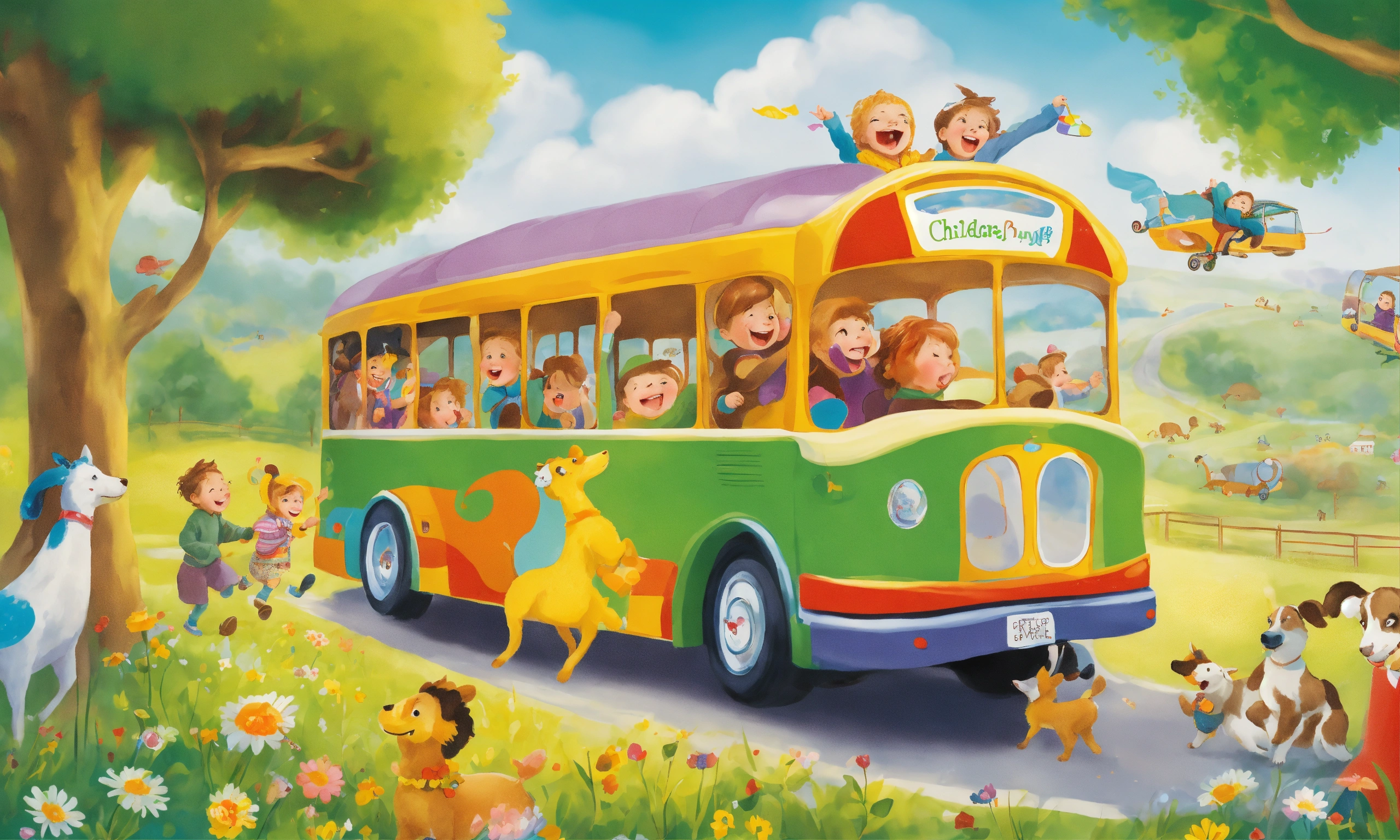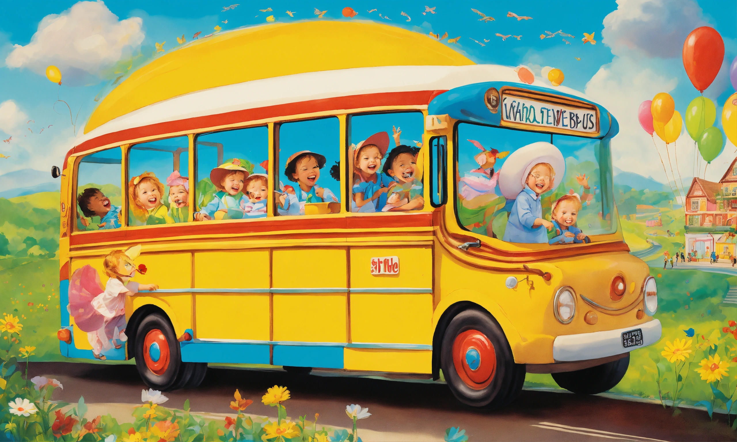 "produce an engaging and colorful illustration that captures the joyful spirit of the nursery rhyme 'the wheels on the bus.' the central focus should be on a whimsical, brightly colored bus with large, friendly wheels that are indeed going 'round and round.' surround the bus with a cheerful scene that includes smiling children and adults, each engaged in a playful and interactive way. the image should radiate a sense of fun, movement, and camaraderie, evoking the lively and charming essence of the classic children's song."