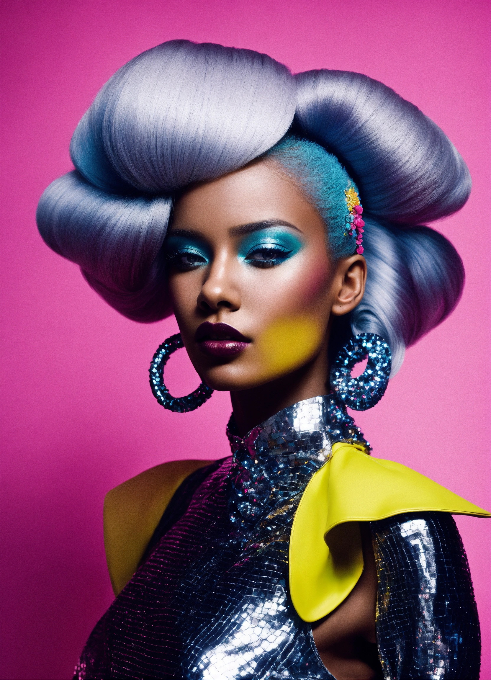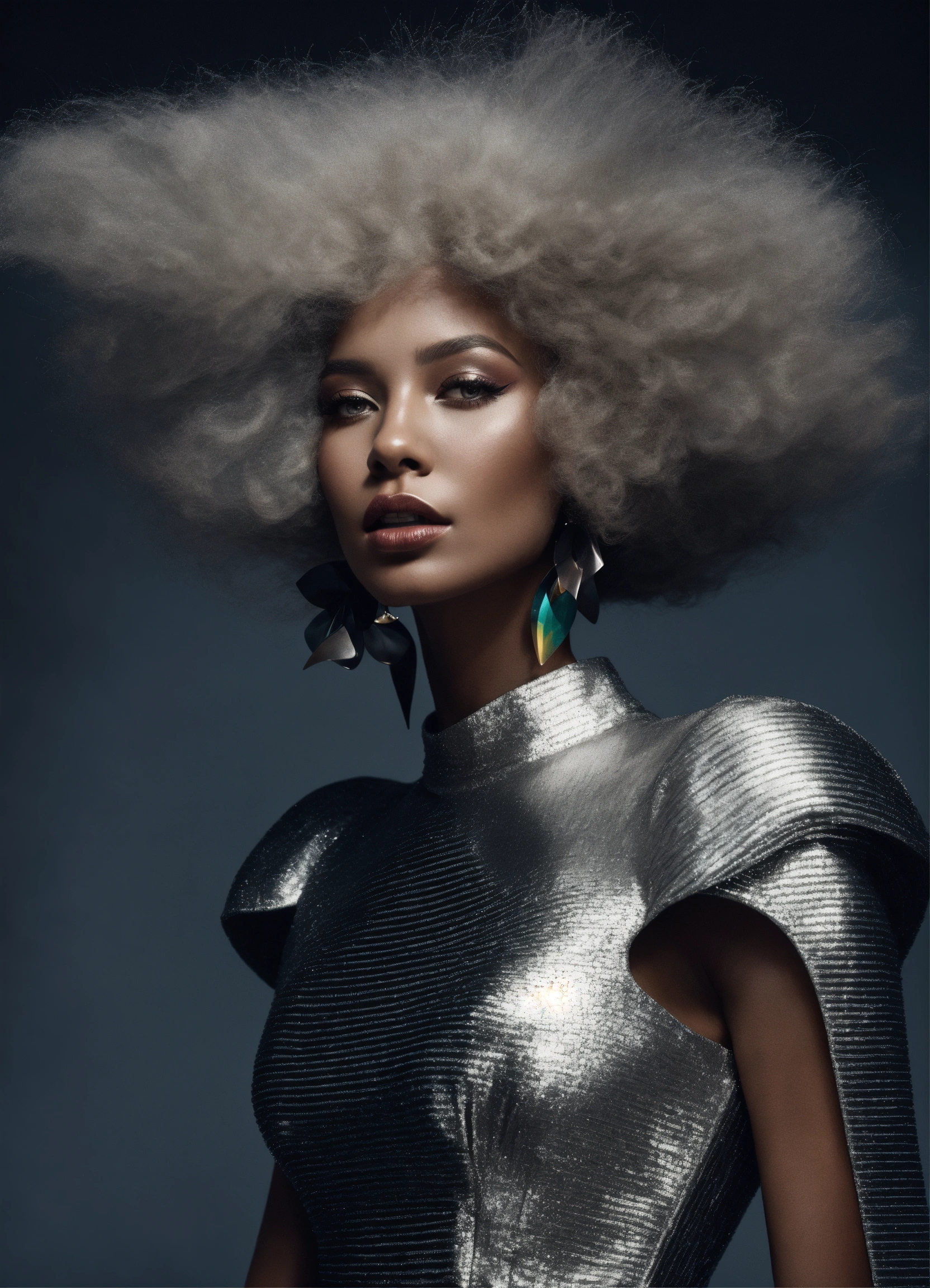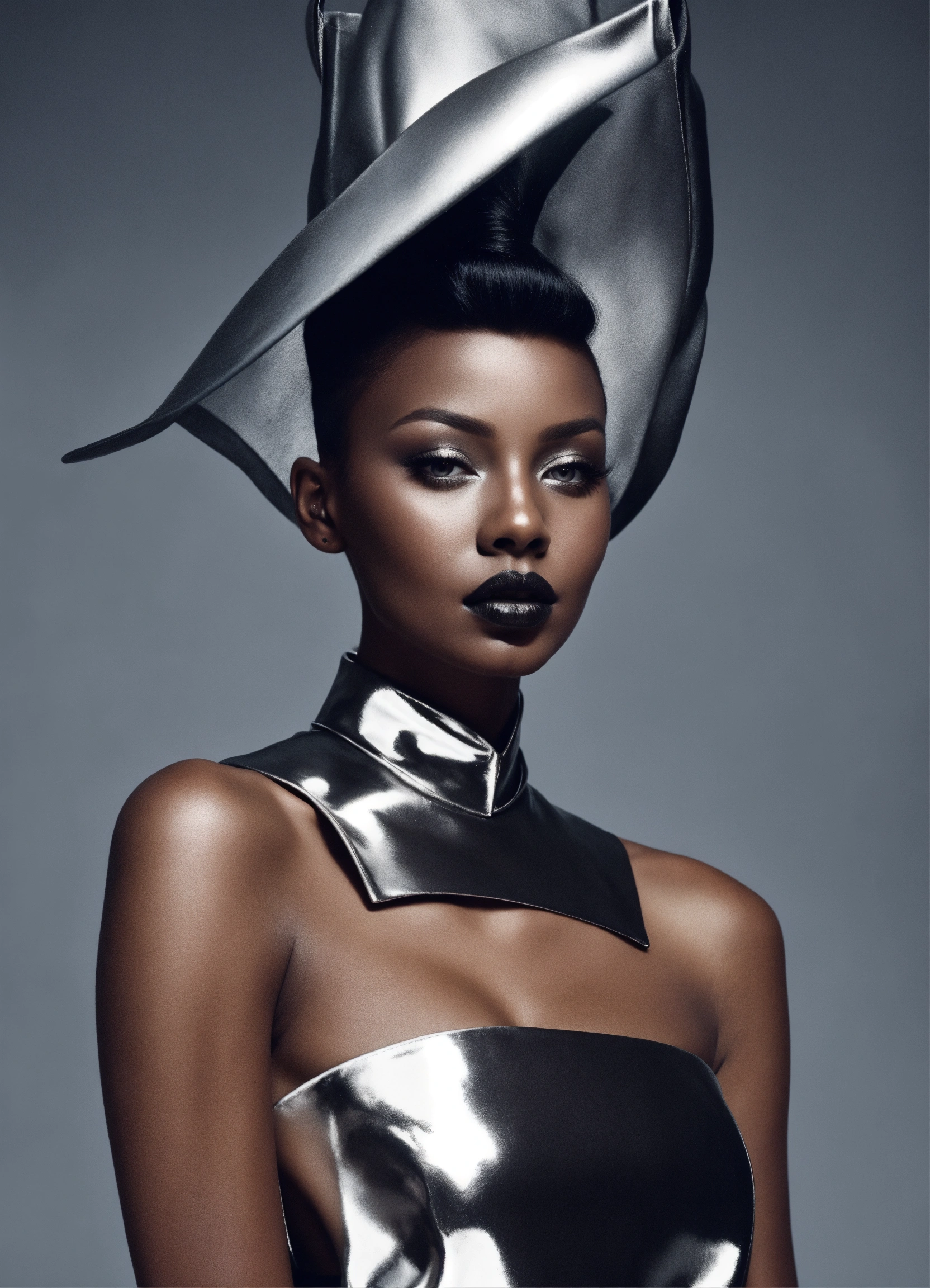 Avante garde high fashion beauty editorial, carmel complexion size 9 black woman dress in silver by flora borsi, style by flora borsi, bold, bright coolers, conceptual bob style hair, ((flora borsi))