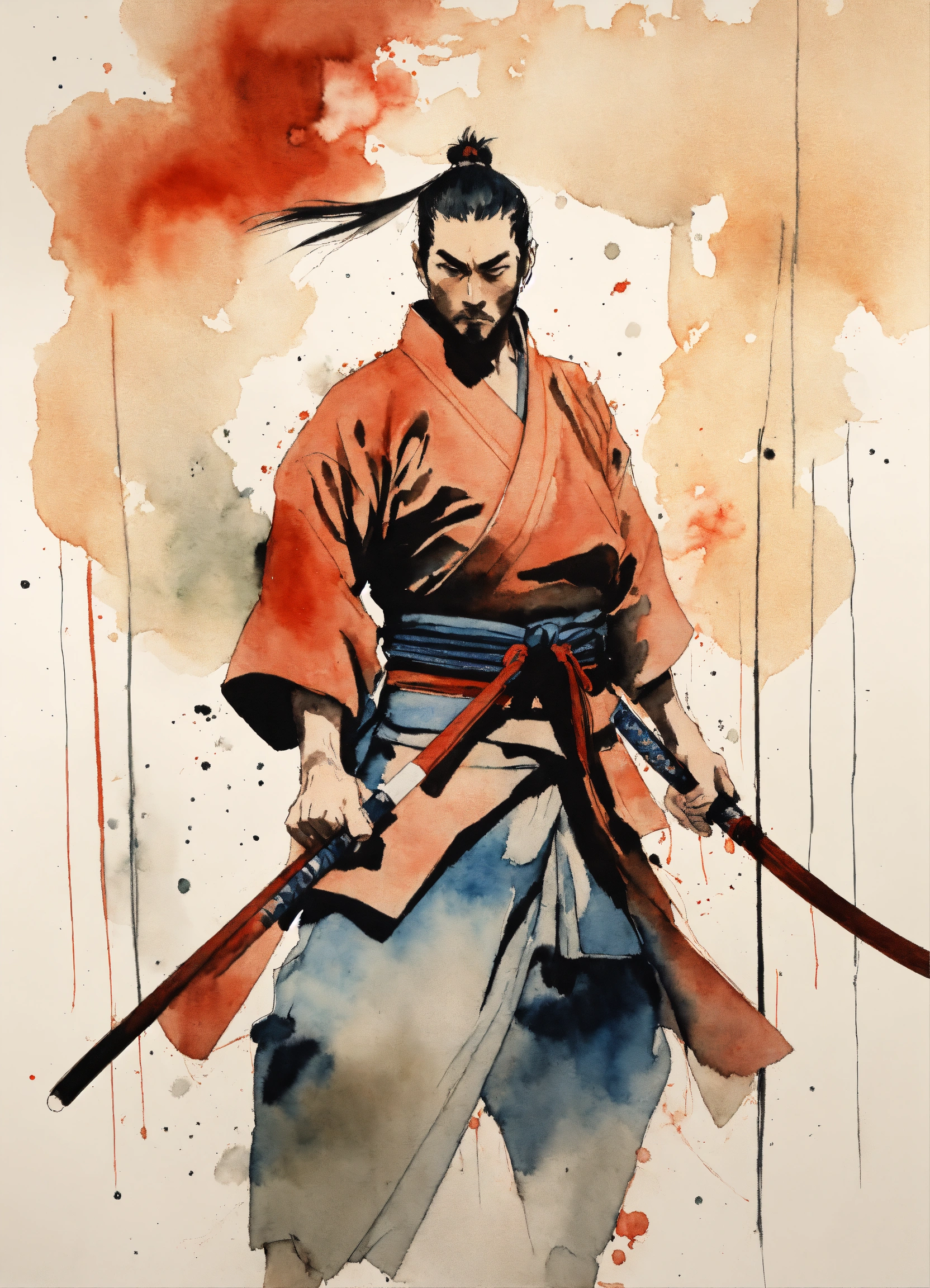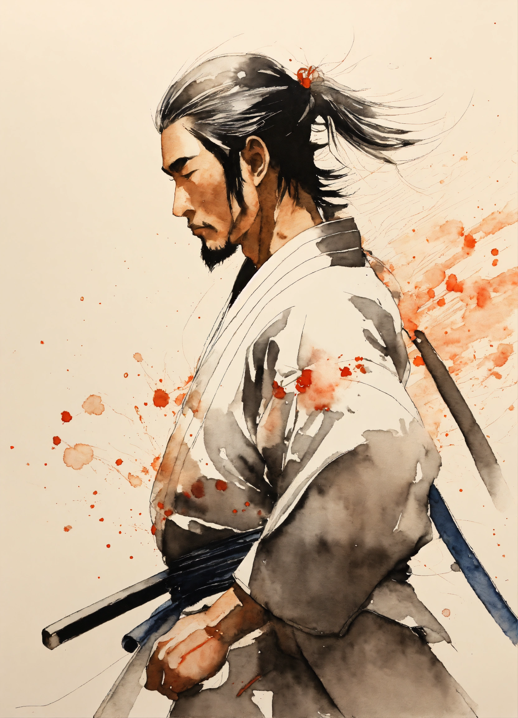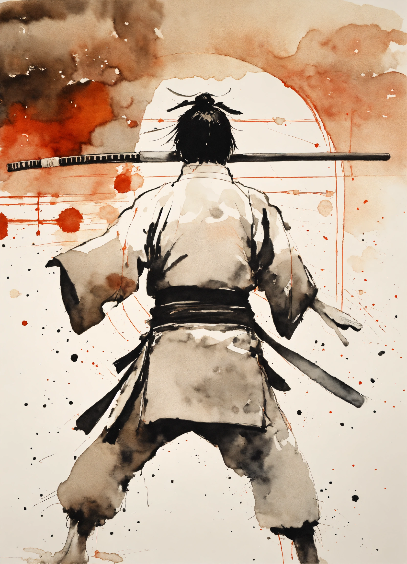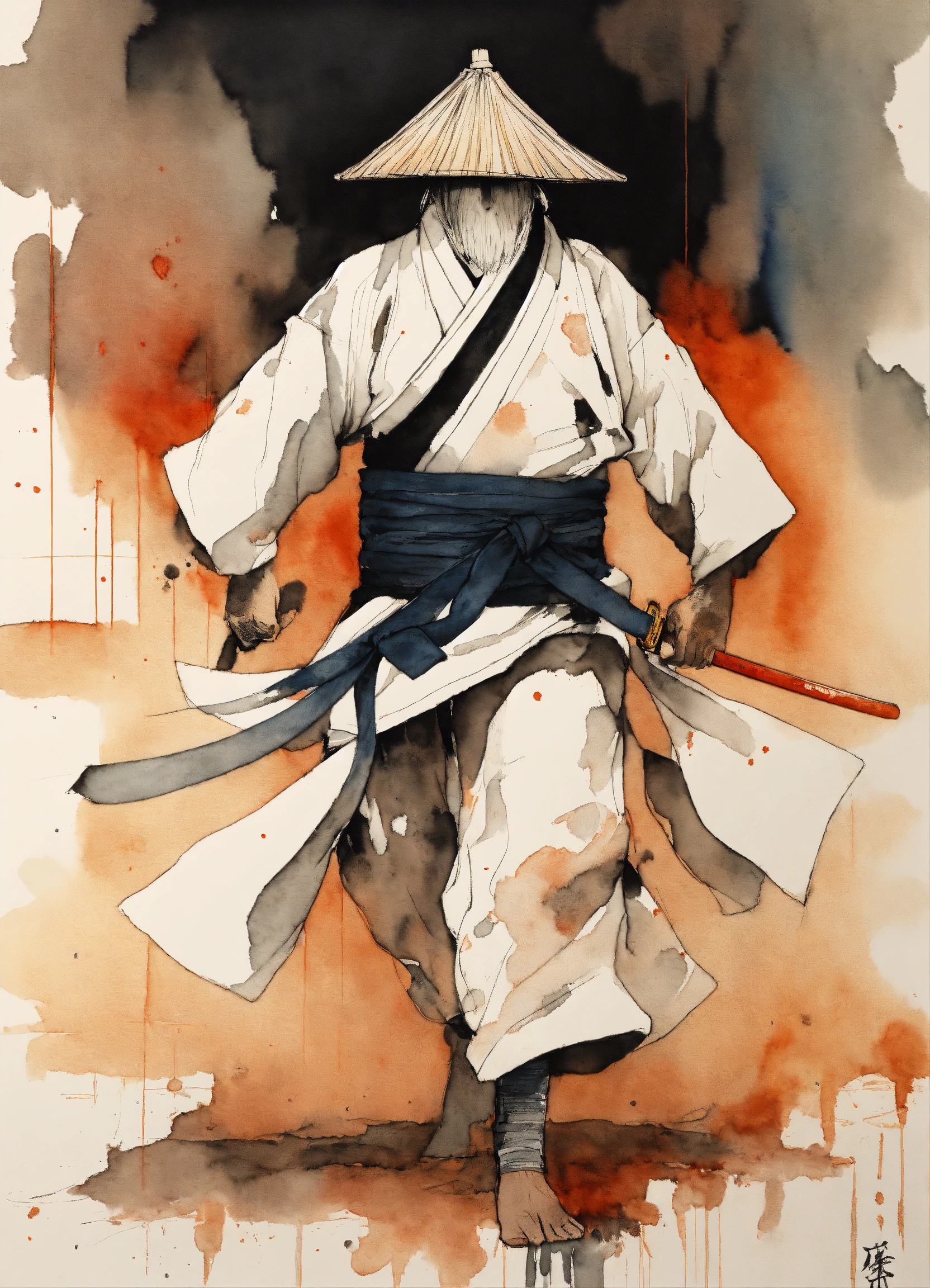 Front, close-up, minimalistic ink drawing style, vanishing point on white paper, one line artwork by tsutomu nihei portraying a karateka in the middle of nowhere, dynamic design, watercolor splash art incorporated as complimentary elements samurai