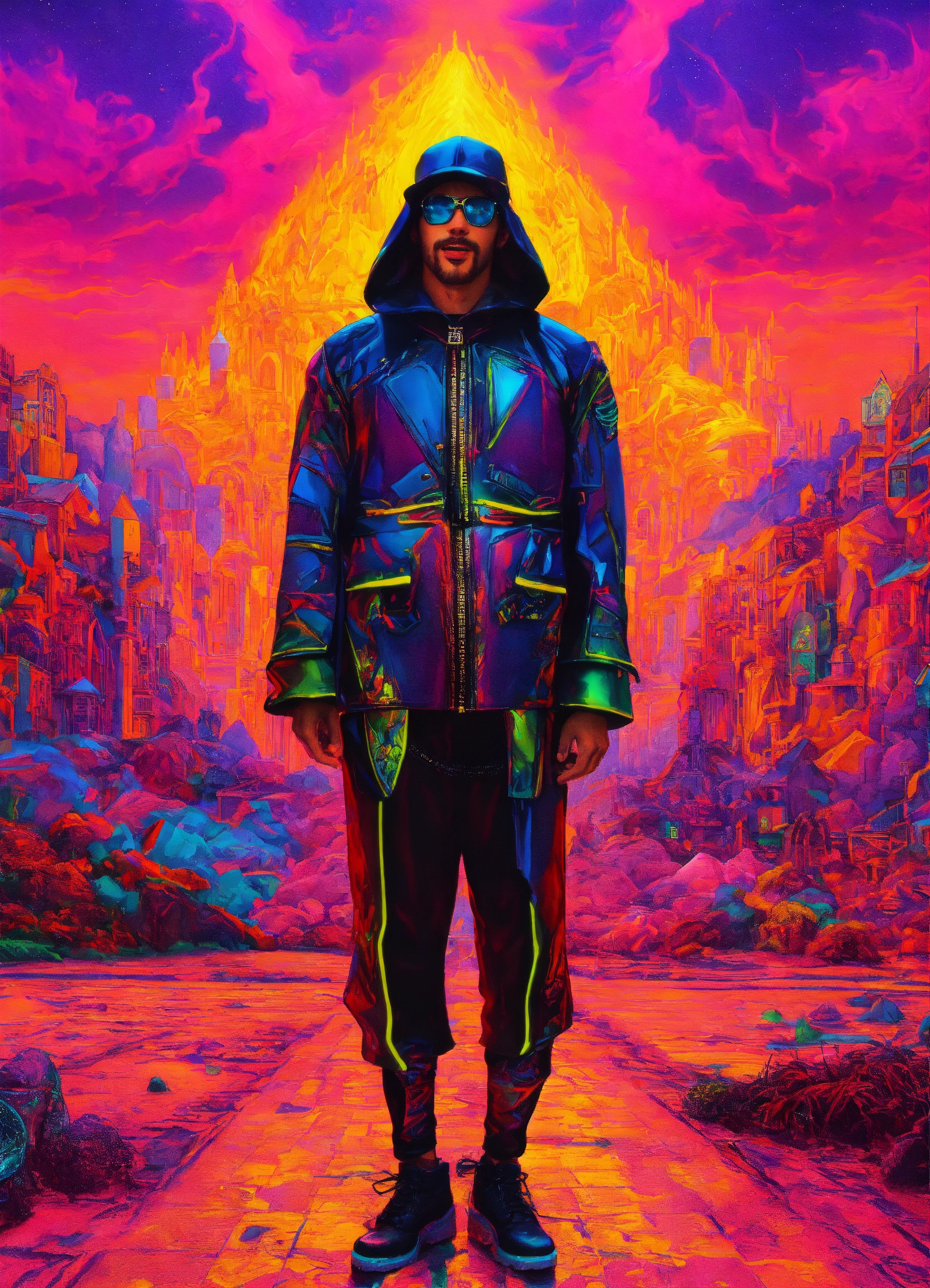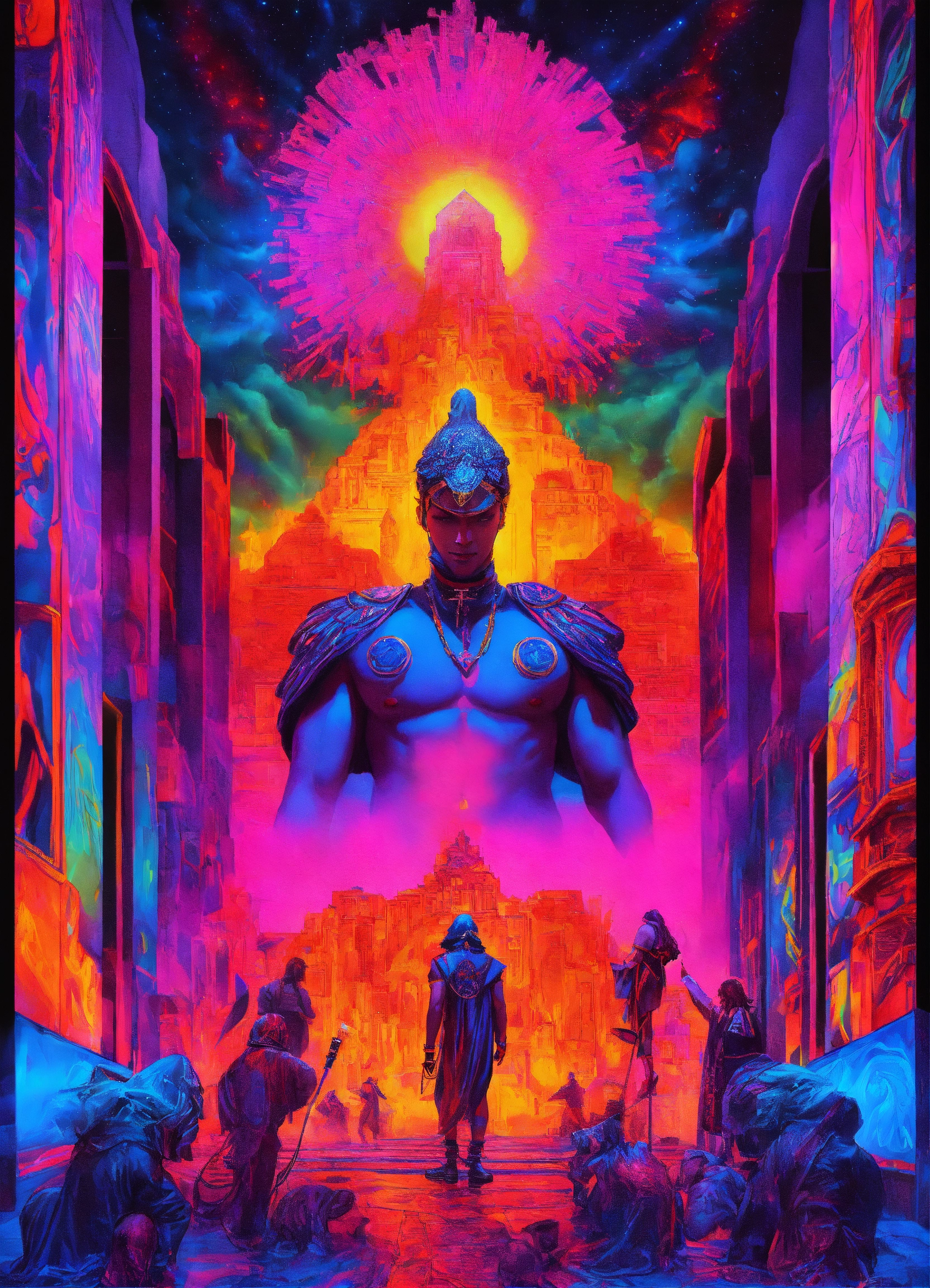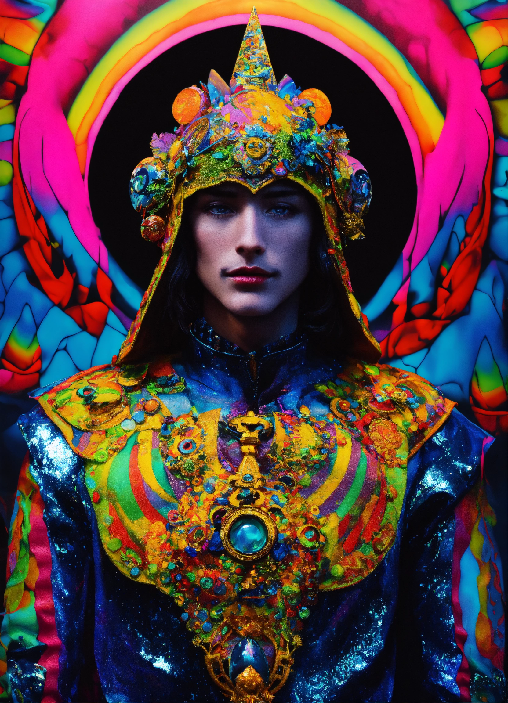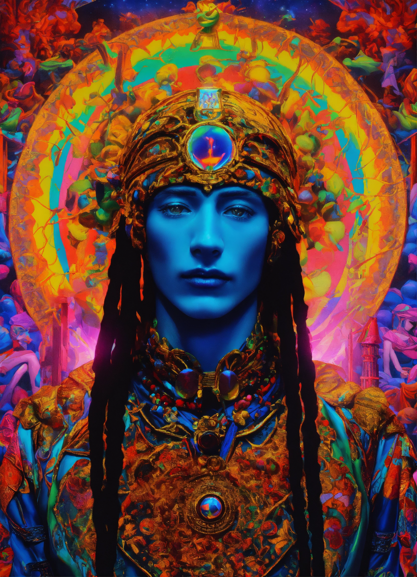 Hyperion holy mountain the movie photorealistic 3d 35 mm portrait of gothic ghetto street wear prada male tantric warrior man ai god dmt laughing psytrance grimes punk rock anime haute couture costume, baptized in a cosmic alex grey painting in a dmt black laser light neon black glitter holographic techno club art by salvador dali and holy mountain the movie.