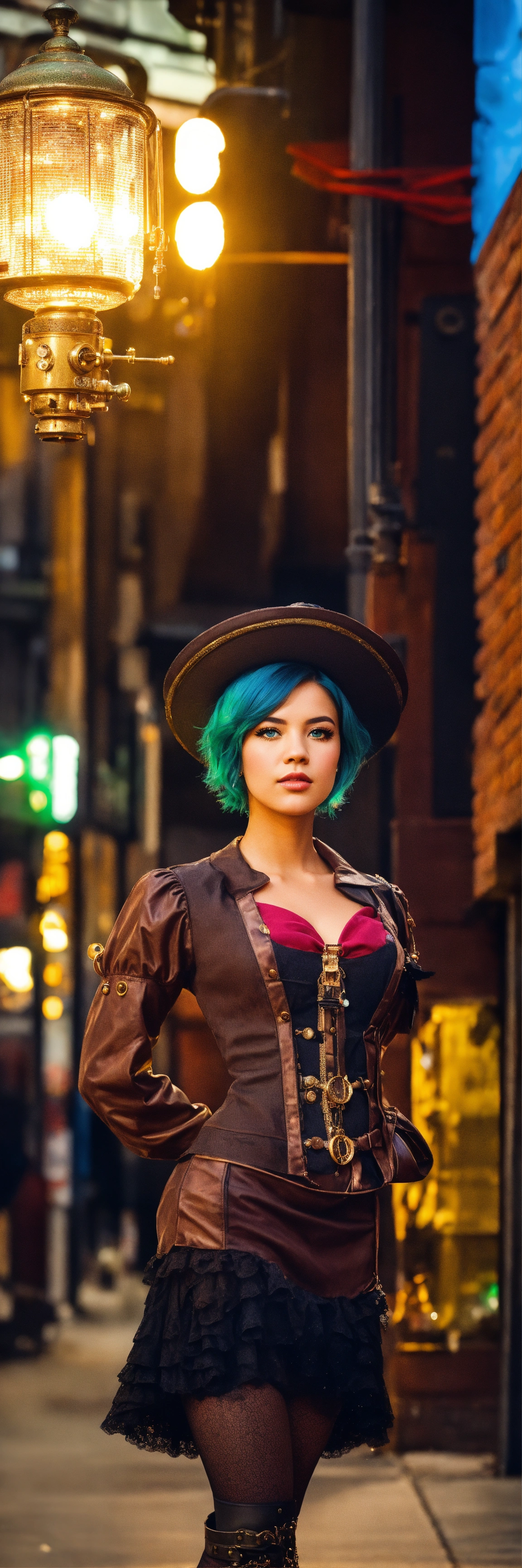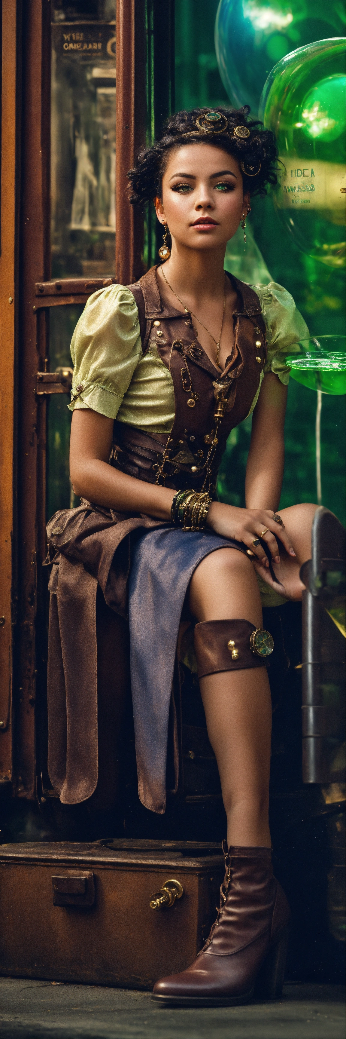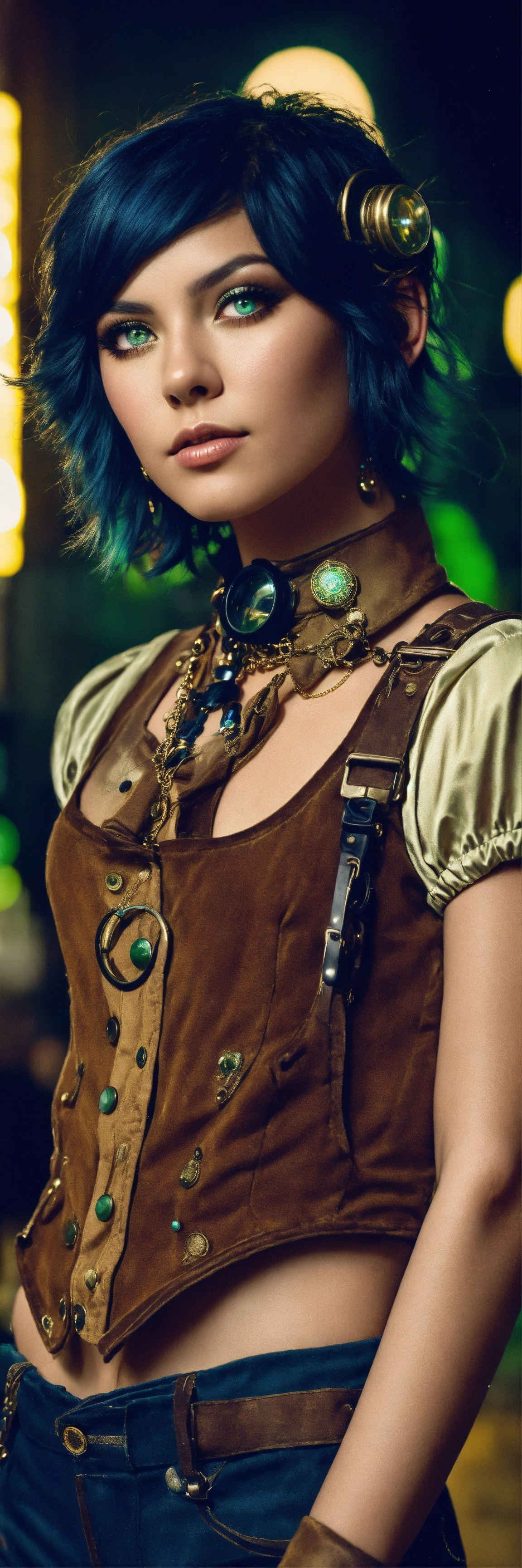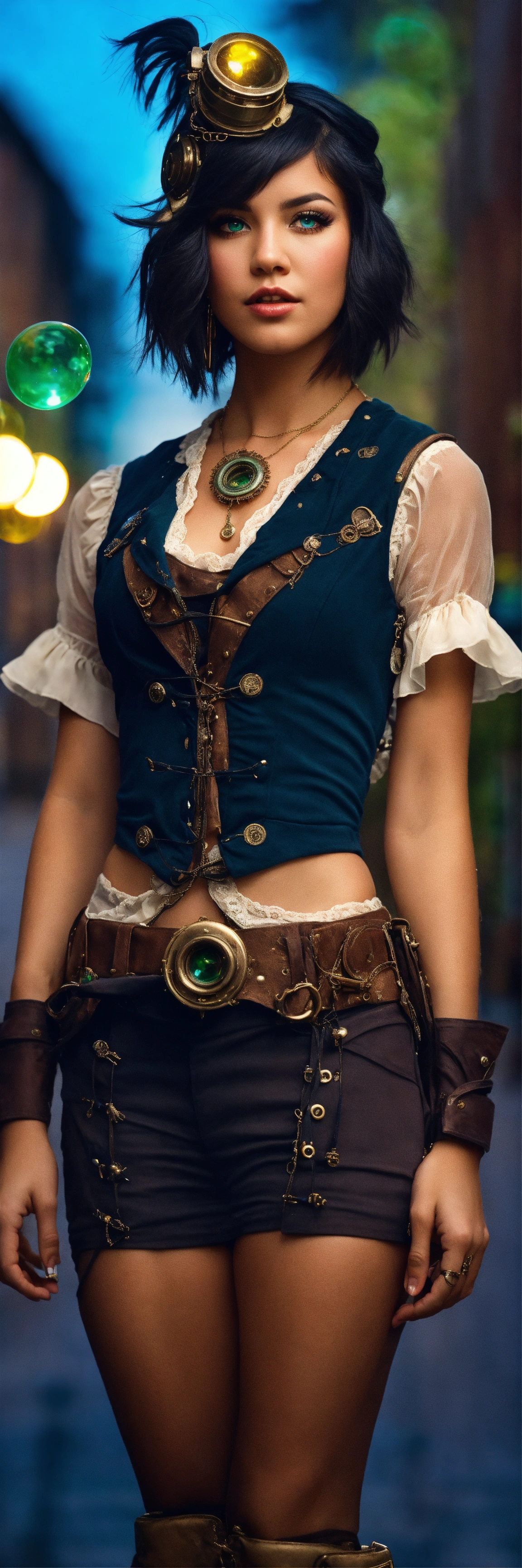 The portrait of american idol girl, eyes big, short and dark blue and beautiful strait hair, standing still, dressed in a steampunk and farwest environnement, staring into the camera with clear green eyes, bubbles in the air, extremely detailed photographic image, grained image, beautifully composed, extremely detailed street image, perfectly arranged street portrait, flashy light, posing like a dancer