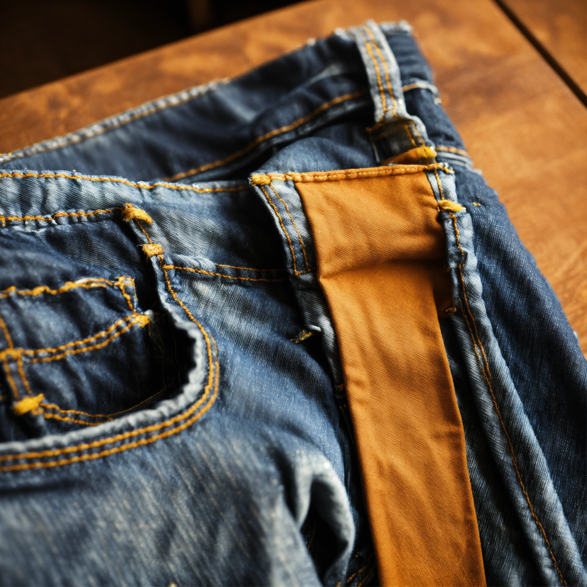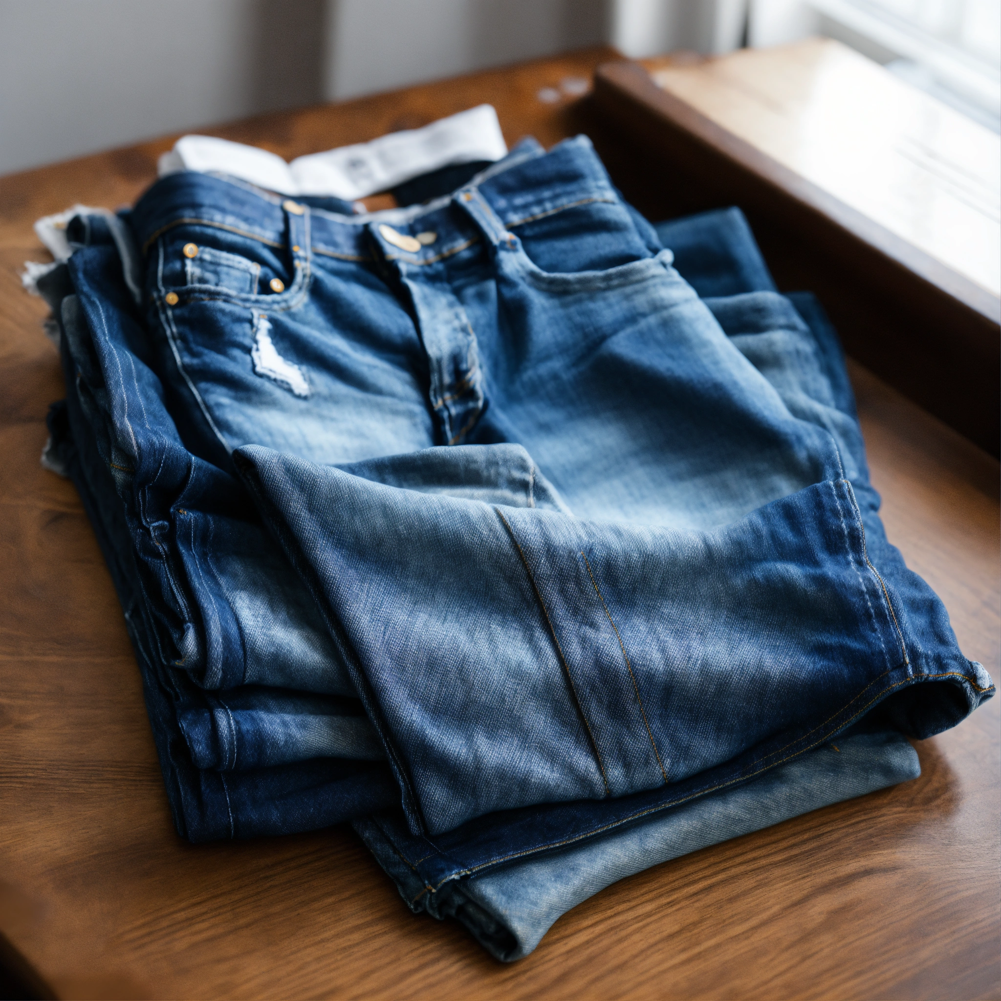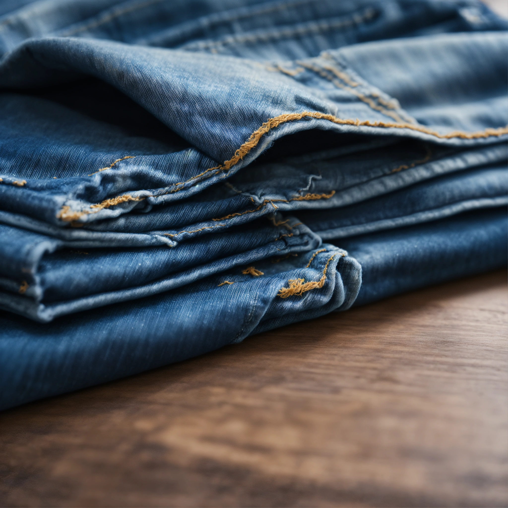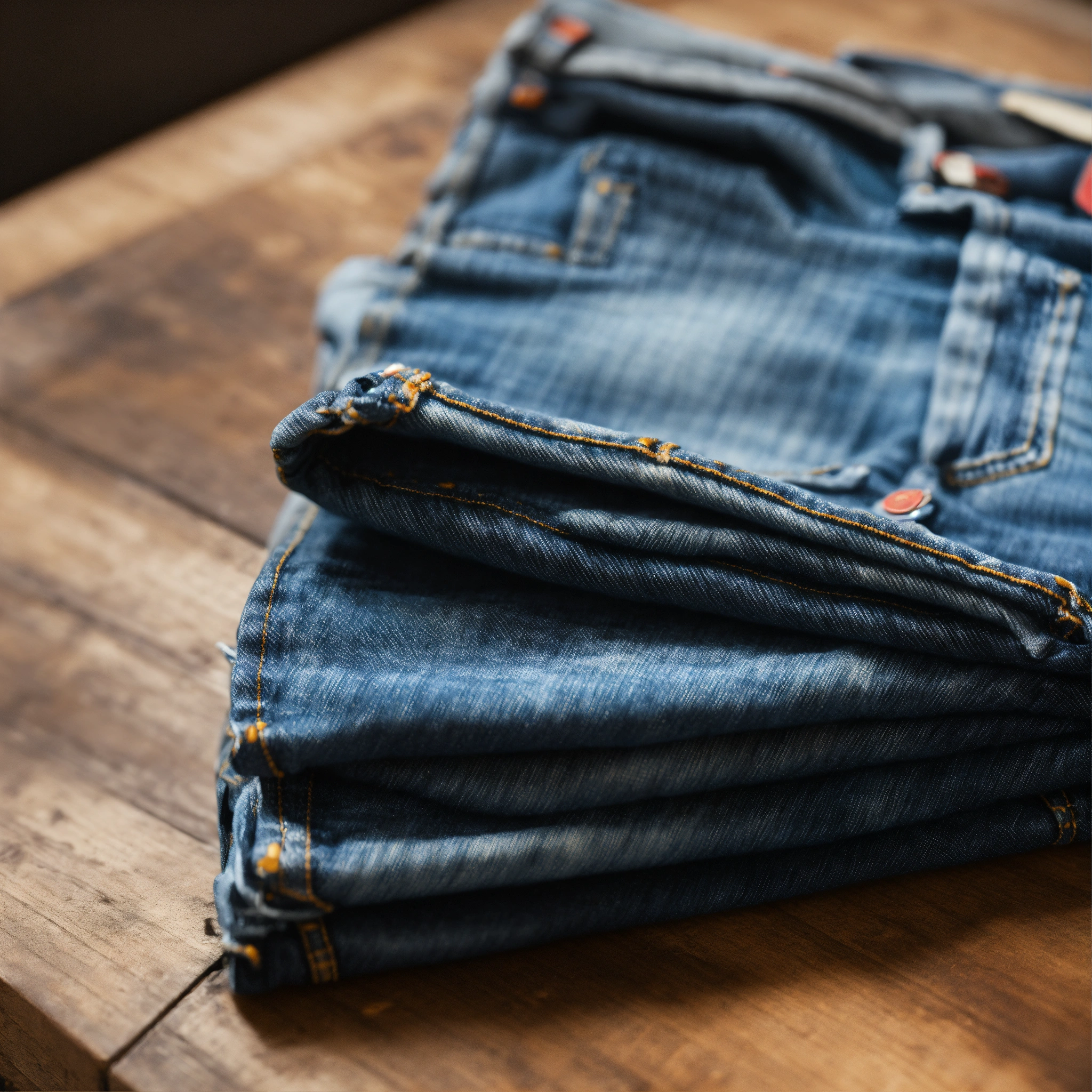 A photo of a pair of blue jeans. the jeans are new, with no stains or tears. the jeans are folded neatly on a table.