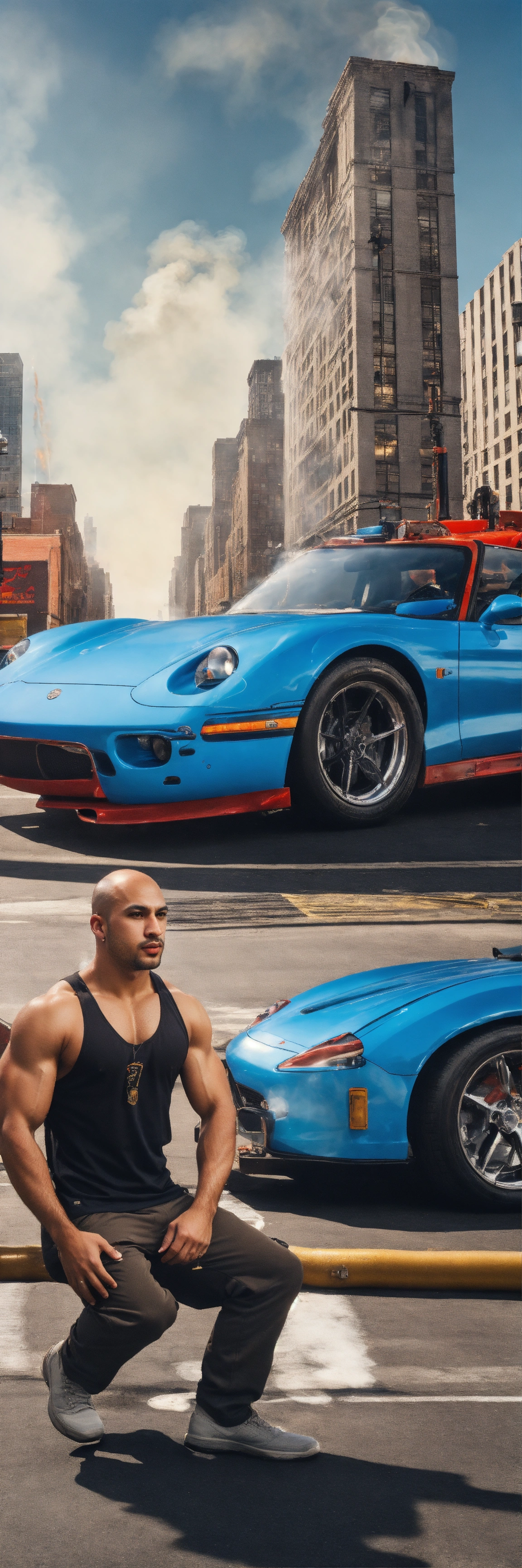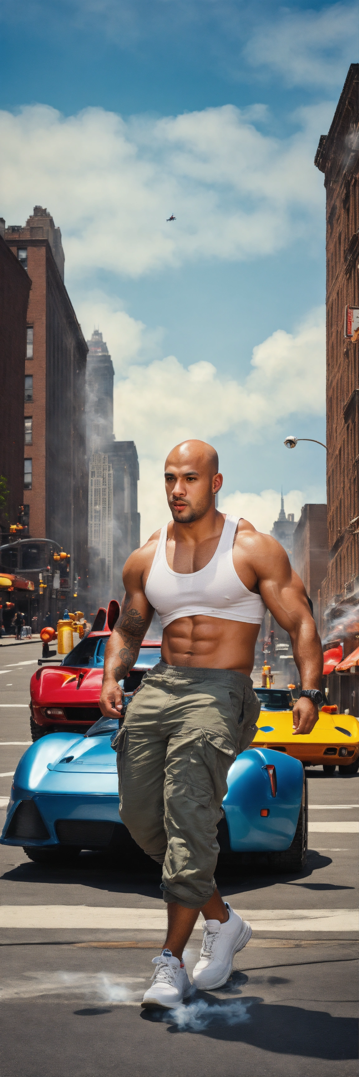 Realistic photo of a muscular and bald mixed race person with a tank top sports cars blue sky buildings new york city smoke fire hydrant restaurant planes in the sky