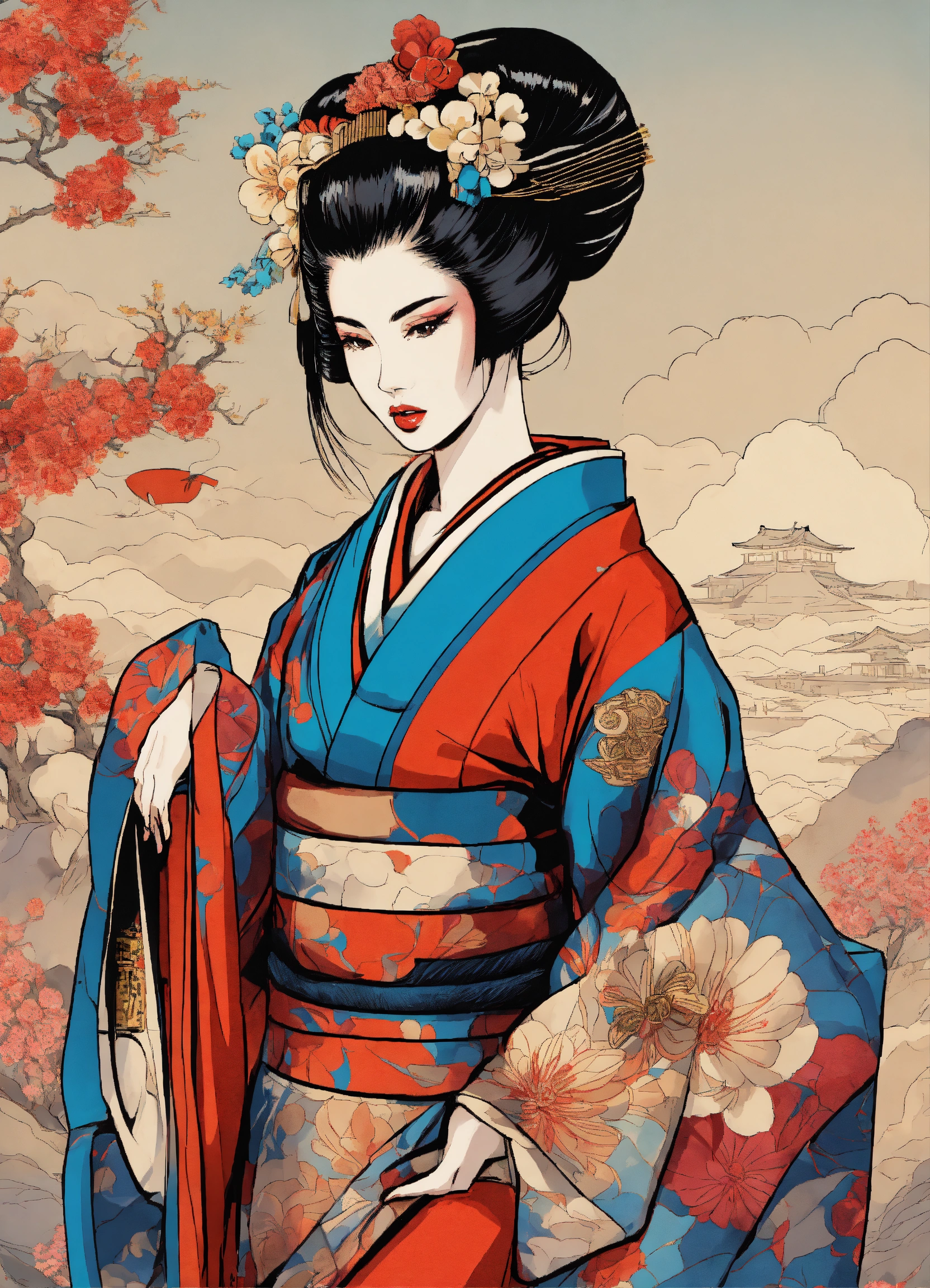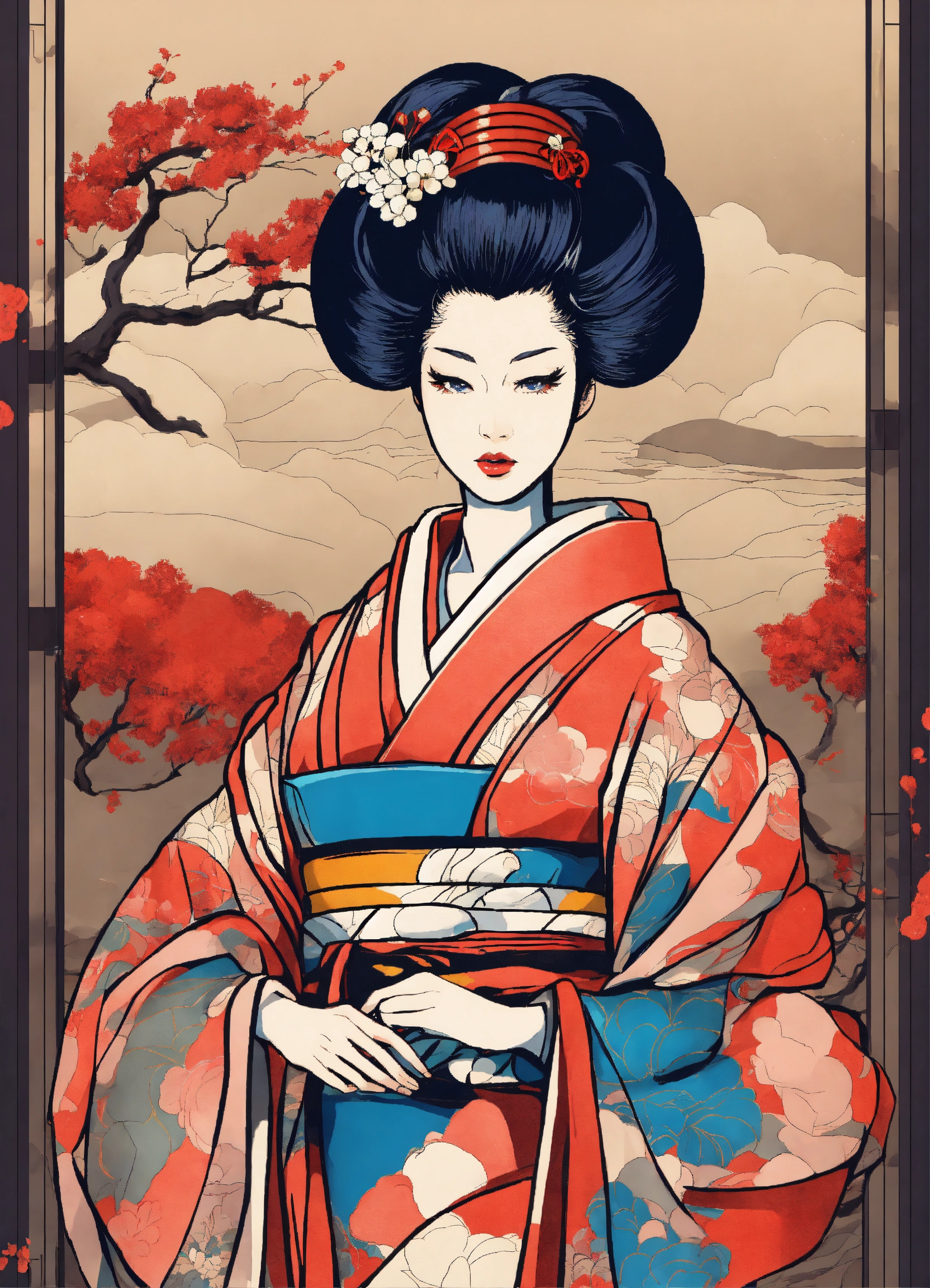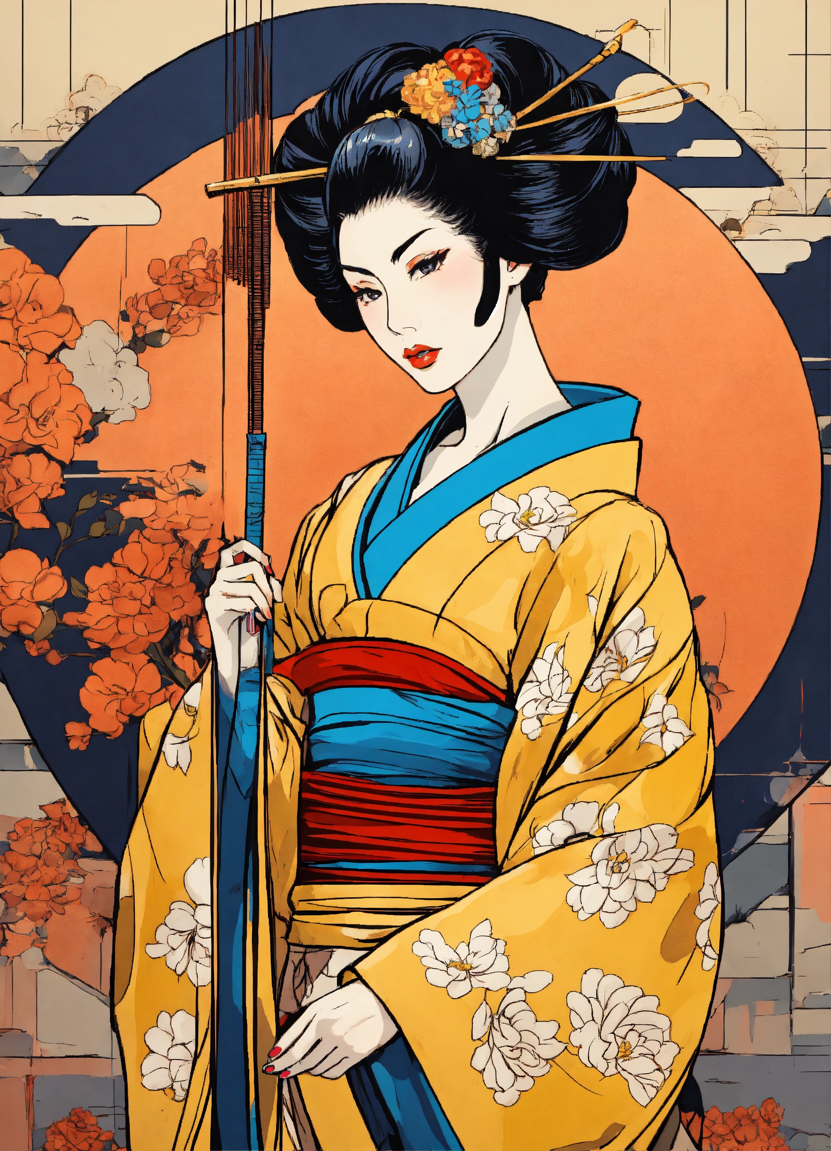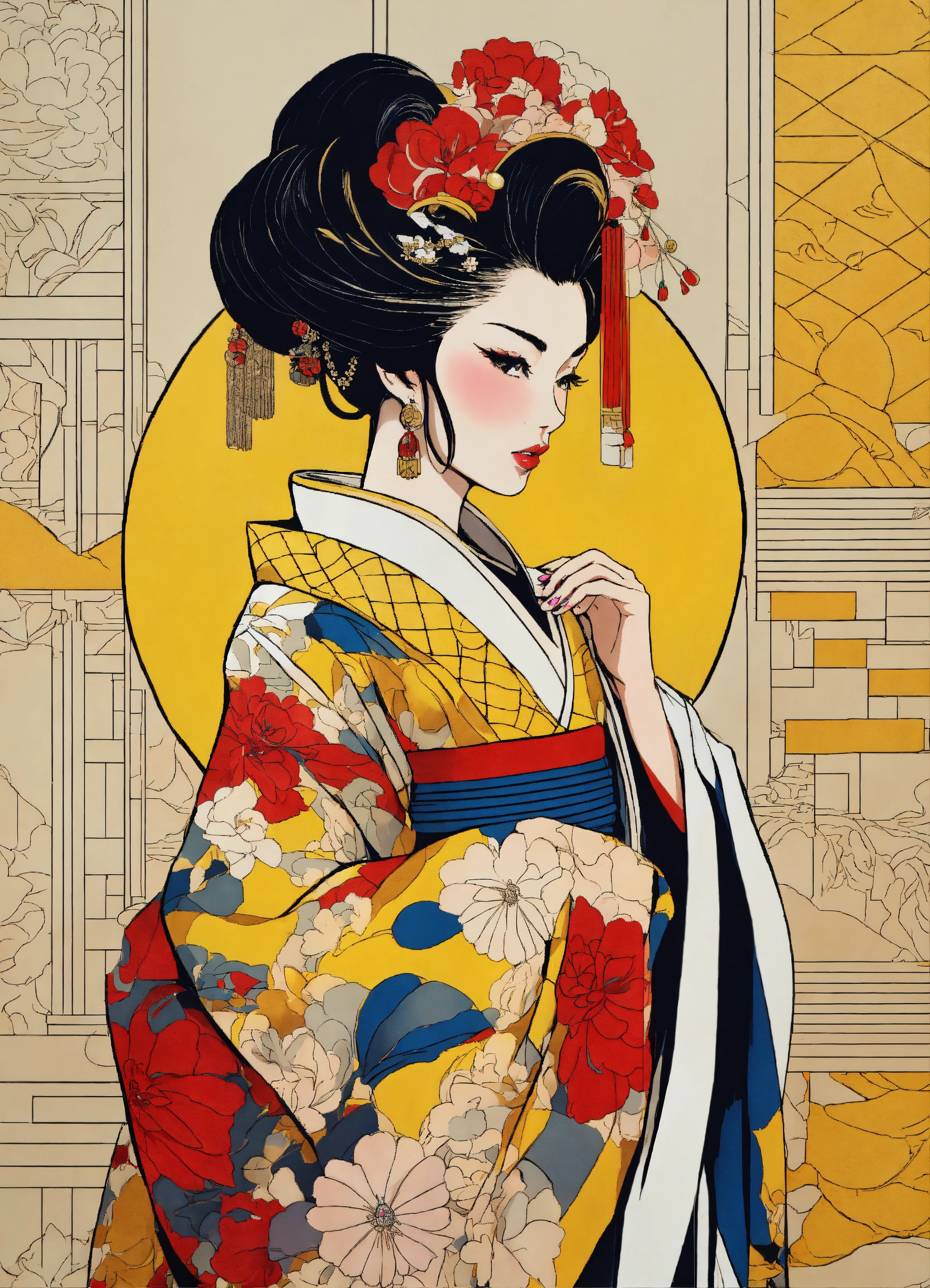 Full body street art japanese geisha in stylish haute couture outfit in the style of 80's vintage anime, surrealism, roy lichtenstein style. detailed line art. fine details. fine jewelry. neutral background