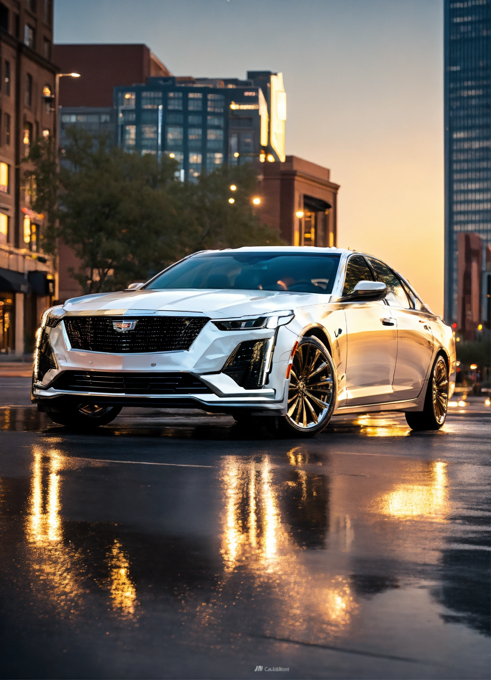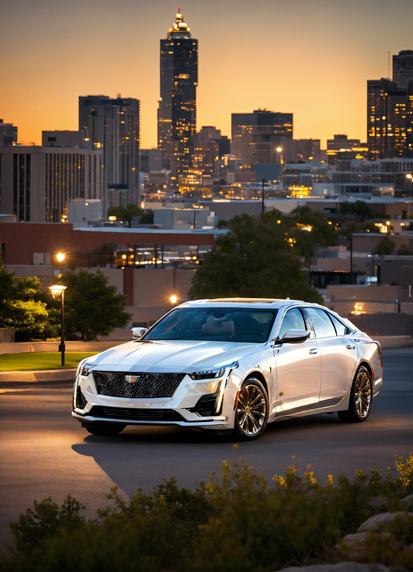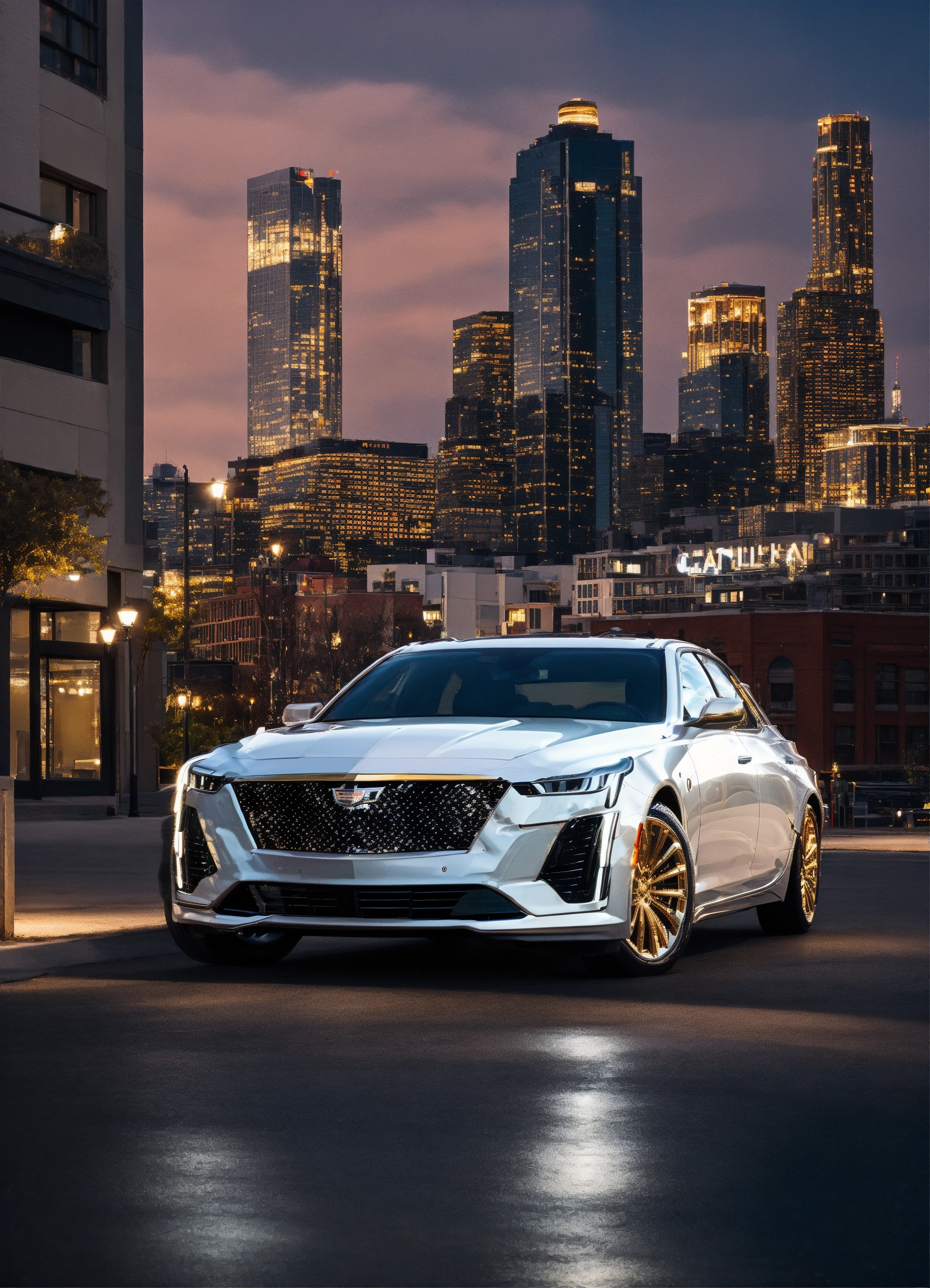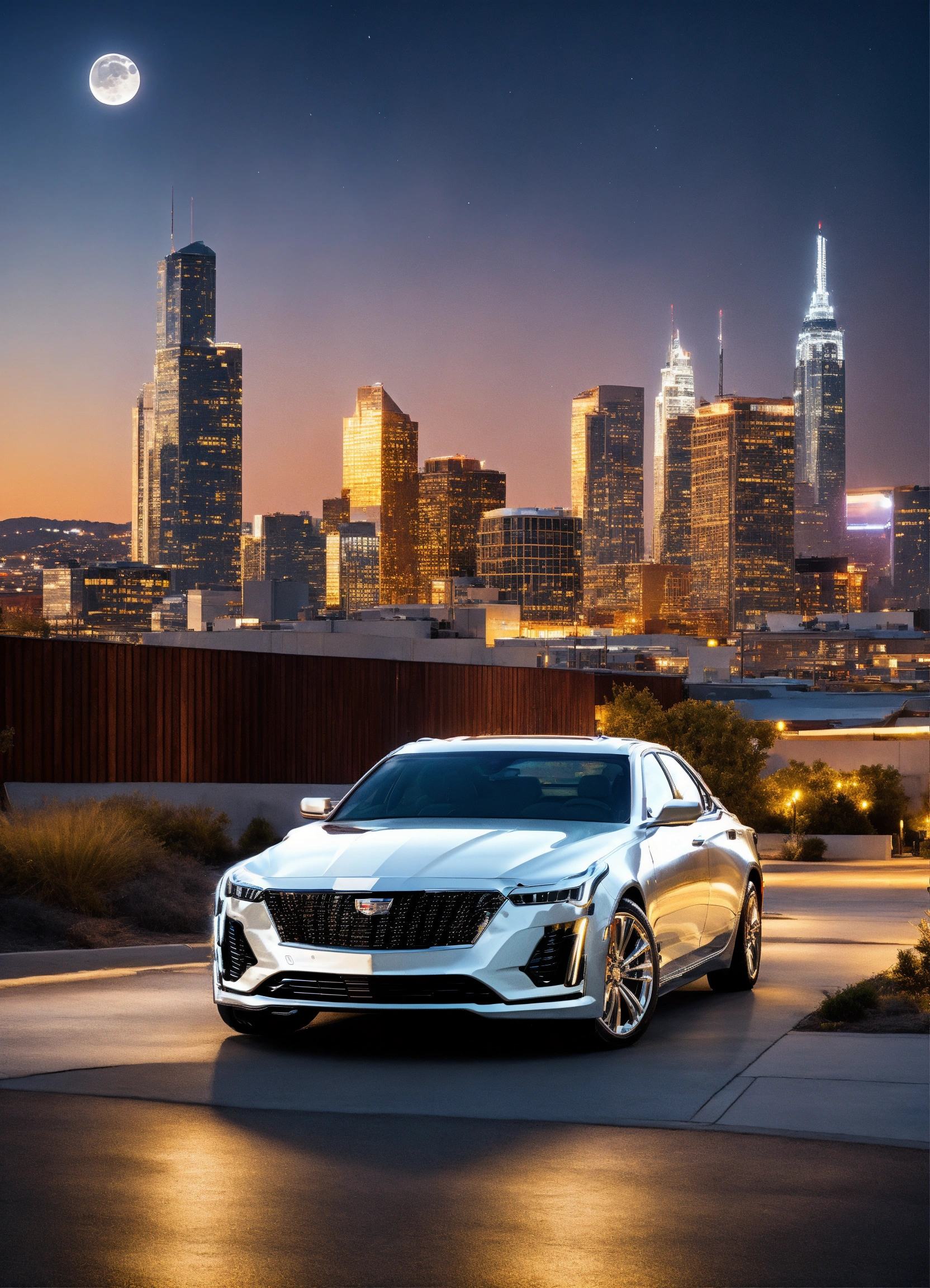 2023 cadillac ct5 white with gold trim and downtown background with moonlight landscape