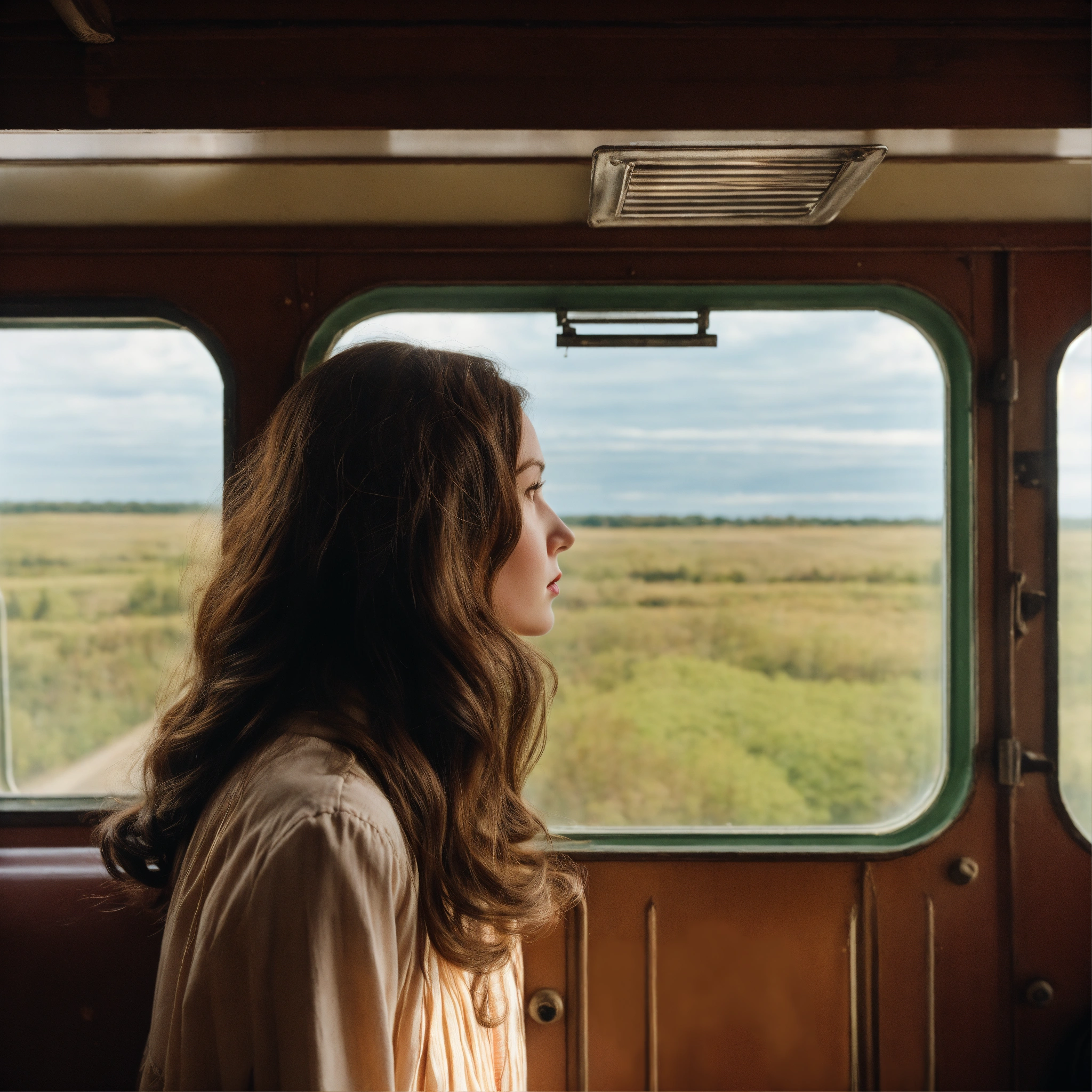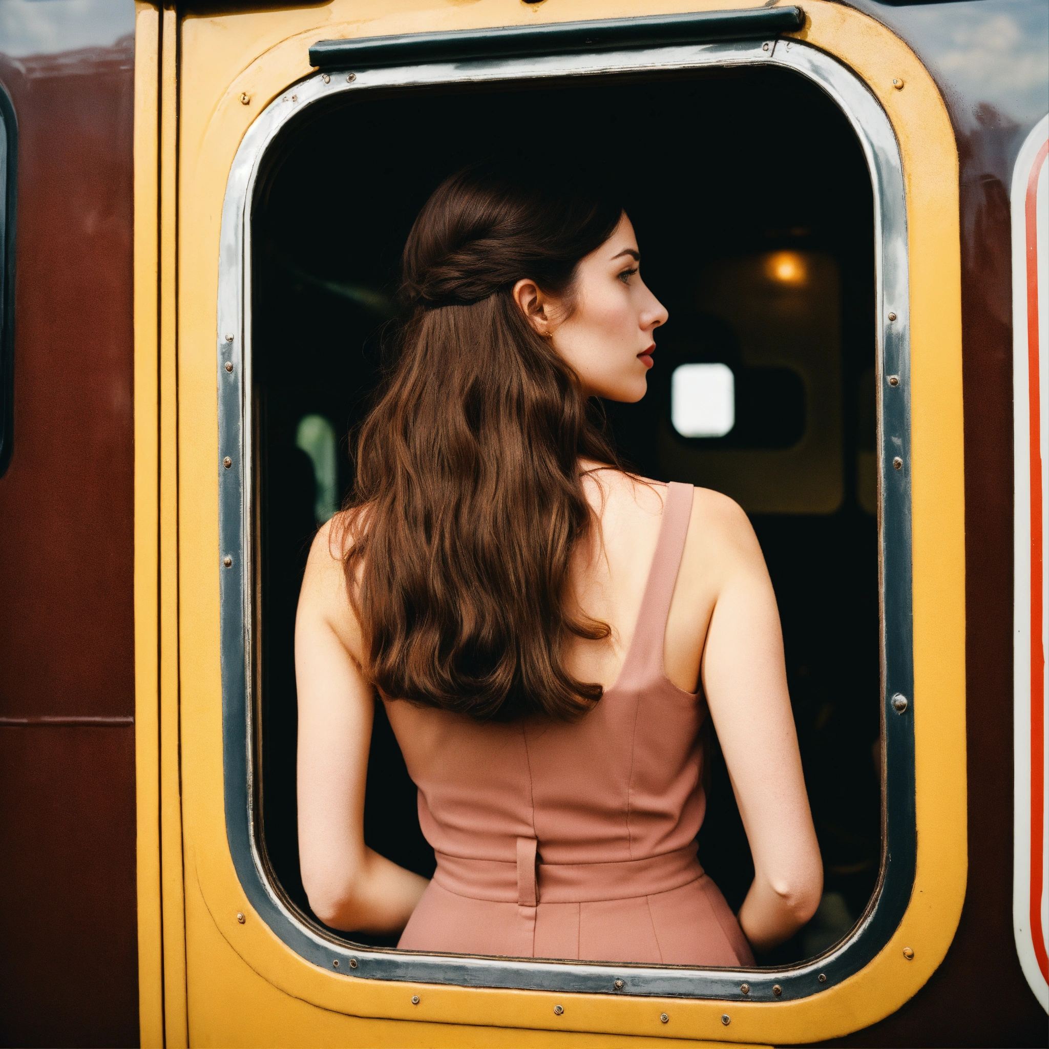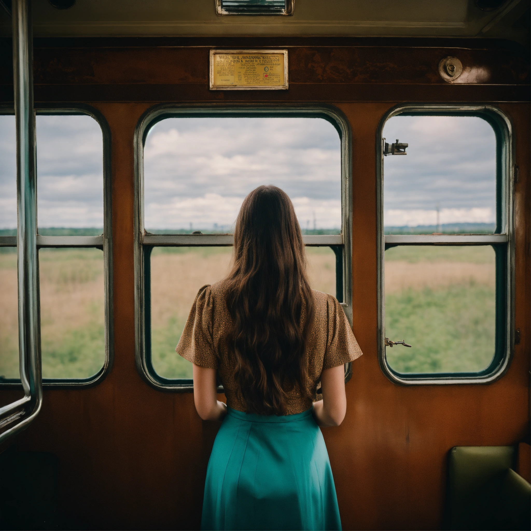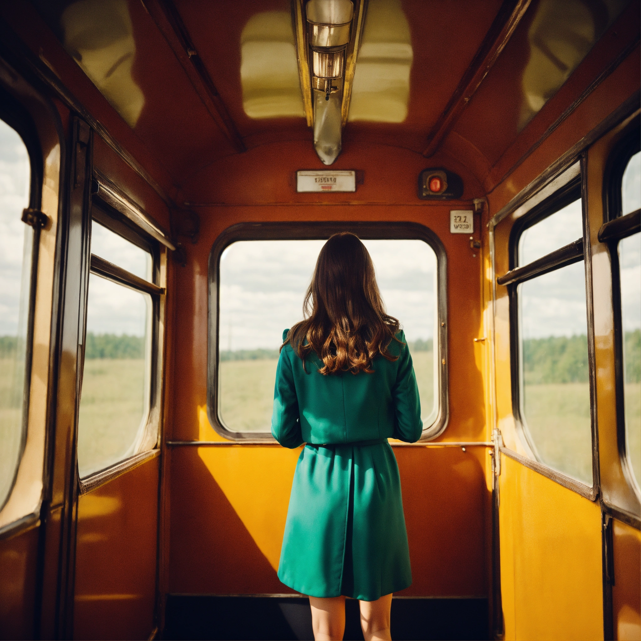 A photograph of a woman with long brown hair looking out of a vintage train window, wes anderson colour style, wide format, rear view