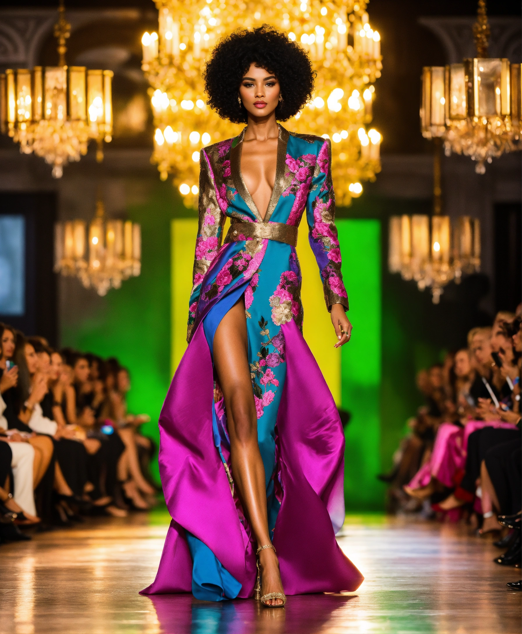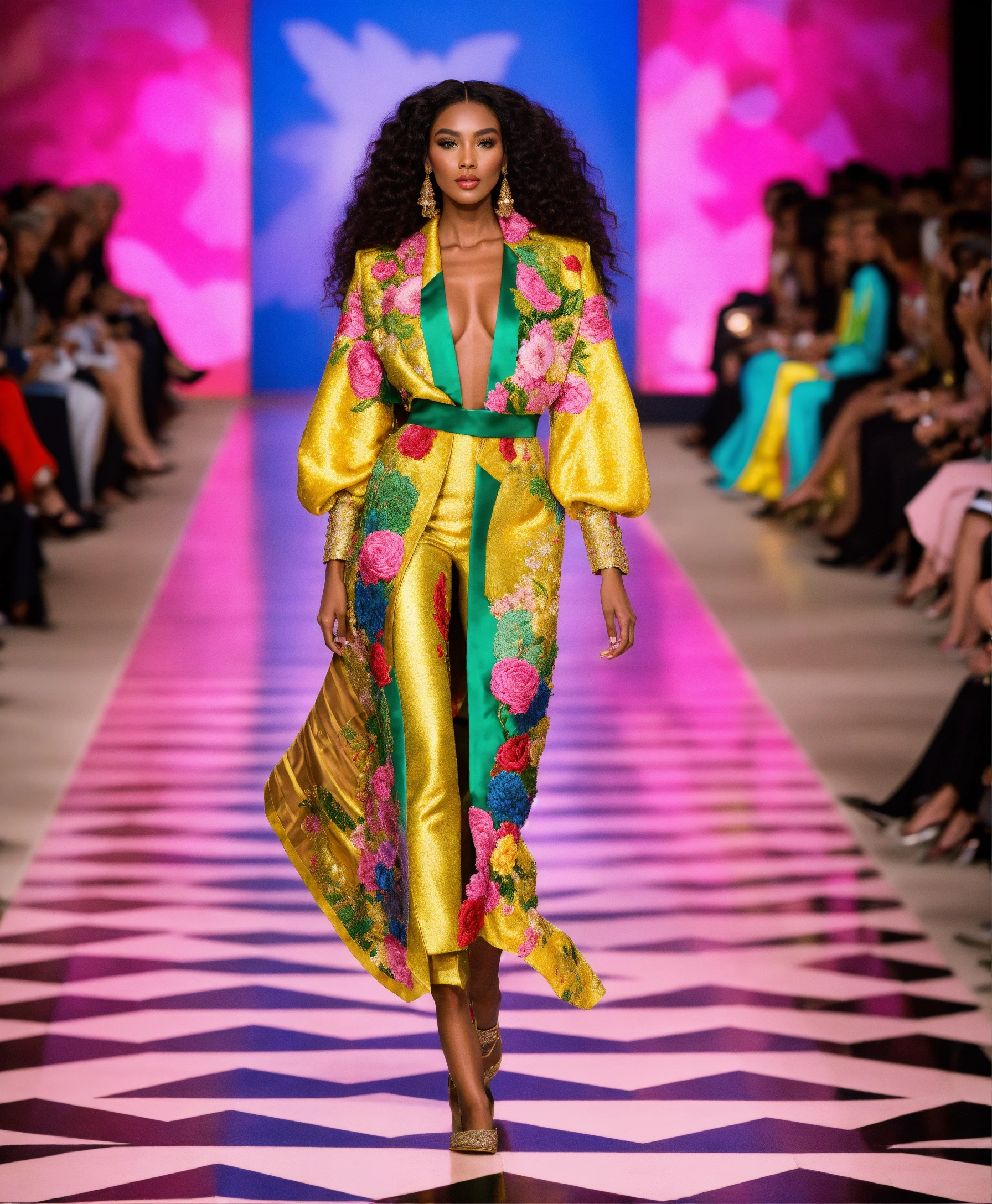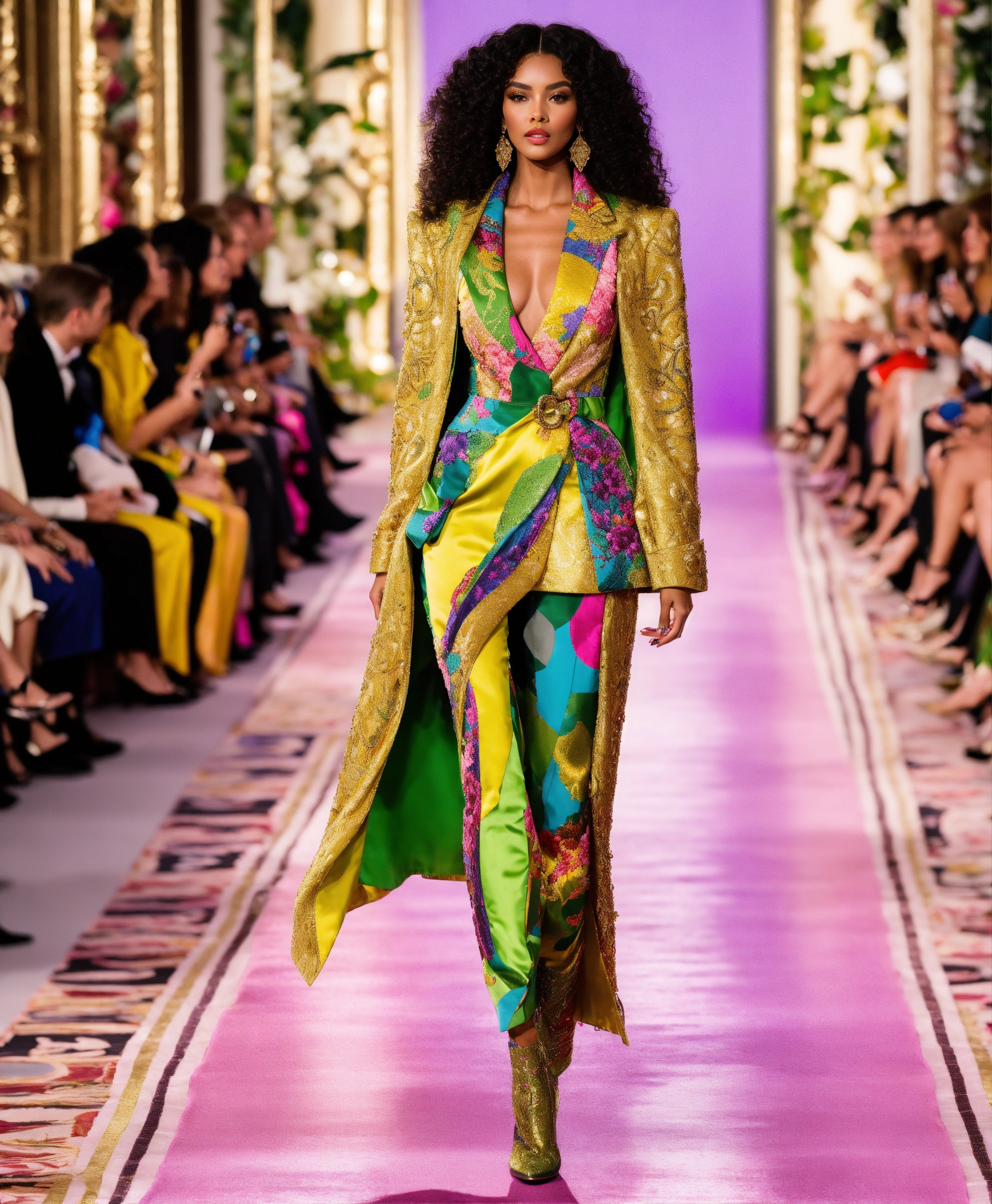Ultra realistic full body photo of a stylish beautiful elegant supermodel voluminous wavy hair walking the runway modeling summer cruise designer wear brave, paris versailles details cutouts and gold geometric pattern floral structured tailored jacket pink gold green lilac peridot silver magenta lime fuchsia yellow blue black gray copper mauve bronze haute couture embroidered contrasting colors vivid intricate bold vibrant glamorous ultimate elegance beautiful luxurious awesome wealthy opulent exquisite resplendent sheen magnificent sublime 12k