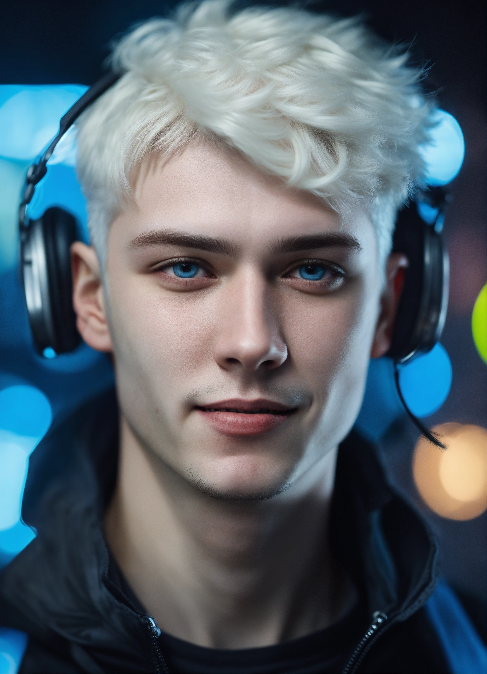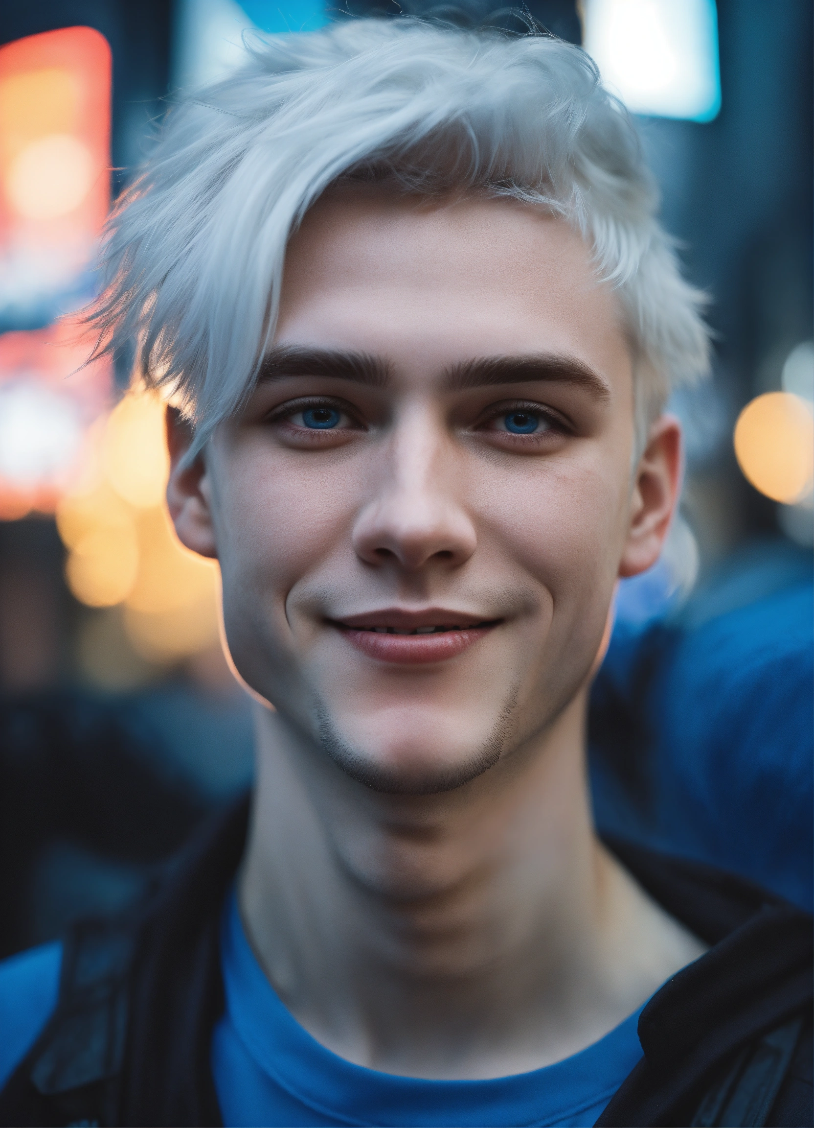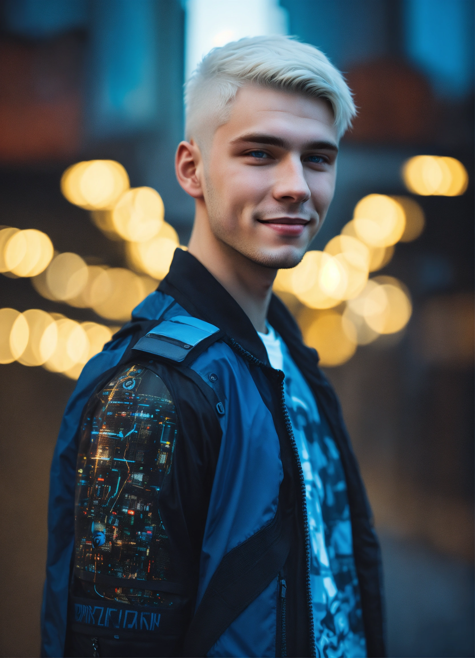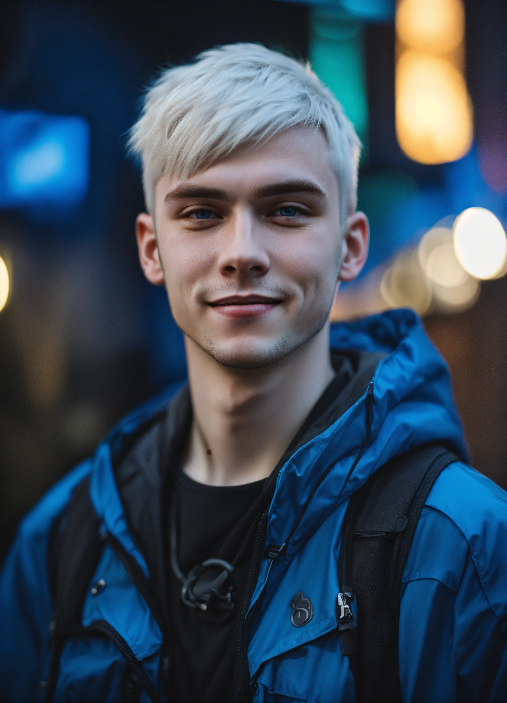 Highly detailed portrait of pale skin russian young man 27 years old, smiling, dimples, white short hair, blue eyes, cyberpunk, wearing blue and black techwear, cartoon realism, black, grunge aesthetic!!! bokeh