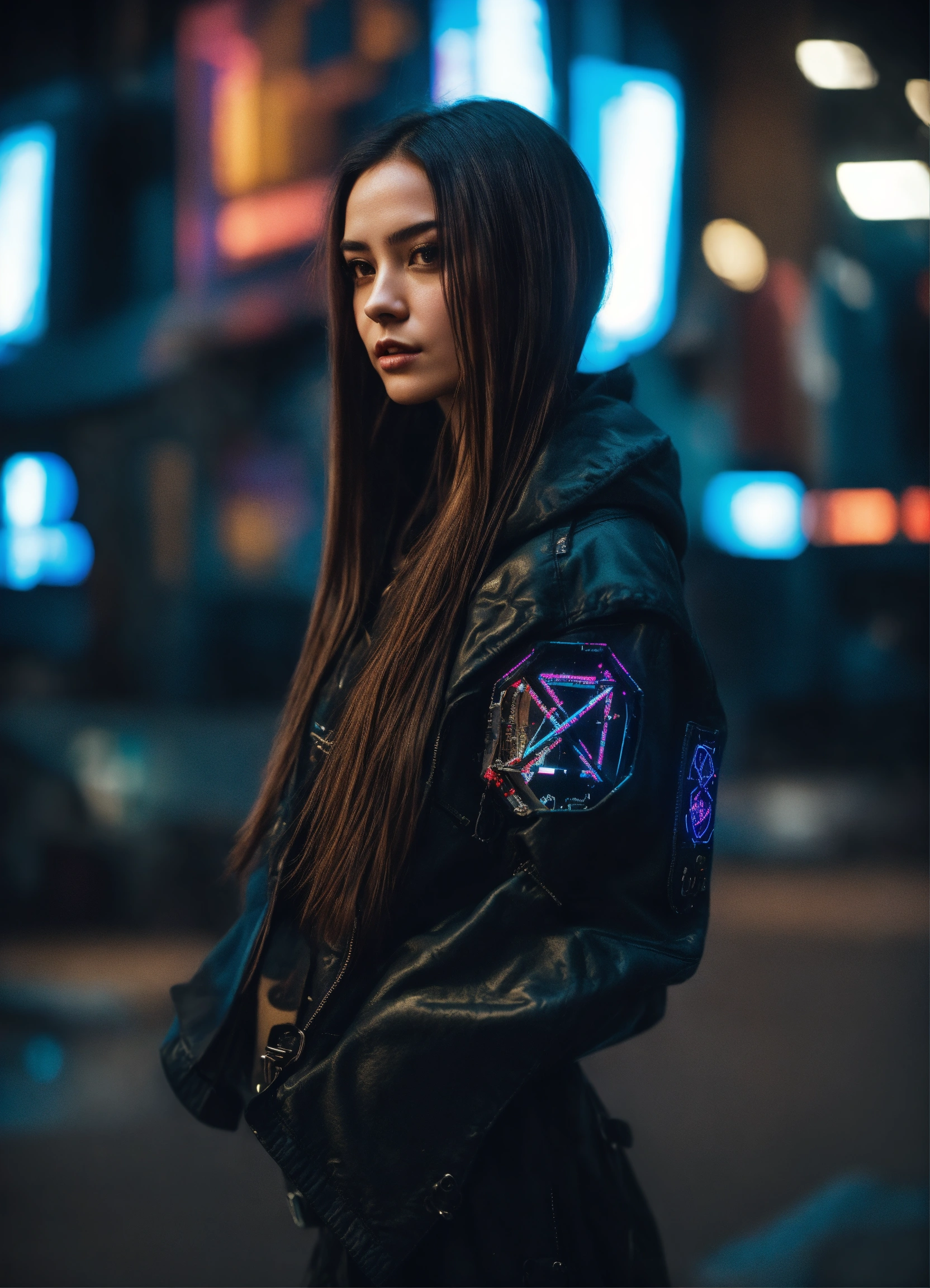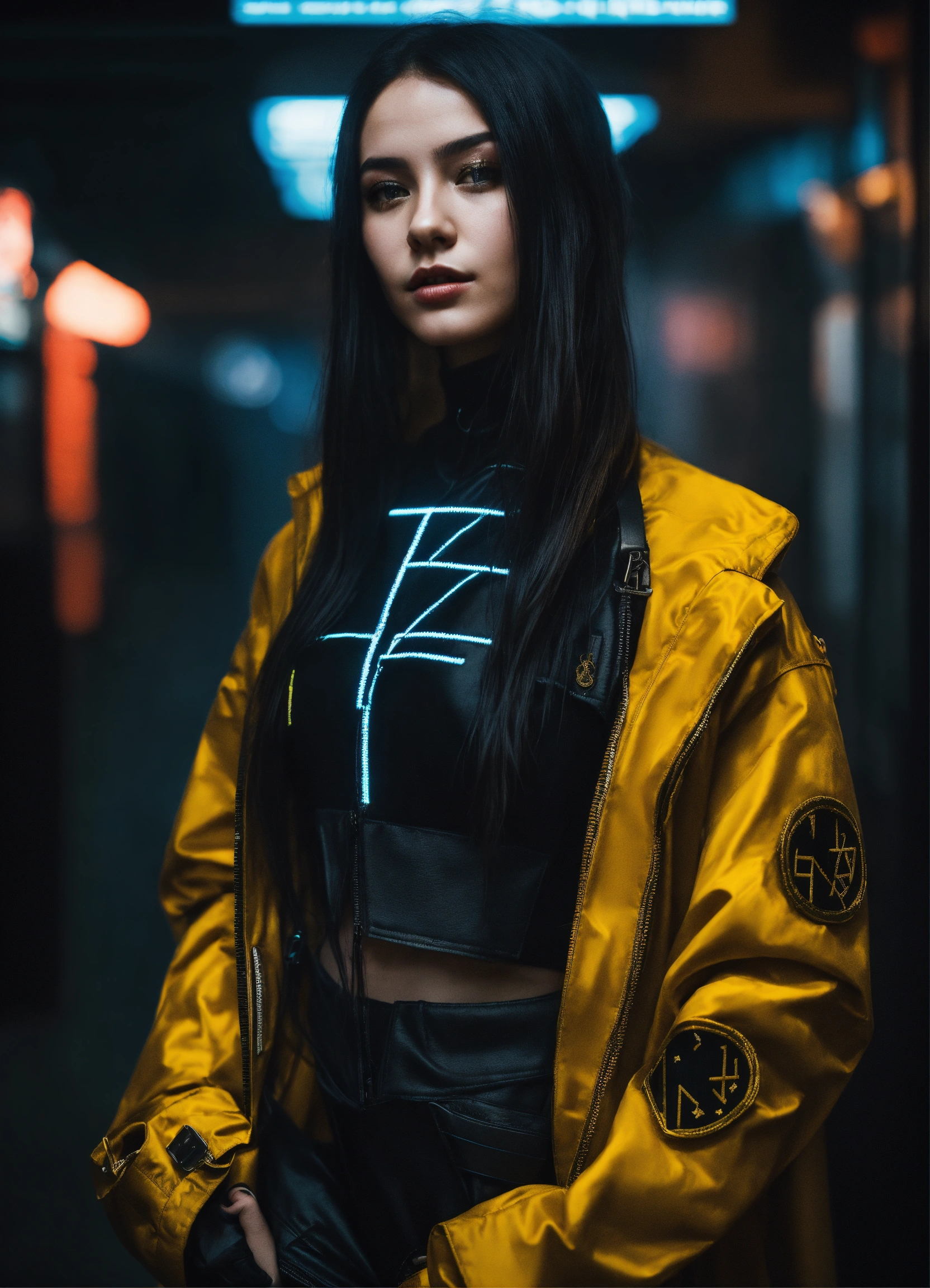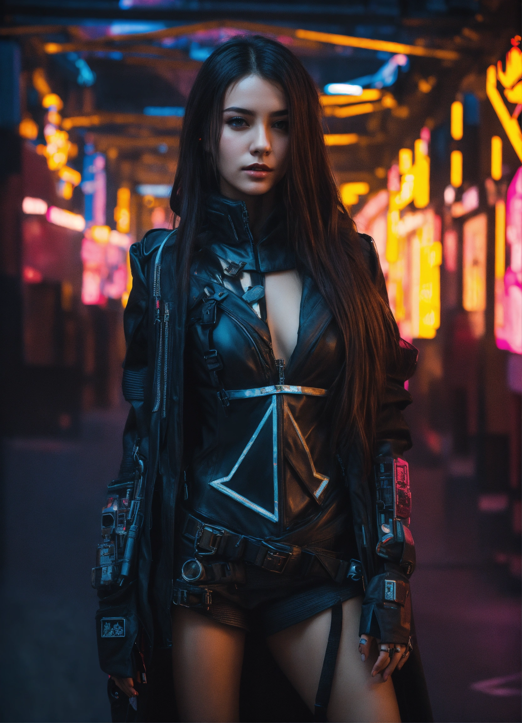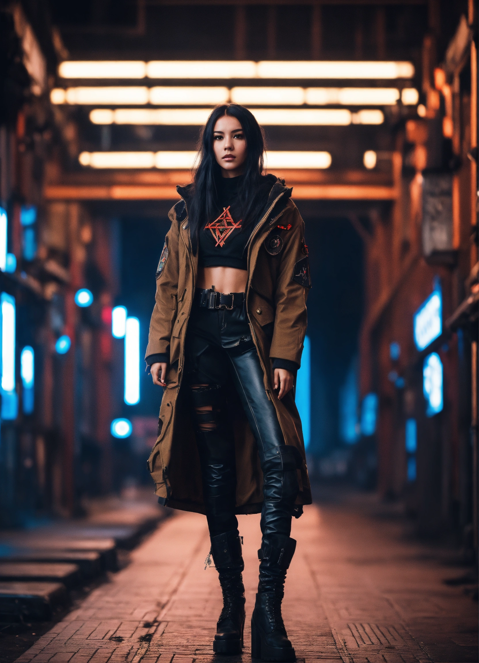 Cyberpunk style, fashion beautiful european girl on cyberpunk, cyberpunk style, cyberpank city, add coat of arms hexagram, black background, brown eyes, black hair, long hair, full body