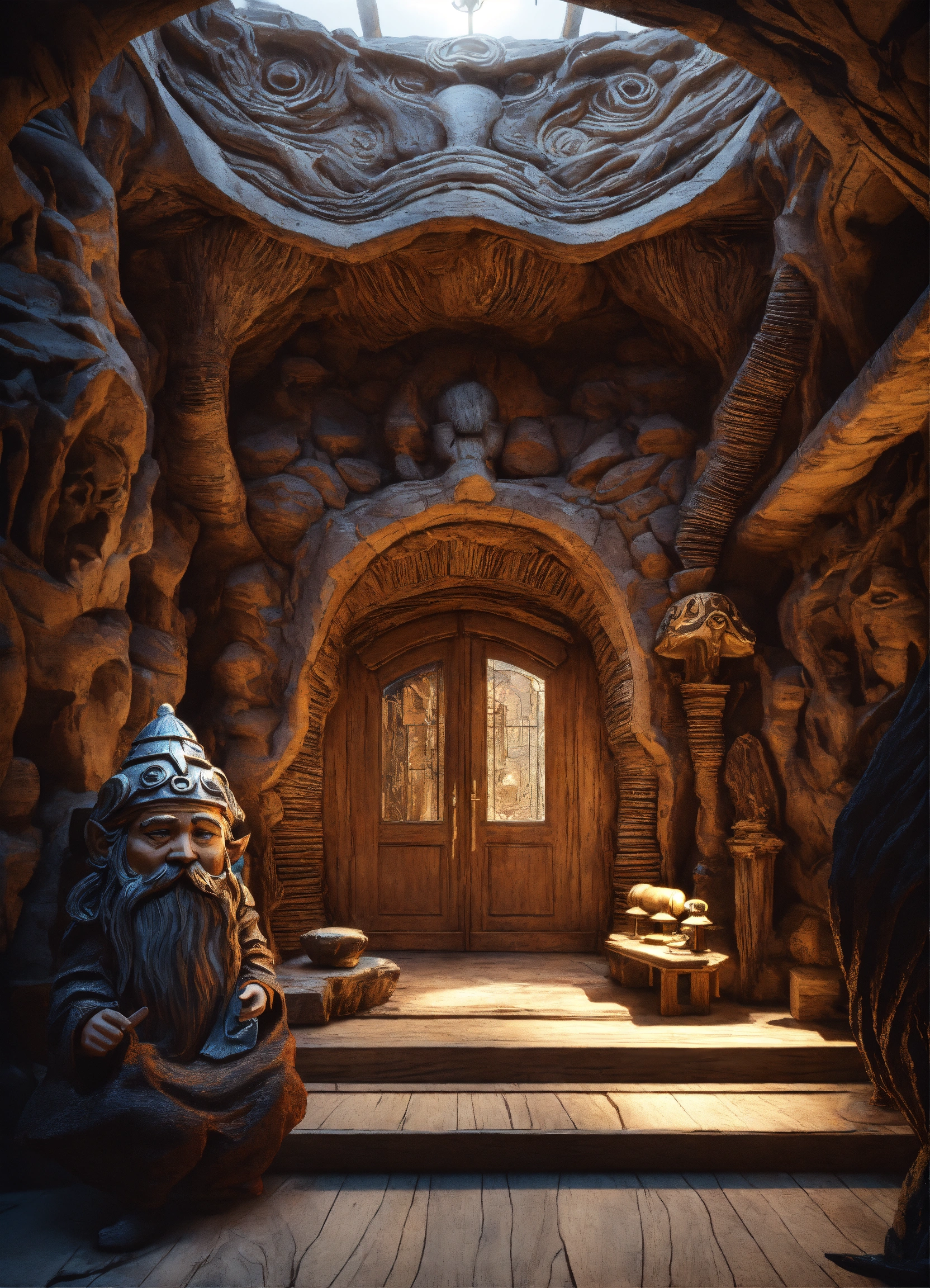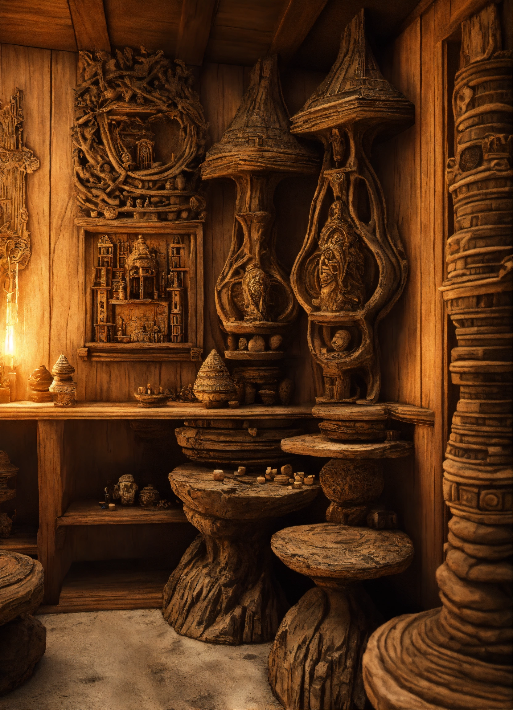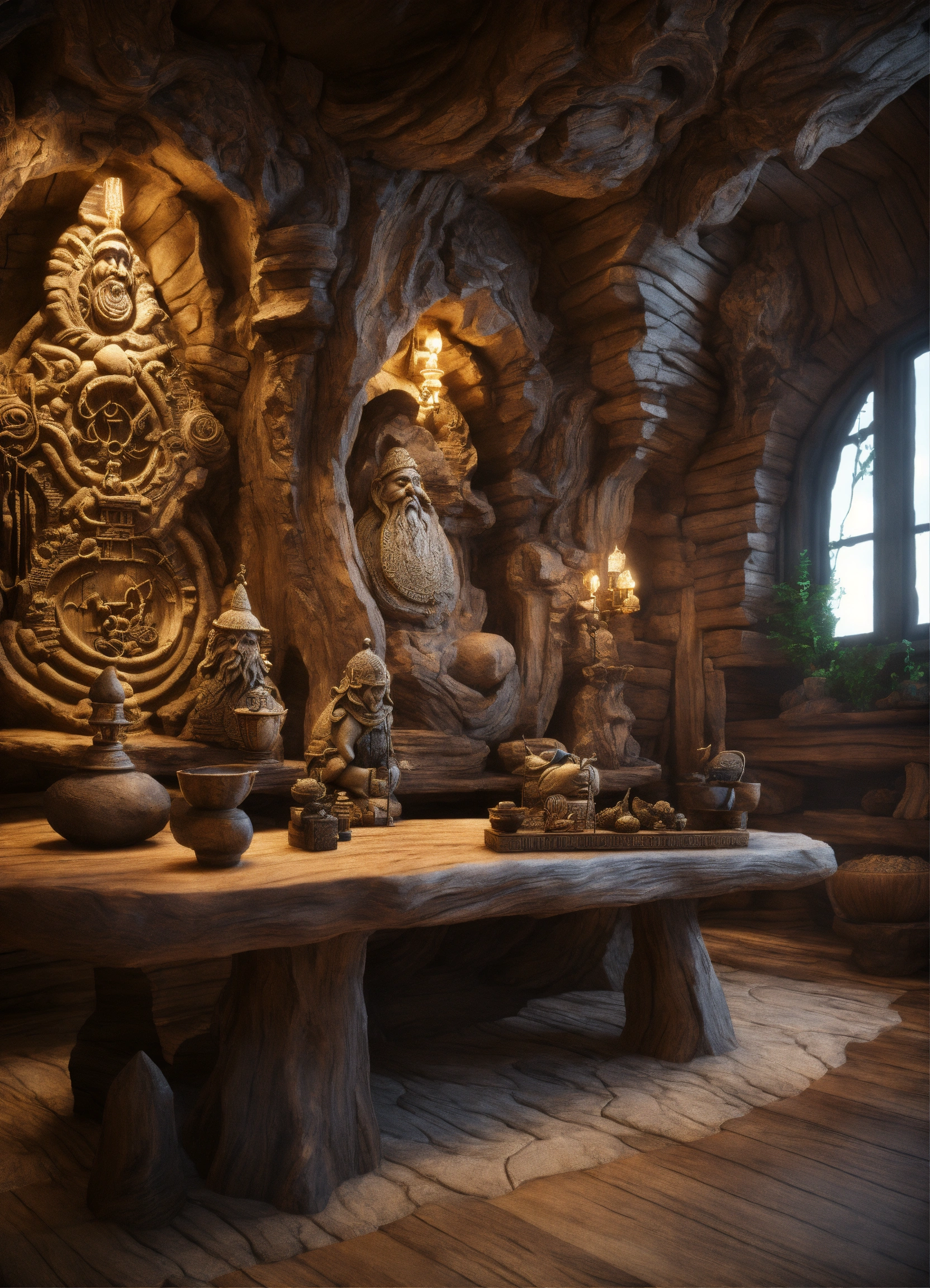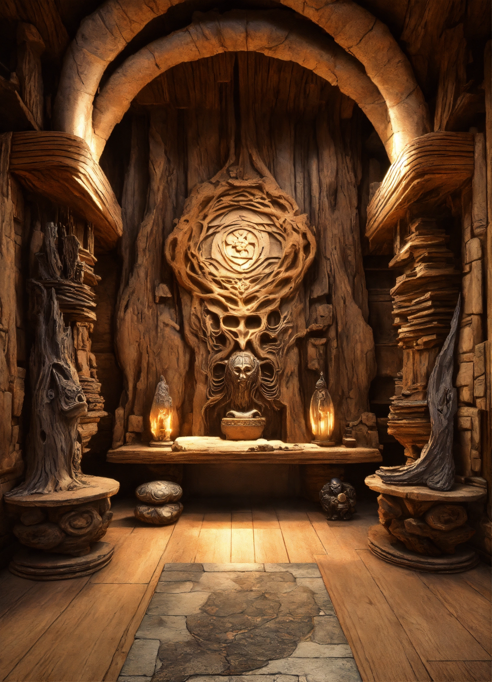 An ancient style spiritual gnome inspired home interior .sculptured . style of alex grey, giger.unreal engine.wood.stone. artistic sculpture.wood/stone/driftwwod