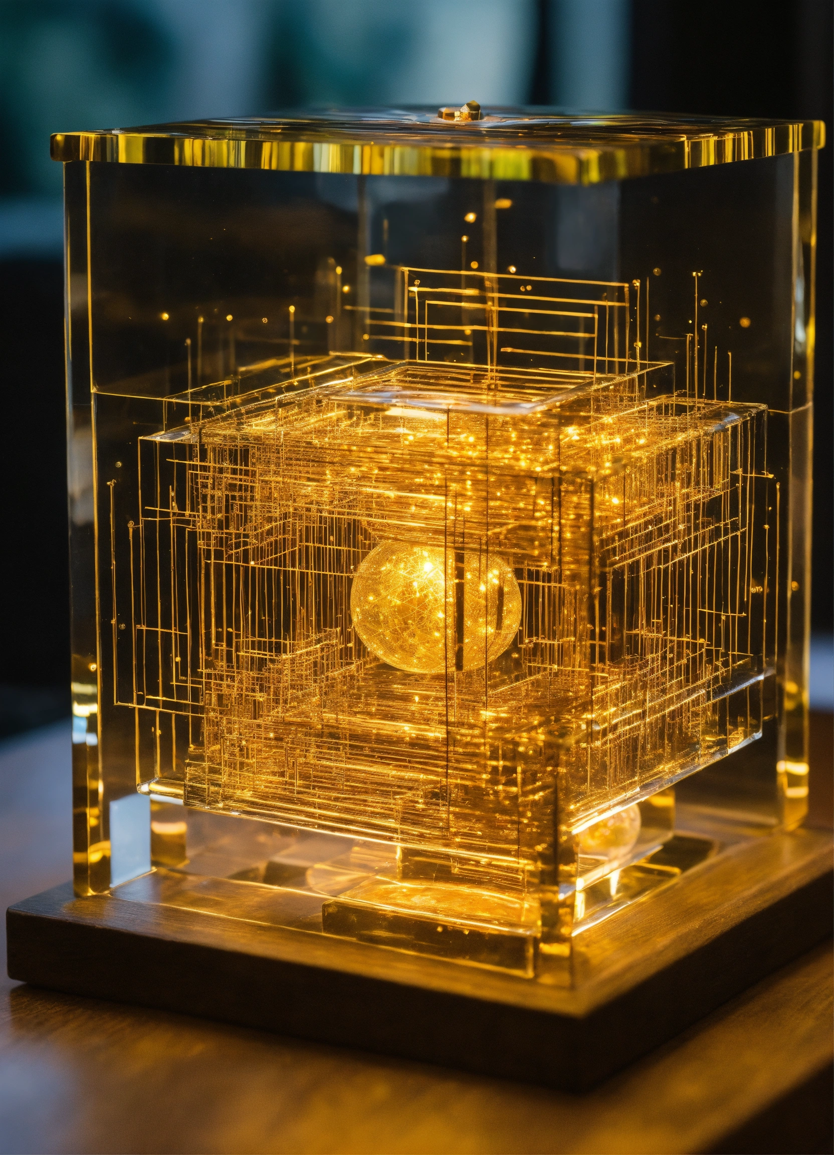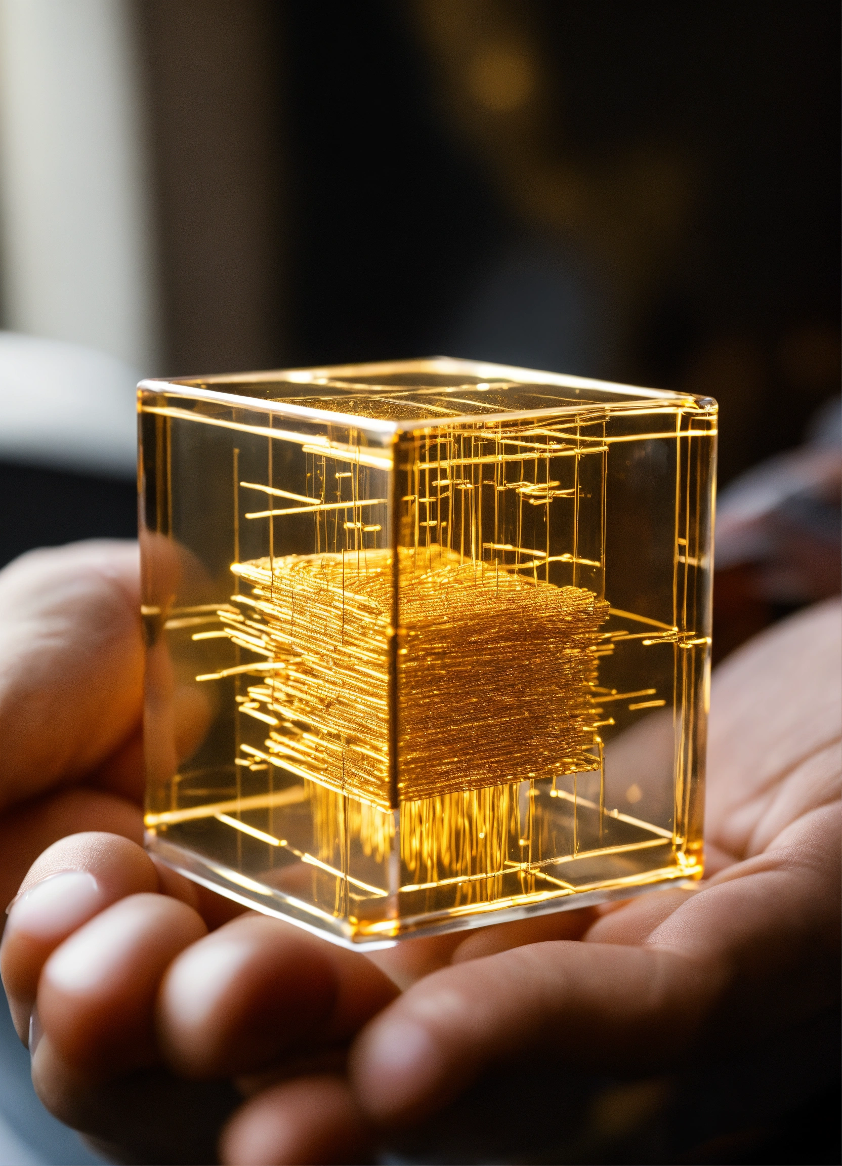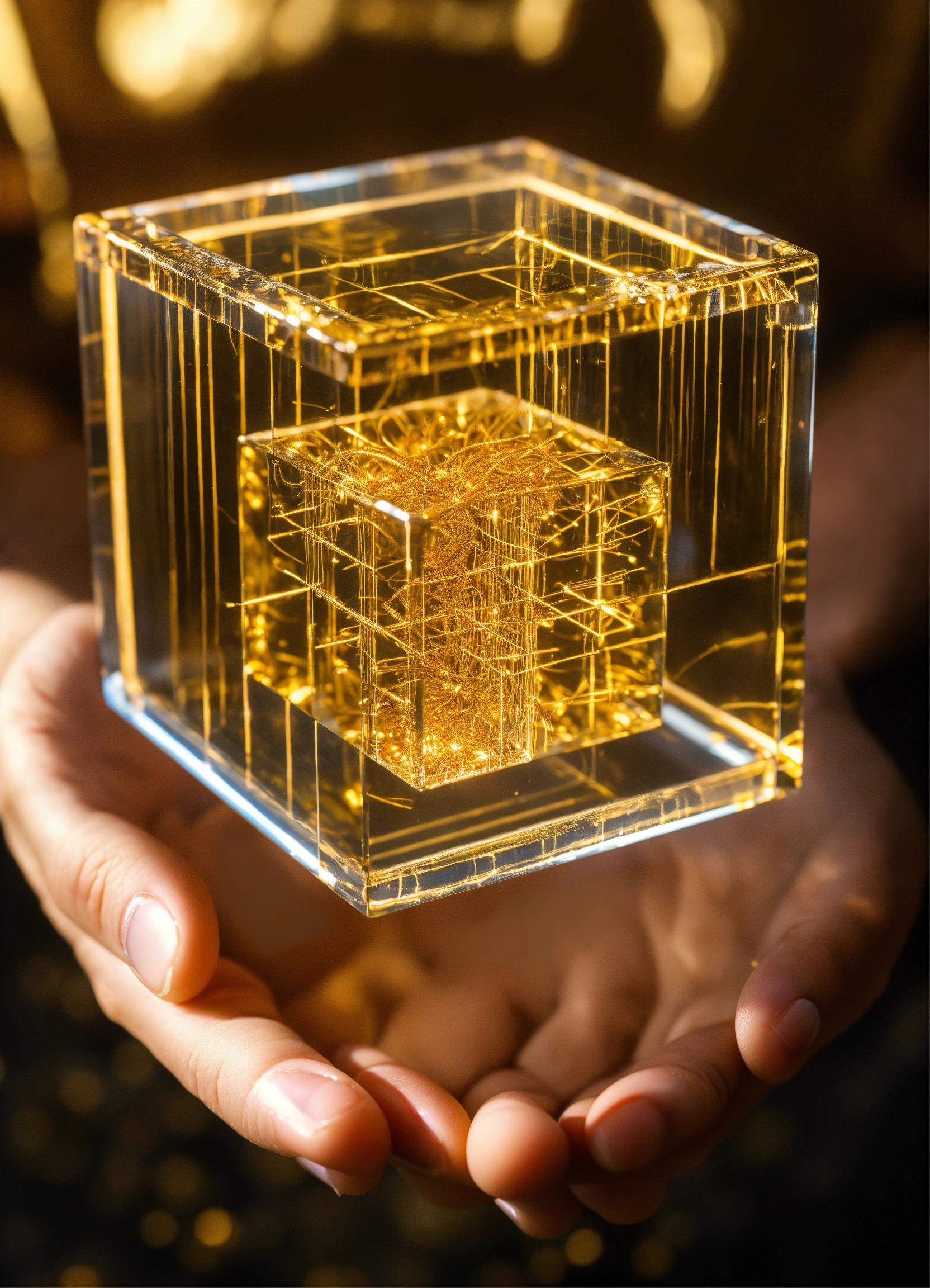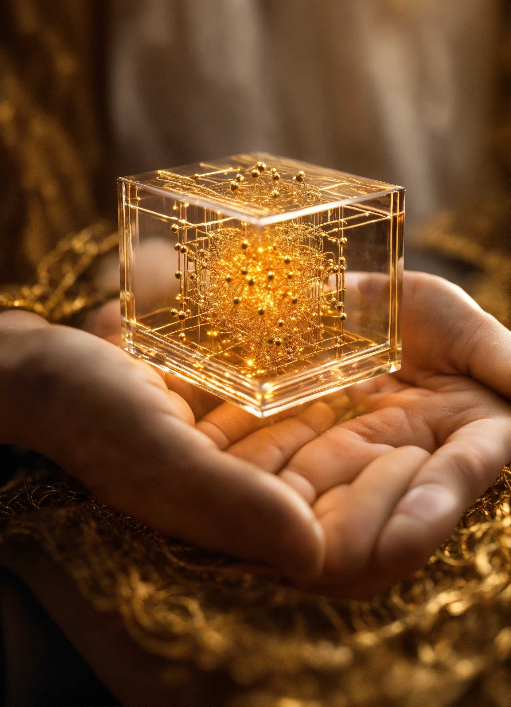 Abraxas conjecture glass cube with golden complex threads frequency 528 hz energy, golden vibration inside. levitating on top of a human hand